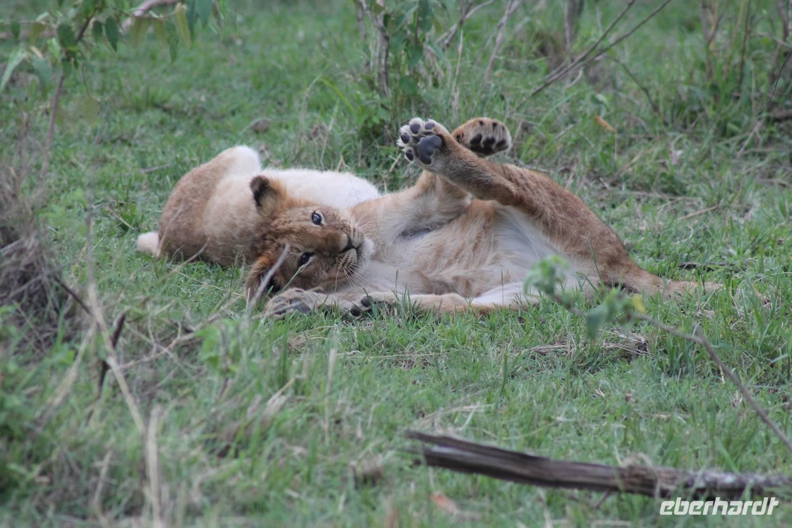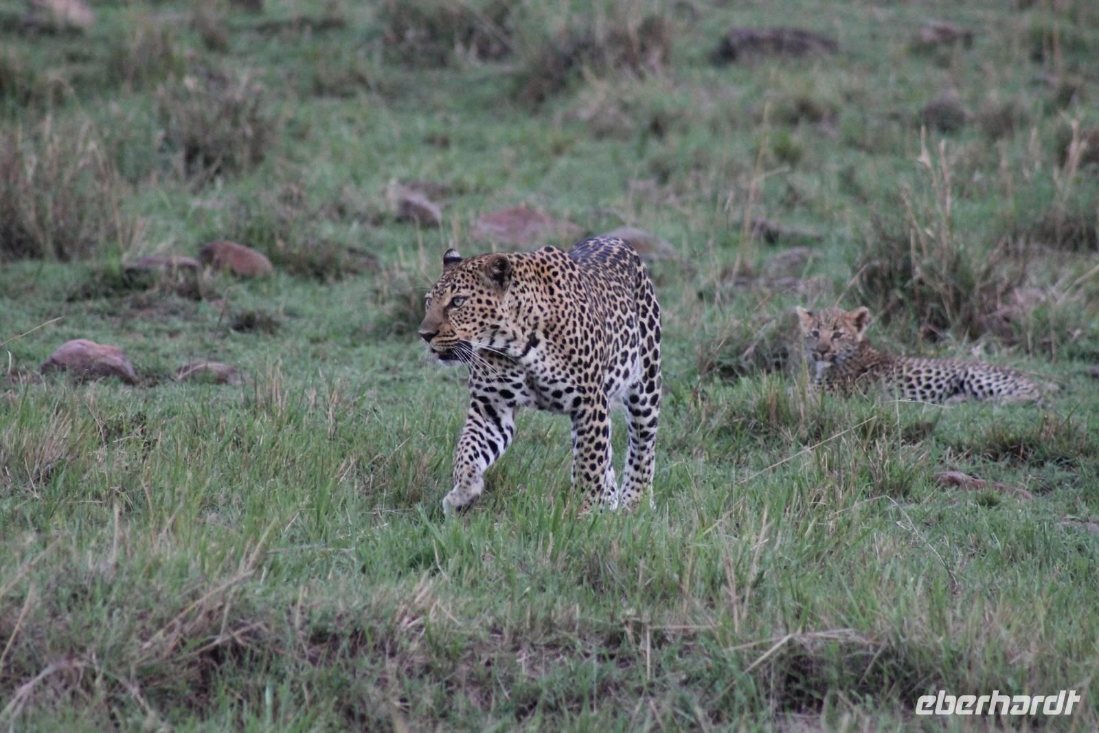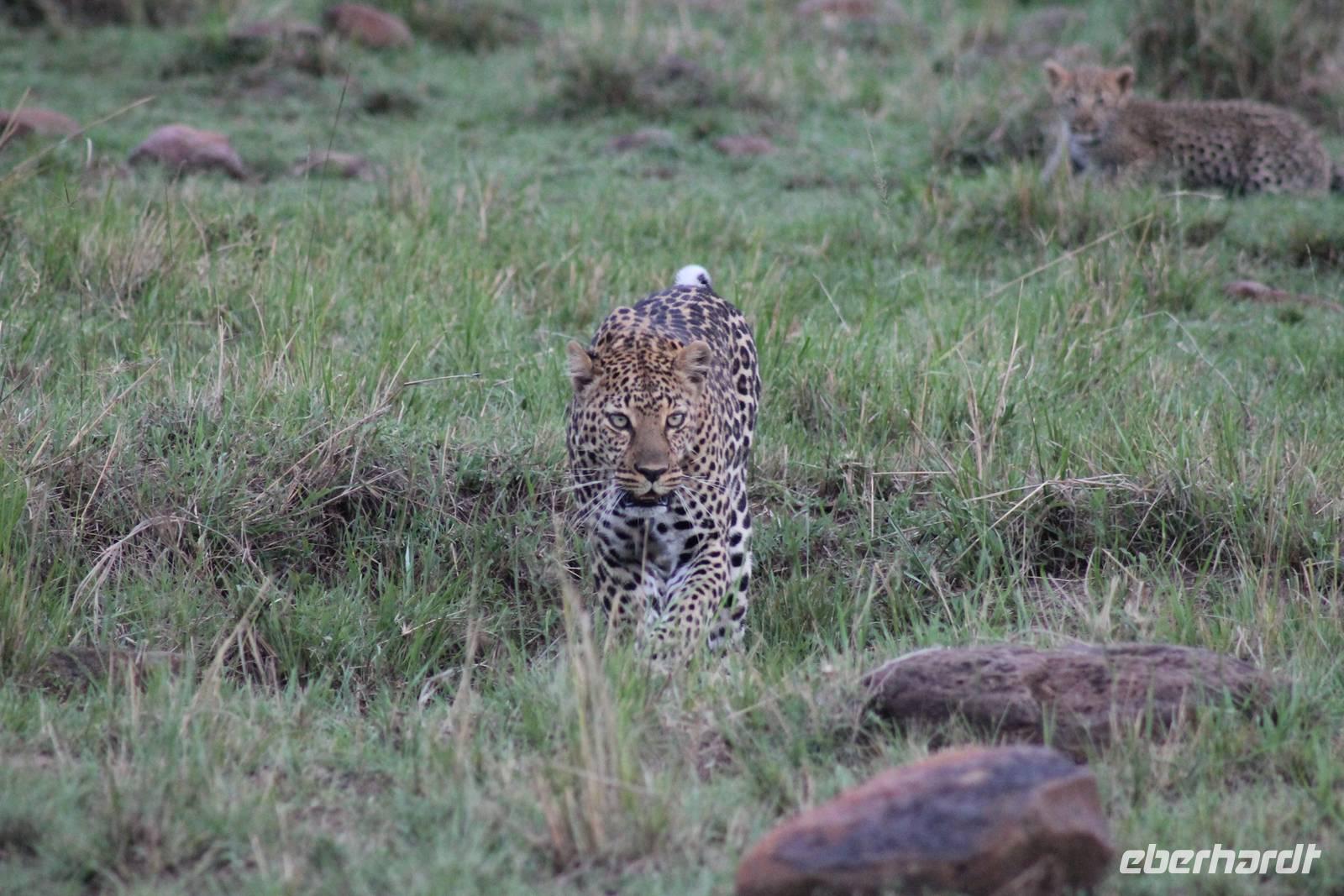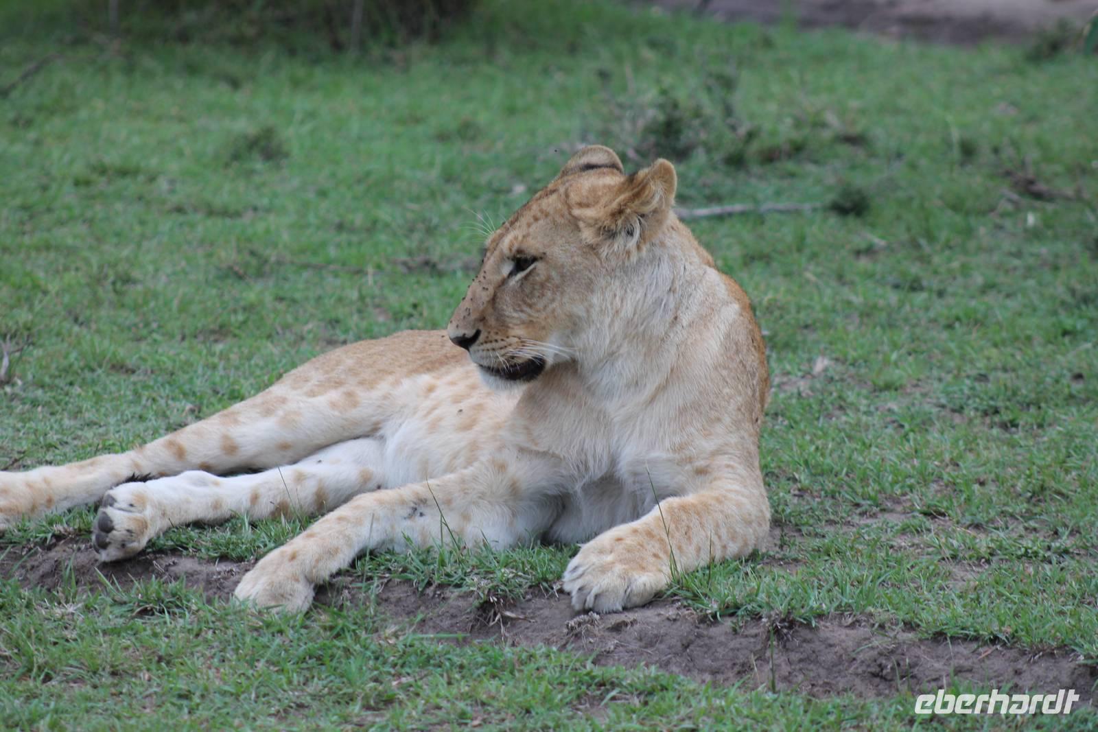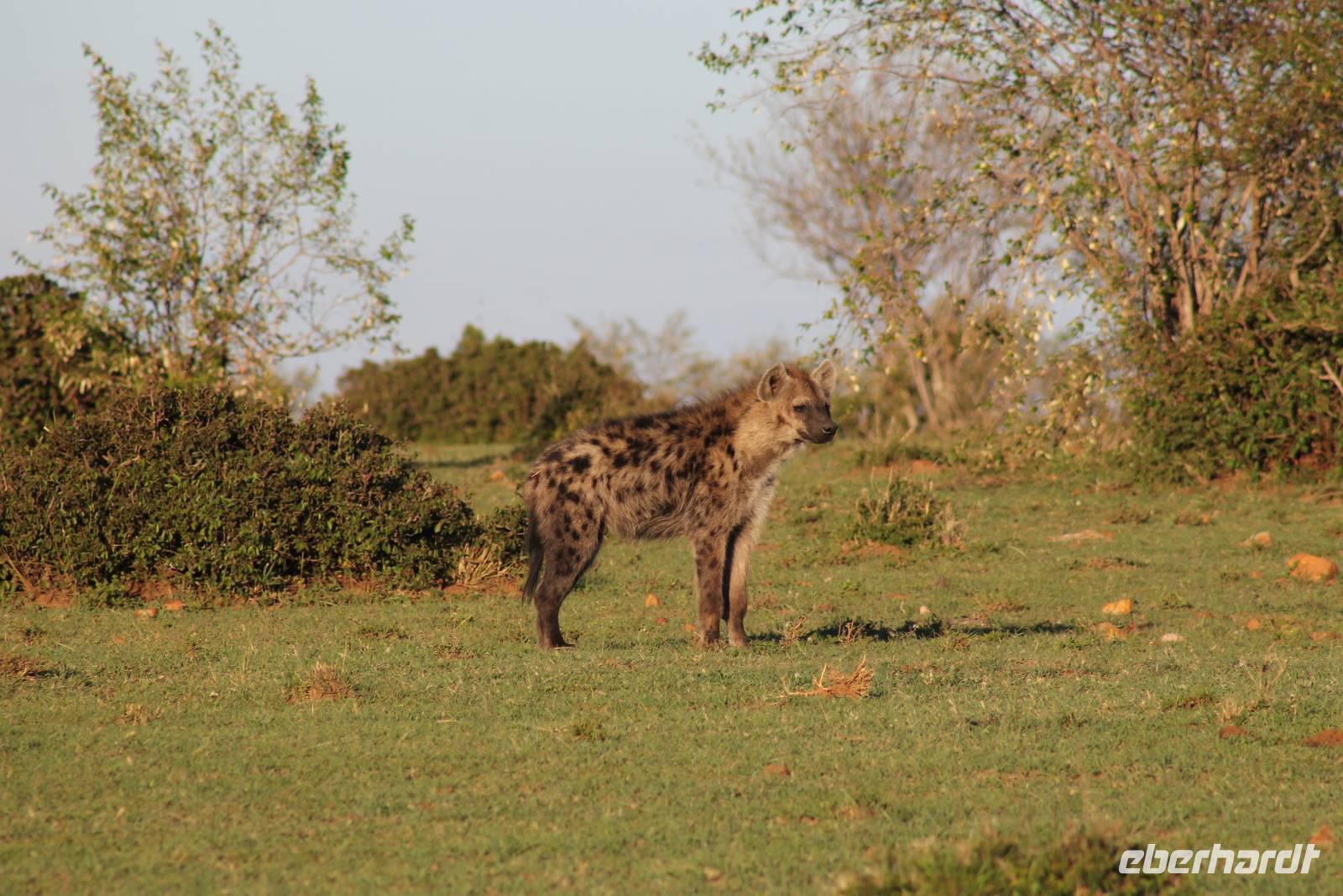 Die nächsten beiden Tage stehen ganz im Zeichen der Masai Mara und viele von uns empfanden diese zweifelsohne als einen Höhepunkt der Reise. Wir stehen natürlich wieder zeitig auf um eine frühe Pirsch in der Masai Mara zu unternehmen. Alle haben mehr oder weniger gut in ihren Zelten geschlafen, denn die Angst vor den Hippos bleibt, zumindest bei Vicky :-). Aber Sie fühlt sich schon etwas sicherer, da Sie ja ihren Askari immer dabei hat. Während unseren heutigen Pirschfahrten sehen wir wieder allerhand Tiere: Viele Gnuherden, einige Geier, kleine und große Warzenschweine und ganz viele Topis mit Jungen, die gerade erst geboren sind. Jackson erklärt uns, dass gerade Paarungszeit ist und so viele Jungen zur Welt kommen. Unglaublich das die kleinen Geschöpfe schon direkt nach der Geburt laufen und stehen können. Natürlich werden Sie von der Mutter sehr umsorgt, weil die Raubkatzen natürlich überall lauern um sich auch ein kleines Topi zu schnappen. Später sehen wir auch noch einen Strauss und mehrere Löwen. Später werden unsere Fahrer informiert, dass sich wohl ein totes Impala auf einem Baum befindet, welches von einem Leoparden gerissen wurde. Leider sehen wir nur das tote Impala aber keinen Leoparden. Ob wir ihn doch noch gesehen haben, erfahren Sie nur wenn Sie weiter lesen. Nach einigen vorbeiziehenden Giraffen und vielen weiteren Kibizen fahren wir mit unseren Jeeps zum Fluss, wo sich aus der Erfahrung heraus immer viele Tiere tummeln und wir sollten Recht behalten. Am Fluss angekommen sehen wir ein riesiges Krokodil, wahrscheinlich das größte Krokodil was wir bisher gesehen haben und auch einige Hippos. Wir sehen auch ein Hippo, was sich im Busch versteckt und viele Wunden hat. Wahrscheinlich hat es einen Machtkampf verloren und muss jetzt einsam und allein leben. Noch vor unserem Mittagessen begegnen wir auch einigen Löwen, die sich über eine Beute hermachen. Viele glauben es wäre ein kleines Warzenschwein, aber genau erkennen können wir es nicht, da es fast vollständig verspeist wurde. Bevor wir heute zu unserem Camp zurückkehren sehen wir auch endlich die ersten Elefanten und sogar mit Jungen. Es ist äußerst niedlich anzusehen, wir der Kleine versucht alles seiner Mutter nachzumachen. So versucht auch er sich Wasser über den Körper zu spritzen aber leider gelingt es nicht so richtig. Aber schön anzusehen war es in jedem Fall. An unserem Camp angekommen genießen wir ein leckeres Mittagessen und genießen dann noch ein wenig die Stille, die uns gibt. Es könnte mehr solche Momente geben aber natürlich wollen wir alle auch etwas erleben. So fahren wir auch am späten Nachmittag noch einmal raus, um weitere Tiere auf unsere Fotos zu bekommen und wir werden nicht enttäuscht. So sehen wir wunderschöne Masai Giraffen, Elandantilopen, Glanzgazellen, eine Riesentrappe, einen Marabu und auch den seltenen Kingfisher, den wir nun endlich auch einmal auf die Linse bekommen. Darüber freuen sich die Ornitologen unter uns natürlich auch sehr. Auch die Dämmerung hat heute noch so einiges zu bieten. So sehen wir noch eine Löwenfamilie mit kleinen Jungen, die gerade erst geboren sind. Ewig könnte man den kleinen zuschauen und man glaubt gar nicht, dass diese kleinen Wesen später mal zu Raubkatzen werden. Auf unserem Rückweg sehen wir noch eine Hyäne im Straßengraben, die sich von uns gar nicht stören lässt. Kurz bevor uns heute noch eine Überraschung erwartet, fahren unsere Jeeps noch einmal zu der Stelle, wo wir heute Morgen schon das tote Impala auf dem Baum gesehen haben und siehe da die Leopardenmama ist wieder da und hat auch ihr Junges im Gepäck. Wir können es kaum glauben, so schön sind diese Tiere und auch das Kleine würden wir am liebsten abknutschen.