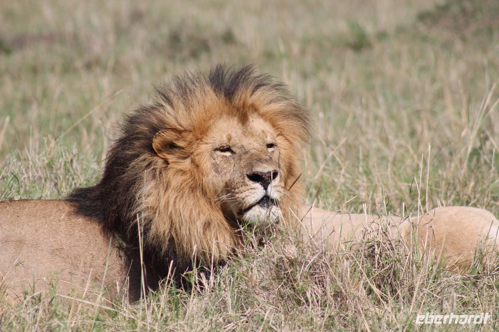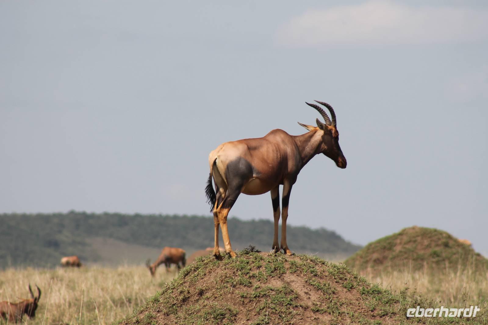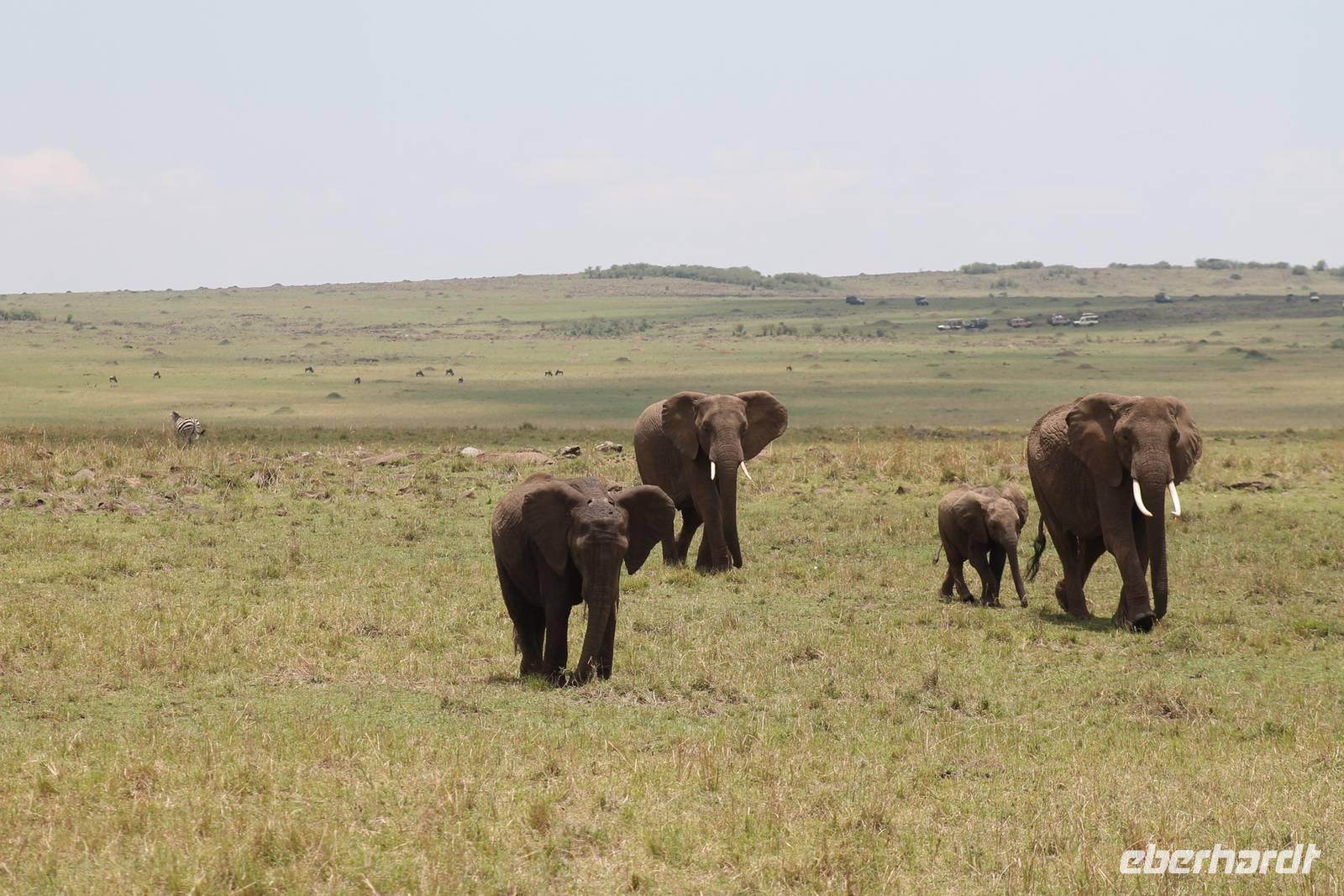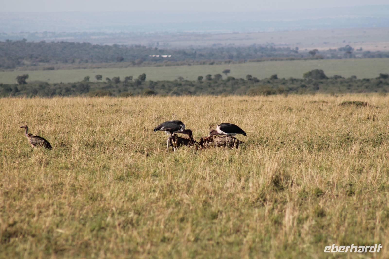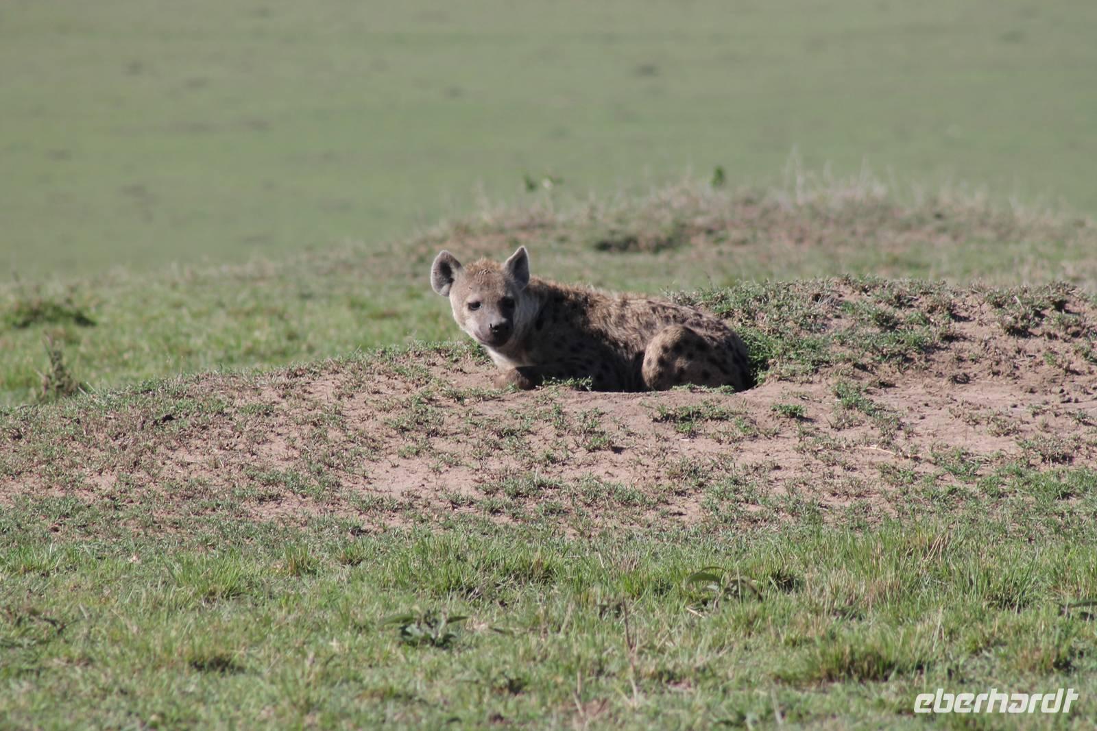 Die nächsten beiden Tage stehen ganz im Zeichen der Masai Mara und viele von uns empfanden diese zweifelsohne als einen Höhepunkt der Reise. Wir stehen natürlich wieder zeitig auf um eine frühe Pirsch in der Masai Mara zu unternehmen. Alle haben mehr oder weniger gut in ihren Zelten geschlafen, denn die Angst vor den Hippos bleibt, zumindest bei Vicky :-). Aber Sie fühlt sich schon etwas sicherer, da Sie ja ihren Askari immer dabei hat. Während unseren heutigen Pirschfahrten sehen wir wieder allerhand Tiere: Viele Gnuherden, einige Geier, kleine und große Warzenschweine und ganz viele Topis mit Jungen, die gerade erst geboren sind. Jackson erklärt uns, dass gerade Paarungszeit ist und so viele Jungen zur Welt kommen. Unglaublich das die kleinen Geschöpfe schon direkt nach der Geburt laufen und stehen können. Natürlich werden Sie von der Mutter sehr umsorgt, weil die Raubkatzen natürlich überall lauern um sich auch ein kleines Topi zu schnappen. Später sehen wir auch noch einen Strauss und mehrere Löwen. Später werden unsere Fahrer informiert, dass sich wohl ein totes Impala auf einem Baum befindet, welches von einem Leoparden gerissen wurde. Leider sehen wir nur das tote Impala aber keinen Leoparden. Ob wir ihn doch noch gesehen haben, erfahren Sie nur wenn Sie weiter lesen. Nach einigen vorbeiziehenden Giraffen und vielen weiteren Kibizen fahren wir mit unseren Jeeps zum Fluss, wo sich aus der Erfahrung heraus immer viele Tiere tummeln und wir sollten Recht behalten. Am Fluss angekommen sehen wir ein riesiges Krokodil, wahrscheinlich das größte Krokodil was wir bisher gesehen haben und auch einige Hippos. Wir sehen auch ein Hippo, was sich im Busch versteckt und viele Wunden hat. Wahrscheinlich hat es einen Machtkampf verloren und muss jetzt einsam und allein leben. Noch vor unserem Mittagessen begegnen wir auch einigen Löwen, die sich über eine Beute hermachen. Viele glauben es wäre ein kleines Warzenschwein, aber genau erkennen können wir es nicht, da es fast vollständig verspeist wurde. Bevor wir heute zu unserem Camp zurückkehren sehen wir auch endlich die ersten Elefanten und sogar mit Jungen. Es ist äußerst niedlich anzusehen, wir der Kleine versucht alles seiner Mutter nachzumachen. So versucht auch er sich Wasser über den Körper zu spritzen aber leider gelingt es nicht so richtig. Aber schön anzusehen war es in jedem Fall. An unserem Camp angekommen genießen wir ein leckeres Mittagessen und genießen dann noch ein wenig die Stille, die uns gibt. Es könnte mehr solche Momente geben aber natürlich wollen wir alle auch etwas erleben. So fahren wir auch am späten Nachmittag noch einmal raus, um weitere Tiere auf unsere Fotos zu bekommen und wir werden nicht enttäuscht. So sehen wir wunderschöne Masai Giraffen, Elandantilopen, Glanzgazellen, eine Riesentrappe, einen Marabu und auch den seltenen Kingfisher, den wir nun endlich auch einmal auf die Linse bekommen. Darüber freuen sich die Ornitologen unter uns natürlich auch sehr. Auch die Dämmerung hat heute noch so einiges zu bieten. So sehen wir noch eine Löwenfamilie mit kleinen Jungen, die gerade erst geboren sind. Ewig könnte man den kleinen zuschauen und man glaubt gar nicht, dass diese kleinen Wesen später mal zu Raubkatzen werden. Auf unserem Rückweg sehen wir noch eine Hyäne im Straßengraben, die sich von uns gar nicht stören lässt. Kurz bevor uns heute noch eine Überraschung erwartet, fahren unsere Jeeps noch einmal zu der Stelle, wo wir heute Morgen schon das tote Impala auf dem Baum gesehen haben und siehe da die Leopardenmama ist wieder da und hat auch ihr Junges im Gepäck. Wir können es kaum glauben, so schön sind diese Tiere und auch das Kleine würden wir am liebsten abknutschen.