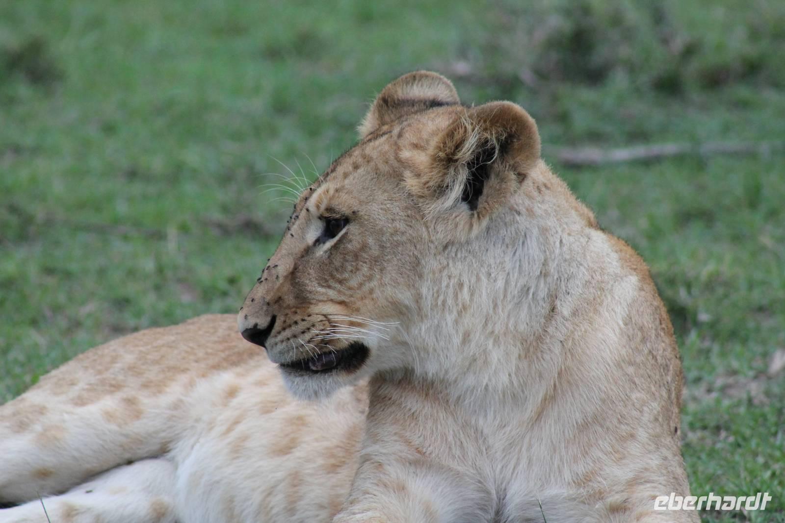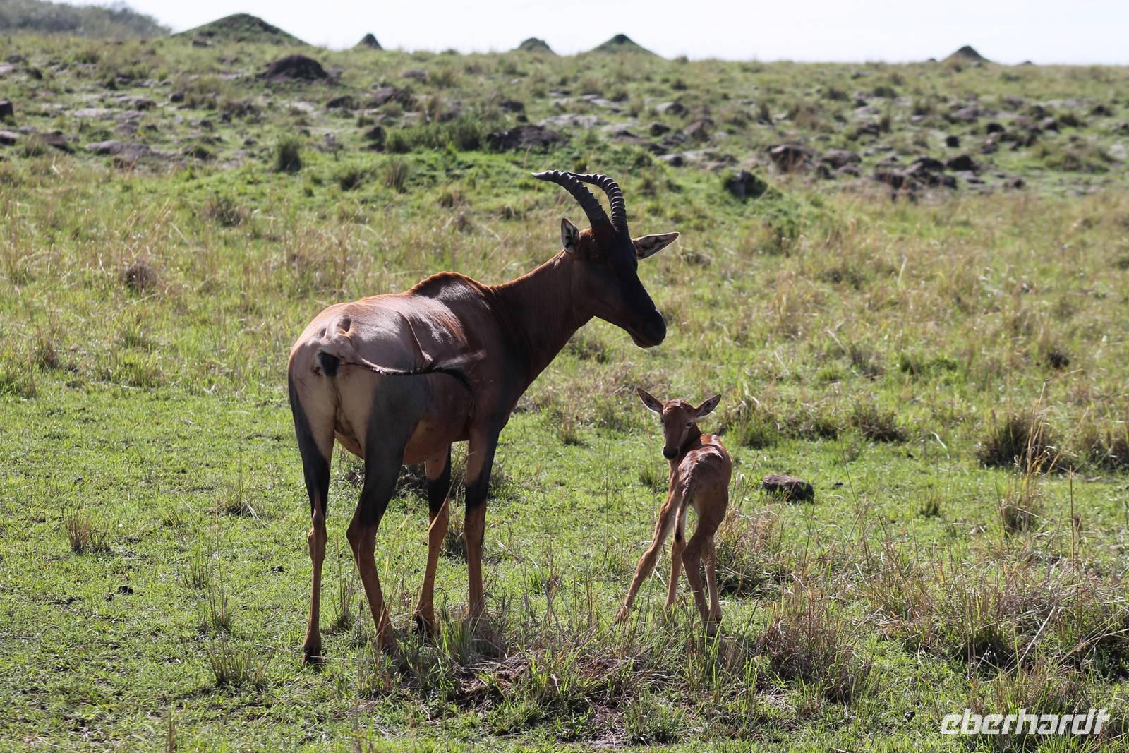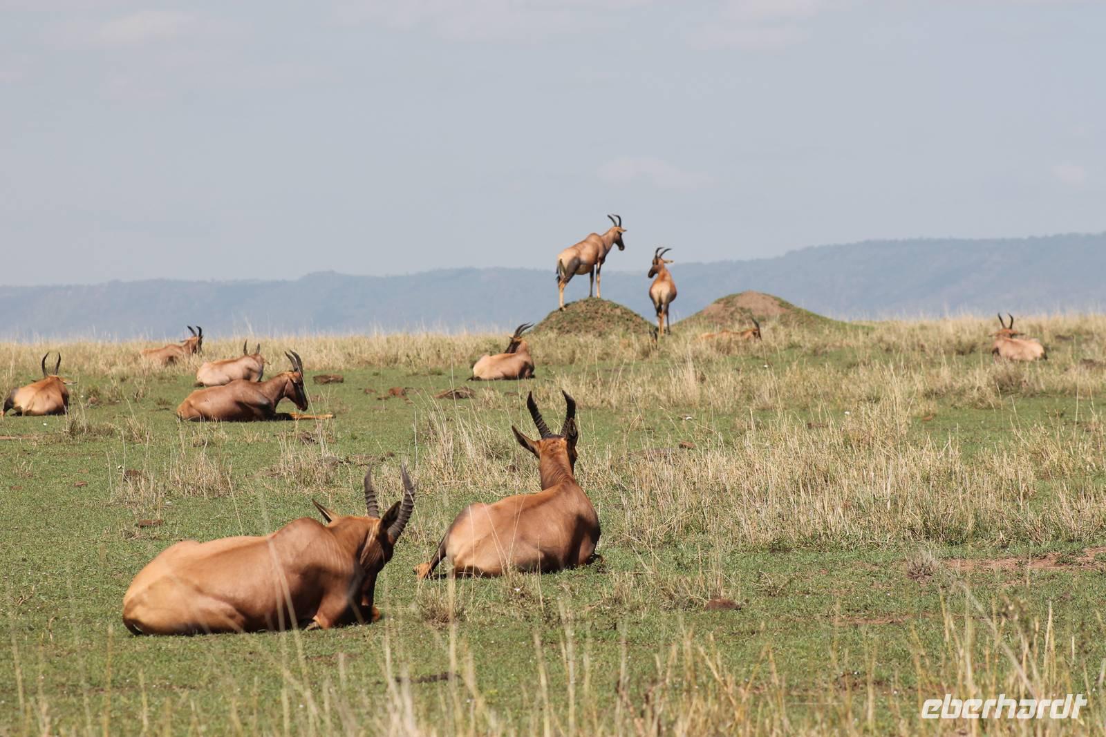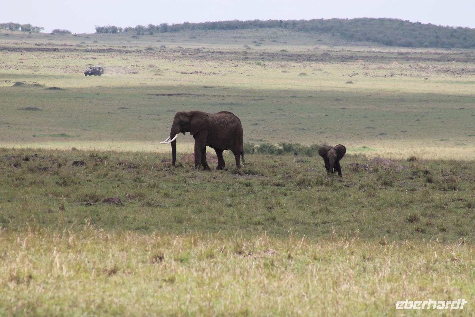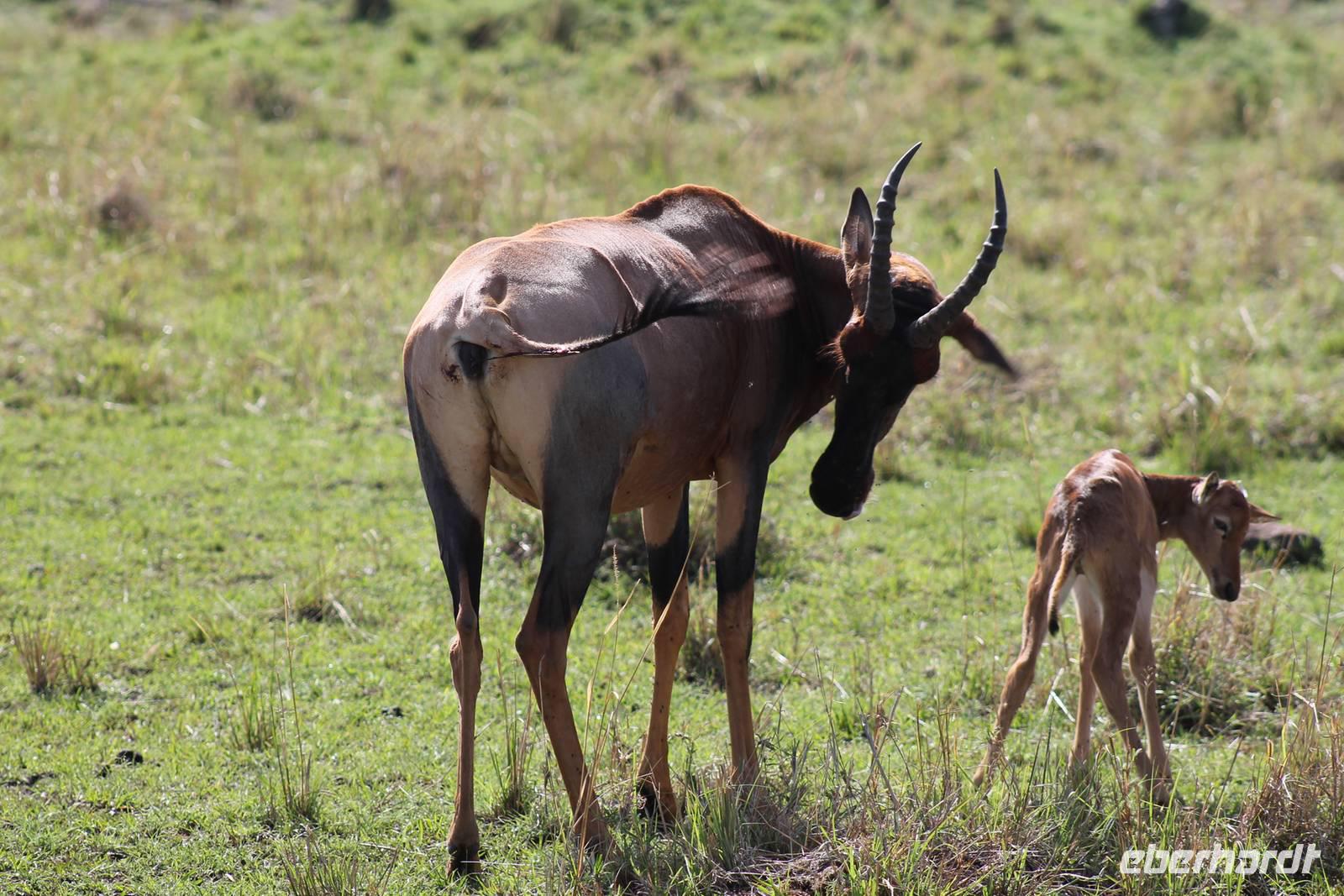 Die nächsten beiden Tage stehen ganz im Zeichen der Masai Mara und viele von uns empfanden diese zweifelsohne als einen Höhepunkt der Reise. Wir stehen natürlich wieder zeitig auf um eine frühe Pirsch in der Masai Mara zu unternehmen. Alle haben mehr oder weniger gut in ihren Zelten geschlafen, denn die Angst vor den Hippos bleibt, zumindest bei Vicky :-). Aber Sie fühlt sich schon etwas sicherer, da Sie ja ihren Askari immer dabei hat. Während unseren heutigen Pirschfahrten sehen wir wieder allerhand Tiere: Viele Gnuherden, einige Geier, kleine und große Warzenschweine und ganz viele Topis mit Jungen, die gerade erst geboren sind. Jackson erklärt uns, dass gerade Paarungszeit ist und so viele Jungen zur Welt kommen. Unglaublich das die kleinen Geschöpfe schon direkt nach der Geburt laufen und stehen können. Natürlich werden Sie von der Mutter sehr umsorgt, weil die Raubkatzen natürlich überall lauern um sich auch ein kleines Topi zu schnappen. Später sehen wir auch noch einen Strauss und mehrere Löwen. Später werden unsere Fahrer informiert, dass sich wohl ein totes Impala auf einem Baum befindet, welches von einem Leoparden gerissen wurde. Leider sehen wir nur das tote Impala aber keinen Leoparden. Ob wir ihn doch noch gesehen haben, erfahren Sie nur wenn Sie weiter lesen. Nach einigen vorbeiziehenden Giraffen und vielen weiteren Kibizen fahren wir mit unseren Jeeps zum Fluss, wo sich aus der Erfahrung heraus immer viele Tiere tummeln und wir sollten Recht behalten. Am Fluss angekommen sehen wir ein riesiges Krokodil, wahrscheinlich das größte Krokodil was wir bisher gesehen haben und auch einige Hippos. Wir sehen auch ein Hippo, was sich im Busch versteckt und viele Wunden hat. Wahrscheinlich hat es einen Machtkampf verloren und muss jetzt einsam und allein leben. Noch vor unserem Mittagessen begegnen wir auch einigen Löwen, die sich über eine Beute hermachen. Viele glauben es wäre ein kleines Warzenschwein, aber genau erkennen können wir es nicht, da es fast vollständig verspeist wurde. Bevor wir heute zu unserem Camp zurückkehren sehen wir auch endlich die ersten Elefanten und sogar mit Jungen. Es ist äußerst niedlich anzusehen, wir der Kleine versucht alles seiner Mutter nachzumachen. So versucht auch er sich Wasser über den Körper zu spritzen aber leider gelingt es nicht so richtig. Aber schön anzusehen war es in jedem Fall. An unserem Camp angekommen genießen wir ein leckeres Mittagessen und genießen dann noch ein wenig die Stille, die uns gibt. Es könnte mehr solche Momente geben aber natürlich wollen wir alle auch etwas erleben. So fahren wir auch am späten Nachmittag noch einmal raus, um weitere Tiere auf unsere Fotos zu bekommen und wir werden nicht enttäuscht. So sehen wir wunderschöne Masai Giraffen, Elandantilopen, Glanzgazellen, eine Riesentrappe, einen Marabu und auch den seltenen Kingfisher, den wir nun endlich auch einmal auf die Linse bekommen. Darüber freuen sich die Ornitologen unter uns natürlich auch sehr. Auch die Dämmerung hat heute noch so einiges zu bieten. So sehen wir noch eine Löwenfamilie mit kleinen Jungen, die gerade erst geboren sind. Ewig könnte man den kleinen zuschauen und man glaubt gar nicht, dass diese kleinen Wesen später mal zu Raubkatzen werden. Auf unserem Rückweg sehen wir noch eine Hyäne im Straßengraben, die sich von uns gar nicht stören lässt. Kurz bevor uns heute noch eine Überraschung erwartet, fahren unsere Jeeps noch einmal zu der Stelle, wo wir heute Morgen schon das tote Impala auf dem Baum gesehen haben und siehe da die Leopardenmama ist wieder da und hat auch ihr Junges im Gepäck. Wir können es kaum glauben, so schön sind diese Tiere und auch das Kleine würden wir am liebsten abknutschen.