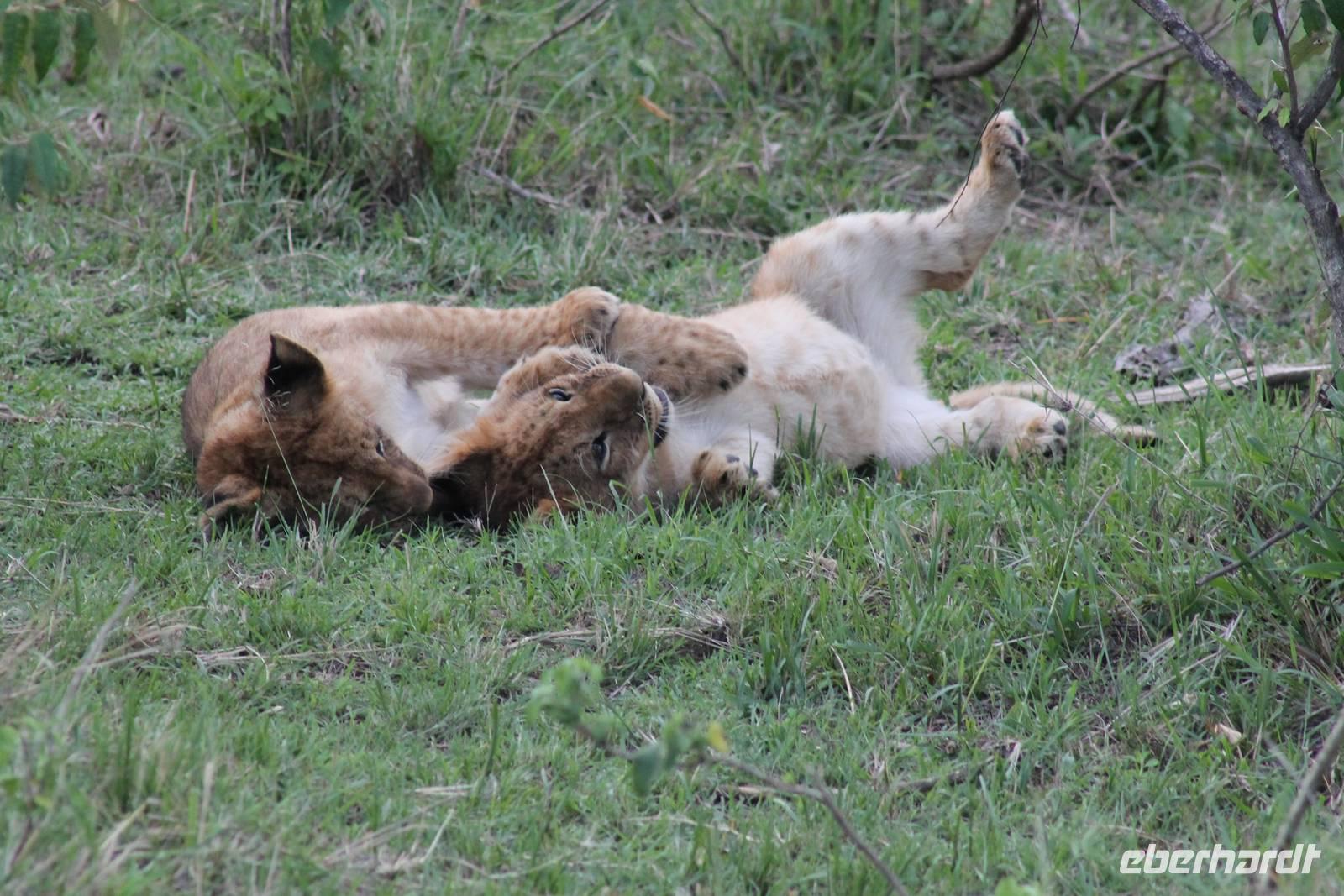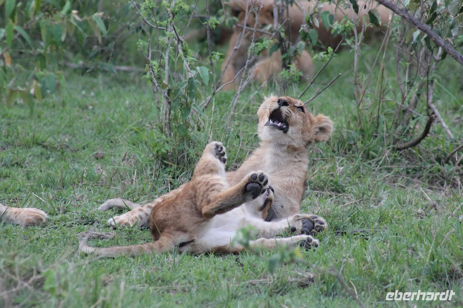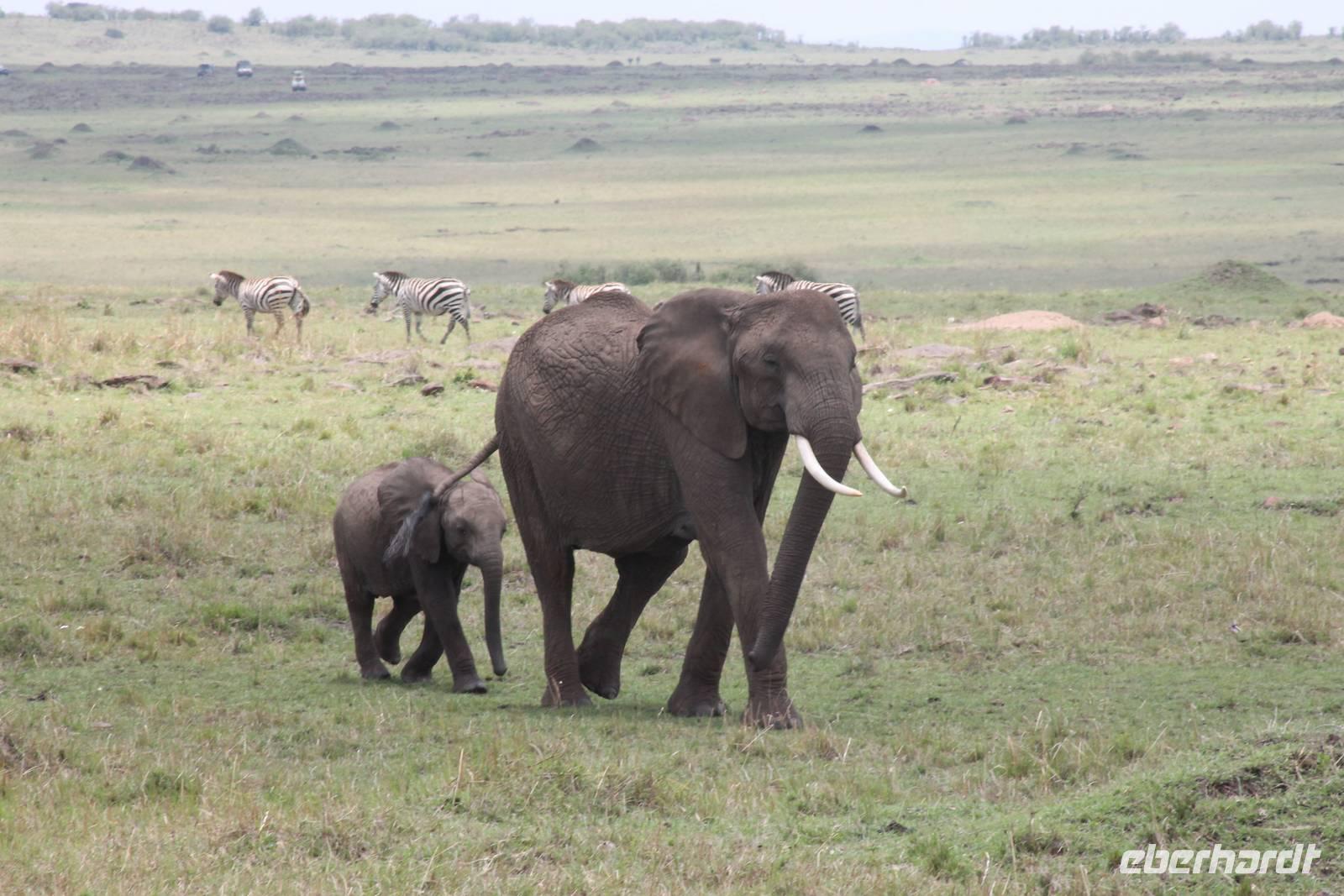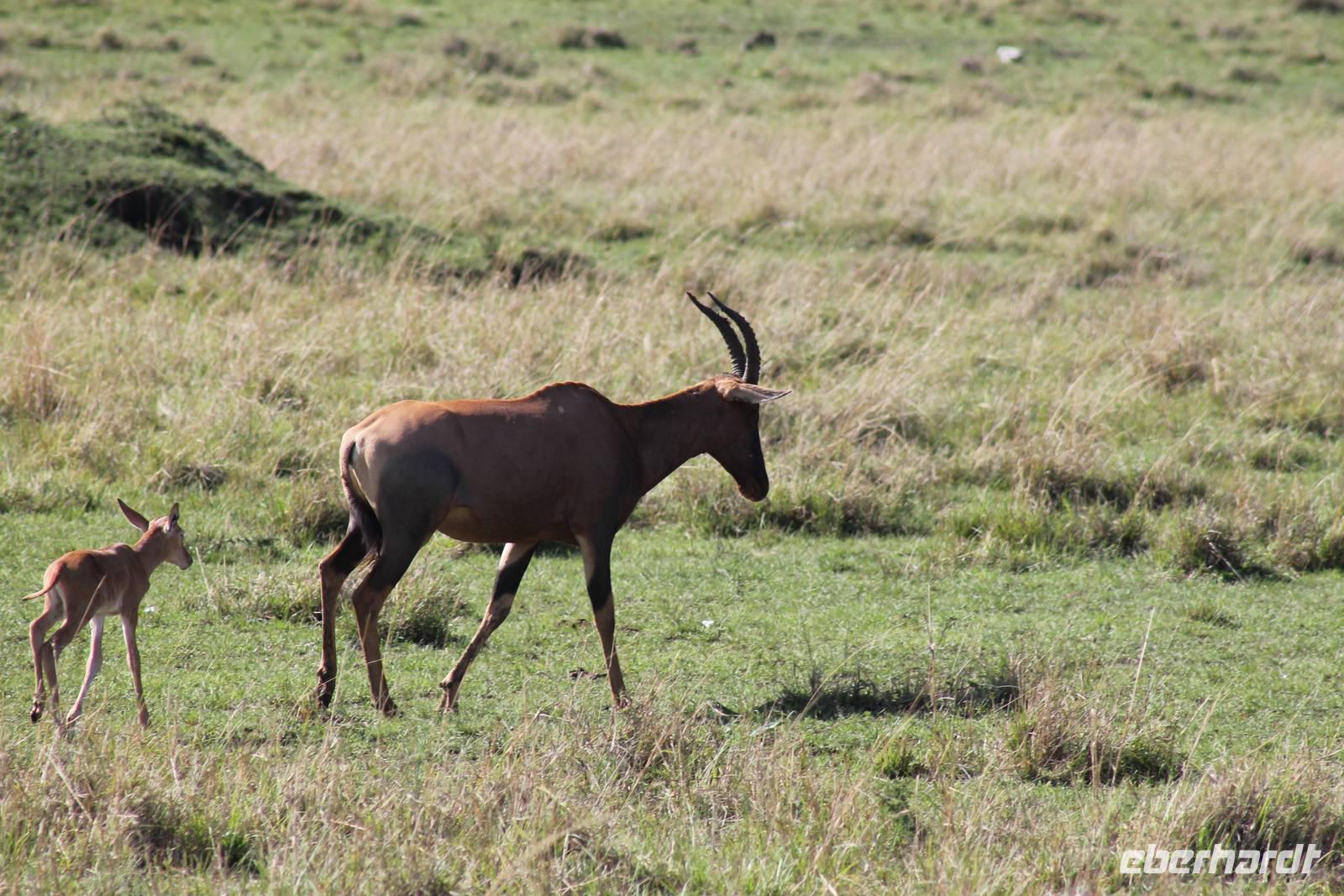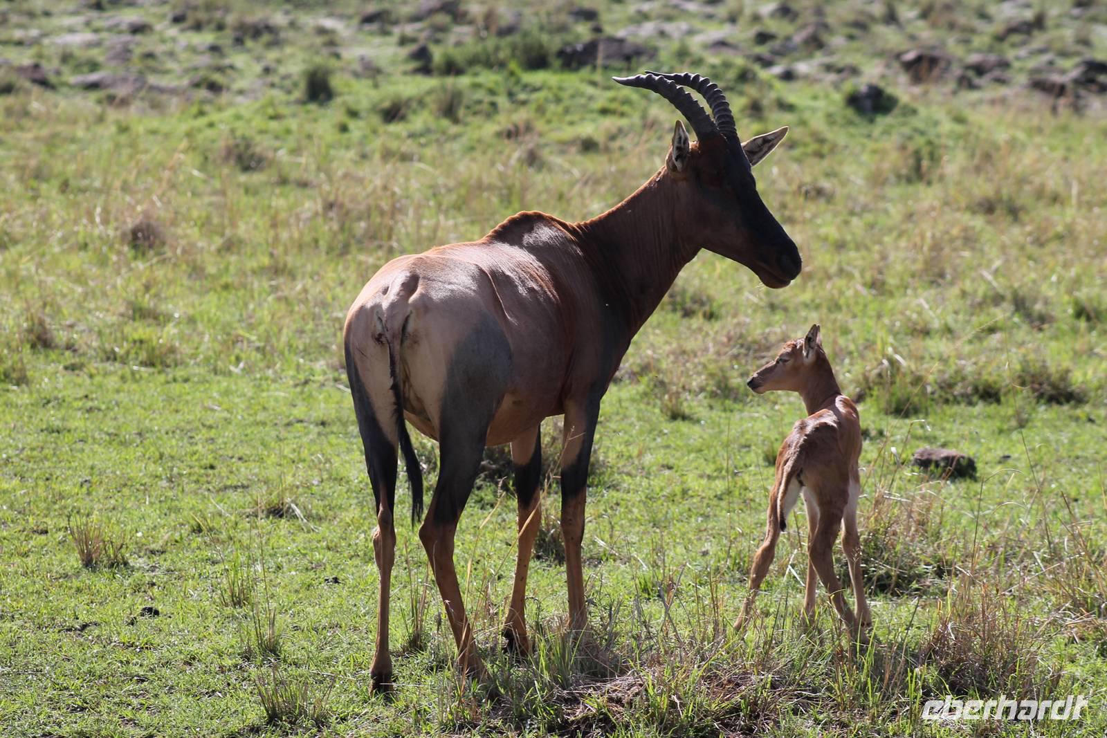 Die nächsten beiden Tage stehen ganz im Zeichen der Masai Mara und viele von uns empfanden diese zweifelsohne als einen Höhepunkt der Reise. Wir stehen natürlich wieder zeitig auf um eine frühe Pirsch in der Masai Mara zu unternehmen. Alle haben mehr oder weniger gut in ihren Zelten geschlafen, denn die Angst vor den Hippos bleibt, zumindest bei Vicky :-). Aber Sie fühlt sich schon etwas sicherer, da Sie ja ihren Askari immer dabei hat. Während unseren heutigen Pirschfahrten sehen wir wieder allerhand Tiere: Viele Gnuherden, einige Geier, kleine und große Warzenschweine und ganz viele Topis mit Jungen, die gerade erst geboren sind. Jackson erklärt uns, dass gerade Paarungszeit ist und so viele Jungen zur Welt kommen. Unglaublich das die kleinen Geschöpfe schon direkt nach der Geburt laufen und stehen können. Natürlich werden Sie von der Mutter sehr umsorgt, weil die Raubkatzen natürlich überall lauern um sich auch ein kleines Topi zu schnappen. Später sehen wir auch noch einen Strauss und mehrere Löwen. Später werden unsere Fahrer informiert, dass sich wohl ein totes Impala auf einem Baum befindet, welches von einem Leoparden gerissen wurde. Leider sehen wir nur das tote Impala aber keinen Leoparden. Ob wir ihn doch noch gesehen haben, erfahren Sie nur wenn Sie weiter lesen. Nach einigen vorbeiziehenden Giraffen und vielen weiteren Kibizen fahren wir mit unseren Jeeps zum Fluss, wo sich aus der Erfahrung heraus immer viele Tiere tummeln und wir sollten Recht behalten. Am Fluss angekommen sehen wir ein riesiges Krokodil, wahrscheinlich das größte Krokodil was wir bisher gesehen haben und auch einige Hippos. Wir sehen auch ein Hippo, was sich im Busch versteckt und viele Wunden hat. Wahrscheinlich hat es einen Machtkampf verloren und muss jetzt einsam und allein leben. Noch vor unserem Mittagessen begegnen wir auch einigen Löwen, die sich über eine Beute hermachen. Viele glauben es wäre ein kleines Warzenschwein, aber genau erkennen können wir es nicht, da es fast vollständig verspeist wurde. Bevor wir heute zu unserem Camp zurückkehren sehen wir auch endlich die ersten Elefanten und sogar mit Jungen. Es ist äußerst niedlich anzusehen, wir der Kleine versucht alles seiner Mutter nachzumachen. So versucht auch er sich Wasser über den Körper zu spritzen aber leider gelingt es nicht so richtig. Aber schön anzusehen war es in jedem Fall. An unserem Camp angekommen genießen wir ein leckeres Mittagessen und genießen dann noch ein wenig die Stille, die uns gibt. Es könnte mehr solche Momente geben aber natürlich wollen wir alle auch etwas erleben. So fahren wir auch am späten Nachmittag noch einmal raus, um weitere Tiere auf unsere Fotos zu bekommen und wir werden nicht enttäuscht. So sehen wir wunderschöne Masai Giraffen, Elandantilopen, Glanzgazellen, eine Riesentrappe, einen Marabu und auch den seltenen Kingfisher, den wir nun endlich auch einmal auf die Linse bekommen. Darüber freuen sich die Ornitologen unter uns natürlich auch sehr. Auch die Dämmerung hat heute noch so einiges zu bieten. So sehen wir noch eine Löwenfamilie mit kleinen Jungen, die gerade erst geboren sind. Ewig könnte man den kleinen zuschauen und man glaubt gar nicht, dass diese kleinen Wesen später mal zu Raubkatzen werden. Auf unserem Rückweg sehen wir noch eine Hyäne im Straßengraben, die sich von uns gar nicht stören lässt. Kurz bevor uns heute noch eine Überraschung erwartet, fahren unsere Jeeps noch einmal zu der Stelle, wo wir heute Morgen schon das tote Impala auf dem Baum gesehen haben und siehe da die Leopardenmama ist wieder da und hat auch ihr Junges im Gepäck. Wir können es kaum glauben, so schön sind diese Tiere und auch das Kleine würden wir am liebsten abknutschen.