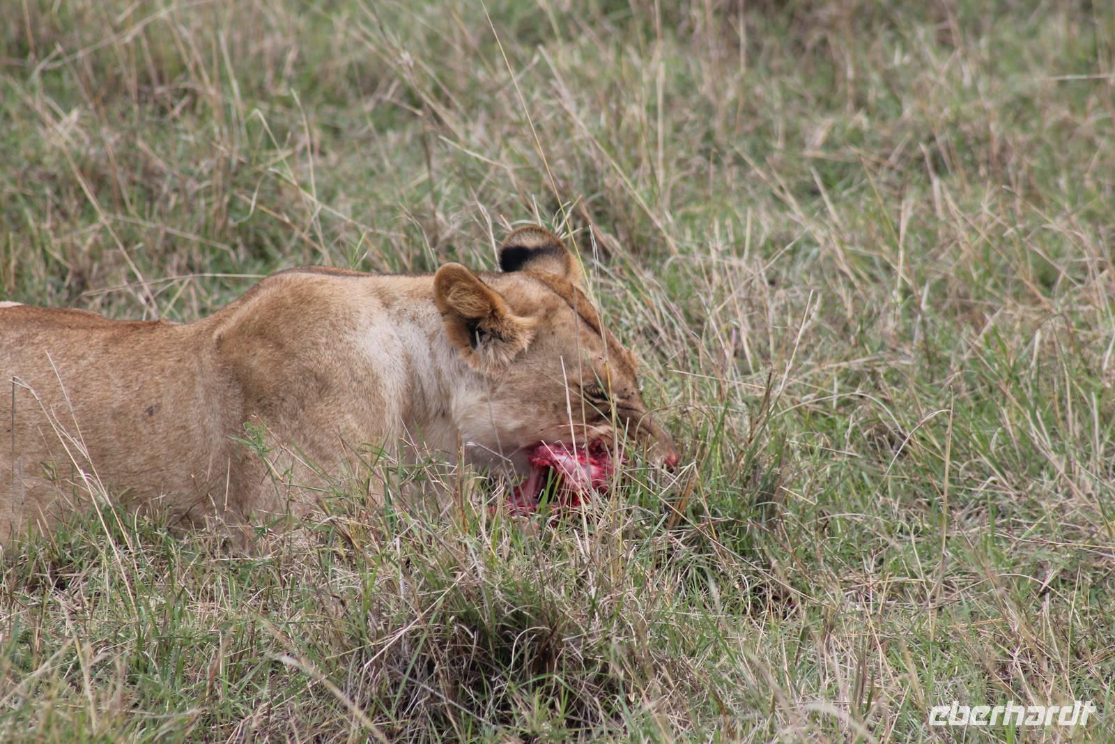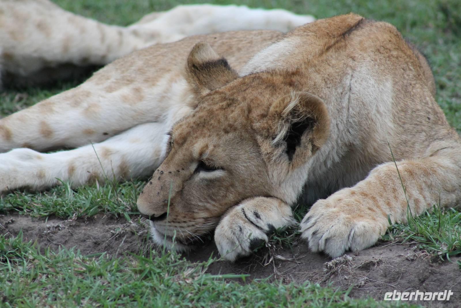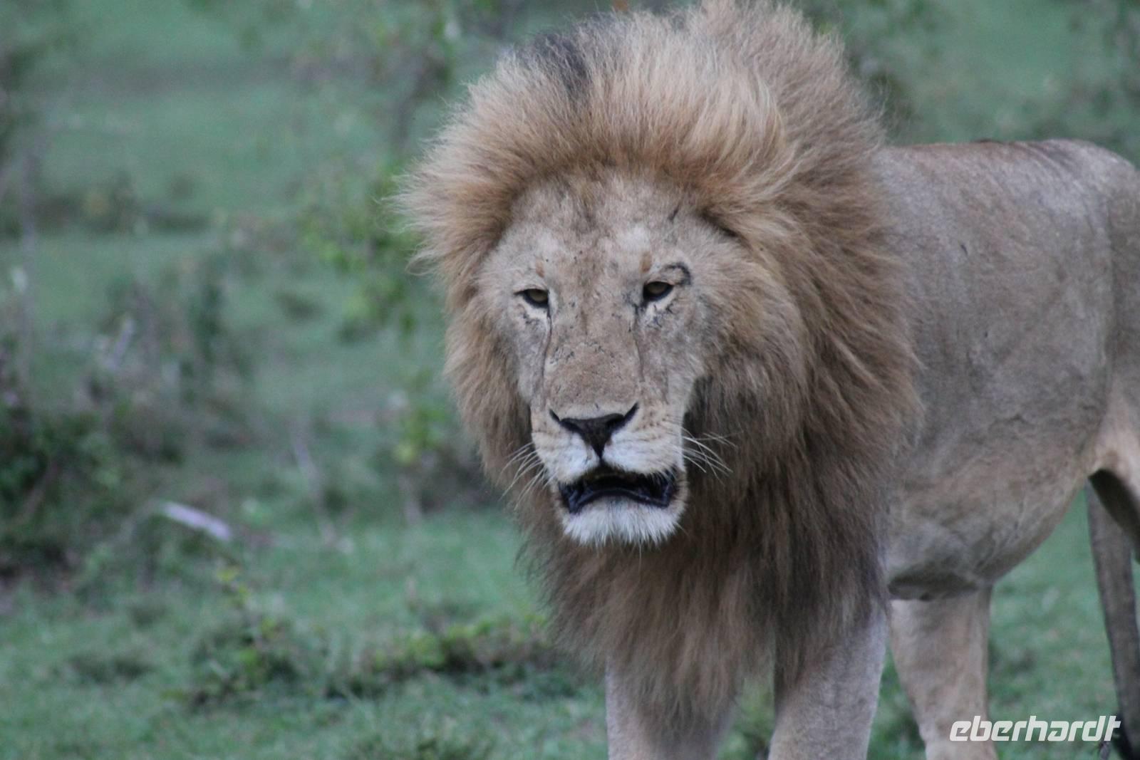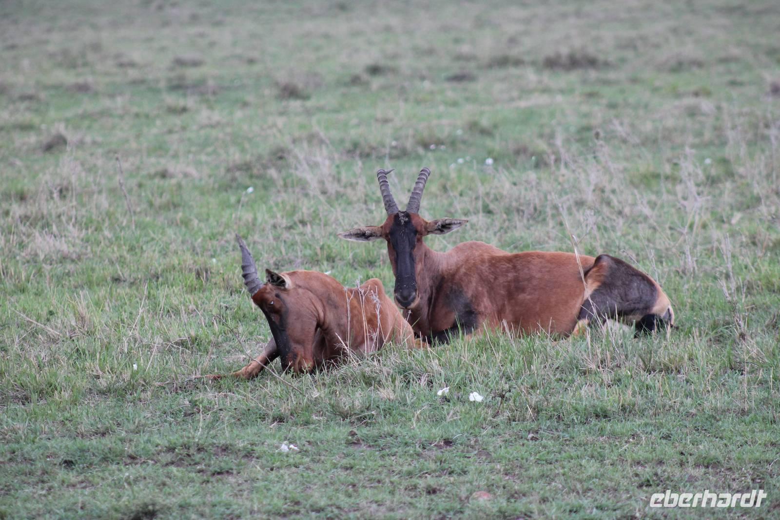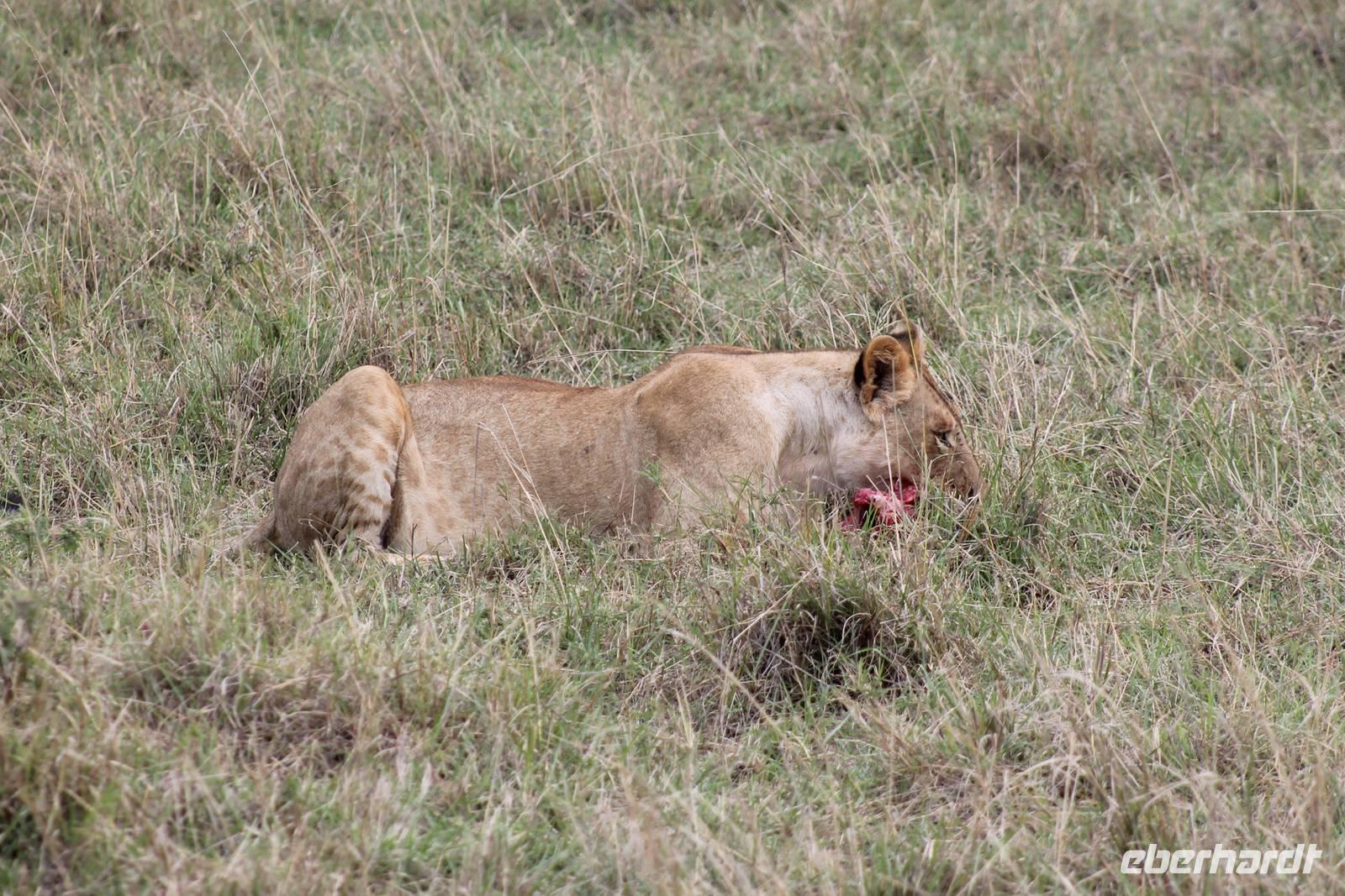Die nächsten beiden Tage stehen ganz im Zeichen der Masai Mara und viele von uns empfanden diese zweifelsohne als einen Höhepunkt der Reise. Wir stehen natürlich wieder zeitig auf um eine frühe Pirsch in der Masai Mara zu unternehmen. Alle haben mehr oder weniger gut in ihren Zelten geschlafen, denn die Angst vor den Hippos bleibt, zumindest bei Vicky :-). Aber Sie fühlt sich schon etwas sicherer, da Sie ja ihren Askari immer dabei hat. Während unseren heutigen Pirschfahrten sehen wir wieder allerhand Tiere: Viele Gnuherden, einige Geier, kleine und große Warzenschweine und ganz viele Topis mit Jungen, die gerade erst geboren sind. Jackson erklärt uns, dass gerade Paarungszeit ist und so viele Jungen zur Welt kommen. Unglaublich das die kleinen Geschöpfe schon direkt nach der Geburt laufen und stehen können. Natürlich werden Sie von der Mutter sehr umsorgt, weil die Raubkatzen natürlich überall lauern um sich auch ein kleines Topi zu schnappen. Später sehen wir auch noch einen Strauss und mehrere Löwen. Später werden unsere Fahrer informiert, dass sich wohl ein totes Impala auf einem Baum befindet, welches von einem Leoparden gerissen wurde. Leider sehen wir nur das tote Impala aber keinen Leoparden. Ob wir ihn doch noch gesehen haben, erfahren Sie nur wenn Sie weiter lesen. Nach einigen vorbeiziehenden Giraffen und vielen weiteren Kibizen fahren wir mit unseren Jeeps zum Fluss, wo sich aus der Erfahrung heraus immer viele Tiere tummeln und wir sollten Recht behalten. Am Fluss angekommen sehen wir ein riesiges Krokodil, wahrscheinlich das größte Krokodil was wir bisher gesehen haben und auch einige Hippos. Wir sehen auch ein Hippo, was sich im Busch versteckt und viele Wunden hat. Wahrscheinlich hat es einen Machtkampf verloren und muss jetzt einsam und allein leben. Noch vor unserem Mittagessen begegnen wir auch einigen Löwen, die sich über eine Beute hermachen. Viele glauben es wäre ein kleines Warzenschwein, aber genau erkennen können wir es nicht, da es fast vollständig verspeist wurde. Bevor wir heute zu unserem Camp zurückkehren sehen wir auch endlich die ersten Elefanten und sogar mit Jungen. Es ist äußerst niedlich anzusehen, wir der Kleine versucht alles seiner Mutter nachzumachen. So versucht auch er sich Wasser über den Körper zu spritzen aber leider gelingt es nicht so richtig. Aber schön anzusehen war es in jedem Fall. An unserem Camp angekommen genießen wir ein leckeres Mittagessen und genießen dann noch ein wenig die Stille, die uns gibt. Es könnte mehr solche Momente geben aber natürlich wollen wir alle auch etwas erleben. So fahren wir auch am späten Nachmittag noch einmal raus, um weitere Tiere auf unsere Fotos zu bekommen und wir werden nicht enttäuscht. So sehen wir wunderschöne Masai Giraffen, Elandantilopen, Glanzgazellen, eine Riesentrappe, einen Marabu und auch den seltenen Kingfisher, den wir nun endlich auch einmal auf die Linse bekommen. Darüber freuen sich die Ornitologen unter uns natürlich auch sehr. Auch die Dämmerung hat heute noch so einiges zu bieten. So sehen wir noch eine Löwenfamilie mit kleinen Jungen, die gerade erst geboren sind. Ewig könnte man den kleinen zuschauen und man glaubt gar nicht, dass diese kleinen Wesen später mal zu Raubkatzen werden. Auf unserem Rückweg sehen wir noch eine Hyäne im Straßengraben, die sich von uns gar nicht stören lässt. Kurz bevor uns heute noch eine Überraschung erwartet, fahren unsere Jeeps noch einmal zu der Stelle, wo wir heute Morgen schon das tote Impala auf dem Baum gesehen haben und siehe da die Leopardenmama ist wieder da und hat auch ihr Junges im Gepäck. Wir können es kaum glauben, so schön sind diese Tiere und auch das Kleine würden wir am liebsten abknutschen.