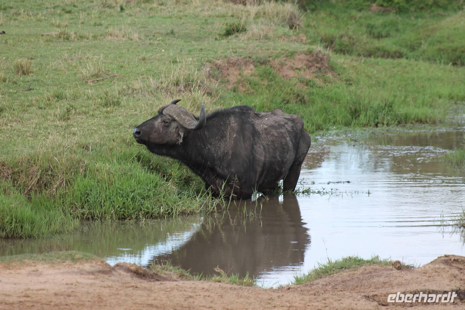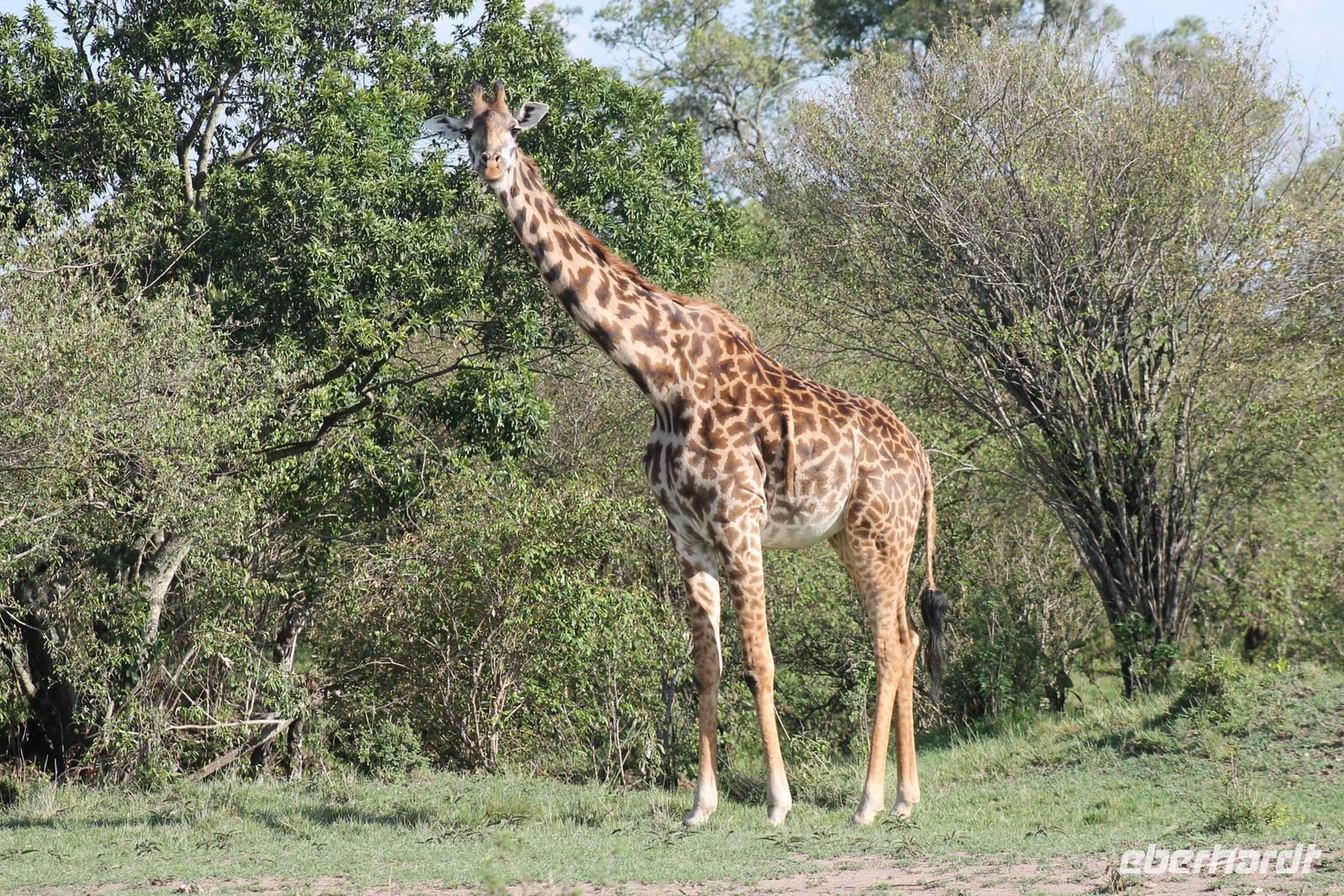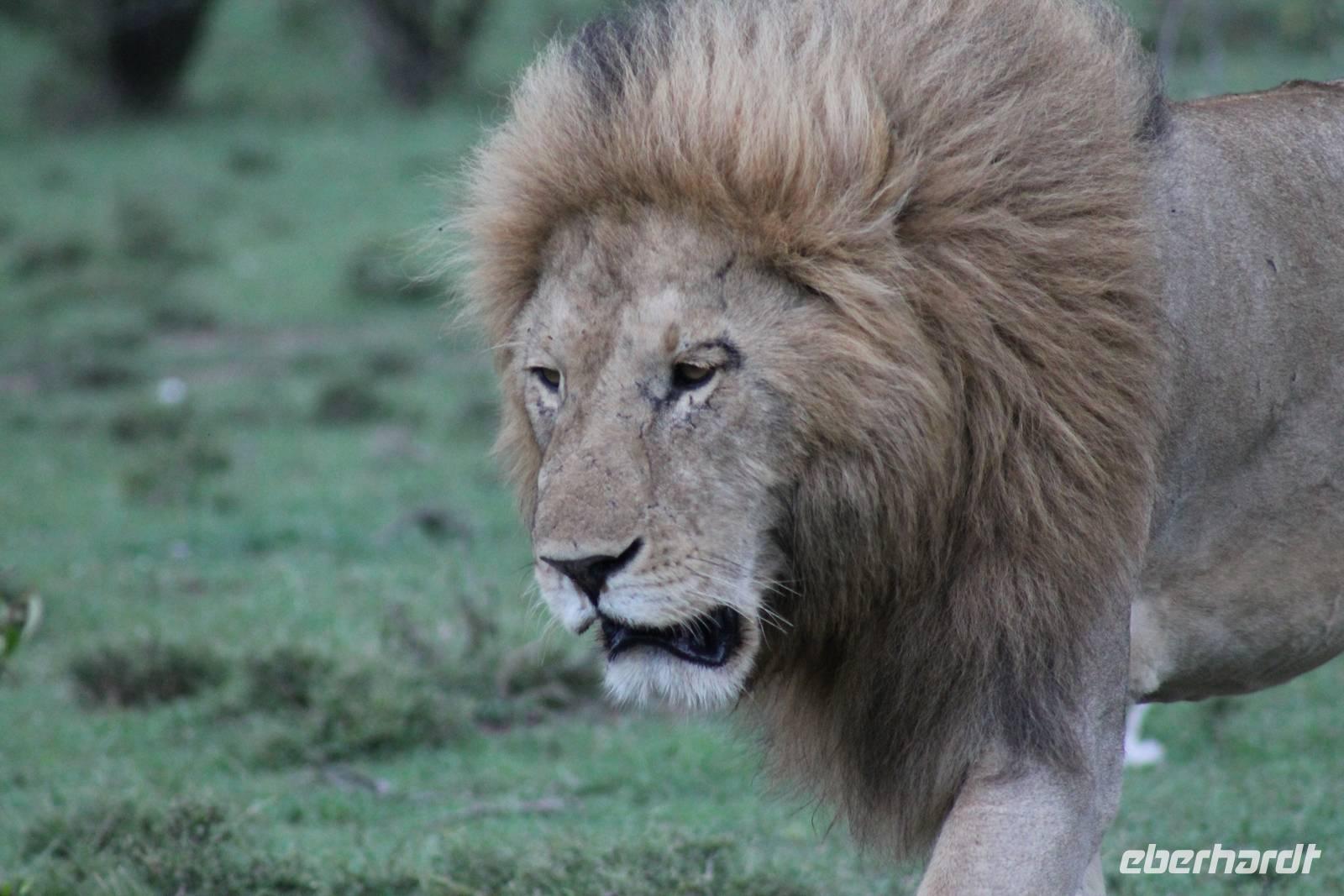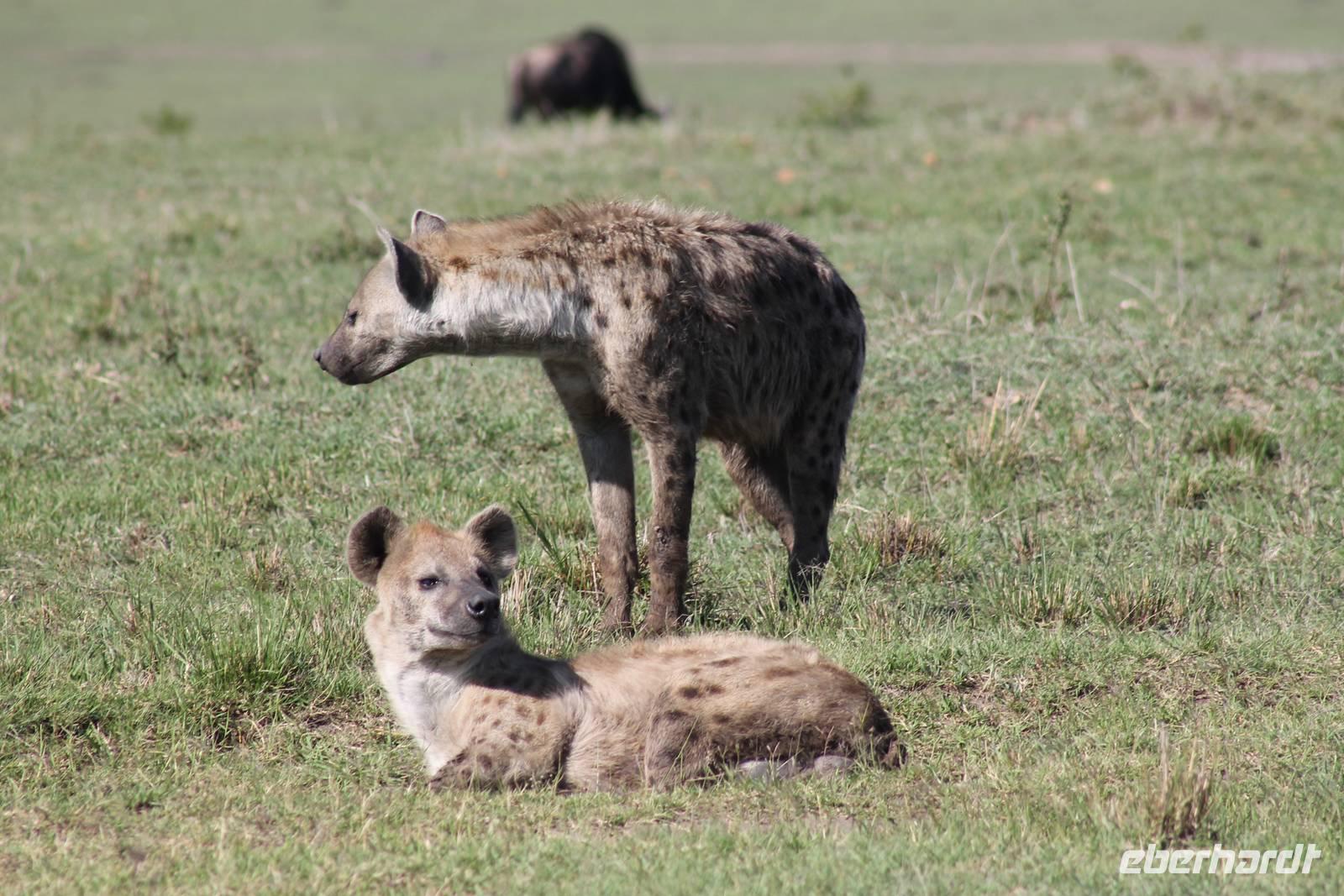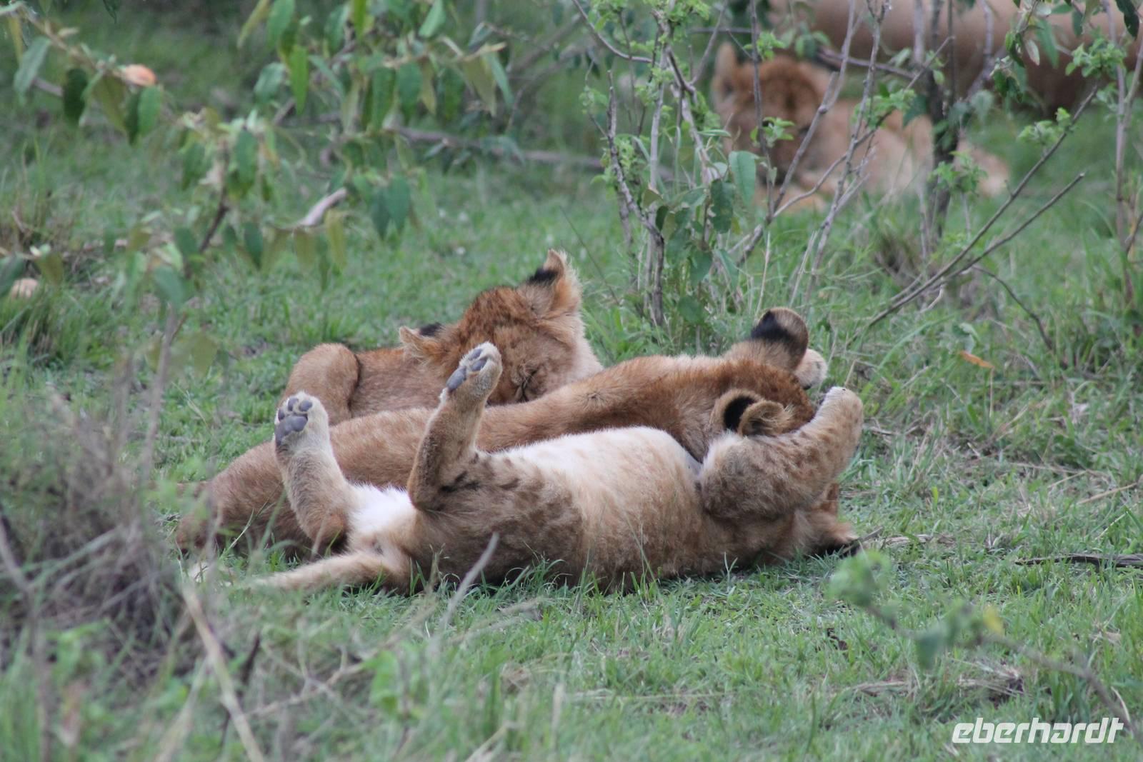 Die nächsten beiden Tage stehen ganz im Zeichen der Masai Mara und viele von uns empfanden diese zweifelsohne als einen Höhepunkt der Reise. Wir stehen natürlich wieder zeitig auf um eine frühe Pirsch in der Masai Mara zu unternehmen. Alle haben mehr oder weniger gut in ihren Zelten geschlafen, denn die Angst vor den Hippos bleibt, zumindest bei Vicky :-). Aber Sie fühlt sich schon etwas sicherer, da Sie ja ihren Askari immer dabei hat. Während unseren heutigen Pirschfahrten sehen wir wieder allerhand Tiere: Viele Gnuherden, einige Geier, kleine und große Warzenschweine und ganz viele Topis mit Jungen, die gerade erst geboren sind. Jackson erklärt uns, dass gerade Paarungszeit ist und so viele Jungen zur Welt kommen. Unglaublich das die kleinen Geschöpfe schon direkt nach der Geburt laufen und stehen können. Natürlich werden Sie von der Mutter sehr umsorgt, weil die Raubkatzen natürlich überall lauern um sich auch ein kleines Topi zu schnappen. Später sehen wir auch noch einen Strauss und mehrere Löwen. Später werden unsere Fahrer informiert, dass sich wohl ein totes Impala auf einem Baum befindet, welches von einem Leoparden gerissen wurde. Leider sehen wir nur das tote Impala aber keinen Leoparden. Ob wir ihn doch noch gesehen haben, erfahren Sie nur wenn Sie weiter lesen. Nach einigen vorbeiziehenden Giraffen und vielen weiteren Kibizen fahren wir mit unseren Jeeps zum Fluss, wo sich aus der Erfahrung heraus immer viele Tiere tummeln und wir sollten Recht behalten. Am Fluss angekommen sehen wir ein riesiges Krokodil, wahrscheinlich das größte Krokodil was wir bisher gesehen haben und auch einige Hippos. Wir sehen auch ein Hippo, was sich im Busch versteckt und viele Wunden hat. Wahrscheinlich hat es einen Machtkampf verloren und muss jetzt einsam und allein leben. Noch vor unserem Mittagessen begegnen wir auch einigen Löwen, die sich über eine Beute hermachen. Viele glauben es wäre ein kleines Warzenschwein, aber genau erkennen können wir es nicht, da es fast vollständig verspeist wurde. Bevor wir heute zu unserem Camp zurückkehren sehen wir auch endlich die ersten Elefanten und sogar mit Jungen. Es ist äußerst niedlich anzusehen, wir der Kleine versucht alles seiner Mutter nachzumachen. So versucht auch er sich Wasser über den Körper zu spritzen aber leider gelingt es nicht so richtig. Aber schön anzusehen war es in jedem Fall. An unserem Camp angekommen genießen wir ein leckeres Mittagessen und genießen dann noch ein wenig die Stille, die uns gibt. Es könnte mehr solche Momente geben aber natürlich wollen wir alle auch etwas erleben. So fahren wir auch am späten Nachmittag noch einmal raus, um weitere Tiere auf unsere Fotos zu bekommen und wir werden nicht enttäuscht. So sehen wir wunderschöne Masai Giraffen, Elandantilopen, Glanzgazellen, eine Riesentrappe, einen Marabu und auch den seltenen Kingfisher, den wir nun endlich auch einmal auf die Linse bekommen. Darüber freuen sich die Ornitologen unter uns natürlich auch sehr. Auch die Dämmerung hat heute noch so einiges zu bieten. So sehen wir noch eine Löwenfamilie mit kleinen Jungen, die gerade erst geboren sind. Ewig könnte man den kleinen zuschauen und man glaubt gar nicht, dass diese kleinen Wesen später mal zu Raubkatzen werden. Auf unserem Rückweg sehen wir noch eine Hyäne im Straßengraben, die sich von uns gar nicht stören lässt. Kurz bevor uns heute noch eine Überraschung erwartet, fahren unsere Jeeps noch einmal zu der Stelle, wo wir heute Morgen schon das tote Impala auf dem Baum gesehen haben und siehe da die Leopardenmama ist wieder da und hat auch ihr Junges im Gepäck. Wir können es kaum glauben, so schön sind diese Tiere und auch das Kleine würden wir am liebsten abknutschen.