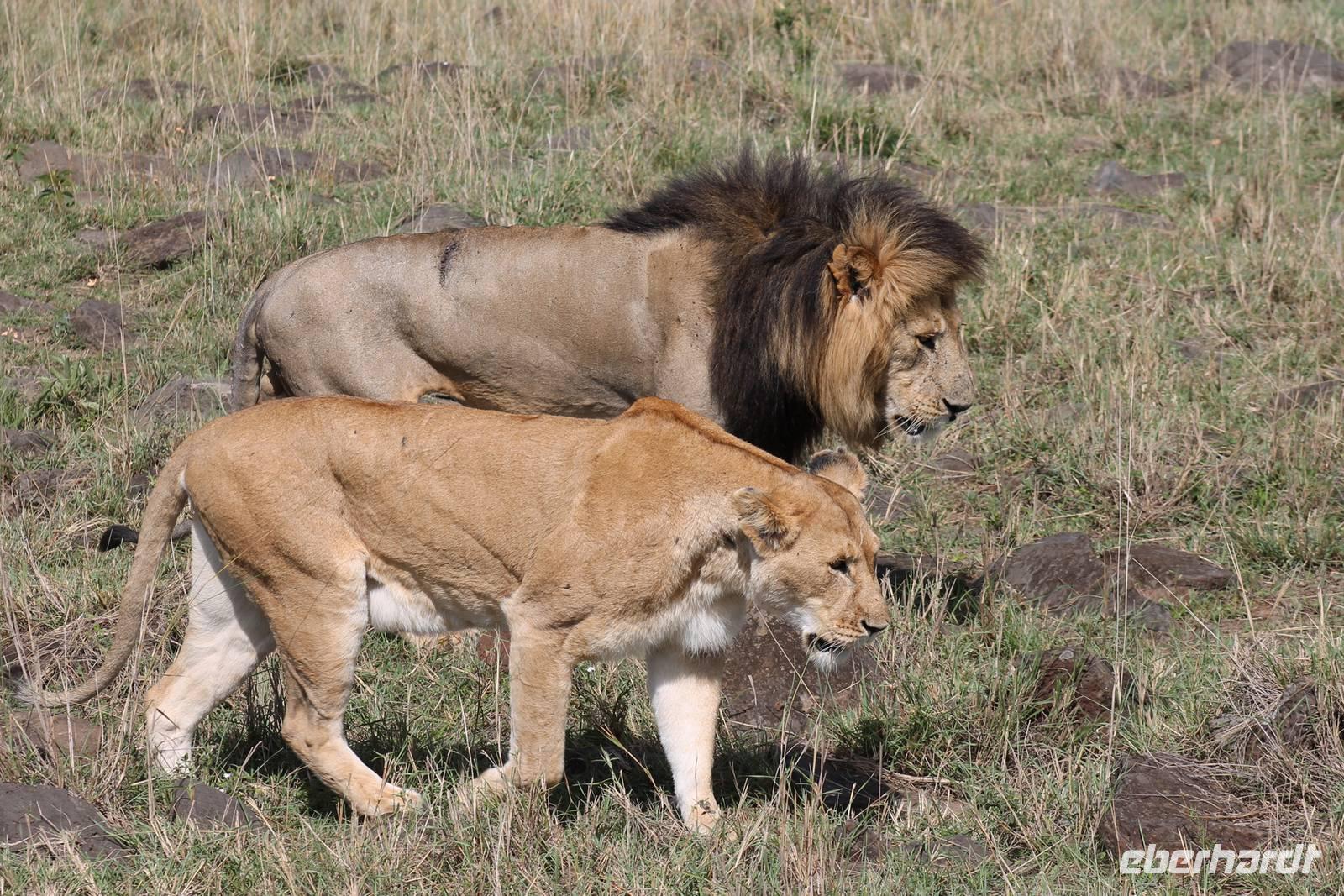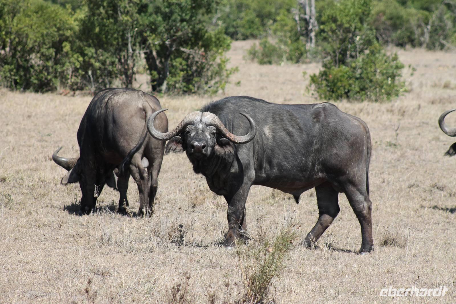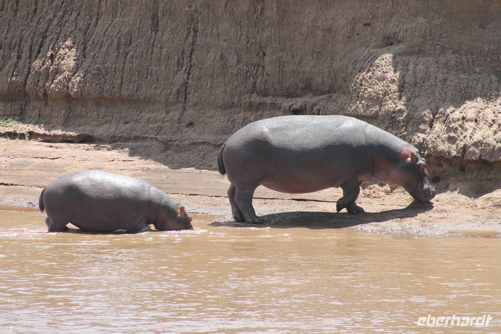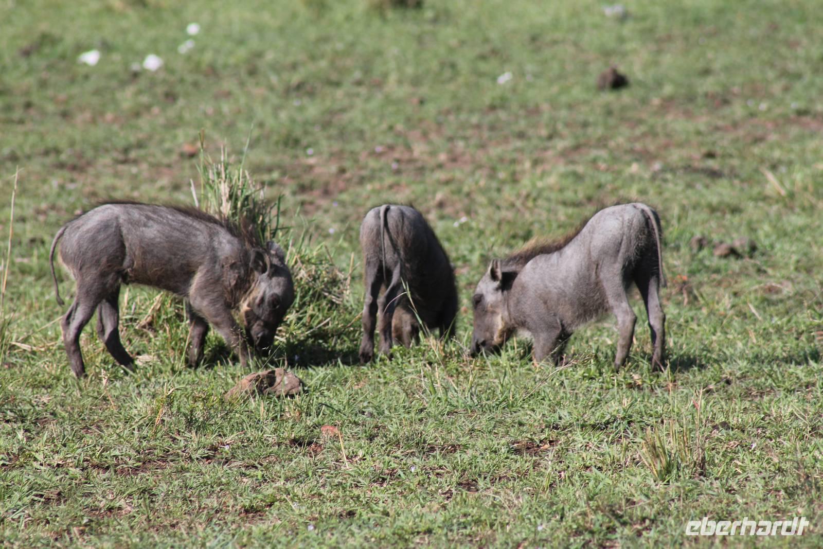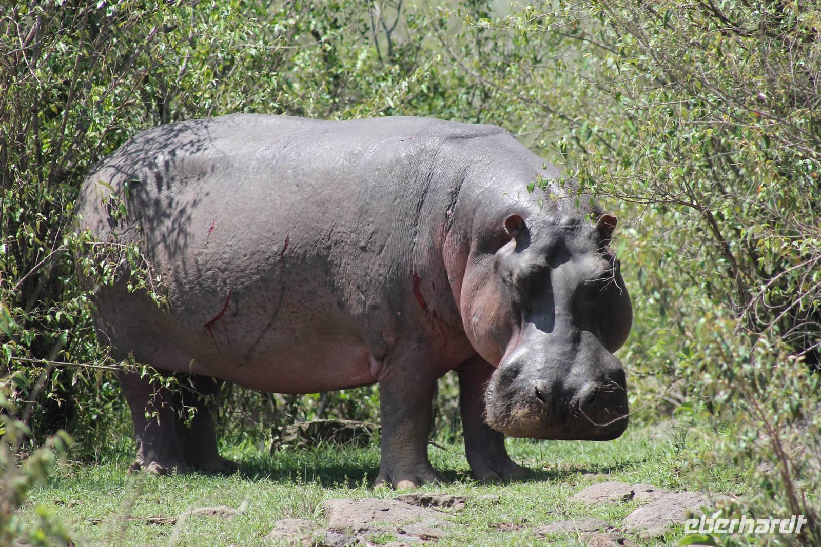 Die nächsten beiden Tage stehen ganz im Zeichen der Masai Mara und viele von uns empfanden diese zweifelsohne als einen Höhepunkt der Reise. Wir stehen natürlich wieder zeitig auf um eine frühe Pirsch in der Masai Mara zu unternehmen. Alle haben mehr oder weniger gut in ihren Zelten geschlafen, denn die Angst vor den Hippos bleibt, zumindest bei Vicky :-). Aber Sie fühlt sich schon etwas sicherer, da Sie ja ihren Askari immer dabei hat. Während unseren heutigen Pirschfahrten sehen wir wieder allerhand Tiere: Viele Gnuherden, einige Geier, kleine und große Warzenschweine und ganz viele Topis mit Jungen, die gerade erst geboren sind. Jackson erklärt uns, dass gerade Paarungszeit ist und so viele Jungen zur Welt kommen. Unglaublich das die kleinen Geschöpfe schon direkt nach der Geburt laufen und stehen können. Natürlich werden Sie von der Mutter sehr umsorgt, weil die Raubkatzen natürlich überall lauern um sich auch ein kleines Topi zu schnappen. Später sehen wir auch noch einen Strauss und mehrere Löwen. Später werden unsere Fahrer informiert, dass sich wohl ein totes Impala auf einem Baum befindet, welches von einem Leoparden gerissen wurde. Leider sehen wir nur das tote Impala aber keinen Leoparden. Ob wir ihn doch noch gesehen haben, erfahren Sie nur wenn Sie weiter lesen. Nach einigen vorbeiziehenden Giraffen und vielen weiteren Kibizen fahren wir mit unseren Jeeps zum Fluss, wo sich aus der Erfahrung heraus immer viele Tiere tummeln und wir sollten Recht behalten. Am Fluss angekommen sehen wir ein riesiges Krokodil, wahrscheinlich das größte Krokodil was wir bisher gesehen haben und auch einige Hippos. Wir sehen auch ein Hippo, was sich im Busch versteckt und viele Wunden hat. Wahrscheinlich hat es einen Machtkampf verloren und muss jetzt einsam und allein leben. Noch vor unserem Mittagessen begegnen wir auch einigen Löwen, die sich über eine Beute hermachen. Viele glauben es wäre ein kleines Warzenschwein, aber genau erkennen können wir es nicht, da es fast vollständig verspeist wurde. Bevor wir heute zu unserem Camp zurückkehren sehen wir auch endlich die ersten Elefanten und sogar mit Jungen. Es ist äußerst niedlich anzusehen, wir der Kleine versucht alles seiner Mutter nachzumachen. So versucht auch er sich Wasser über den Körper zu spritzen aber leider gelingt es nicht so richtig. Aber schön anzusehen war es in jedem Fall. An unserem Camp angekommen genießen wir ein leckeres Mittagessen und genießen dann noch ein wenig die Stille, die uns gibt. Es könnte mehr solche Momente geben aber natürlich wollen wir alle auch etwas erleben. So fahren wir auch am späten Nachmittag noch einmal raus, um weitere Tiere auf unsere Fotos zu bekommen und wir werden nicht enttäuscht. So sehen wir wunderschöne Masai Giraffen, Elandantilopen, Glanzgazellen, eine Riesentrappe, einen Marabu und auch den seltenen Kingfisher, den wir nun endlich auch einmal auf die Linse bekommen. Darüber freuen sich die Ornitologen unter uns natürlich auch sehr. Auch die Dämmerung hat heute noch so einiges zu bieten. So sehen wir noch eine Löwenfamilie mit kleinen Jungen, die gerade erst geboren sind. Ewig könnte man den kleinen zuschauen und man glaubt gar nicht, dass diese kleinen Wesen später mal zu Raubkatzen werden. Auf unserem Rückweg sehen wir noch eine Hyäne im Straßengraben, die sich von uns gar nicht stören lässt. Kurz bevor uns heute noch eine Überraschung erwartet, fahren unsere Jeeps noch einmal zu der Stelle, wo wir heute Morgen schon das tote Impala auf dem Baum gesehen haben und siehe da die Leopardenmama ist wieder da und hat auch ihr Junges im Gepäck. Wir können es kaum glauben, so schön sind diese Tiere und auch das Kleine würden wir am liebsten abknutschen.