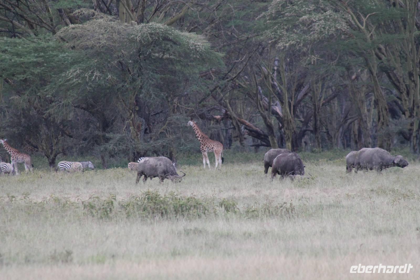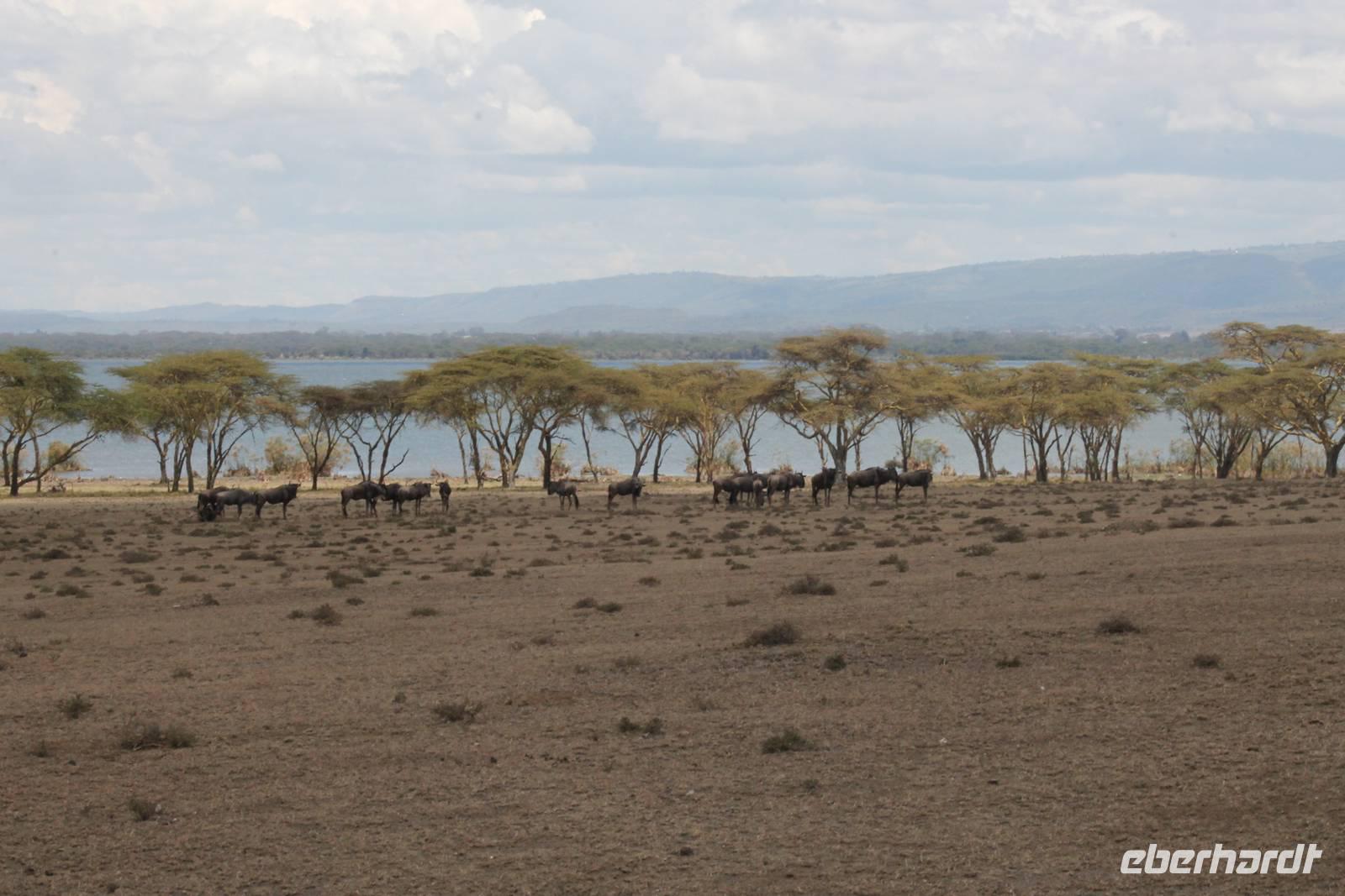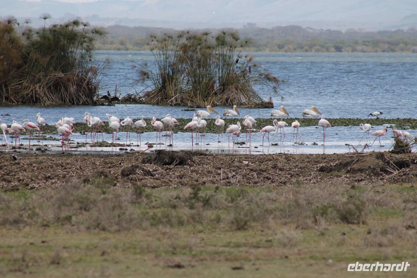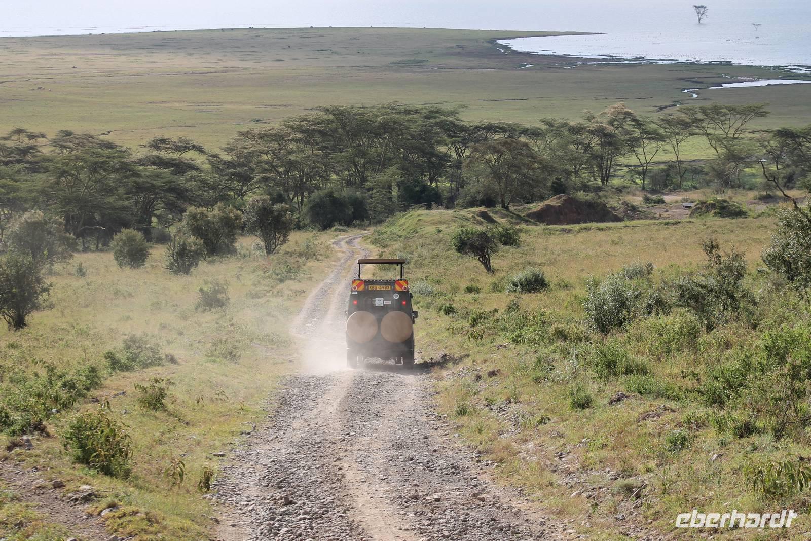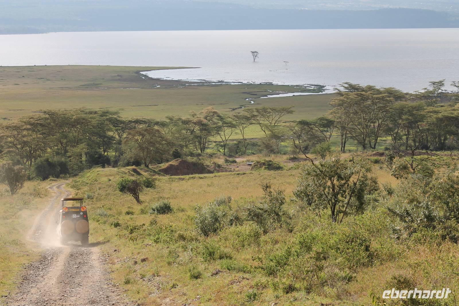 Heute ist in Deutschland Feiertag und so hat der Jeep von Jackson heute schulfrei. An allen anderen Tagen müssen immer schwierige Aufgaben gelöst werden, die am Ende bei einer Prüfung abgefragt werden. So sind wir froh, dass wir heute unsere Safari ohne Aufgaben in Ruhe genießen können. Heute müssen wir schon früh aufstehen, denn wir unternehmen eine Safari noch vor dem Frühstück. Der Lake Nakuru ist weltweit berühmt wegen seinem Vogelreichtum und besonders für die riesigen Flamingoschwärme mit bis zu 1,5 Millionen Tieren. Uns fällt auch heute im guten Licht besonders auf, dass der Nationalpark nicht nur eine unheimliche Tierdichte aufweist, sondern auch landschaftlich sehr abwechslungsreich ist mit Savannen, Wäldern, Felsen und Sumpf - und Seegebieten. Bevor wir aber heute morgen zeitig zum See fahren, sehen wir noch zwei schöne Hyänen sowie viele Büffel, Wasserböcke und Zebras, die sich teilweise auch am Seeufer tummeln. Am See angekommen sehen wir unheimlich viele Flamingos aber auch andere Vögel wie den Nimmersatt, den Kibiz und den Löffler, denen der See ebenfalls ein Zuhause bietet. Wir können uns gar nicht satt sehen an der unglaublichen Vogelschar. Im Hintergrund des Sees sehen wir auch einige Giraffen. Anschließend setzen wir unsere Pirsch fort und sehen noch einen Steppenadler, einige Schwalben, Graureiher und drei schöne Nashörner. Außerdem ein schönes Exemplar der Gabelrake und des Widehopfes.