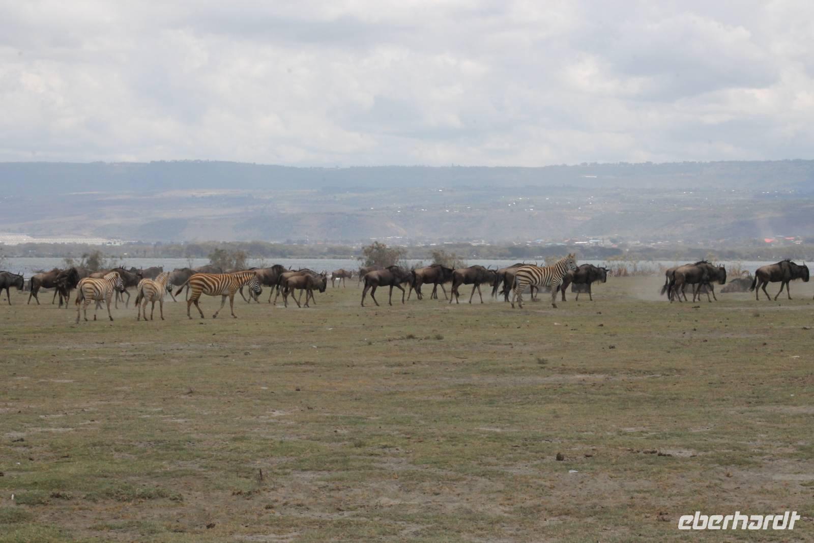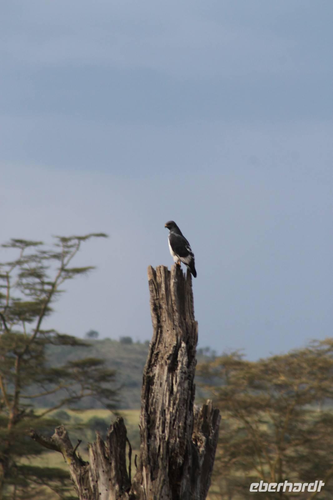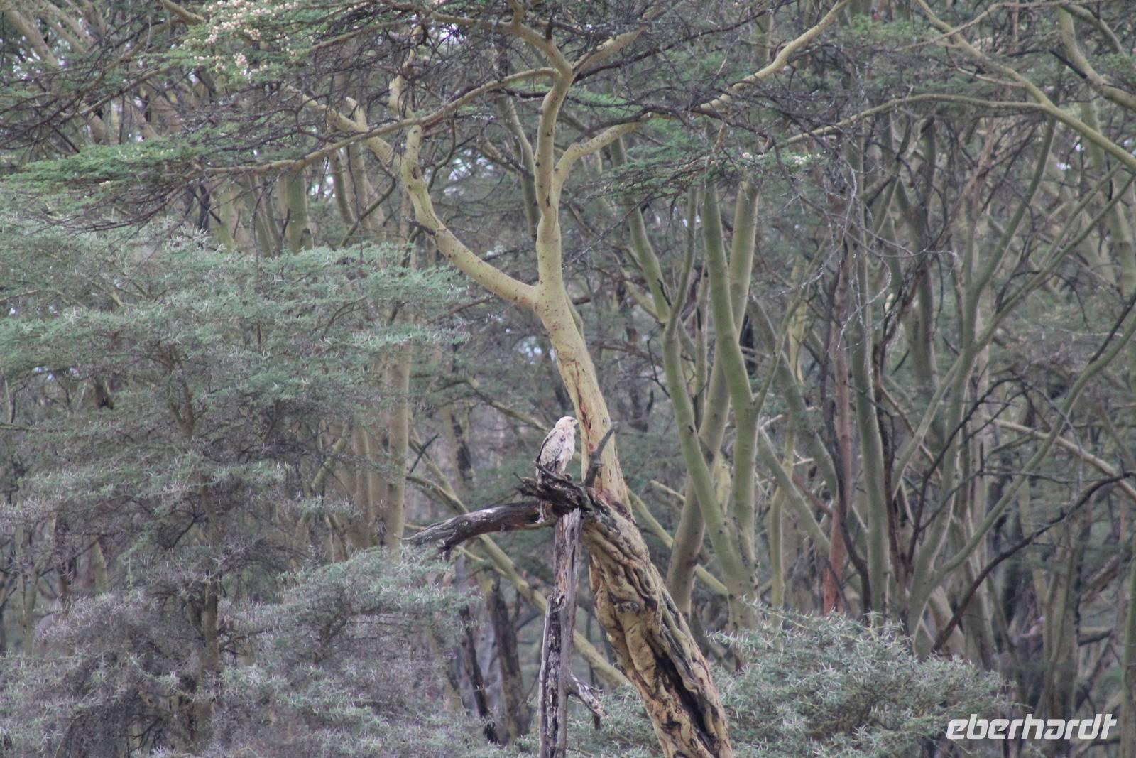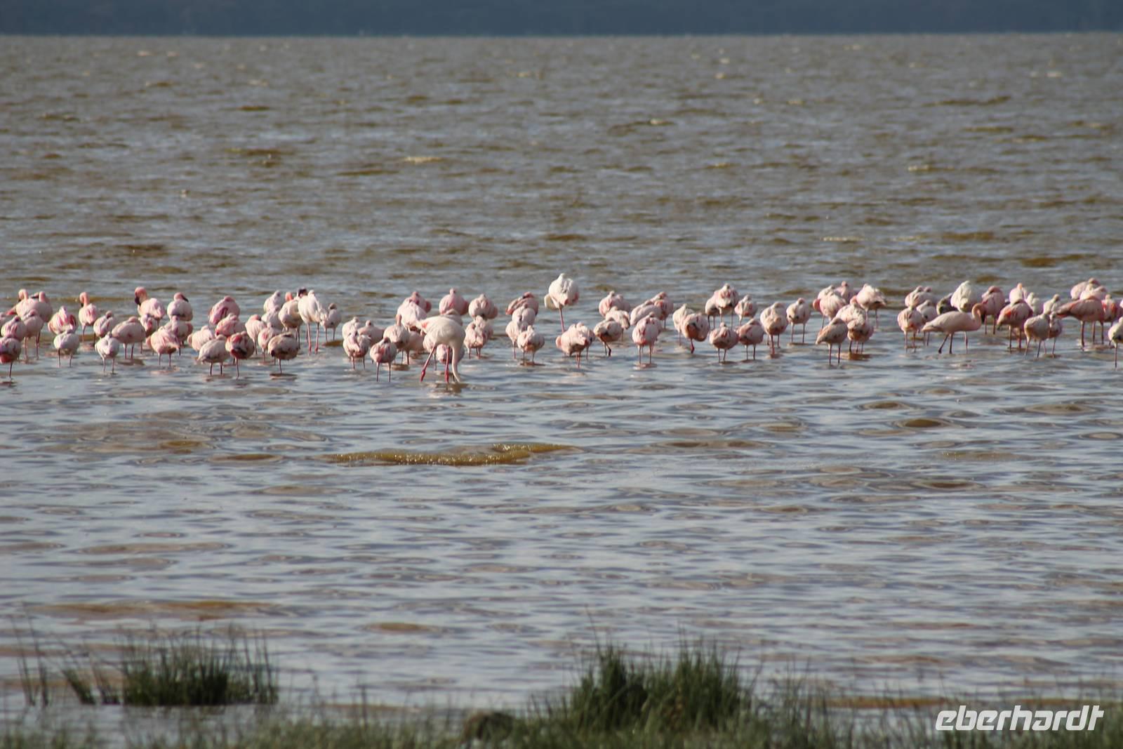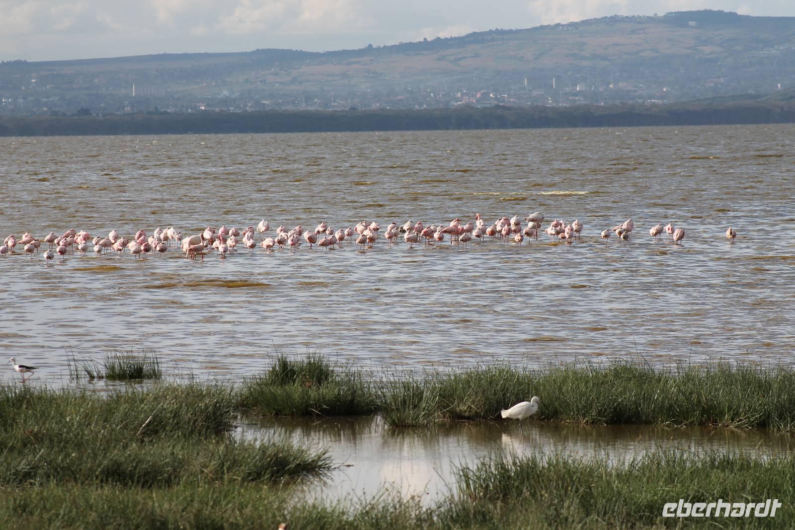 Heute ist in Deutschland Feiertag und so hat der Jeep von Jackson heute schulfrei. An allen anderen Tagen müssen immer schwierige Aufgaben gelöst werden, die am Ende bei einer Prüfung abgefragt werden. So sind wir froh, dass wir heute unsere Safari ohne Aufgaben in Ruhe genießen können. Heute müssen wir schon früh aufstehen, denn wir unternehmen eine Safari noch vor dem Frühstück. Der Lake Nakuru ist weltweit berühmt wegen seinem Vogelreichtum und besonders für die riesigen Flamingoschwärme mit bis zu 1,5 Millionen Tieren. Uns fällt auch heute im guten Licht besonders auf, dass der Nationalpark nicht nur eine unheimliche Tierdichte aufweist, sondern auch landschaftlich sehr abwechslungsreich ist mit Savannen, Wäldern, Felsen und Sumpf - und Seegebieten. Bevor wir aber heute morgen zeitig zum See fahren, sehen wir noch zwei schöne Hyänen sowie viele Büffel, Wasserböcke und Zebras, die sich teilweise auch am Seeufer tummeln. Am See angekommen sehen wir unheimlich viele Flamingos aber auch andere Vögel wie den Nimmersatt, den Kibiz und den Löffler, denen der See ebenfalls ein Zuhause bietet. Wir können uns gar nicht satt sehen an der unglaublichen Vogelschar. Im Hintergrund des Sees sehen wir auch einige Giraffen. Anschließend setzen wir unsere Pirsch fort und sehen noch einen Steppenadler, einige Schwalben, Graureiher und drei schöne Nashörner. Außerdem ein schönes Exemplar der Gabelrake und des Widehopfes.