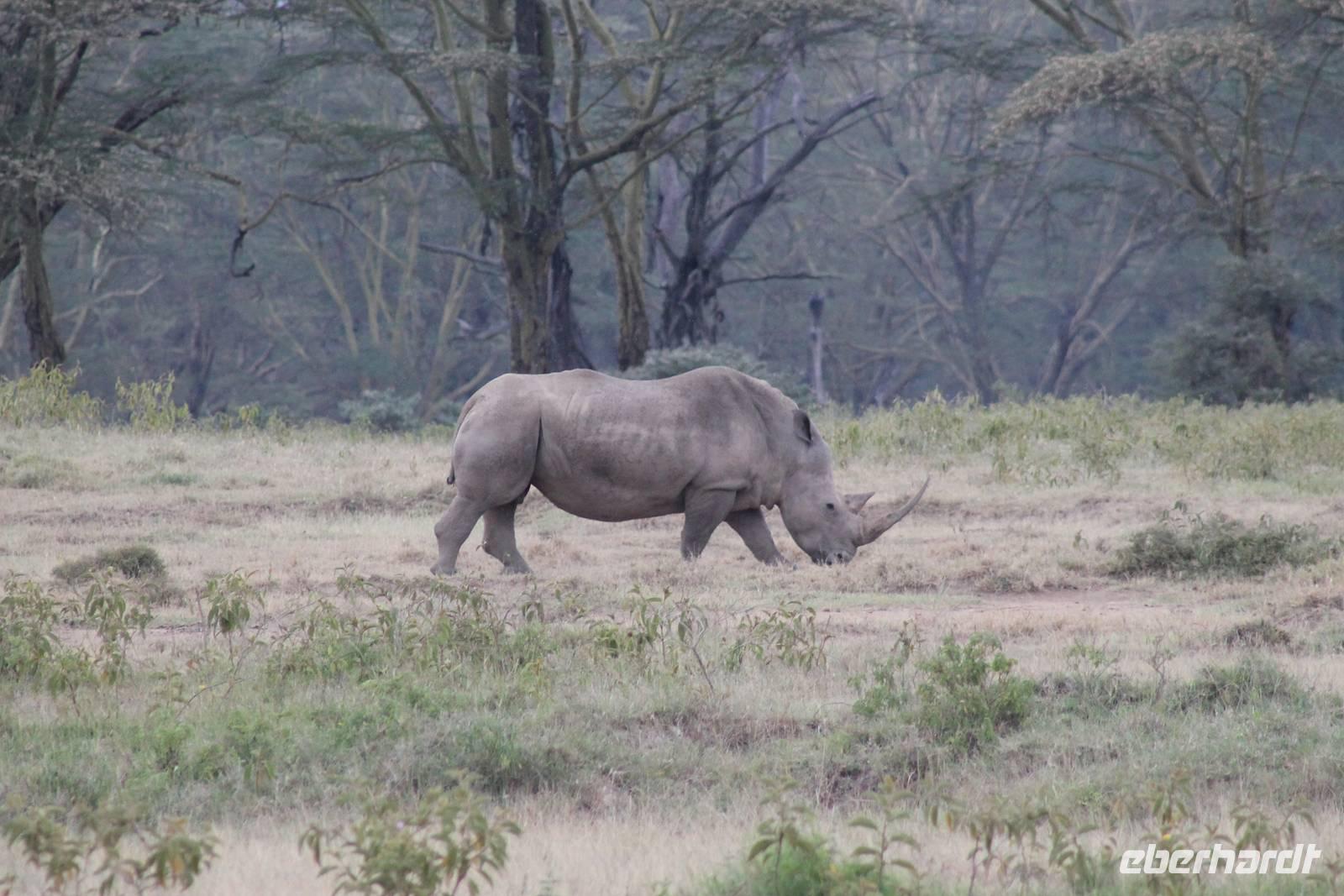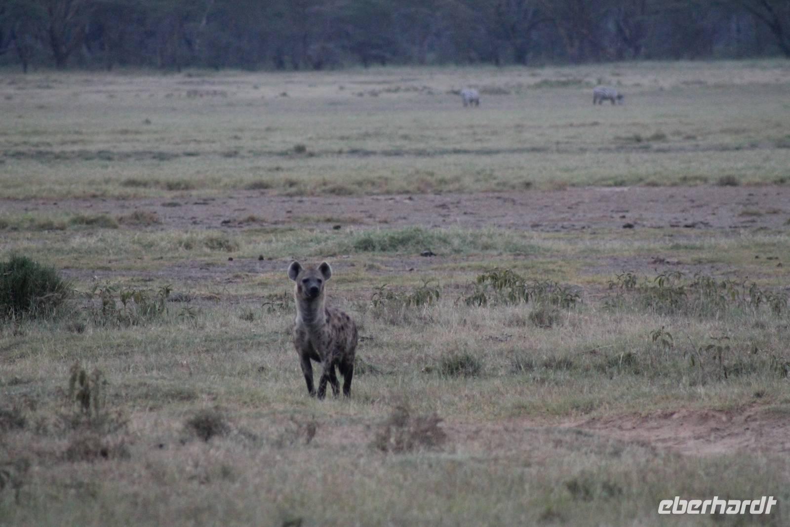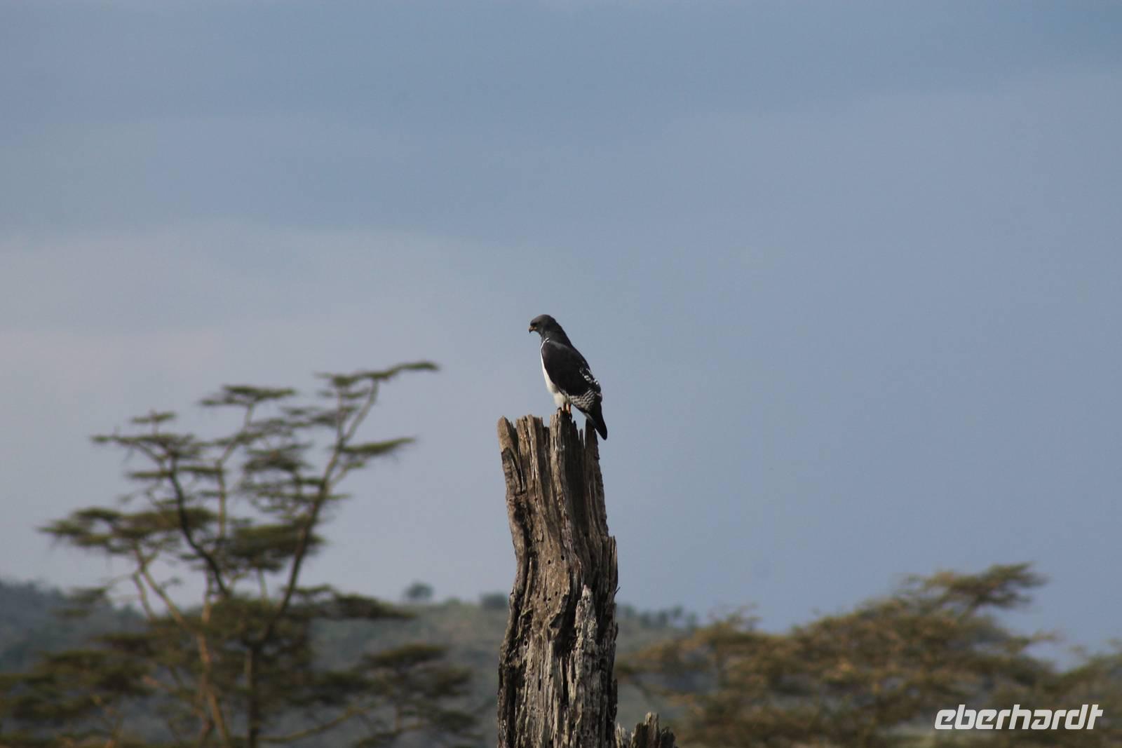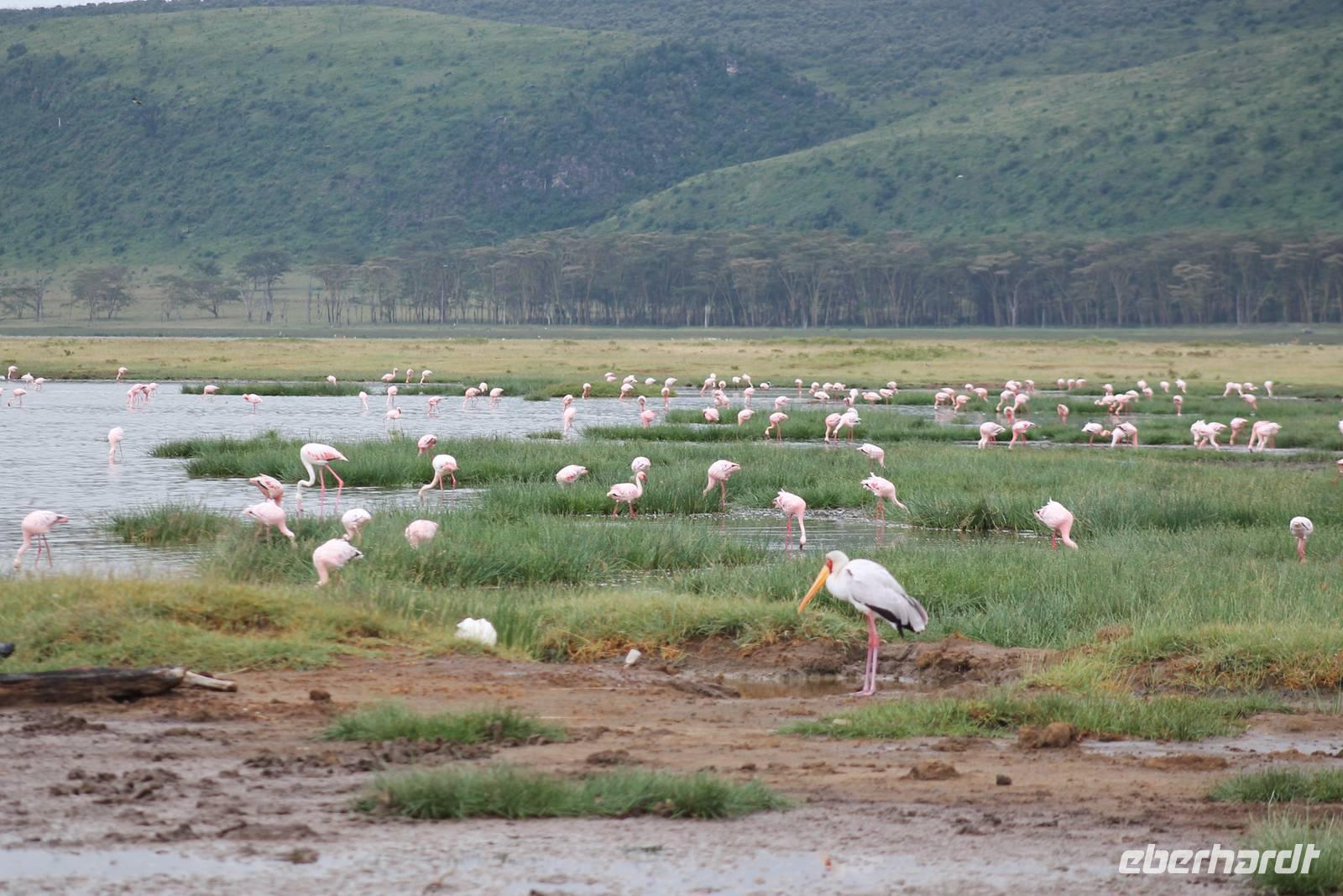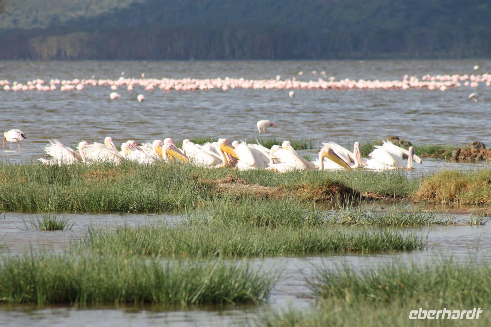 Heute ist in Deutschland Feiertag und so hat der Jeep von Jackson heute schulfrei. An allen anderen Tagen müssen immer schwierige Aufgaben gelöst werden, die am Ende bei einer Prüfung abgefragt werden. So sind wir froh, dass wir heute unsere Safari ohne Aufgaben in Ruhe genießen können. Heute müssen wir schon früh aufstehen, denn wir unternehmen eine Safari noch vor dem Frühstück. Der Lake Nakuru ist weltweit berühmt wegen seinem Vogelreichtum und besonders für die riesigen Flamingoschwärme mit bis zu 1,5 Millionen Tieren. Uns fällt auch heute im guten Licht besonders auf, dass der Nationalpark nicht nur eine unheimliche Tierdichte aufweist, sondern auch landschaftlich sehr abwechslungsreich ist mit Savannen, Wäldern, Felsen und Sumpf - und Seegebieten. Bevor wir aber heute morgen zeitig zum See fahren, sehen wir noch zwei schöne Hyänen sowie viele Büffel, Wasserböcke und Zebras, die sich teilweise auch am Seeufer tummeln. Am See angekommen sehen wir unheimlich viele Flamingos aber auch andere Vögel wie den Nimmersatt, den Kibiz und den Löffler, denen der See ebenfalls ein Zuhause bietet. Wir können uns gar nicht satt sehen an der unglaublichen Vogelschar. Im Hintergrund des Sees sehen wir auch einige Giraffen. Anschließend setzen wir unsere Pirsch fort und sehen noch einen Steppenadler, einige Schwalben, Graureiher und drei schöne Nashörner. Außerdem ein schönes Exemplar der Gabelrake und des Widehopfes.