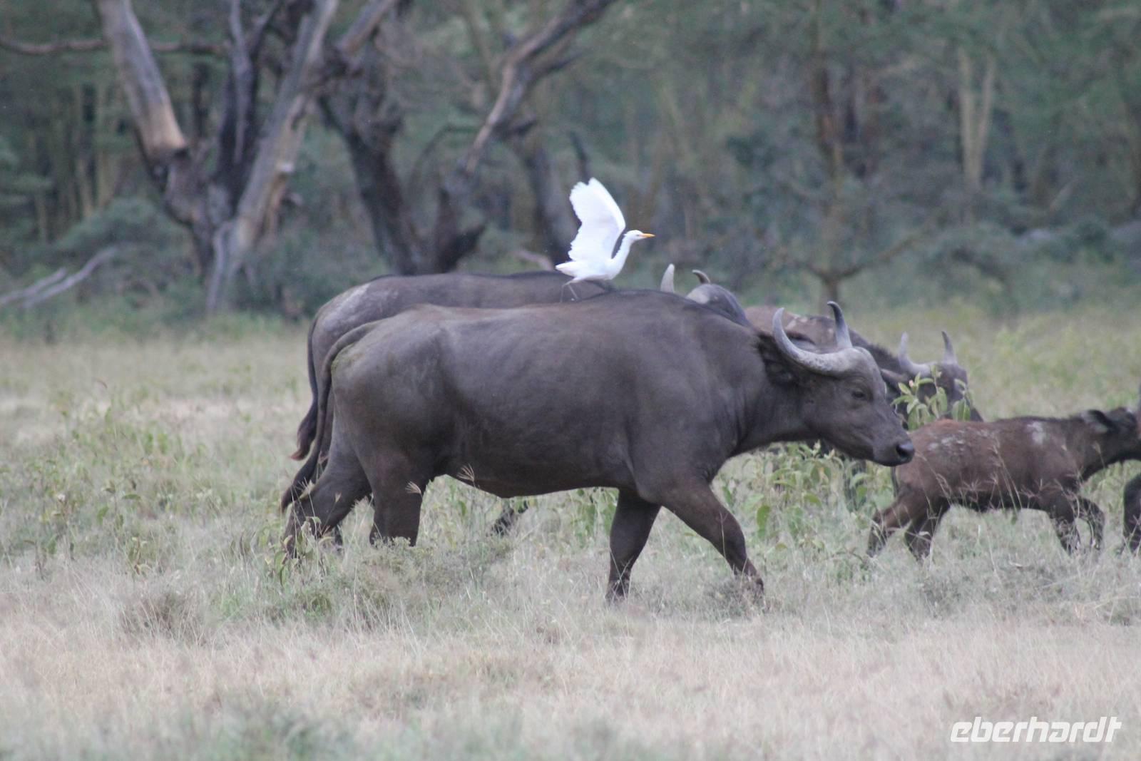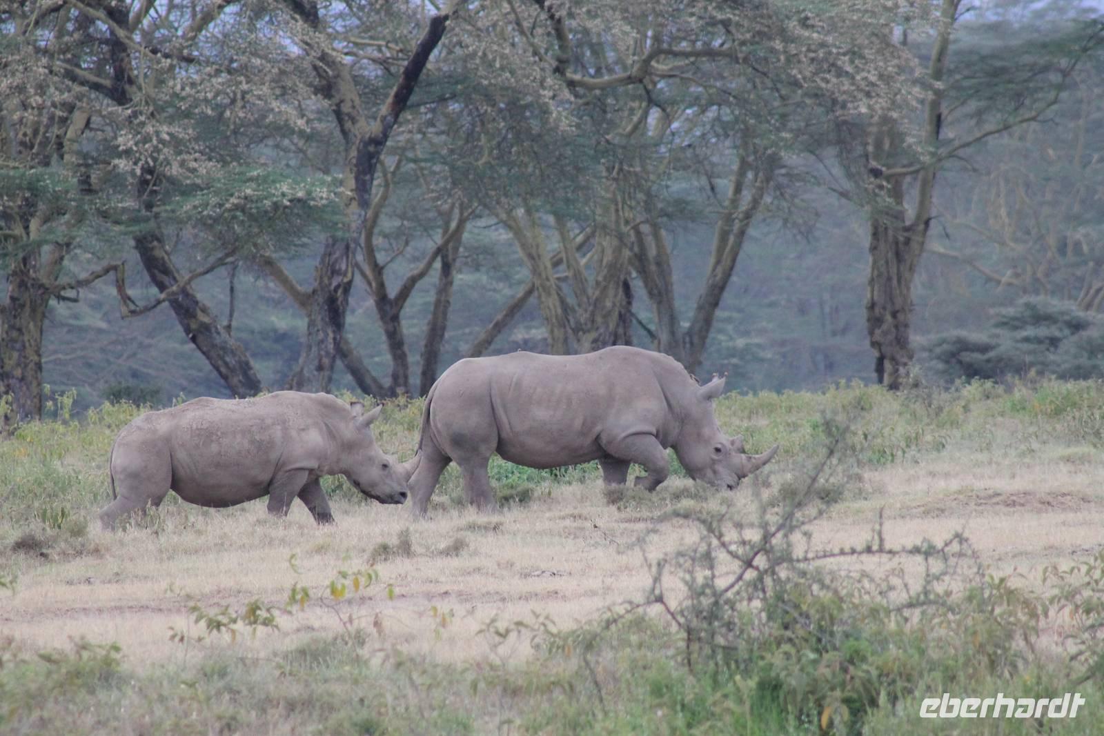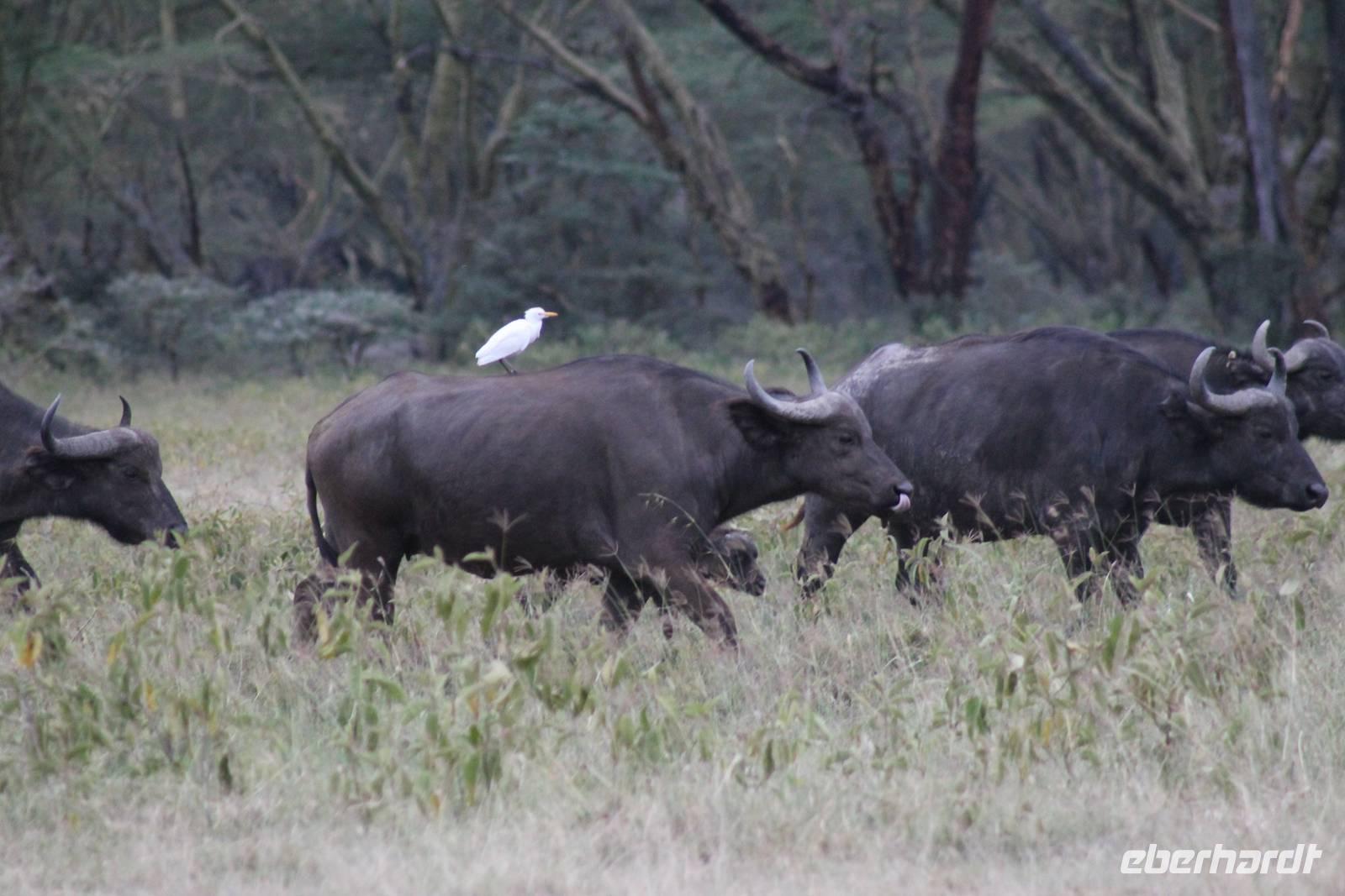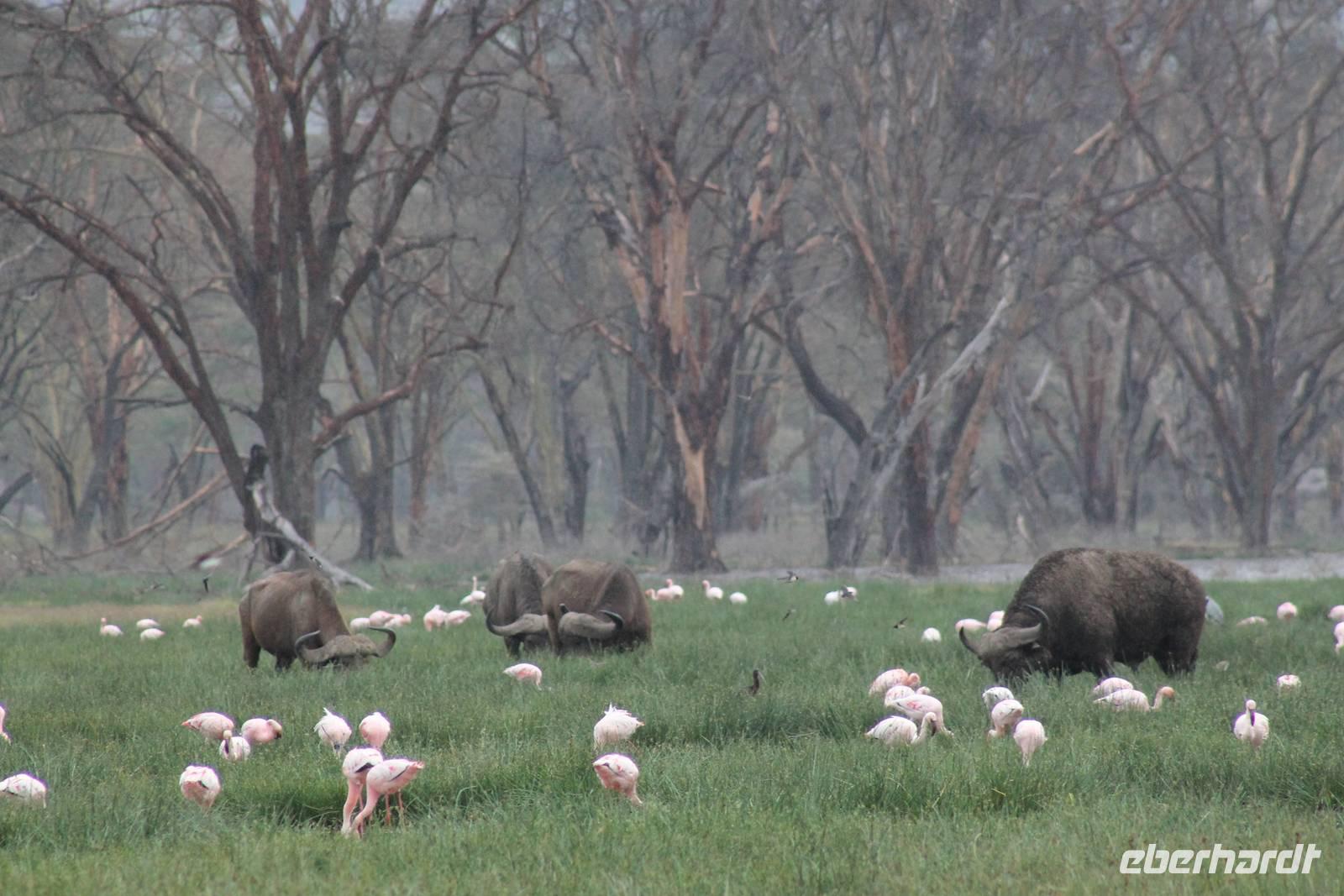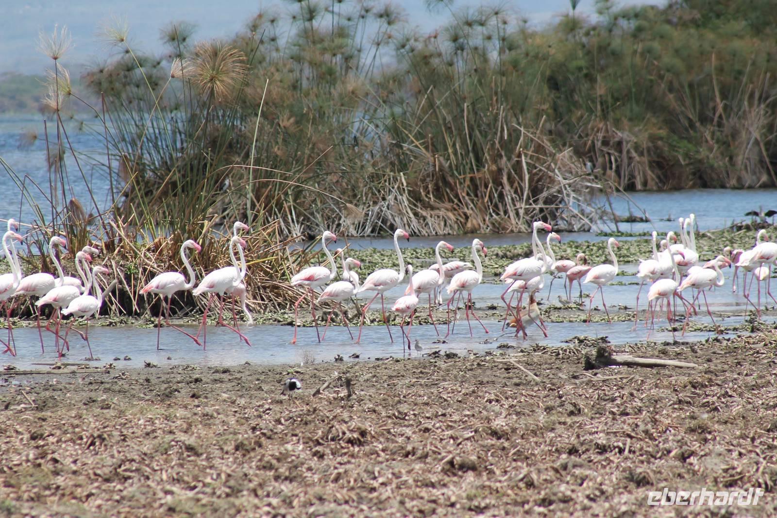 Heute ist in Deutschland Feiertag und so hat der Jeep von Jackson heute schulfrei. An allen anderen Tagen müssen immer schwierige Aufgaben gelöst werden, die am Ende bei einer Prüfung abgefragt werden. So sind wir froh, dass wir heute unsere Safari ohne Aufgaben in Ruhe genießen können. Heute müssen wir schon früh aufstehen, denn wir unternehmen eine Safari noch vor dem Frühstück. Der Lake Nakuru ist weltweit berühmt wegen seinem Vogelreichtum und besonders für die riesigen Flamingoschwärme mit bis zu 1,5 Millionen Tieren. Uns fällt auch heute im guten Licht besonders auf, dass der Nationalpark nicht nur eine unheimliche Tierdichte aufweist, sondern auch landschaftlich sehr abwechslungsreich ist mit Savannen, Wäldern, Felsen und Sumpf - und Seegebieten. Bevor wir aber heute morgen zeitig zum See fahren, sehen wir noch zwei schöne Hyänen sowie viele Büffel, Wasserböcke und Zebras, die sich teilweise auch am Seeufer tummeln. Am See angekommen sehen wir unheimlich viele Flamingos aber auch andere Vögel wie den Nimmersatt, den Kibiz und den Löffler, denen der See ebenfalls ein Zuhause bietet. Wir können uns gar nicht satt sehen an der unglaublichen Vogelschar. Im Hintergrund des Sees sehen wir auch einige Giraffen. Anschließend setzen wir unsere Pirsch fort und sehen noch einen Steppenadler, einige Schwalben, Graureiher und drei schöne Nashörner. Außerdem ein schönes Exemplar der Gabelrake und des Widehopfes.