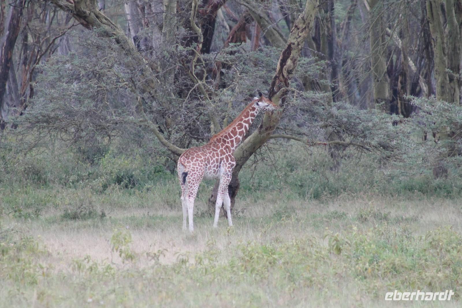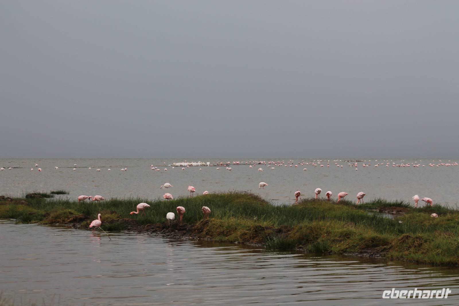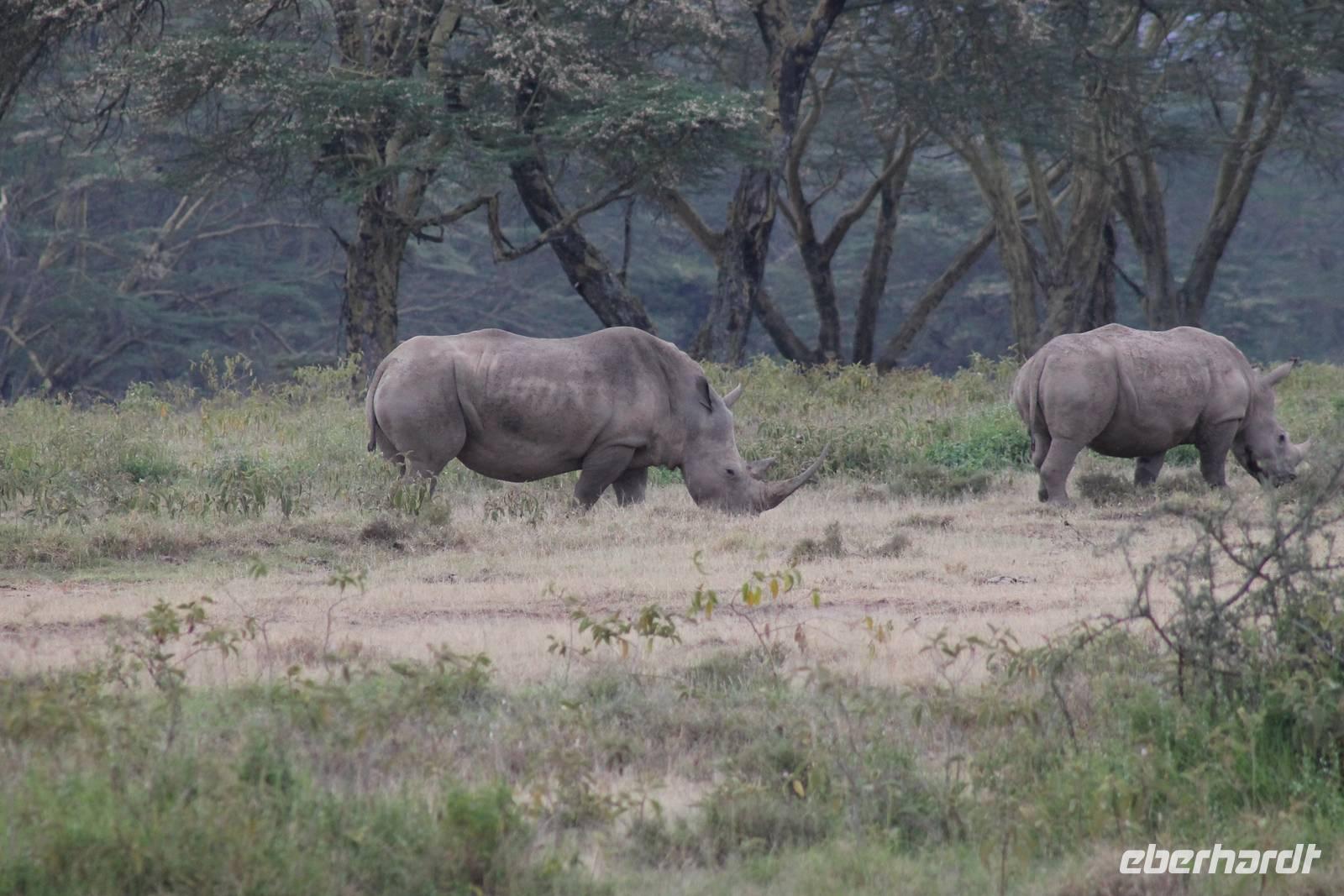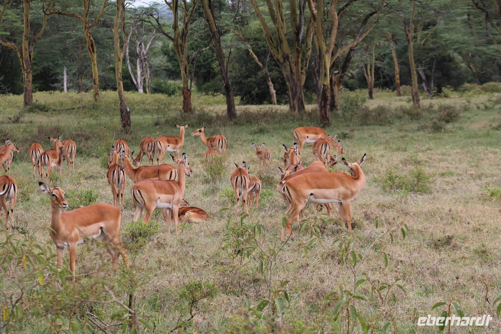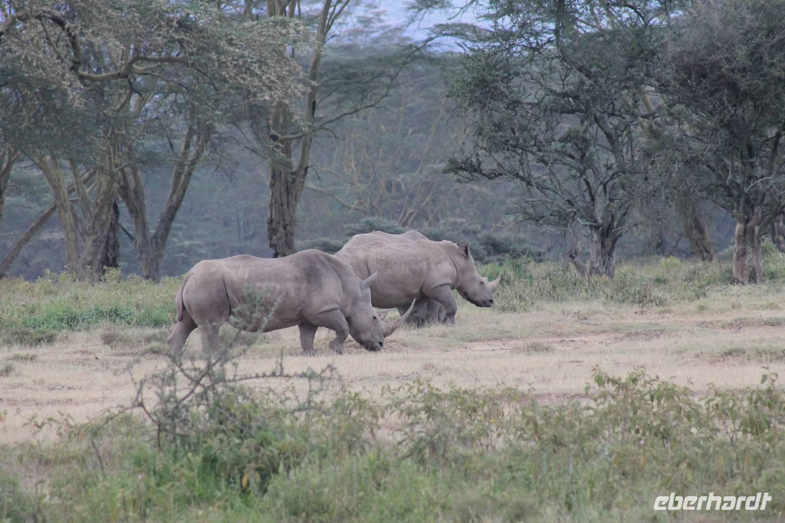 Heute ist in Deutschland Feiertag und so hat der Jeep von Jackson heute schulfrei. An allen anderen Tagen müssen immer schwierige Aufgaben gelöst werden, die am Ende bei einer Prüfung abgefragt werden. So sind wir froh, dass wir heute unsere Safari ohne Aufgaben in Ruhe genießen können. Heute müssen wir schon früh aufstehen, denn wir unternehmen eine Safari noch vor dem Frühstück. Der Lake Nakuru ist weltweit berühmt wegen seinem Vogelreichtum und besonders für die riesigen Flamingoschwärme mit bis zu 1,5 Millionen Tieren. Uns fällt auch heute im guten Licht besonders auf, dass der Nationalpark nicht nur eine unheimliche Tierdichte aufweist, sondern auch landschaftlich sehr abwechslungsreich ist mit Savannen, Wäldern, Felsen und Sumpf - und Seegebieten. Bevor wir aber heute morgen zeitig zum See fahren, sehen wir noch zwei schöne Hyänen sowie viele Büffel, Wasserböcke und Zebras, die sich teilweise auch am Seeufer tummeln. Am See angekommen sehen wir unheimlich viele Flamingos aber auch andere Vögel wie den Nimmersatt, den Kibiz und den Löffler, denen der See ebenfalls ein Zuhause bietet. Wir können uns gar nicht satt sehen an der unglaublichen Vogelschar. Im Hintergrund des Sees sehen wir auch einige Giraffen. Anschließend setzen wir unsere Pirsch fort und sehen noch einen Steppenadler, einige Schwalben, Graureiher und drei schöne Nashörner. Außerdem ein schönes Exemplar der Gabelrake und des Widehopfes.