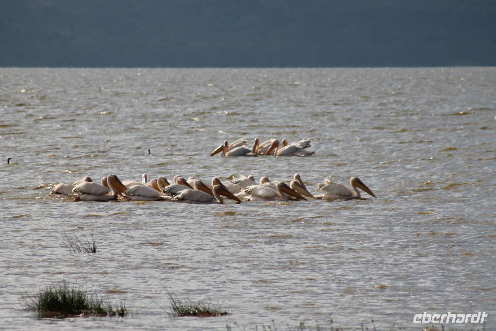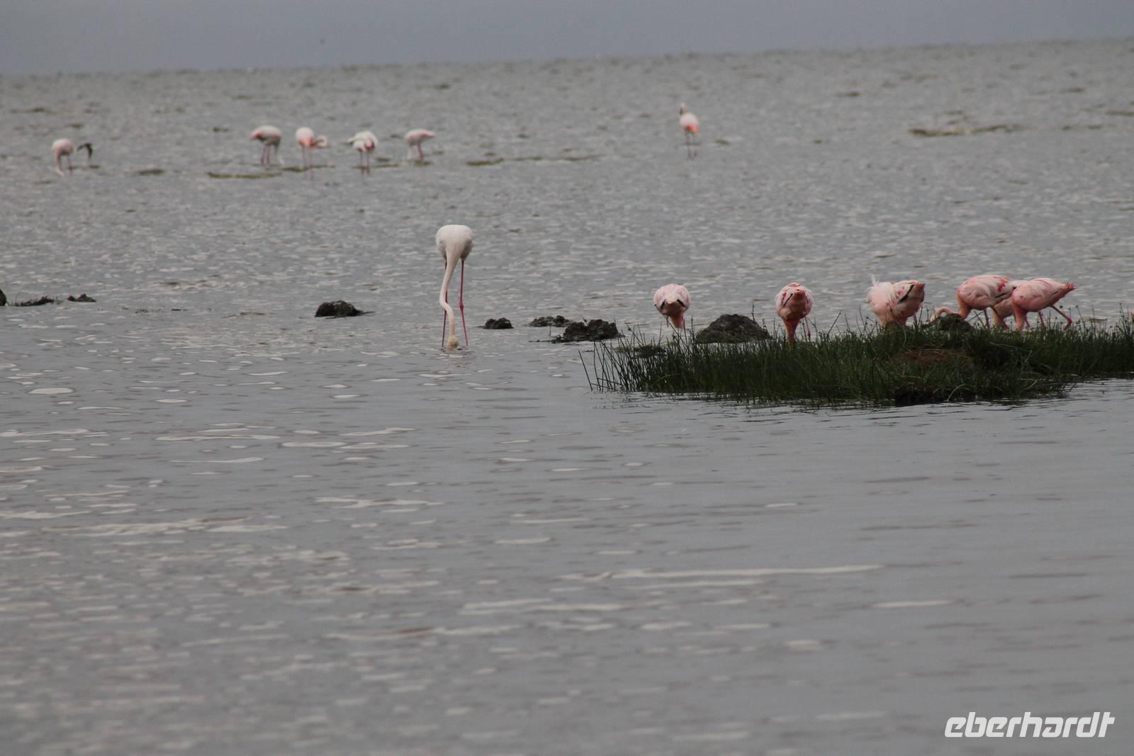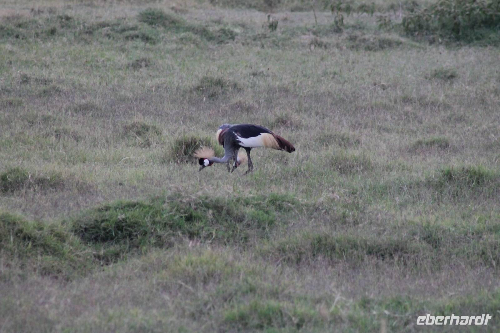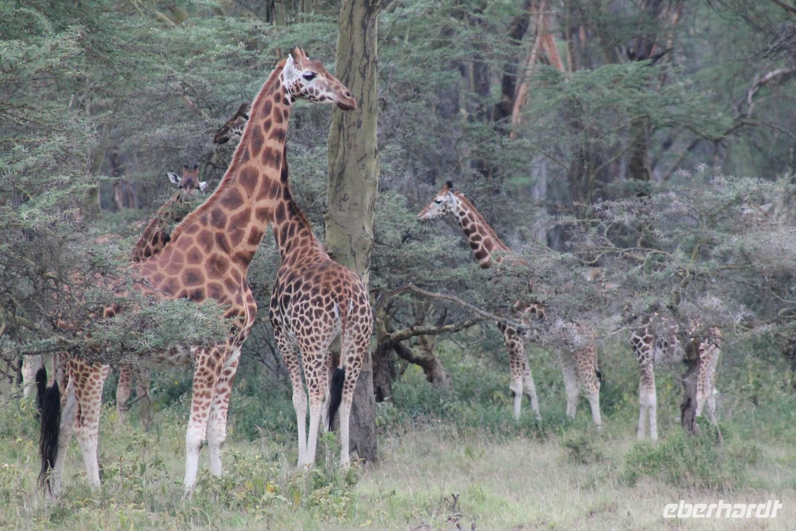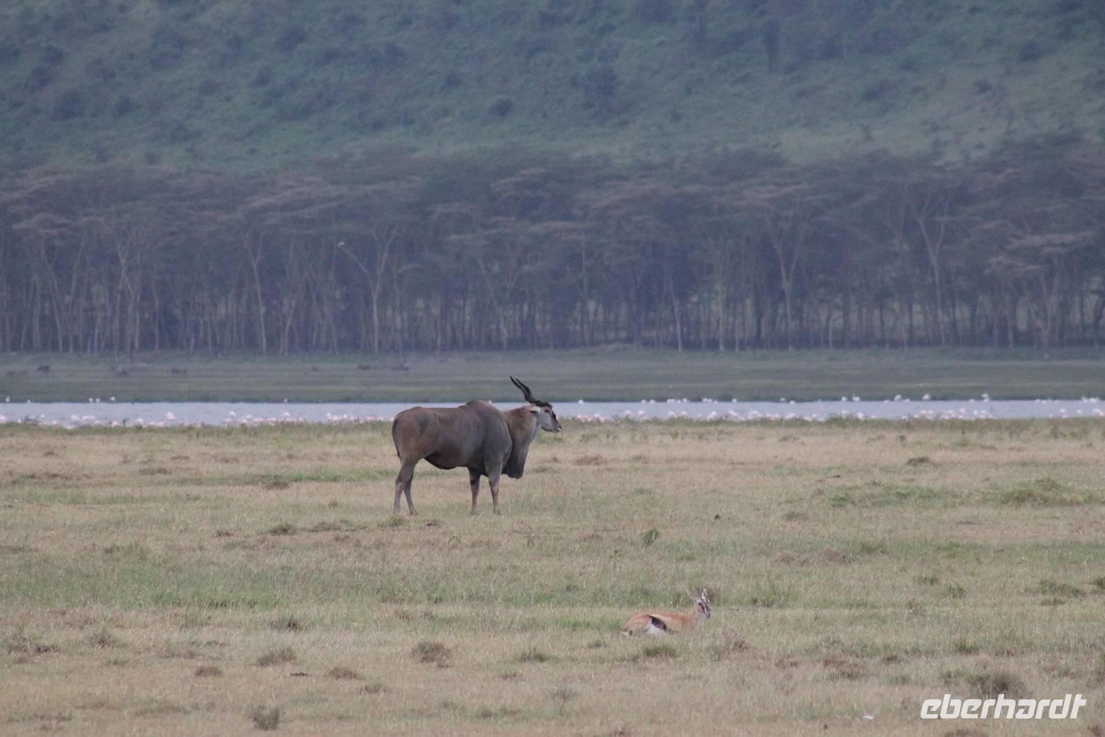 Heute ist in Deutschland Feiertag und so hat der Jeep von Jackson heute schulfrei. An allen anderen Tagen müssen immer schwierige Aufgaben gelöst werden, die am Ende bei einer Prüfung abgefragt werden. So sind wir froh, dass wir heute unsere Safari ohne Aufgaben in Ruhe genießen können. Heute müssen wir schon früh aufstehen, denn wir unternehmen eine Safari noch vor dem Frühstück. Der Lake Nakuru ist weltweit berühmt wegen seinem Vogelreichtum und besonders für die riesigen Flamingoschwärme mit bis zu 1,5 Millionen Tieren. Uns fällt auch heute im guten Licht besonders auf, dass der Nationalpark nicht nur eine unheimliche Tierdichte aufweist, sondern auch landschaftlich sehr abwechslungsreich ist mit Savannen, Wäldern, Felsen und Sumpf - und Seegebieten. Bevor wir aber heute morgen zeitig zum See fahren, sehen wir noch zwei schöne Hyänen sowie viele Büffel, Wasserböcke und Zebras, die sich teilweise auch am Seeufer tummeln. Am See angekommen sehen wir unheimlich viele Flamingos aber auch andere Vögel wie den Nimmersatt, den Kibiz und den Löffler, denen der See ebenfalls ein Zuhause bietet. Wir können uns gar nicht satt sehen an der unglaublichen Vogelschar. Im Hintergrund des Sees sehen wir auch einige Giraffen. Anschließend setzen wir unsere Pirsch fort und sehen noch einen Steppenadler, einige Schwalben, Graureiher und drei schöne Nashörner. Außerdem ein schönes Exemplar der Gabelrake und des Widehopfes.