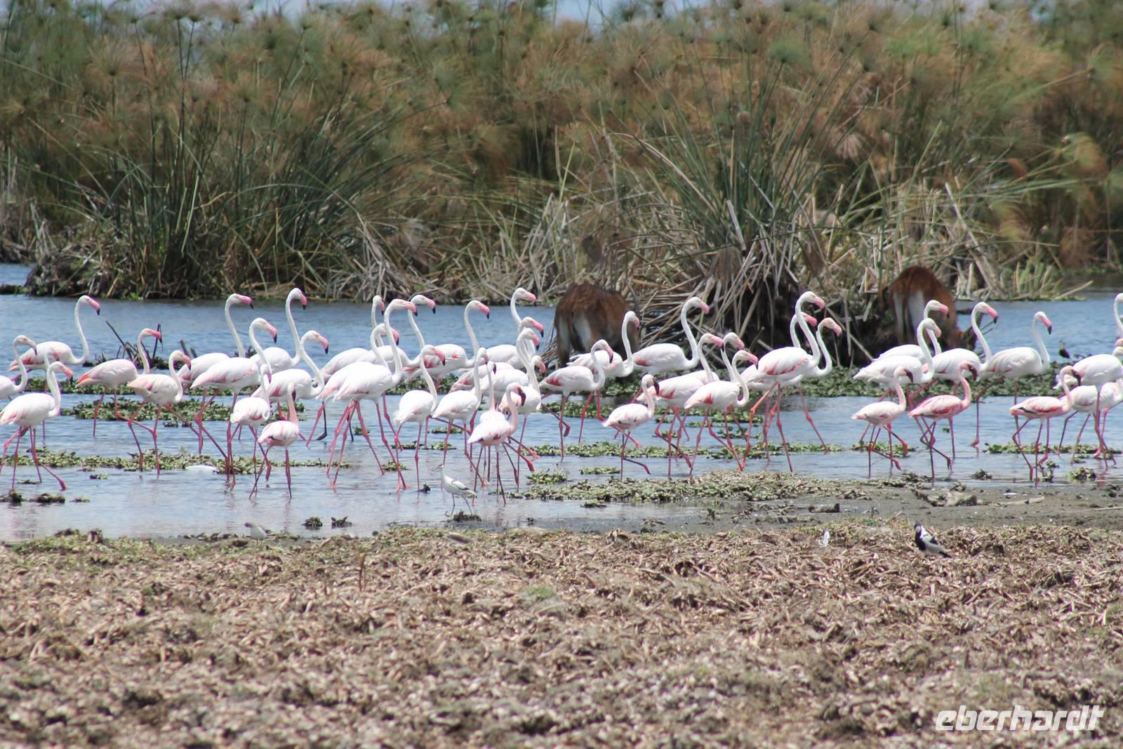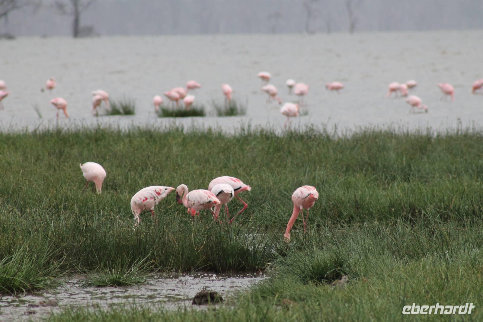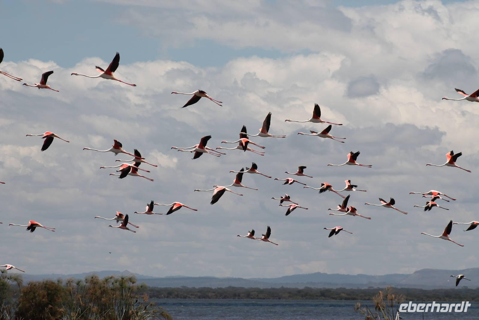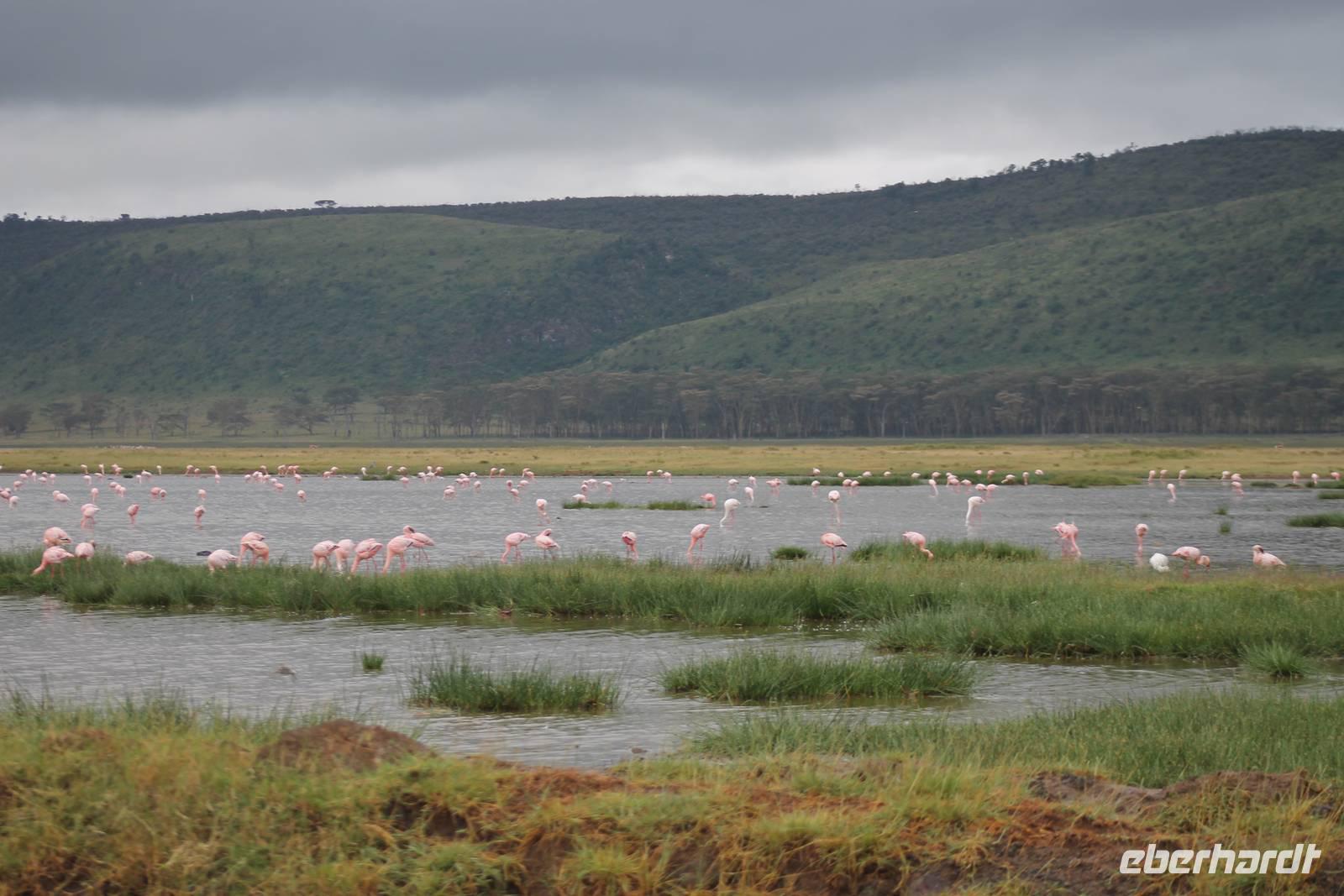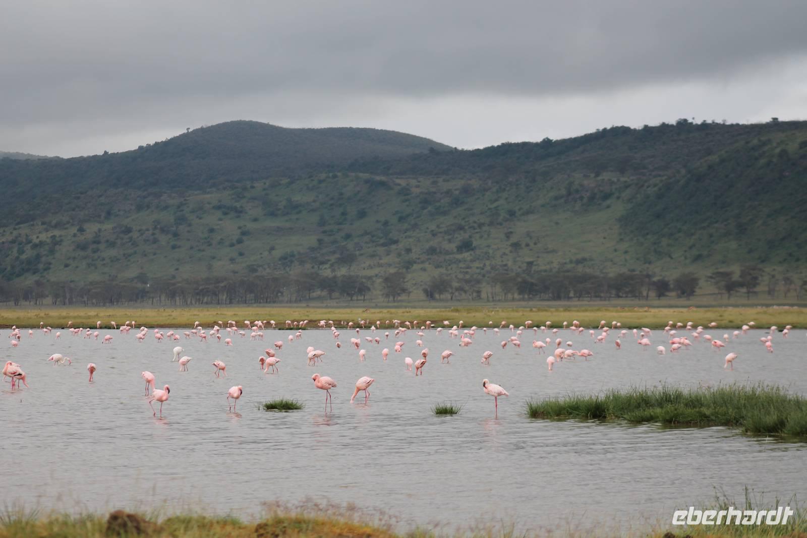 Heute ist in Deutschland Feiertag und so hat der Jeep von Jackson heute schulfrei. An allen anderen Tagen müssen immer schwierige Aufgaben gelöst werden, die am Ende bei einer Prüfung abgefragt werden. So sind wir froh, dass wir heute unsere Safari ohne Aufgaben in Ruhe genießen können. Heute müssen wir schon früh aufstehen, denn wir unternehmen eine Safari noch vor dem Frühstück. Der Lake Nakuru ist weltweit berühmt wegen seinem Vogelreichtum und besonders für die riesigen Flamingoschwärme mit bis zu 1,5 Millionen Tieren. Uns fällt auch heute im guten Licht besonders auf, dass der Nationalpark nicht nur eine unheimliche Tierdichte aufweist, sondern auch landschaftlich sehr abwechslungsreich ist mit Savannen, Wäldern, Felsen und Sumpf - und Seegebieten. Bevor wir aber heute morgen zeitig zum See fahren, sehen wir noch zwei schöne Hyänen sowie viele Büffel, Wasserböcke und Zebras, die sich teilweise auch am Seeufer tummeln. Am See angekommen sehen wir unheimlich viele Flamingos aber auch andere Vögel wie den Nimmersatt, den Kibiz und den Löffler, denen der See ebenfalls ein Zuhause bietet. Wir können uns gar nicht satt sehen an der unglaublichen Vogelschar. Im Hintergrund des Sees sehen wir auch einige Giraffen. Anschließend setzen wir unsere Pirsch fort und sehen noch einen Steppenadler, einige Schwalben, Graureiher und drei schöne Nashörner. Außerdem ein schönes Exemplar der Gabelrake und des Widehopfes.