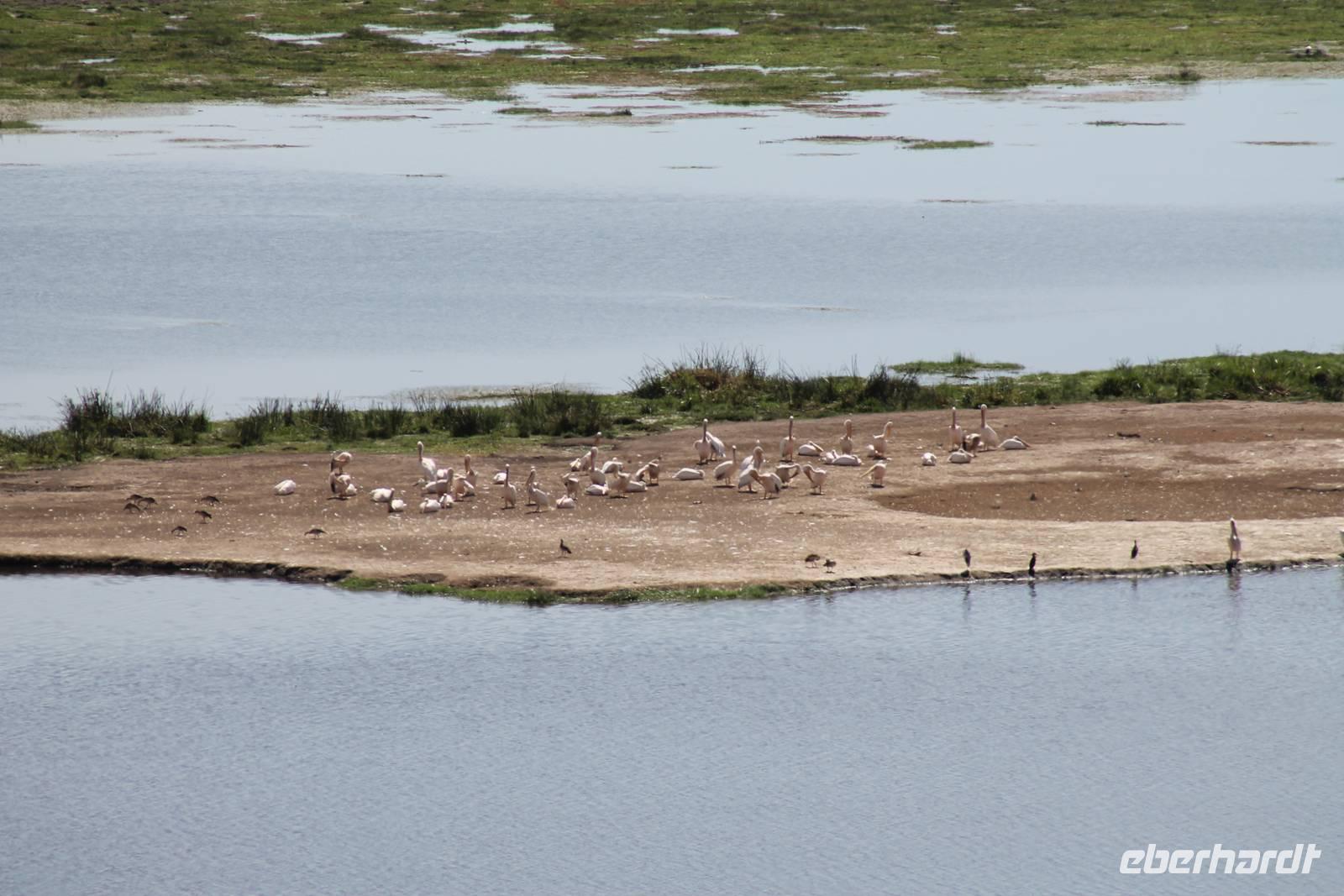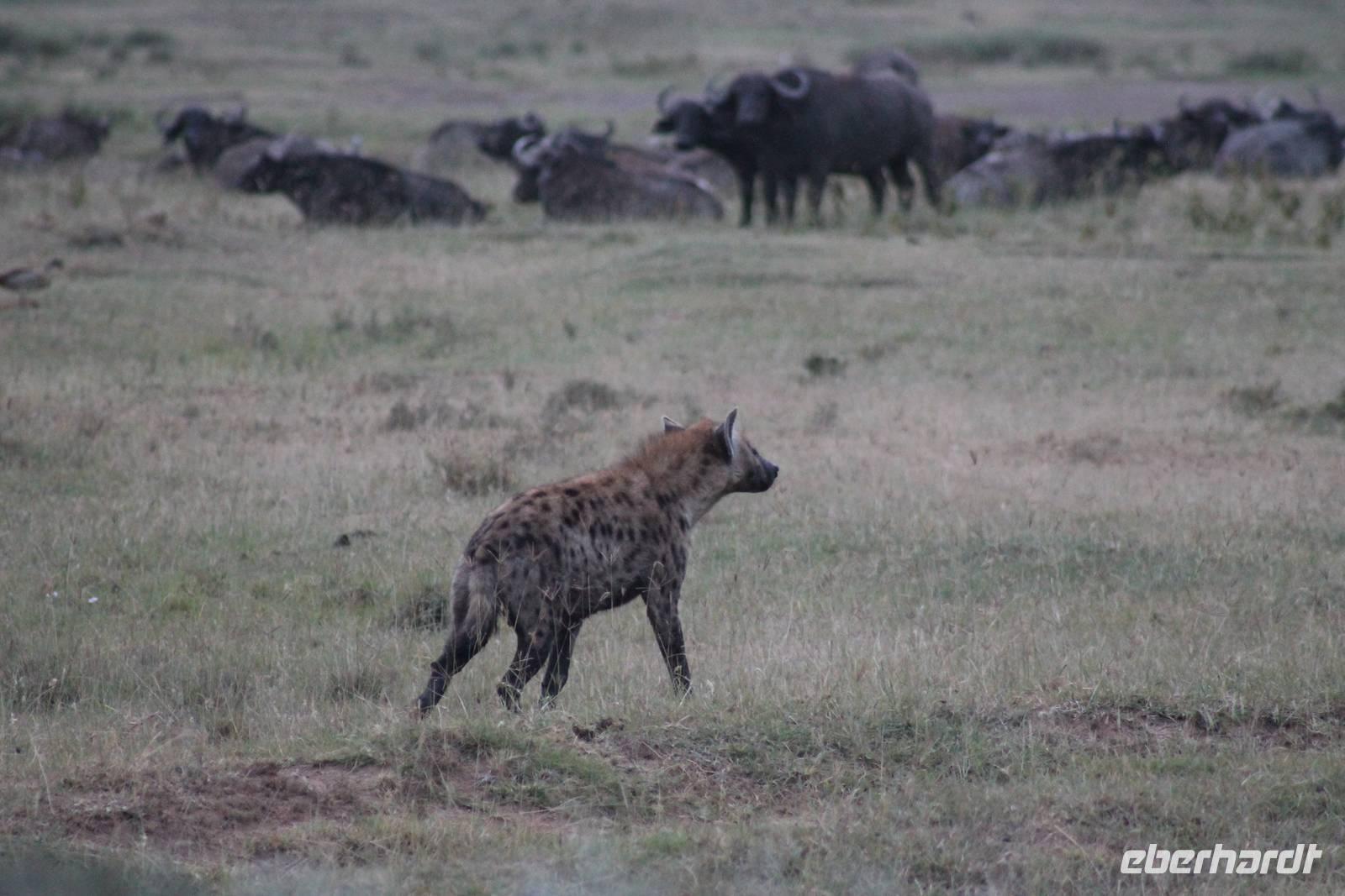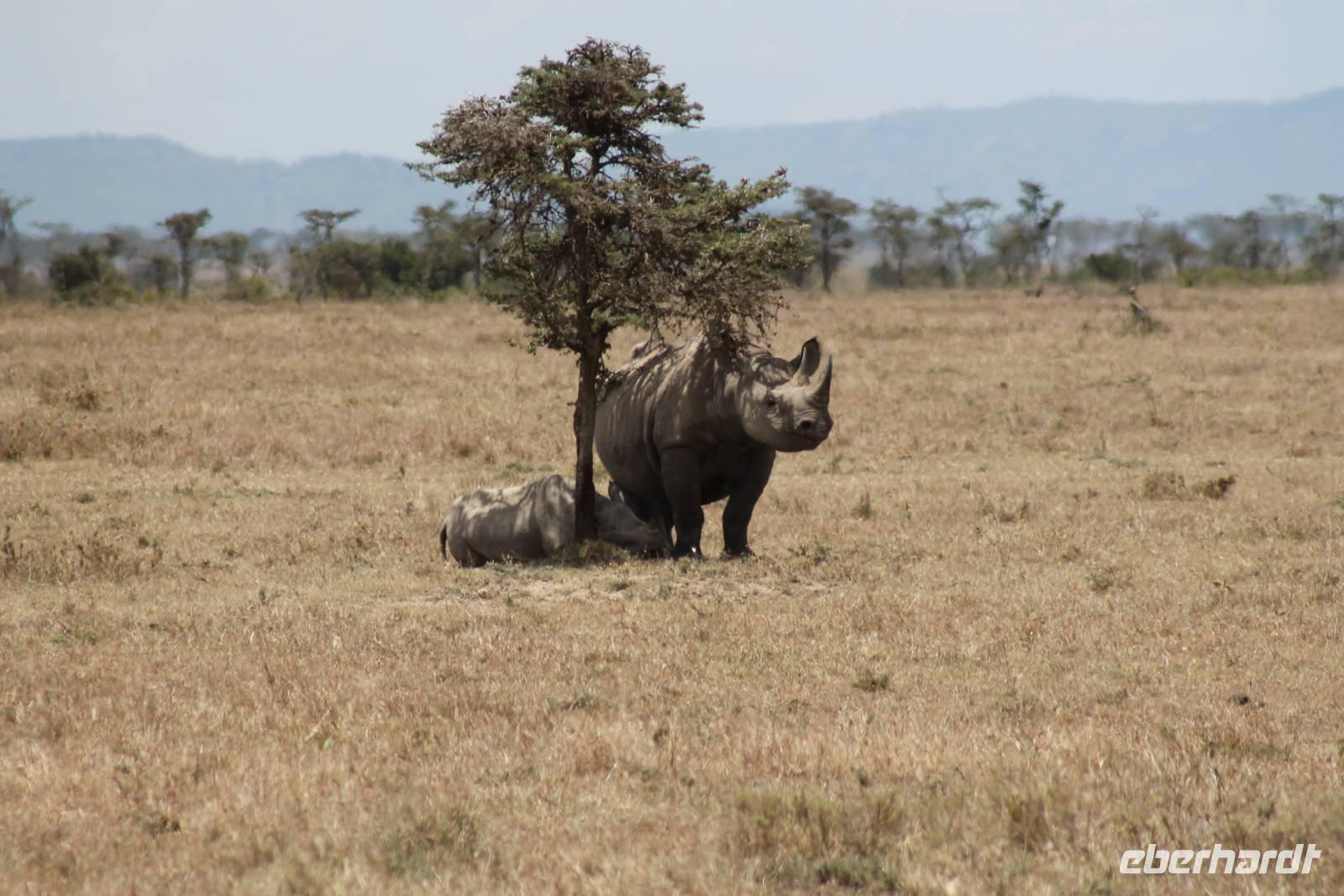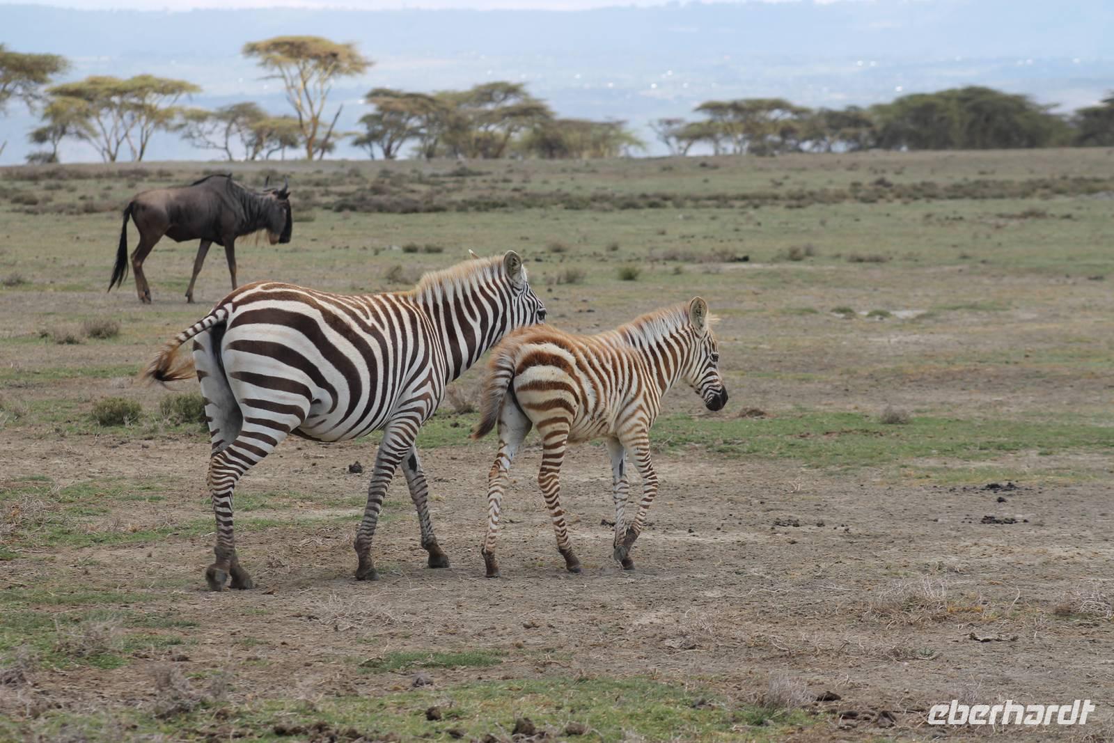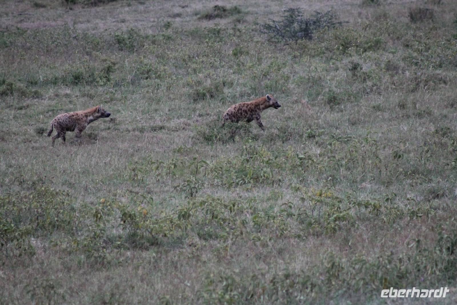 Heute ist in Deutschland Feiertag und so hat der Jeep von Jackson heute schulfrei. An allen anderen Tagen müssen immer schwierige Aufgaben gelöst werden, die am Ende bei einer Prüfung abgefragt werden. So sind wir froh, dass wir heute unsere Safari ohne Aufgaben in Ruhe genießen können. Heute müssen wir schon früh aufstehen, denn wir unternehmen eine Safari noch vor dem Frühstück. Der Lake Nakuru ist weltweit berühmt wegen seinem Vogelreichtum und besonders für die riesigen Flamingoschwärme mit bis zu 1,5 Millionen Tieren. Uns fällt auch heute im guten Licht besonders auf, dass der Nationalpark nicht nur eine unheimliche Tierdichte aufweist, sondern auch landschaftlich sehr abwechslungsreich ist mit Savannen, Wäldern, Felsen und Sumpf - und Seegebieten. Bevor wir aber heute morgen zeitig zum See fahren, sehen wir noch zwei schöne Hyänen sowie viele Büffel, Wasserböcke und Zebras, die sich teilweise auch am Seeufer tummeln. Am See angekommen sehen wir unheimlich viele Flamingos aber auch andere Vögel wie den Nimmersatt, den Kibiz und den Löffler, denen der See ebenfalls ein Zuhause bietet. Wir können uns gar nicht satt sehen an der unglaublichen Vogelschar. Im Hintergrund des Sees sehen wir auch einige Giraffen. Anschließend setzen wir unsere Pirsch fort und sehen noch einen Steppenadler, einige Schwalben, Graureiher und drei schöne Nashörner. Außerdem ein schönes Exemplar der Gabelrake und des Widehopfes.