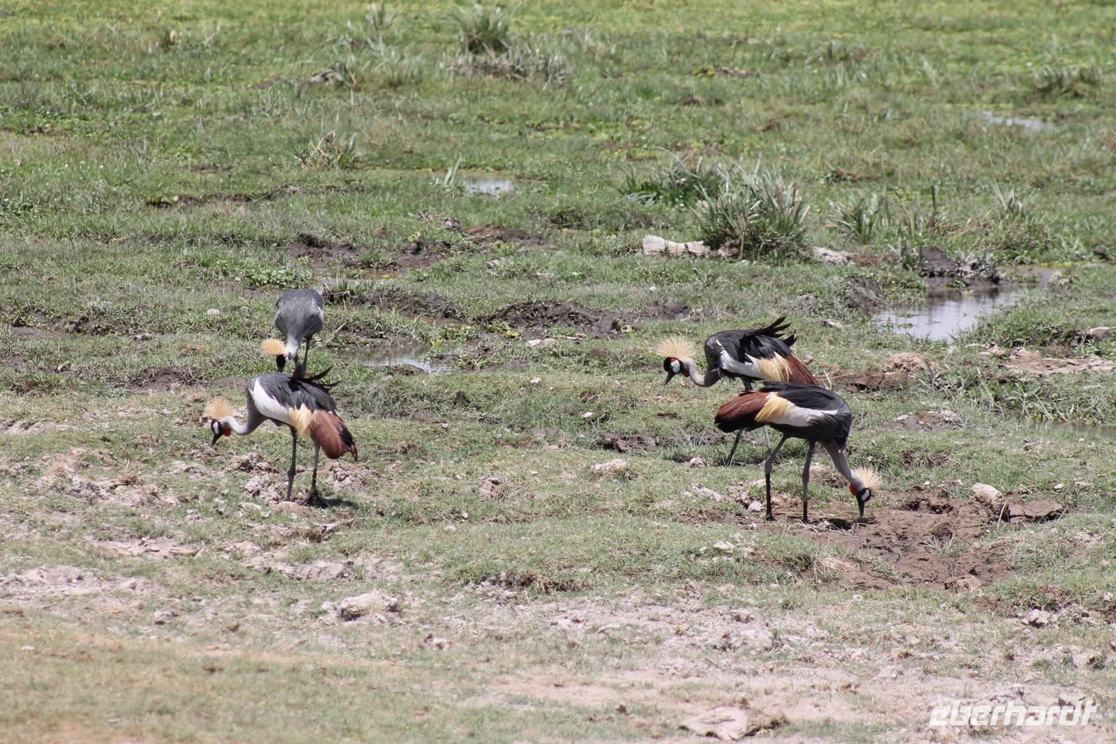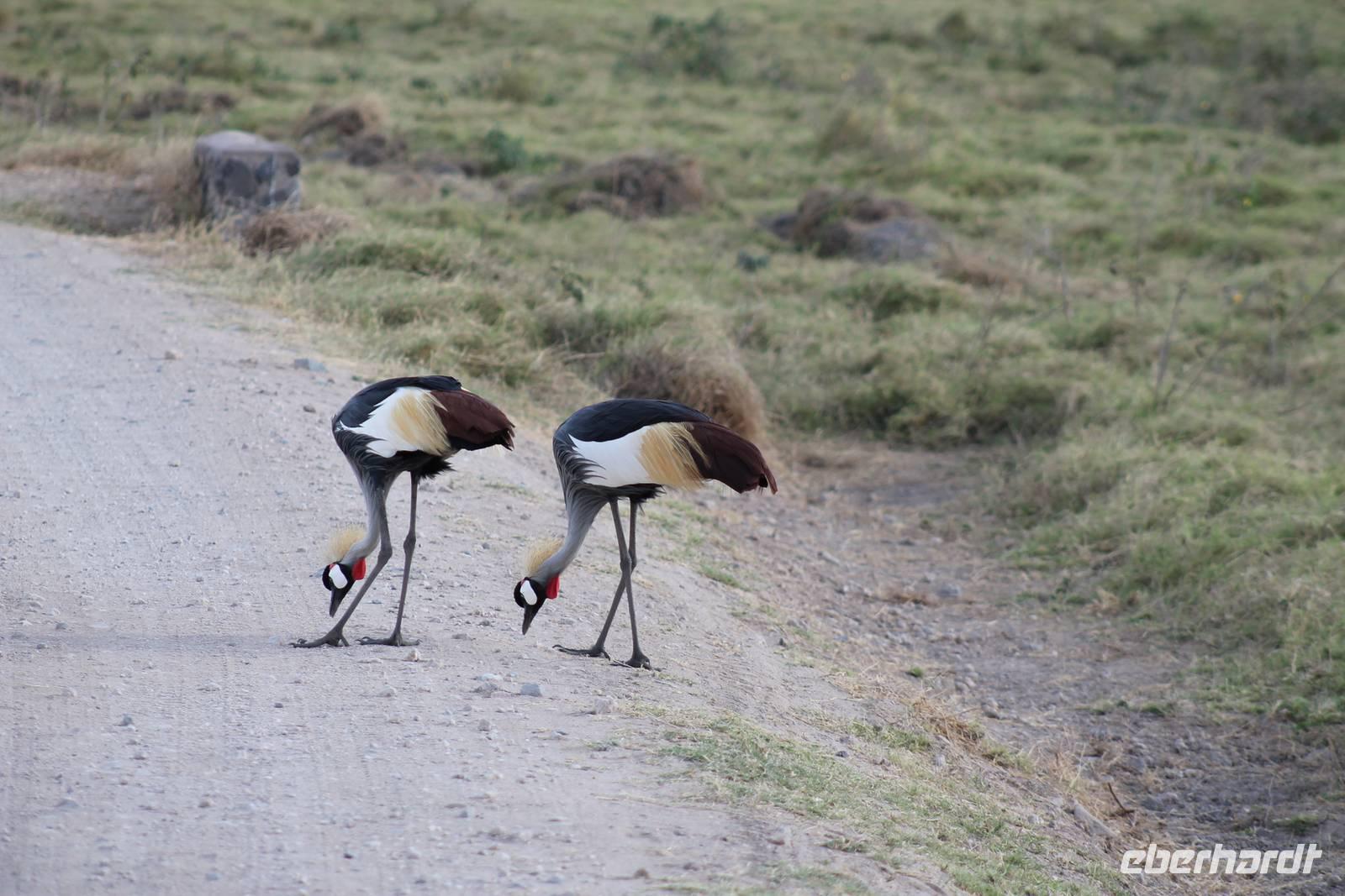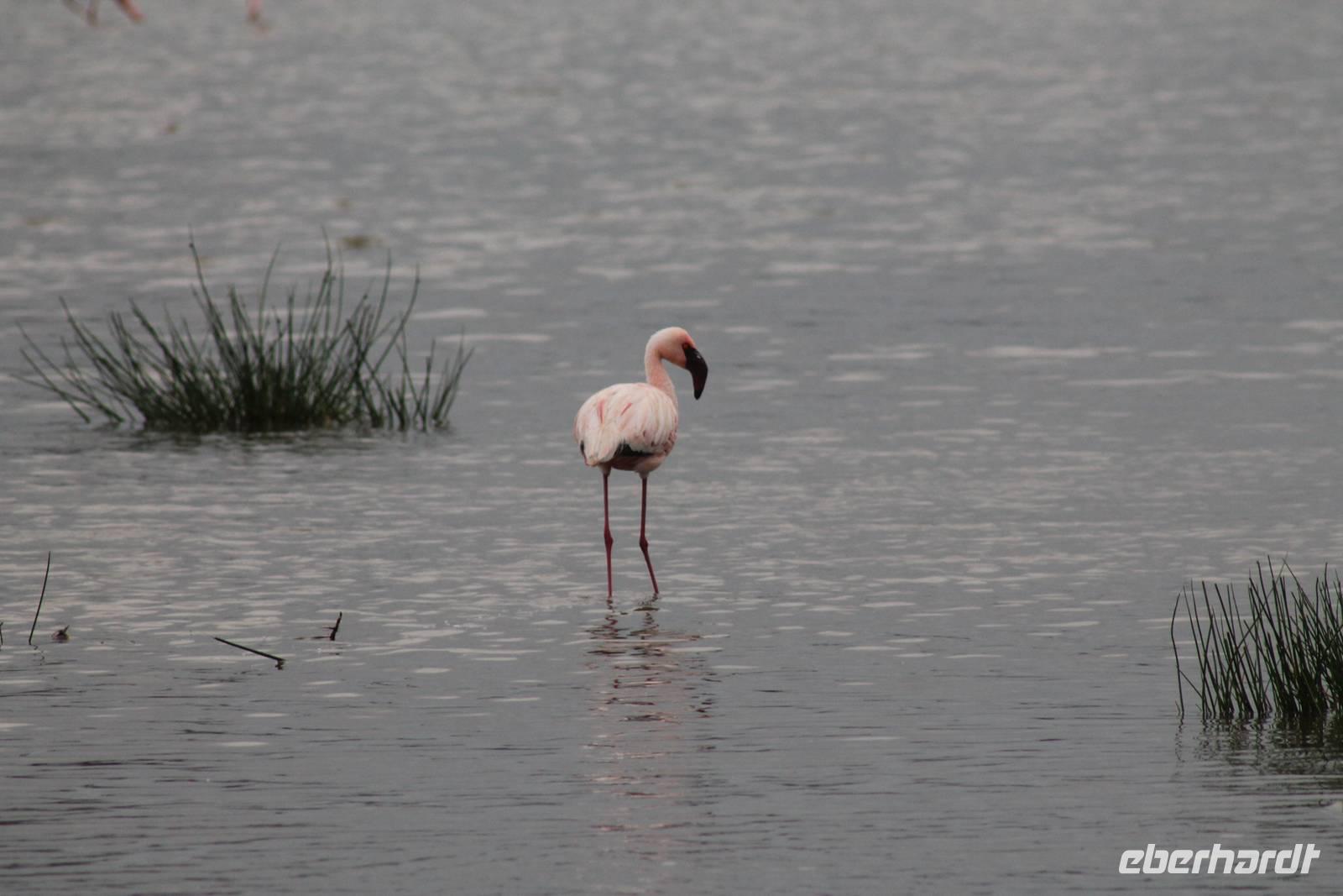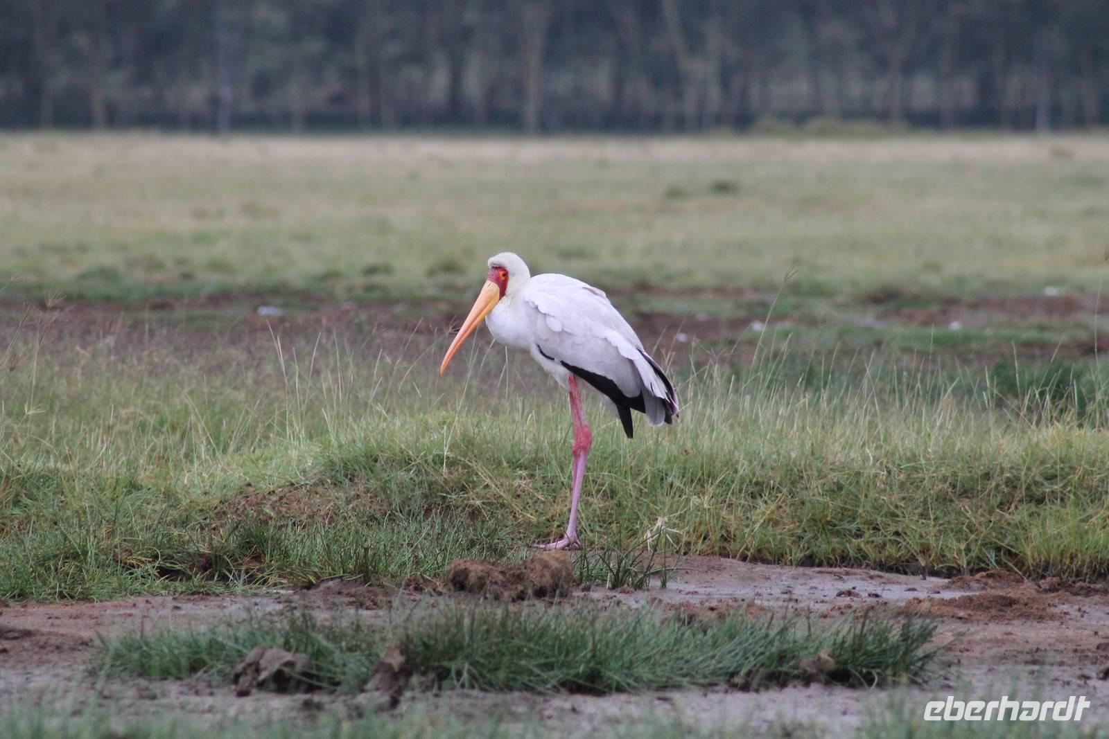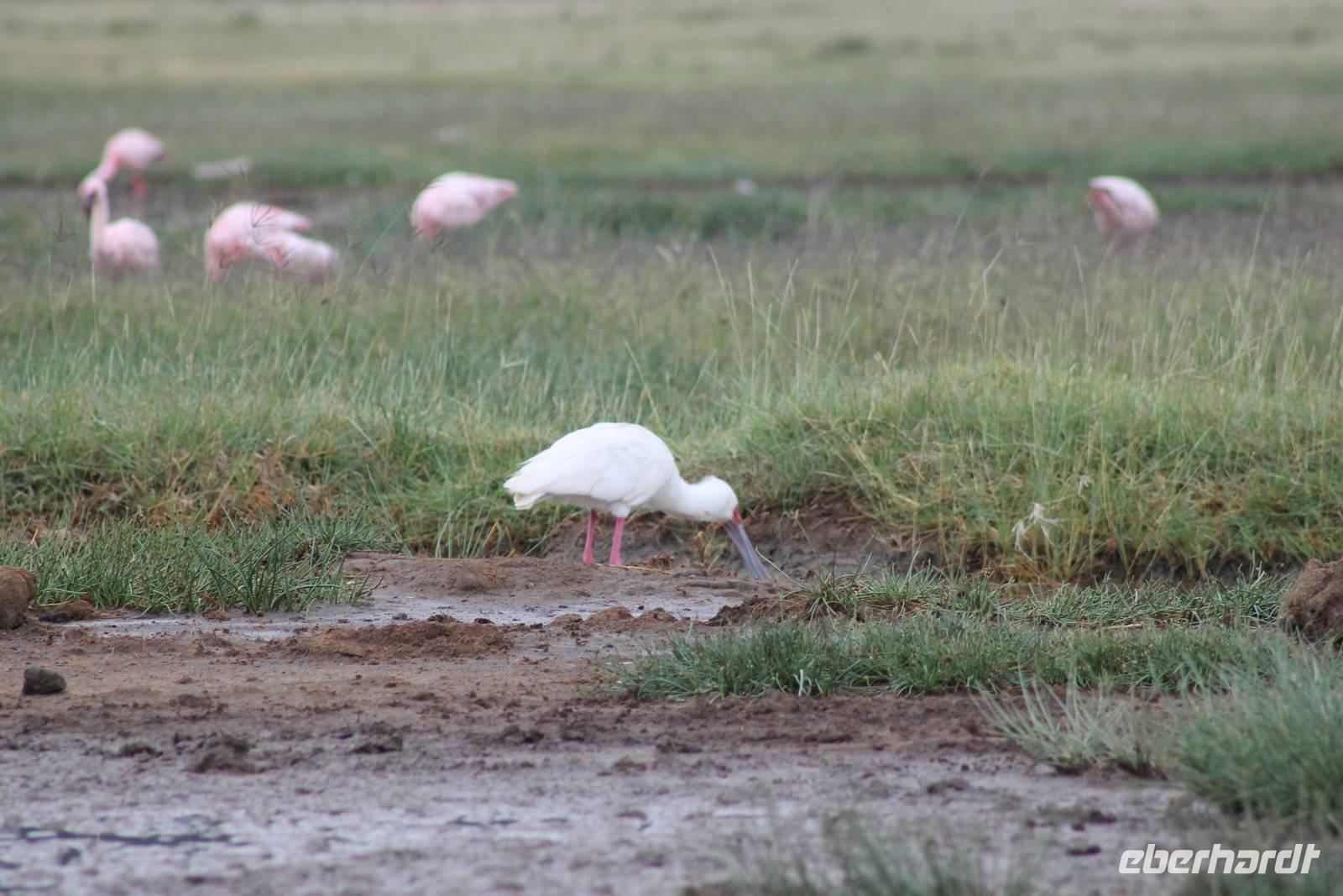 Heute ist in Deutschland Feiertag und so hat der Jeep von Jackson heute schulfrei. An allen anderen Tagen müssen immer schwierige Aufgaben gelöst werden, die am Ende bei einer Prüfung abgefragt werden. So sind wir froh, dass wir heute unsere Safari ohne Aufgaben in Ruhe genießen können. Heute müssen wir schon früh aufstehen, denn wir unternehmen eine Safari noch vor dem Frühstück. Der Lake Nakuru ist weltweit berühmt wegen seinem Vogelreichtum und besonders für die riesigen Flamingoschwärme mit bis zu 1,5 Millionen Tieren. Uns fällt auch heute im guten Licht besonders auf, dass der Nationalpark nicht nur eine unheimliche Tierdichte aufweist, sondern auch landschaftlich sehr abwechslungsreich ist mit Savannen, Wäldern, Felsen und Sumpf - und Seegebieten. Bevor wir aber heute morgen zeitig zum See fahren, sehen wir noch zwei schöne Hyänen sowie viele Büffel, Wasserböcke und Zebras, die sich teilweise auch am Seeufer tummeln. Am See angekommen sehen wir unheimlich viele Flamingos aber auch andere Vögel wie den Nimmersatt, den Kibiz und den Löffler, denen der See ebenfalls ein Zuhause bietet. Wir können uns gar nicht satt sehen an der unglaublichen Vogelschar. Im Hintergrund des Sees sehen wir auch einige Giraffen. Anschließend setzen wir unsere Pirsch fort und sehen noch einen Steppenadler, einige Schwalben, Graureiher und drei schöne Nashörner. Außerdem ein schönes Exemplar der Gabelrake und des Widehopfes.
