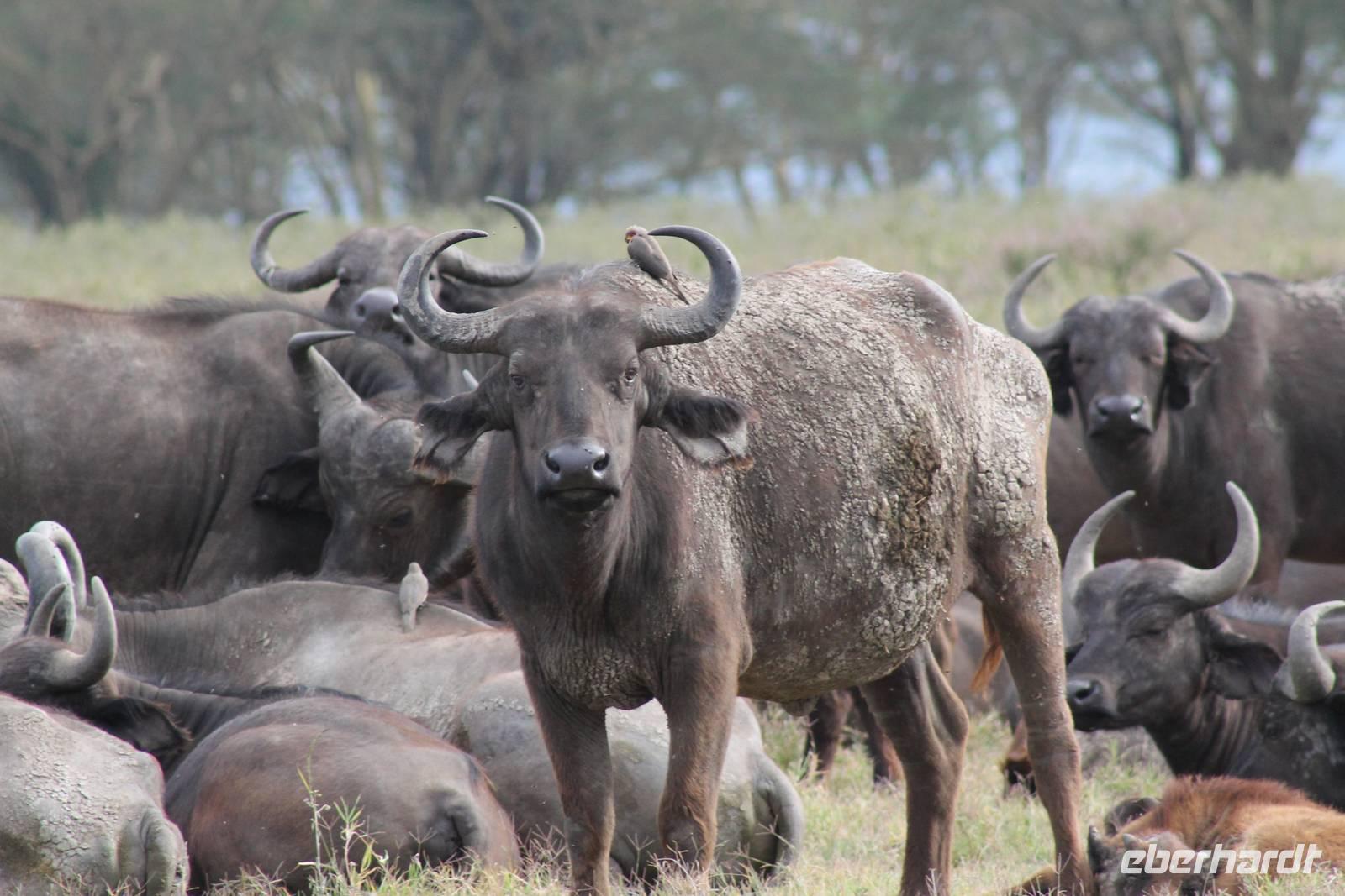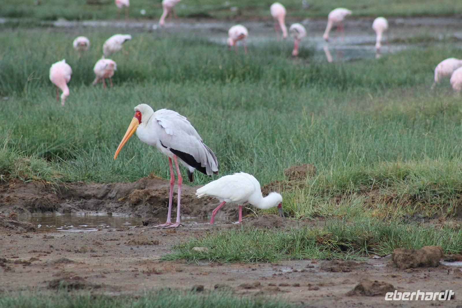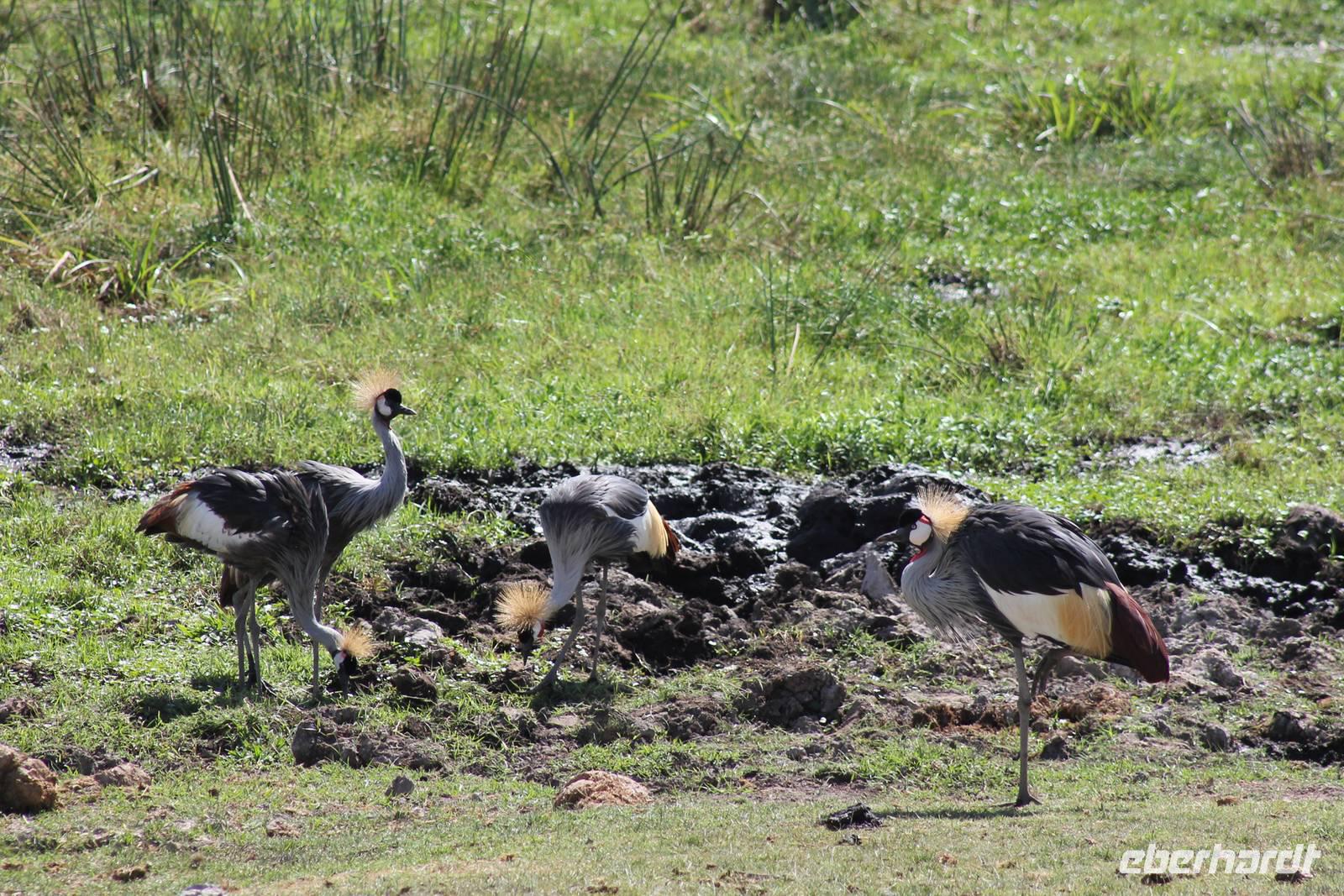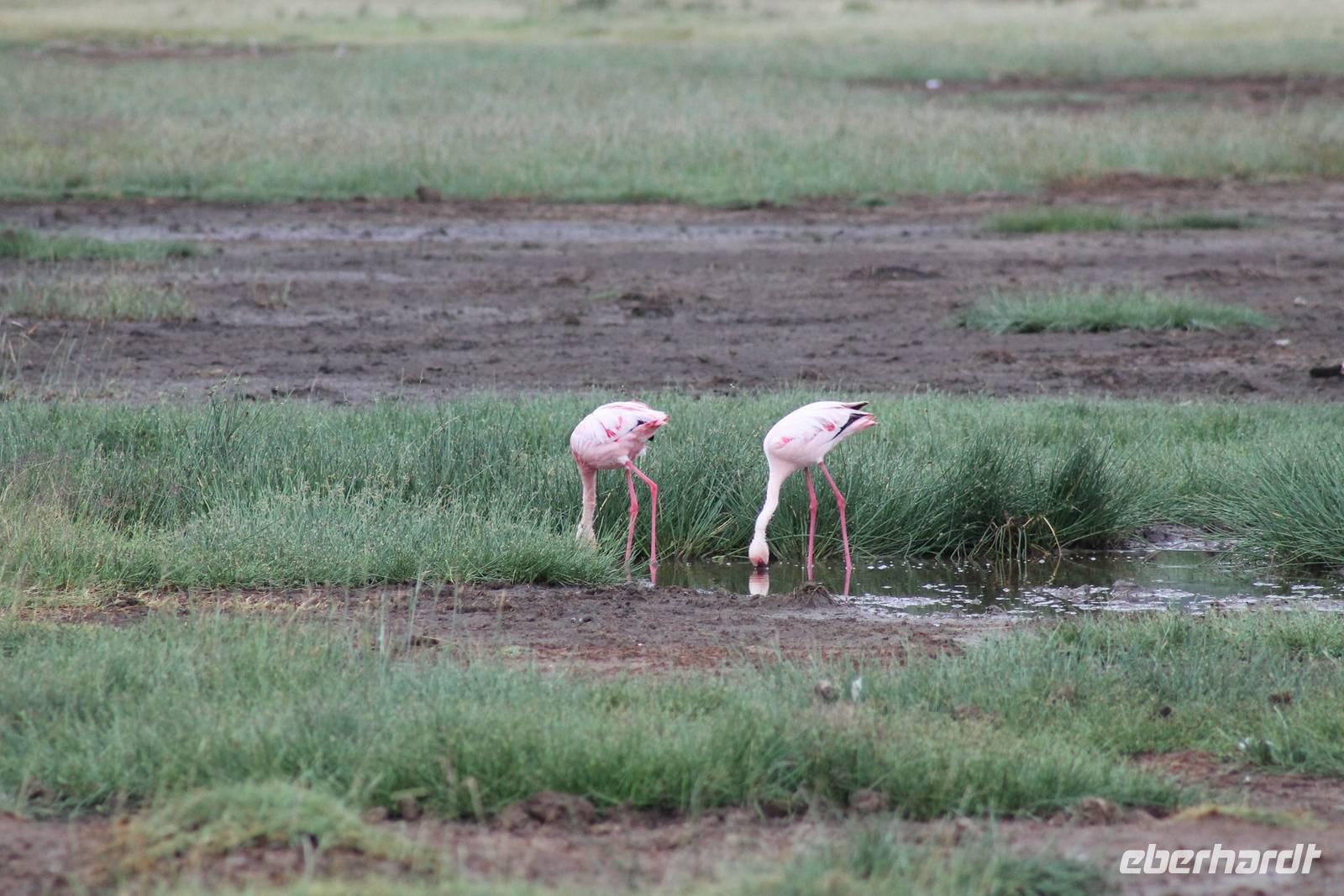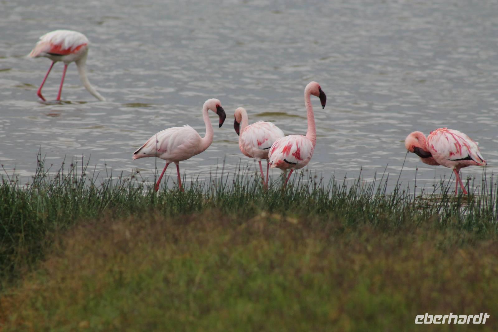 Heute ist in Deutschland Feiertag und so hat der Jeep von Jackson heute schulfrei. An allen anderen Tagen müssen immer schwierige Aufgaben gelöst werden, die am Ende bei einer Prüfung abgefragt werden. So sind wir froh, dass wir heute unsere Safari ohne Aufgaben in Ruhe genießen können. Heute müssen wir schon früh aufstehen, denn wir unternehmen eine Safari noch vor dem Frühstück. Der Lake Nakuru ist weltweit berühmt wegen seinem Vogelreichtum und besonders für die riesigen Flamingoschwärme mit bis zu 1,5 Millionen Tieren. Uns fällt auch heute im guten Licht besonders auf, dass der Nationalpark nicht nur eine unheimliche Tierdichte aufweist, sondern auch landschaftlich sehr abwechslungsreich ist mit Savannen, Wäldern, Felsen und Sumpf - und Seegebieten. Bevor wir aber heute morgen zeitig zum See fahren, sehen wir noch zwei schöne Hyänen sowie viele Büffel, Wasserböcke und Zebras, die sich teilweise auch am Seeufer tummeln. Am See angekommen sehen wir unheimlich viele Flamingos aber auch andere Vögel wie den Nimmersatt, den Kibiz und den Löffler, denen der See ebenfalls ein Zuhause bietet. Wir können uns gar nicht satt sehen an der unglaublichen Vogelschar. Im Hintergrund des Sees sehen wir auch einige Giraffen. Anschließend setzen wir unsere Pirsch fort und sehen noch einen Steppenadler, einige Schwalben, Graureiher und drei schöne Nashörner. Außerdem ein schönes Exemplar der Gabelrake und des Widehopfes.