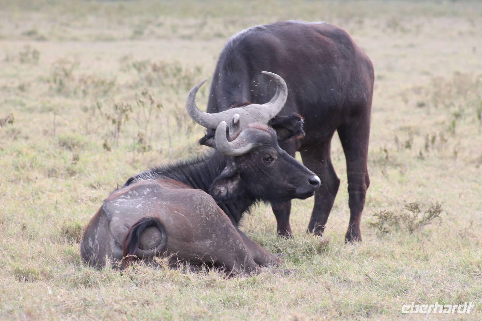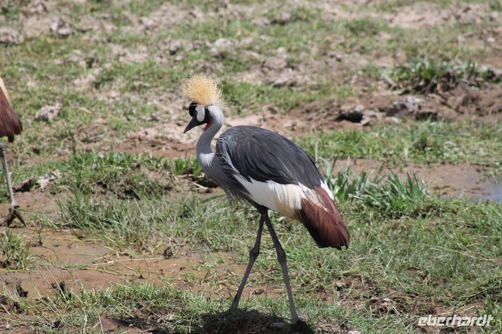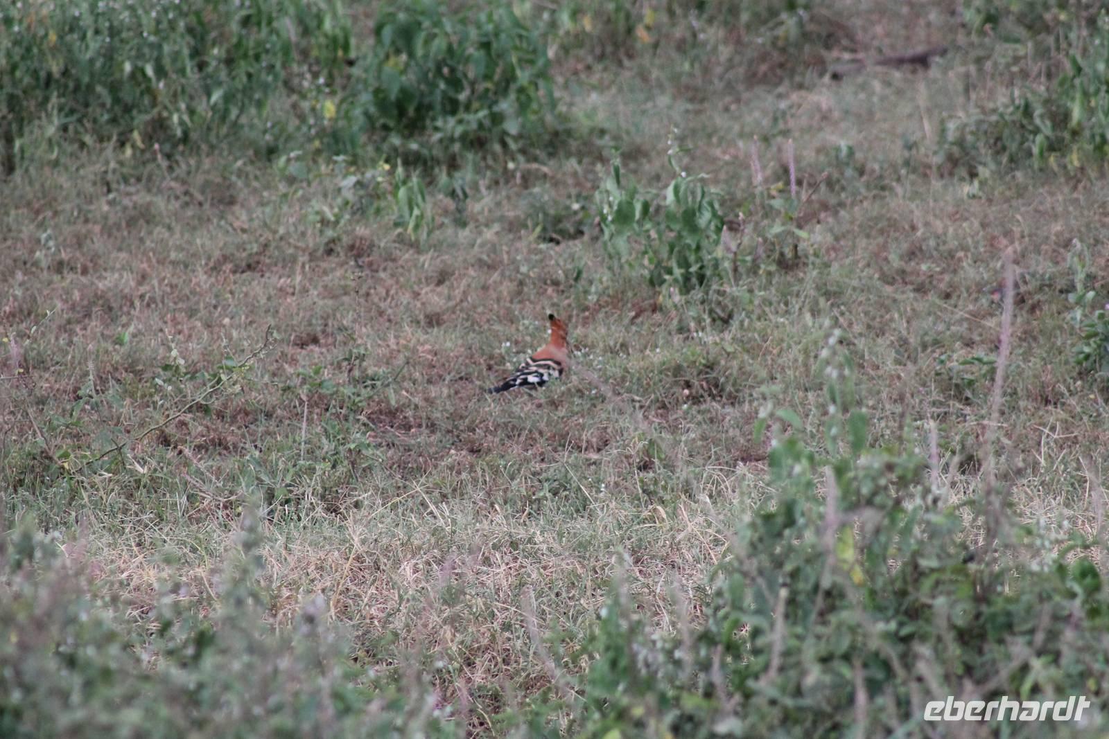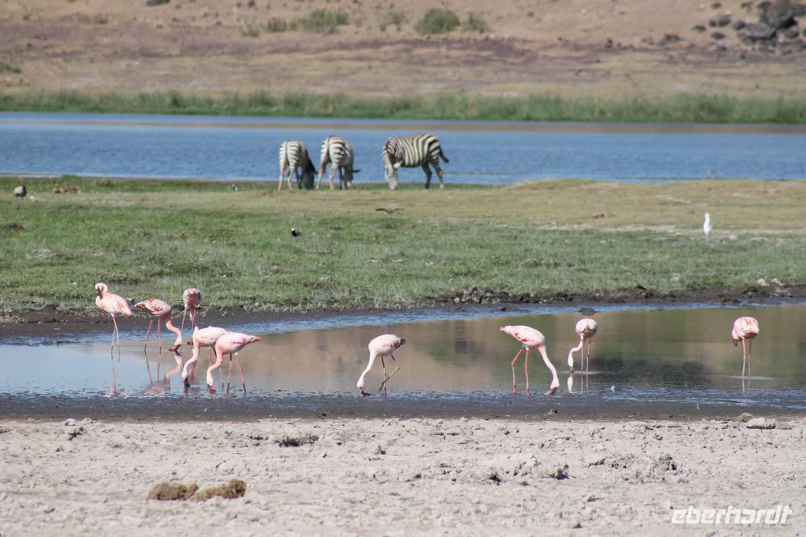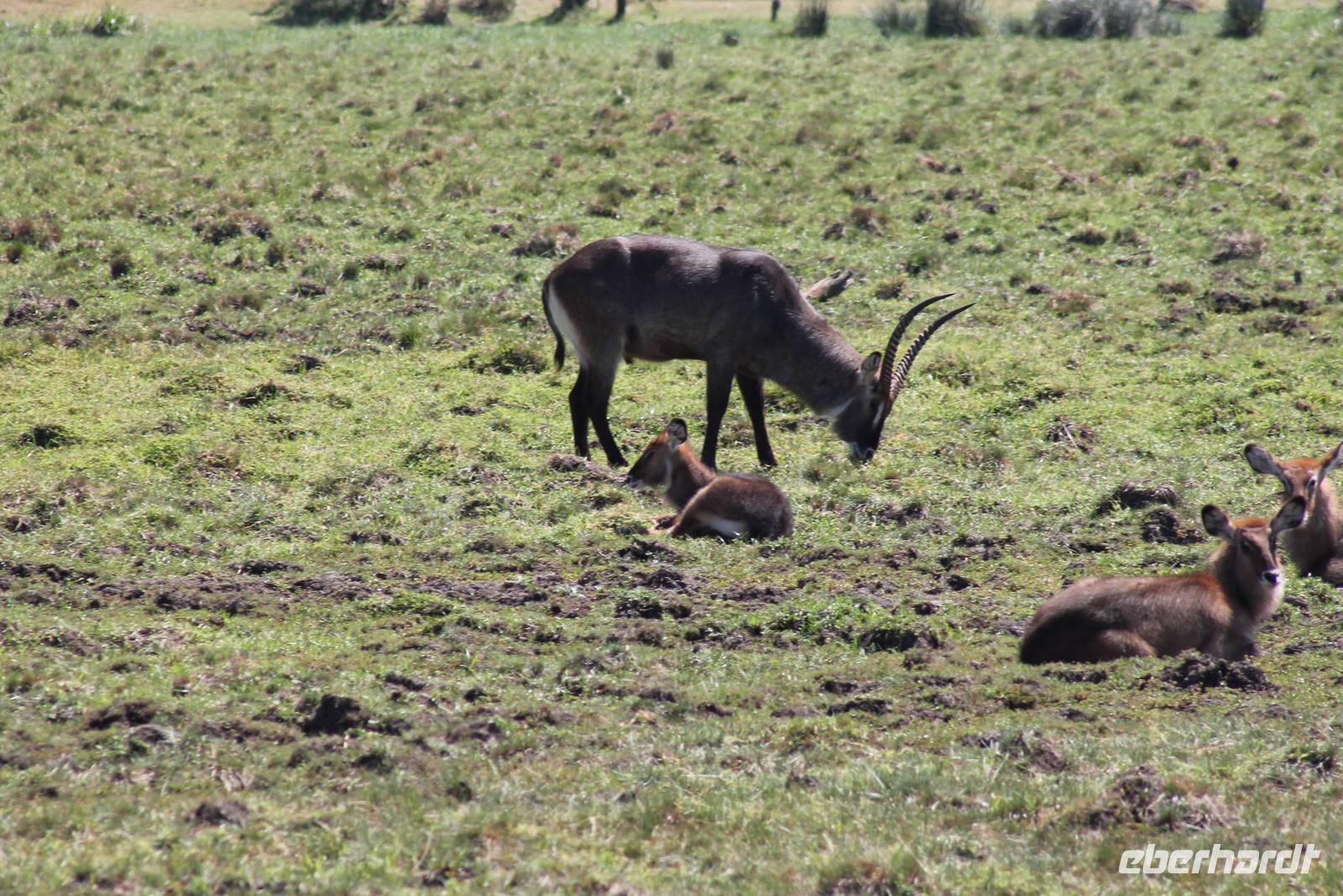 Heute ist in Deutschland Feiertag und so hat der Jeep von Jackson heute schulfrei. An allen anderen Tagen müssen immer schwierige Aufgaben gelöst werden, die am Ende bei einer Prüfung abgefragt werden. So sind wir froh, dass wir heute unsere Safari ohne Aufgaben in Ruhe genießen können. Heute müssen wir schon früh aufstehen, denn wir unternehmen eine Safari noch vor dem Frühstück. Der Lake Nakuru ist weltweit berühmt wegen seinem Vogelreichtum und besonders für die riesigen Flamingoschwärme mit bis zu 1,5 Millionen Tieren. Uns fällt auch heute im guten Licht besonders auf, dass der Nationalpark nicht nur eine unheimliche Tierdichte aufweist, sondern auch landschaftlich sehr abwechslungsreich ist mit Savannen, Wäldern, Felsen und Sumpf - und Seegebieten. Bevor wir aber heute morgen zeitig zum See fahren, sehen wir noch zwei schöne Hyänen sowie viele Büffel, Wasserböcke und Zebras, die sich teilweise auch am Seeufer tummeln. Am See angekommen sehen wir unheimlich viele Flamingos aber auch andere Vögel wie den Nimmersatt, den Kibiz und den Löffler, denen der See ebenfalls ein Zuhause bietet. Wir können uns gar nicht satt sehen an der unglaublichen Vogelschar. Im Hintergrund des Sees sehen wir auch einige Giraffen. Anschließend setzen wir unsere Pirsch fort und sehen noch einen Steppenadler, einige Schwalben, Graureiher und drei schöne Nashörner. Außerdem ein schönes Exemplar der Gabelrake und des Widehopfes.