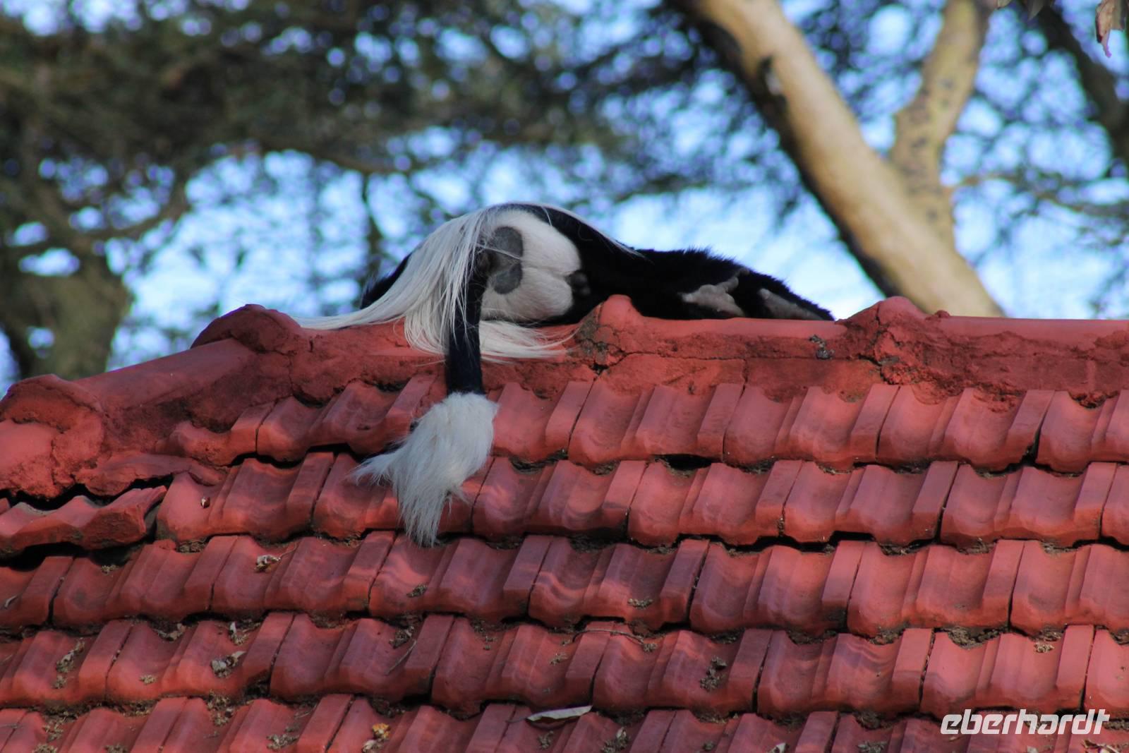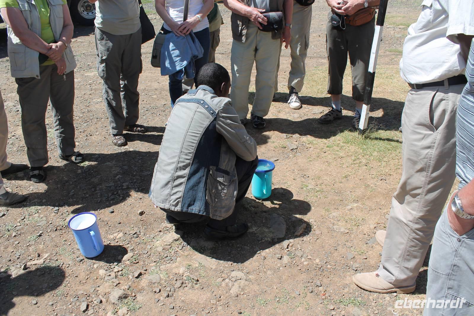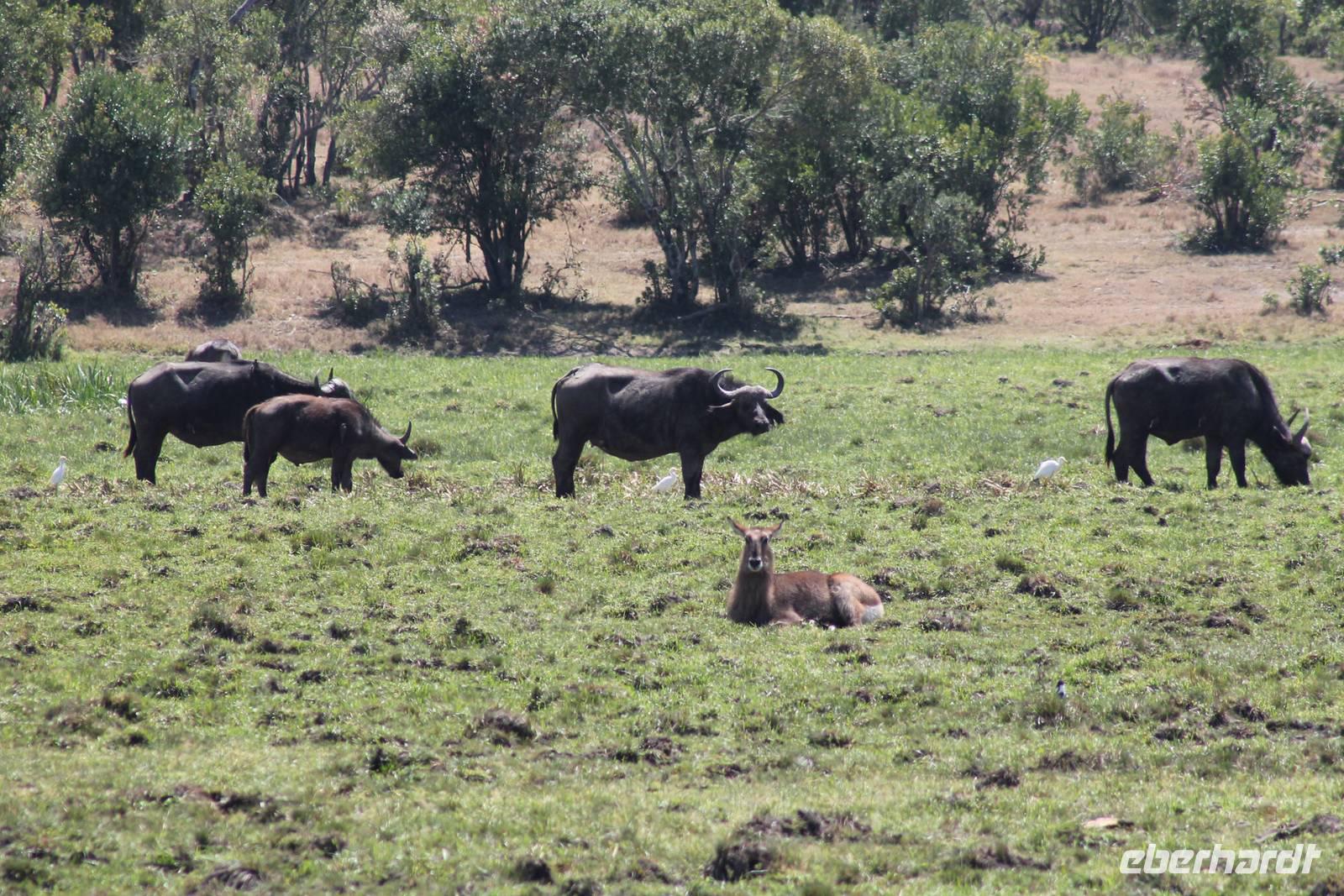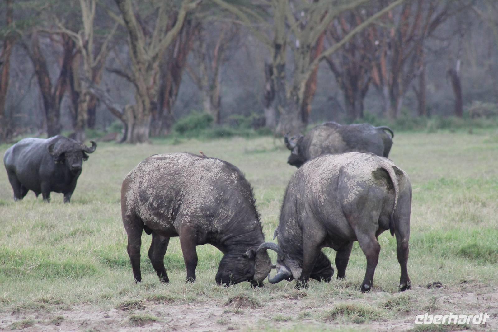 So fahren wir heute weiter in Richtung Nakuru See. Unterwegs erreichen wir nahe der Stadt Nyahururu, die Äquatorgrenze und lassen es uns natürlich nicht nehmen, uns hier zu fotografieren. Außerdem nehmen wir uns diesen Ort als Anlass, um uns am Äquator zu taufen. So erhält ein jeder einen Amarula zum Anstoßen, so wie es sich in Afrika gehört und ein Zertifikat, dass Original hier ausgestellt wurde um zu beweisen, dass wir auch hier waren. Anschließend fahren wir weiter zum Thomson Wasserfall und unternehmen einen kleinen Rundgang. Der Wasserfall stürzt majestätisch 80 Meter in die Tiefe und bietet ein schönes Fotomotiv. Einige Gäste lassen sich noch mit einem Chamäleon fotografieren. Anschließend erreichen wir kurze Zeit später unsere schöne Lake Nakuru Lodge, direkt im Lake Nakuru Nationalpark gelegen. Hier angekommen beziehen wir unsere schönen Bungalows, von denen wir einen direkten Blick auf den Nationalpark genießen können. Nach einem leckeren Mittagessen vom Buffet mit Blick auf allerlei Wasserbüffel und Impalas setzen wir uns ein wenig zur Ruhe und genießen die afrikanische Stille auf unserer Bungalow-Terasse und lassen die vielen Eindrücke Revue passieren. Auf dem Gelände sehen wir auch einige Klippschläfer und Vögel wie den Robin oder den Mausvogel und auch einen seltenene Granatapfelbaum. Am Nachmittag unternehmen wir unsere erste Pirschfahrt durch den Nationalpark. Gleich am Anfang unserer Pirsch sehen wir viele Wasserbüffel in großen Herden sowie einige Bussarde und Paviane. Außerdem wunderschöne Kibize und Hagedachs sowie wunderbare Kronenkraniche. Dann sehen wir erst eine Zeit lang nichts, bis sich direkt neben uns im Graben ein Leopard in seiner ganzen Schönheit zeigt. Später bemerken wir, dass sich vor uns ein regelrechtes Schauspiel abspielt. Neben dem Leopard, der langsam im Wald verschwindet, sehen wir noch einen Schabrakenschakal und eine Hyäne. Der Schakal macht sich lautstark bemerkbar, um die anderen umliegenden Tiere, besonders die Impalas, vor dem Leopard zu warnen. Ein großes Glück für uns dieses Schauspiel mit ansehen zu können und am Abend können wir es kaum glauben, dass wir das live gesehen haben.