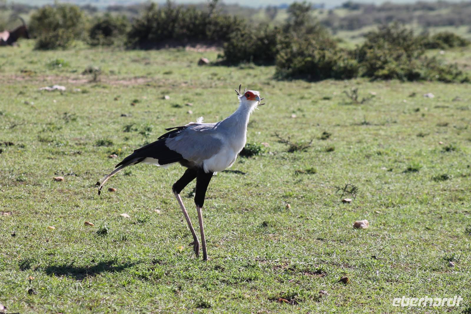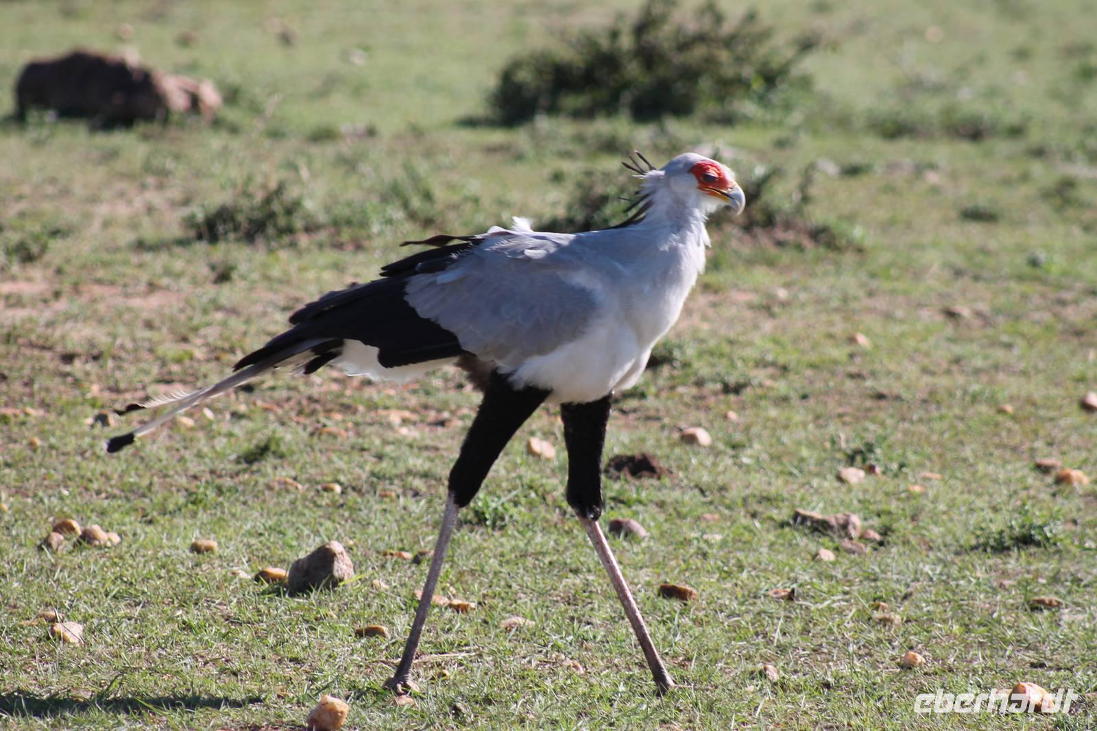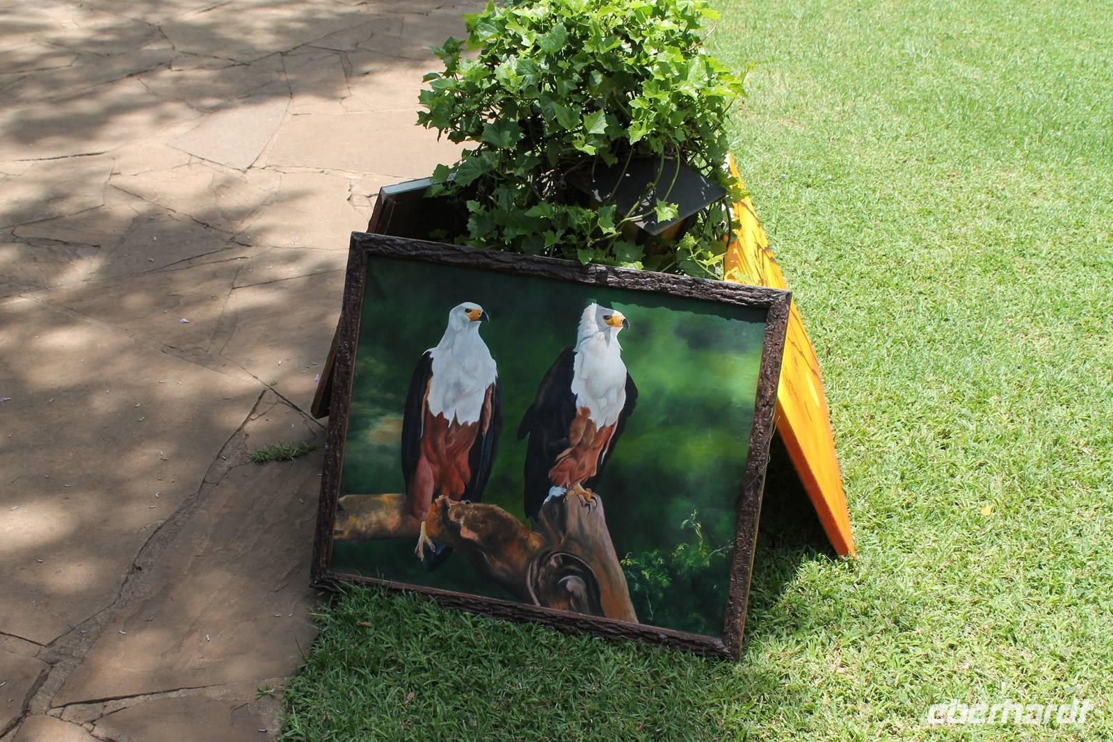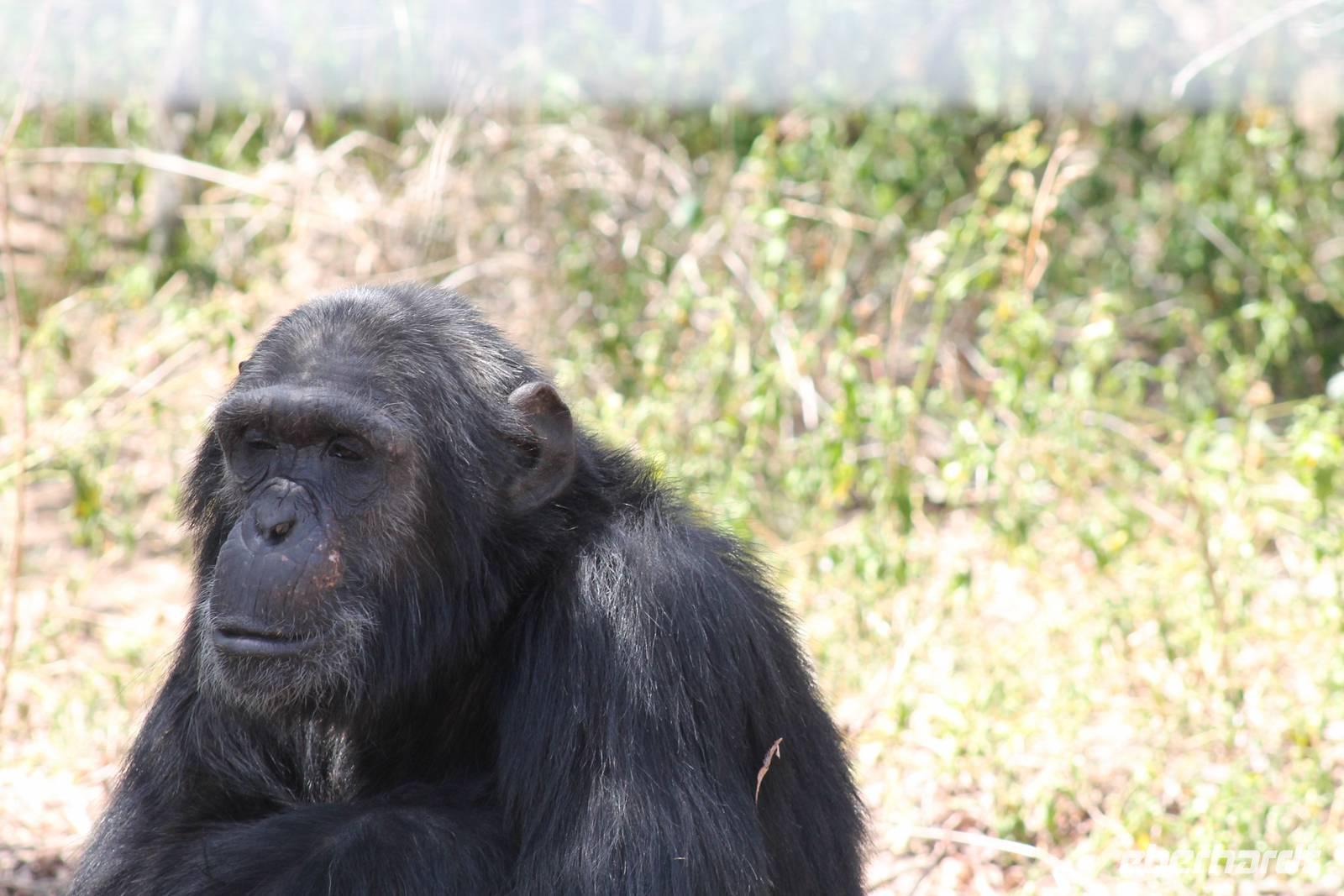 Doch bevor wir dieses heute besuchen, sehen wir schon vorher eine ganze Vielzahl an anderen Tieren wie unzählige Impalas, Wasserböcke, Perlhühner, Glanzstare, Sekretäre, Paviane und Wasserbüffel. Wir hätten nie damit gerechnet, dass wir schon heute so viele verschiedene Arten von Tieren sehen und sind begeistert. Auch das Licht der Sonne lässt uns wunderbare Aufnahmen machen. Nach einer ersten Safari Pirsch durch das Reservat, kommen wir am Schimpansen-Gebiet an. Mittlerweile haben wir schon Temperaturen um die 30 Grad und so erfahren wir, dass sich die Tiere natürlich gern im Schatten und in Büschen aufhalten. Trotzdem sehen wir am Ende noch ein paar schöne Exemplare und erfahren, wie die Schimpansen hier gehalten werden und warum Sie hierher gekommen sind. In jedem Fall eine lobenswerte und wichtige Maßnahme, die hier vollzogen wurde. Wir bedanken uns für den Rundgang und setzen unsere Pirschfahrt im Reservat fort. Wir sehen noch viele weitere Tiere und Vögel wie einen Weißkopfadler, Warzenschweine mit Madenhackern, weitere Sekretäre, Steppenzebras und als Krönung des Tages wunderbare Rothschildgiraffen, die sich vor uns aufstellen als wären Sie Models. Außerdem sehen wir noch wunderschöne Elan Antilopen und ein Spitzmaulnashorn mit Junge sowie Thomson-Gazellen und Glanz-Gazellen. All diese Eindrücke lassen sich kaum in Worte fassen.