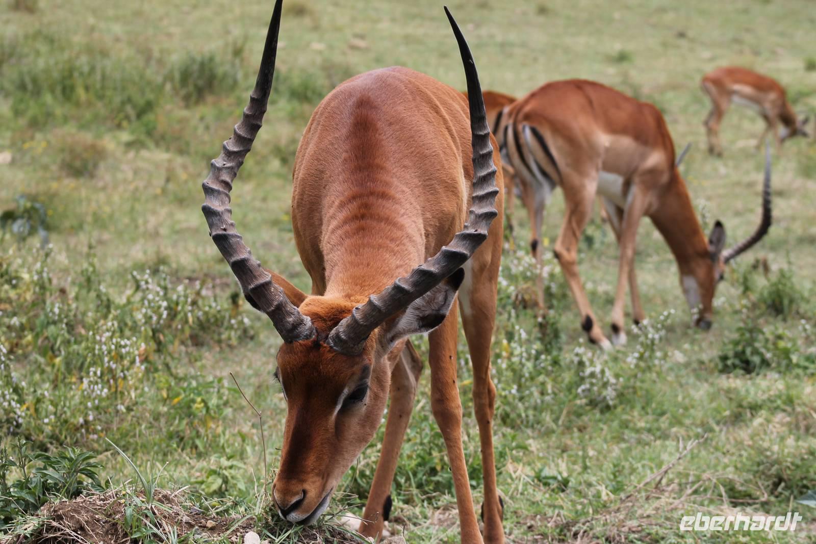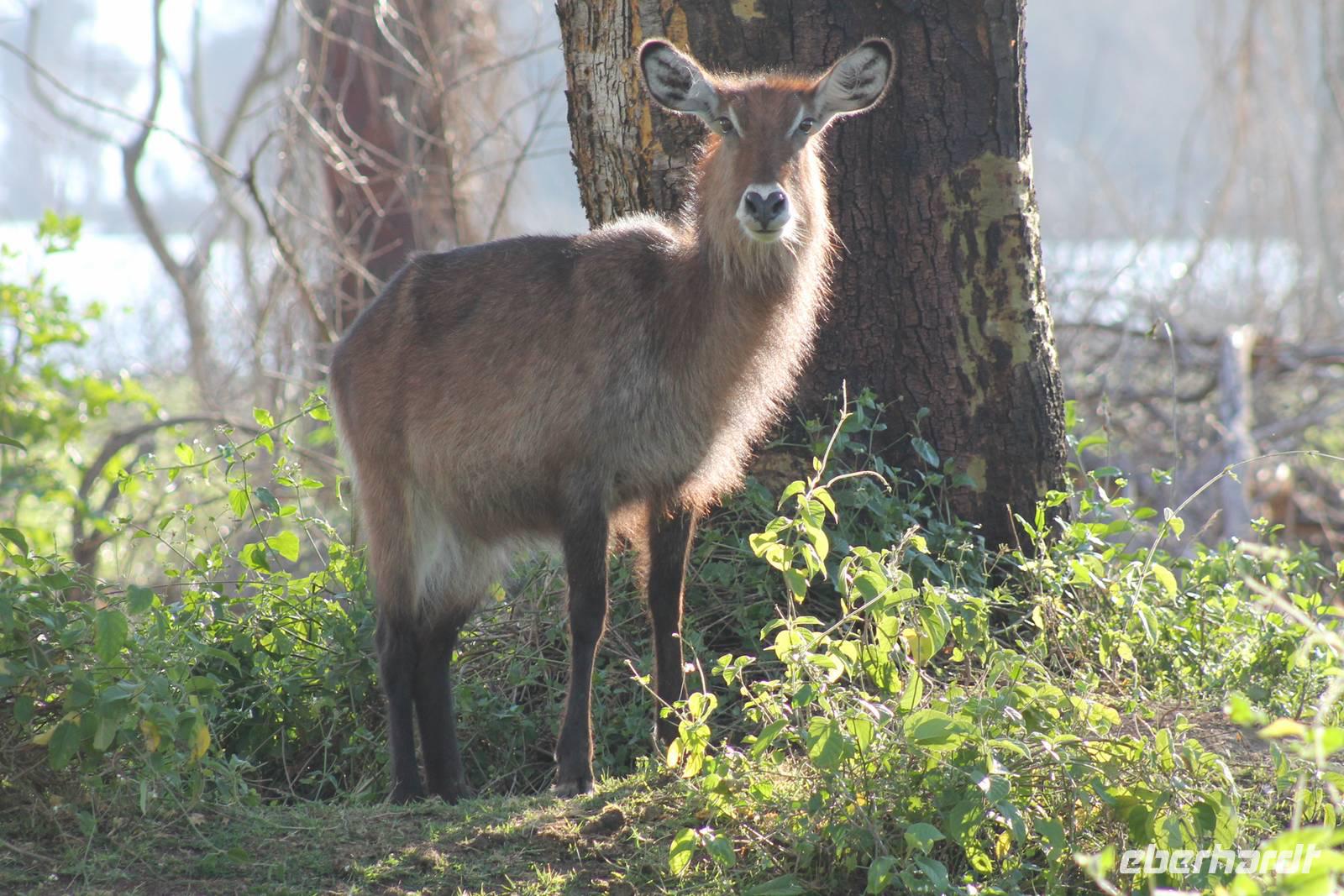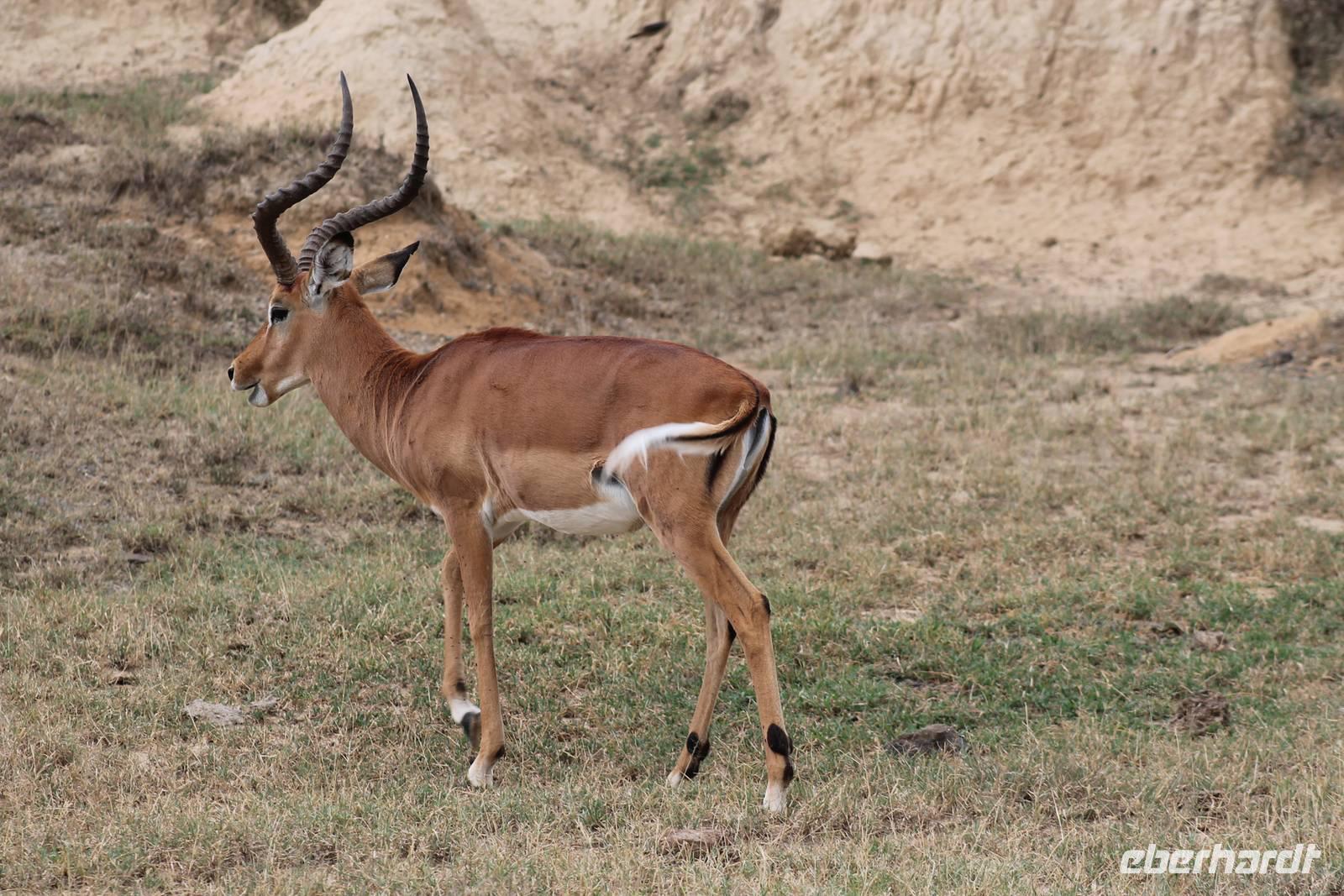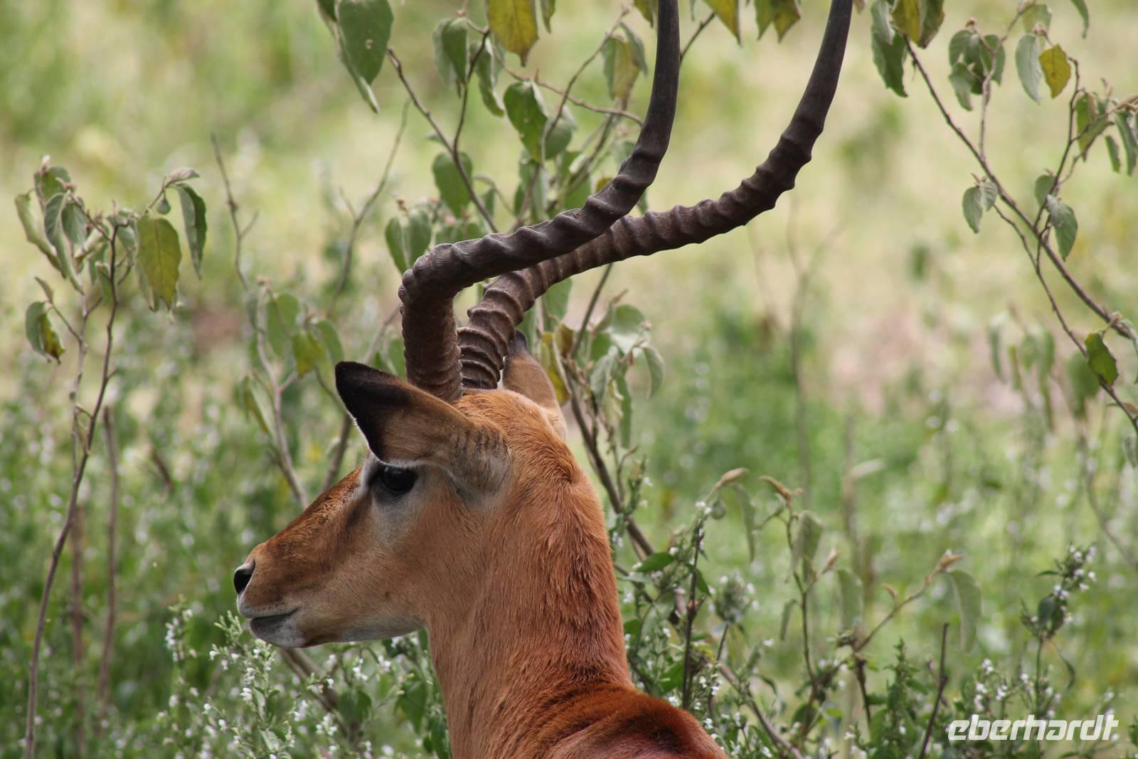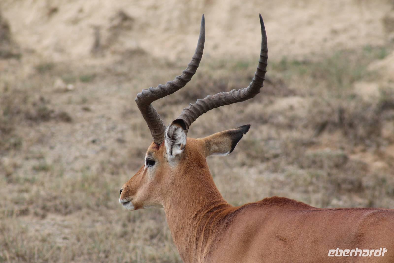 Doch bevor wir dieses heute besuchen, sehen wir schon vorher eine ganze Vielzahl an anderen Tieren wie unzählige Impalas, Wasserböcke, Perlhühner, Glanzstare, Sekretäre, Paviane und Wasserbüffel. Wir hätten nie damit gerechnet, dass wir schon heute so viele verschiedene Arten von Tieren sehen und sind begeistert. Auch das Licht der Sonne lässt uns wunderbare Aufnahmen machen. Nach einer ersten Safari Pirsch durch das Reservat, kommen wir am Schimpansen-Gebiet an. Mittlerweile haben wir schon Temperaturen um die 30 Grad und so erfahren wir, dass sich die Tiere natürlich gern im Schatten und in Büschen aufhalten. Trotzdem sehen wir am Ende noch ein paar schöne Exemplare und erfahren, wie die Schimpansen hier gehalten werden und warum Sie hierher gekommen sind. In jedem Fall eine lobenswerte und wichtige Maßnahme, die hier vollzogen wurde. Wir bedanken uns für den Rundgang und setzen unsere Pirschfahrt im Reservat fort. Wir sehen noch viele weitere Tiere und Vögel wie einen Weißkopfadler, Warzenschweine mit Madenhackern, weitere Sekretäre, Steppenzebras und als Krönung des Tages wunderbare Rothschildgiraffen, die sich vor uns aufstellen als wären Sie Models. Außerdem sehen wir noch wunderschöne Elan Antilopen und ein Spitzmaulnashorn mit Junge sowie Thomson-Gazellen und Glanz-Gazellen. All diese Eindrücke lassen sich kaum in Worte fassen.