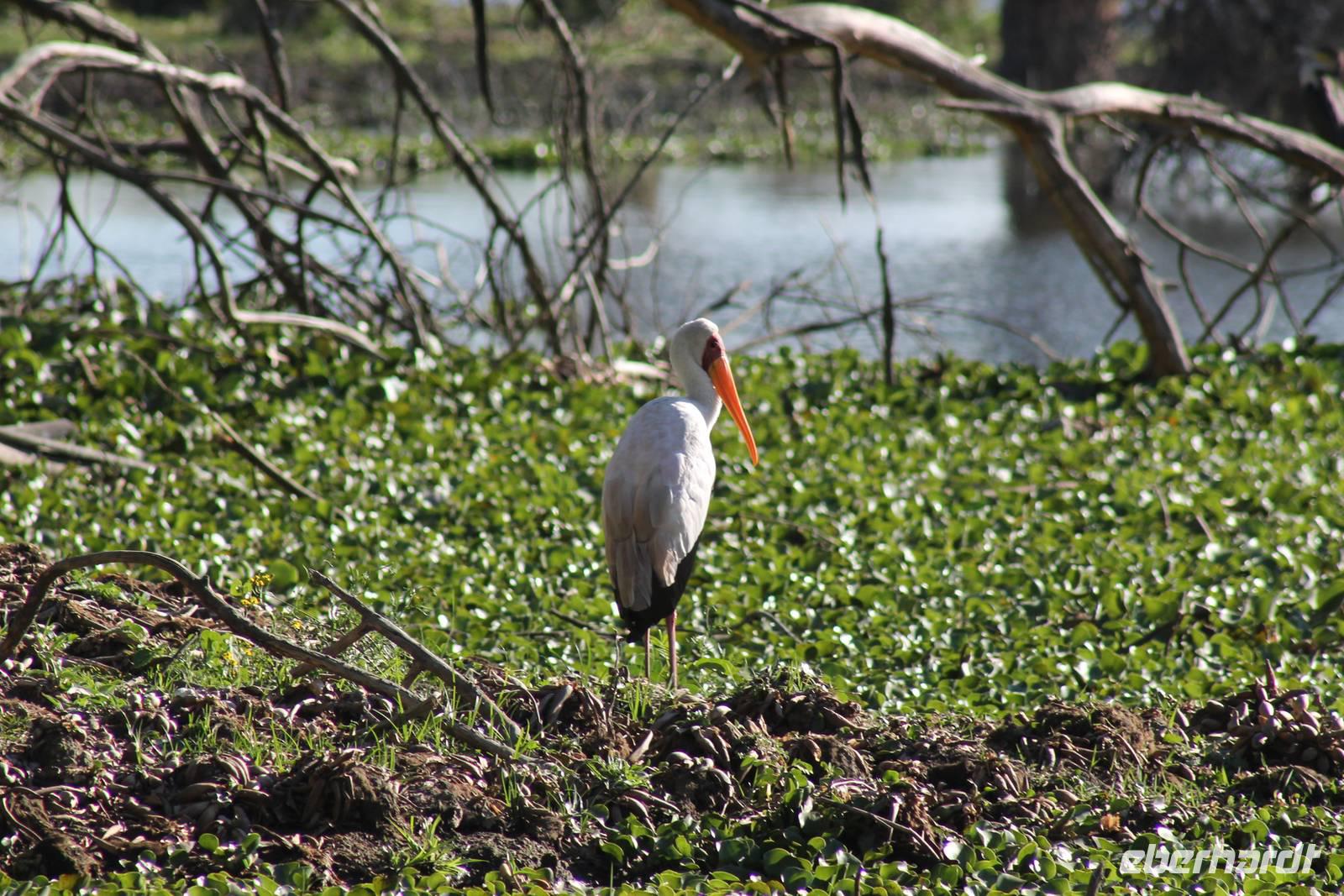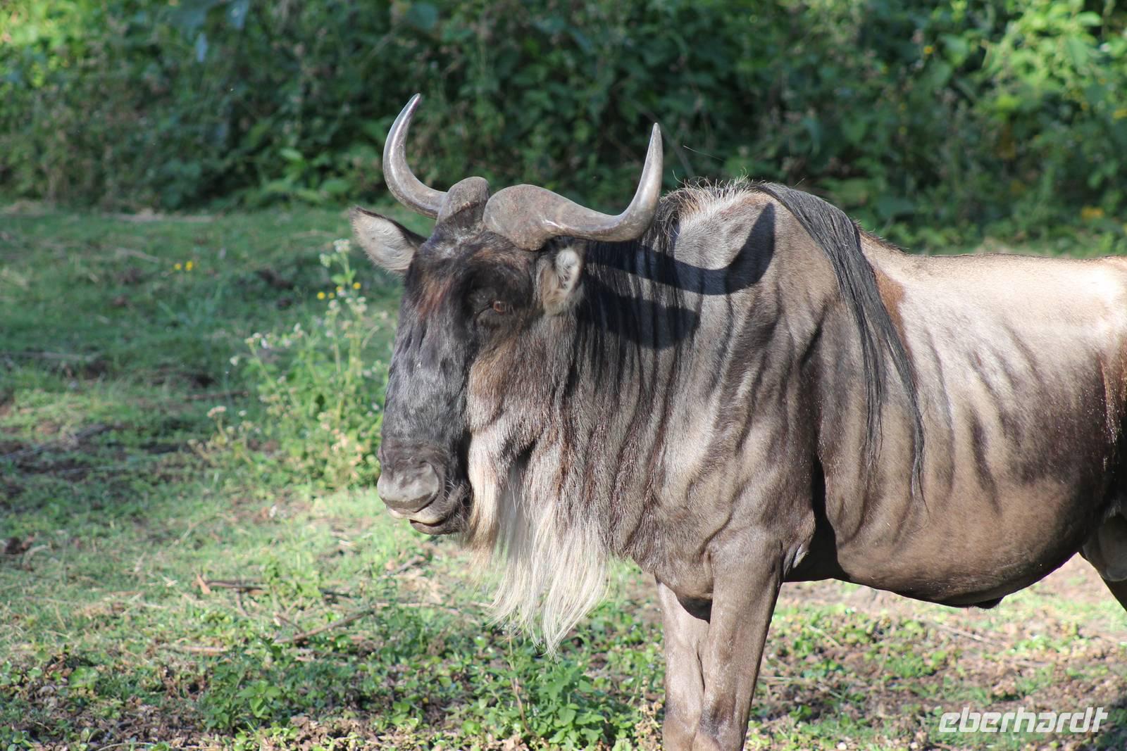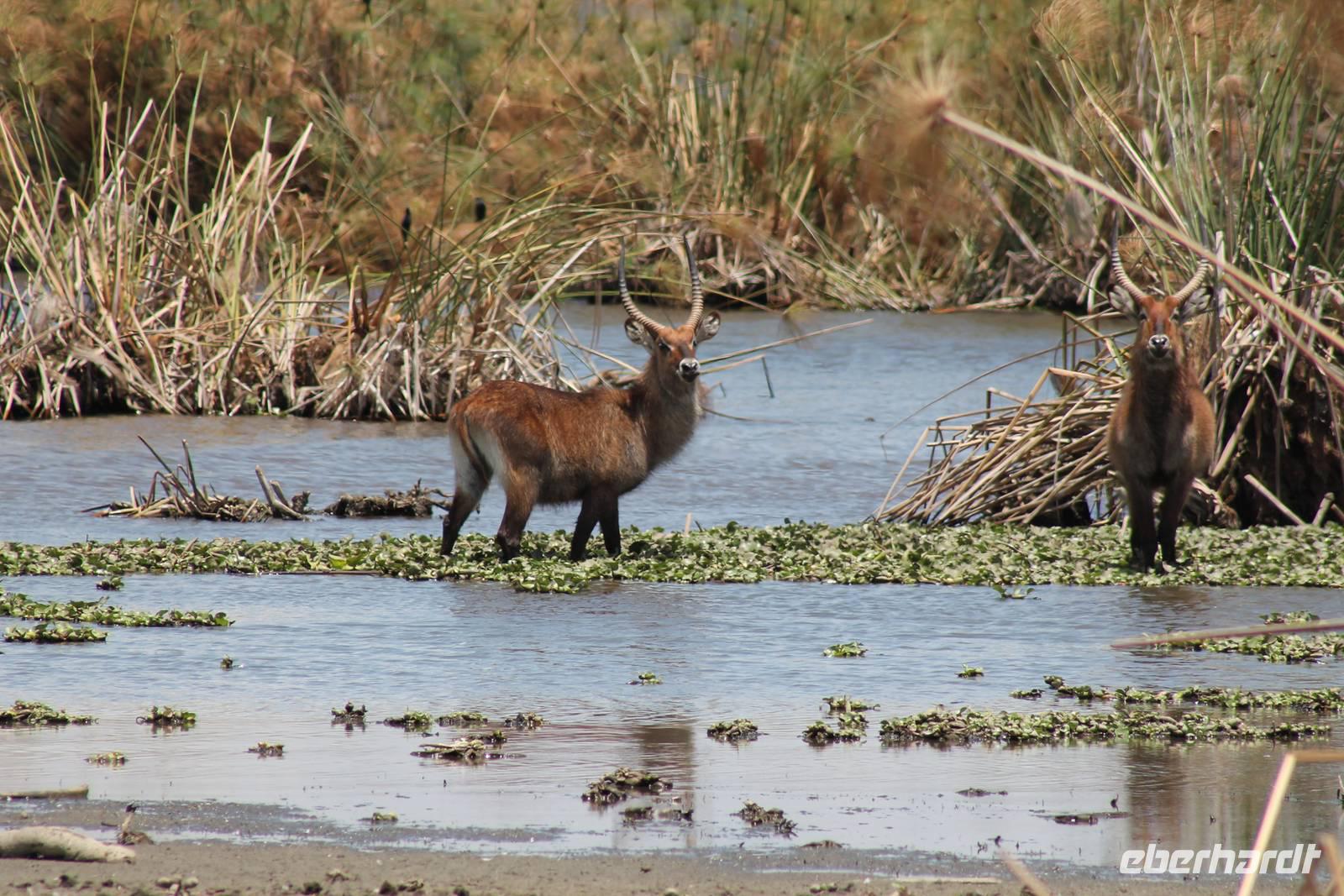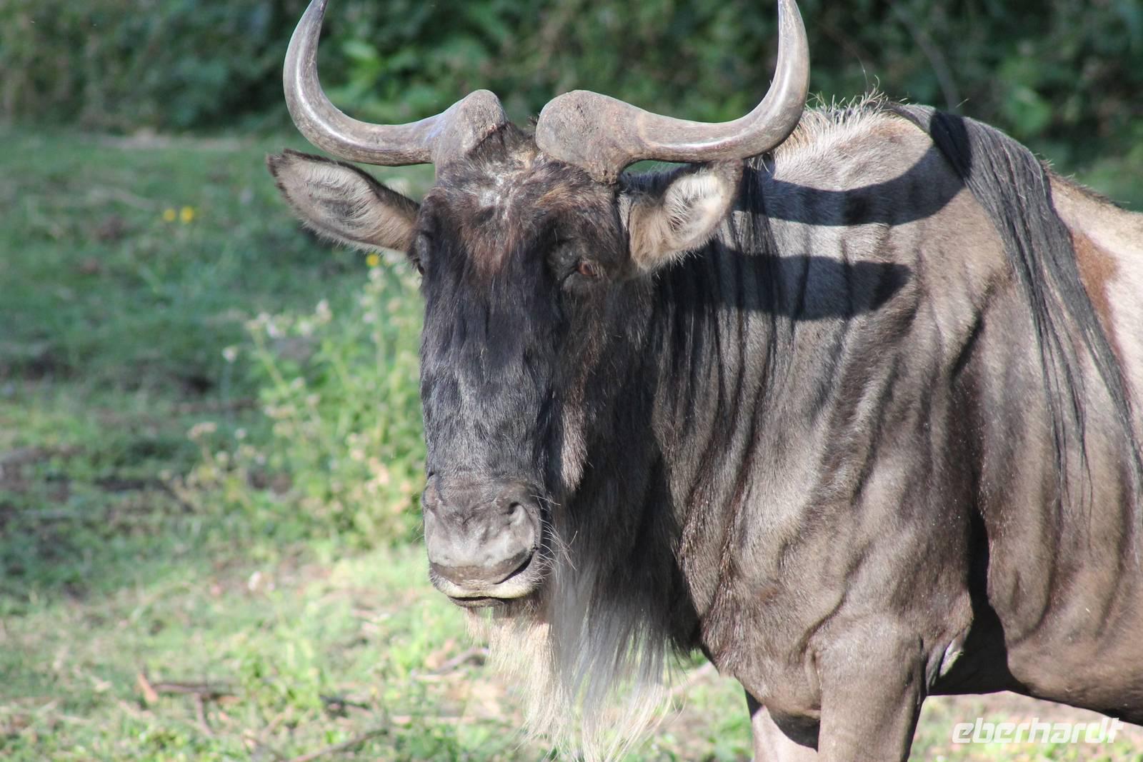 Doch bevor wir dieses heute besuchen, sehen wir schon vorher eine ganze Vielzahl an anderen Tieren wie unzählige Impalas, Wasserböcke, Perlhühner, Glanzstare, Sekretäre, Paviane und Wasserbüffel. Wir hätten nie damit gerechnet, dass wir schon heute so viele verschiedene Arten von Tieren sehen und sind begeistert. Auch das Licht der Sonne lässt uns wunderbare Aufnahmen machen. Nach einer ersten Safari Pirsch durch das Reservat, kommen wir am Schimpansen-Gebiet an. Mittlerweile haben wir schon Temperaturen um die 30 Grad und so erfahren wir, dass sich die Tiere natürlich gern im Schatten und in Büschen aufhalten. Trotzdem sehen wir am Ende noch ein paar schöne Exemplare und erfahren, wie die Schimpansen hier gehalten werden und warum Sie hierher gekommen sind. In jedem Fall eine lobenswerte und wichtige Maßnahme, die hier vollzogen wurde. Wir bedanken uns für den Rundgang und setzen unsere Pirschfahrt im Reservat fort. Wir sehen noch viele weitere Tiere und Vögel wie einen Weißkopfadler, Warzenschweine mit Madenhackern, weitere Sekretäre, Steppenzebras und als Krönung des Tages wunderbare Rothschildgiraffen, die sich vor uns aufstellen als wären Sie Models. Außerdem sehen wir noch wunderschöne Elan Antilopen und ein Spitzmaulnashorn mit Junge sowie Thomson-Gazellen und Glanz-Gazellen. All diese Eindrücke lassen sich kaum in Worte fassen.