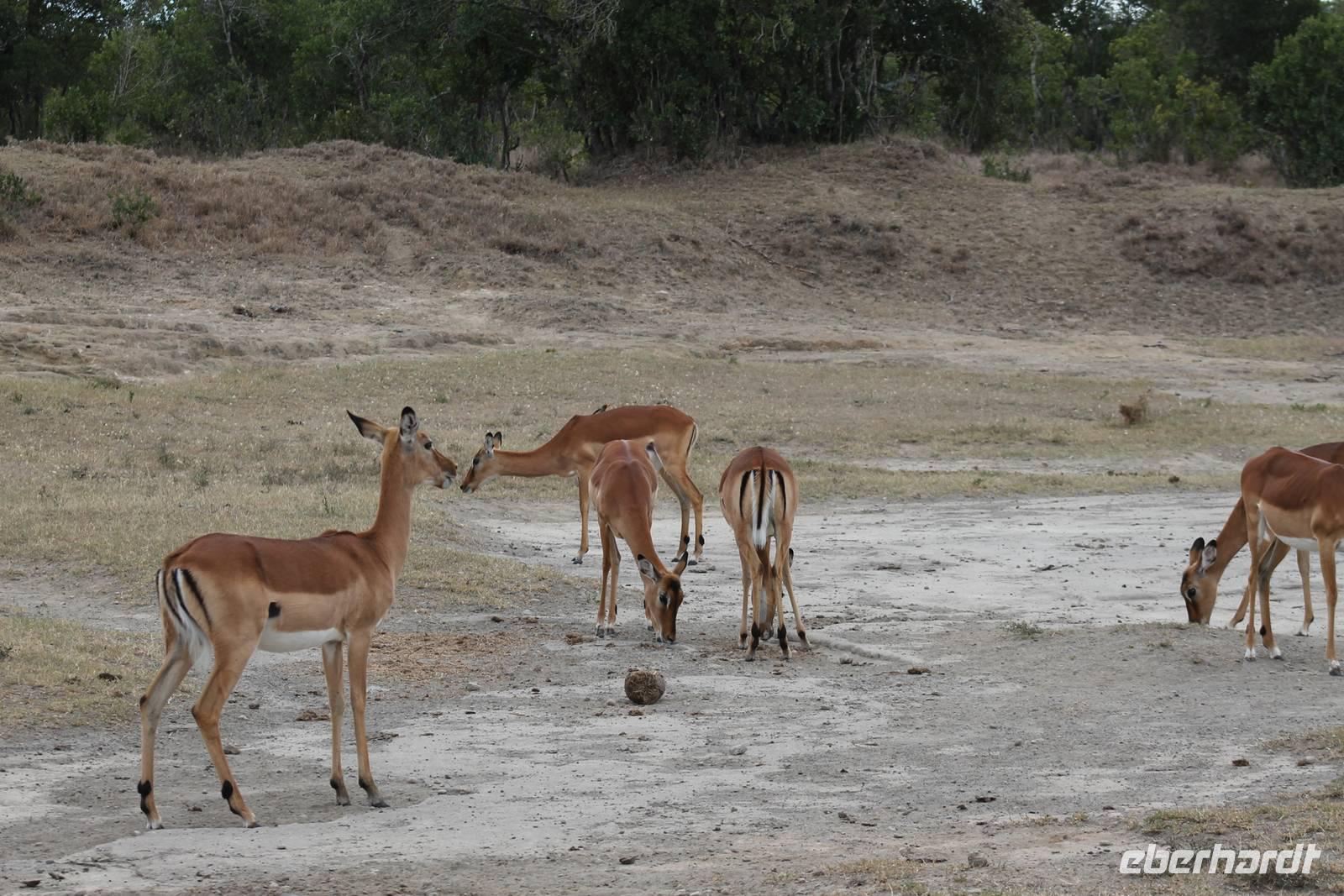 Am späten Nachmittag unternehmen wir mit zwei Rangern einen Rundgang über das Gelände und sehen einige Impalas. Wir erfahren, dass hier auch Leoparden, Wildhunde und Zebras zu Hause sind, die uns aber nicht begegnen. Trotzdem tut uns die Bewegung nach der langen Jeepfahrt wirklich gut. Von der Sandai Farm hat man auch einen wunderbaren Blick auf den Monut Kenya. Mit seinen 5.199 Metern der zweithöchste Berg Afrikas, der sich aber heute leider hinter den Wolken versteckt. Am Abend treffen wir uns wieder um gemütlich in der Wohnstube zu Abend zu essen und beim Feuer noch ein wenig zusammen zu sitzen. Dabei erfahren wir auch, dass hier schon nachts Leoparden bis zur Haustür gekommen sind und dabei ist einigen, besonders Vicky, doch etwas mulmig zu Mute. Trotzdem fallen wir dann alle müde in unsere Betten.