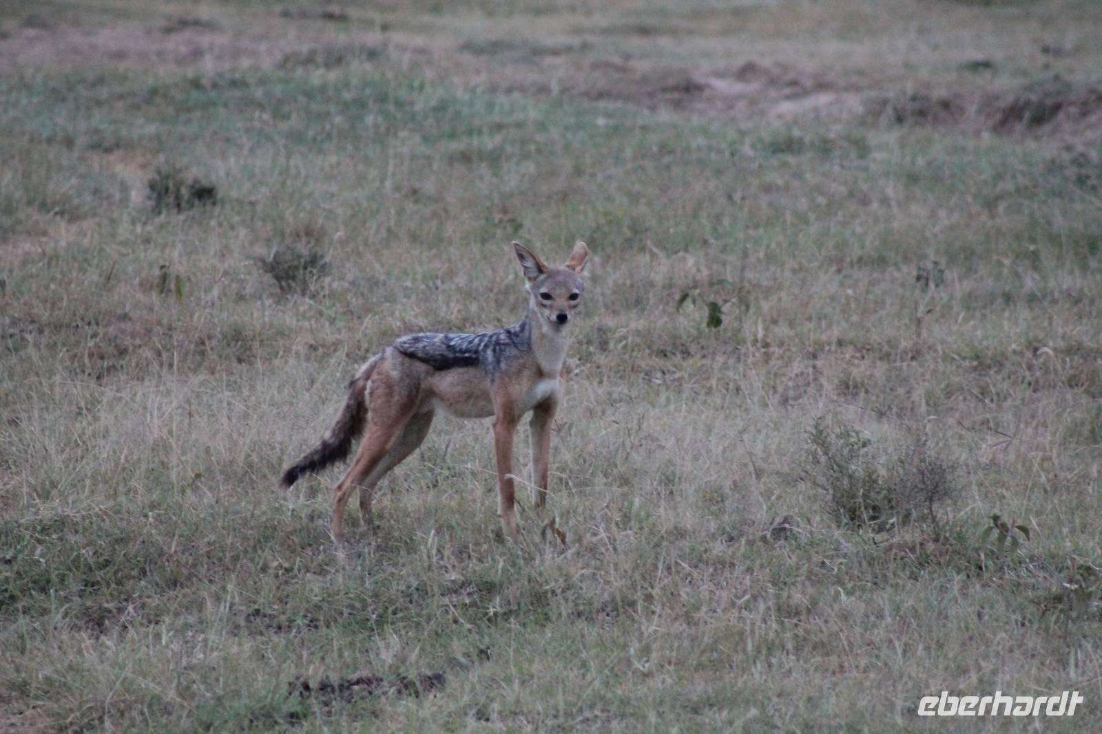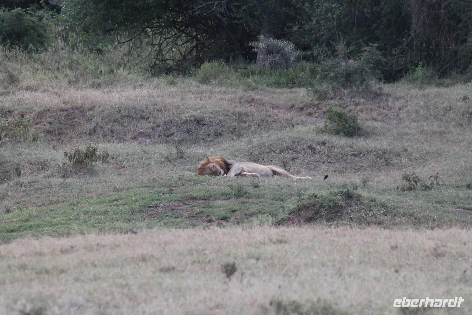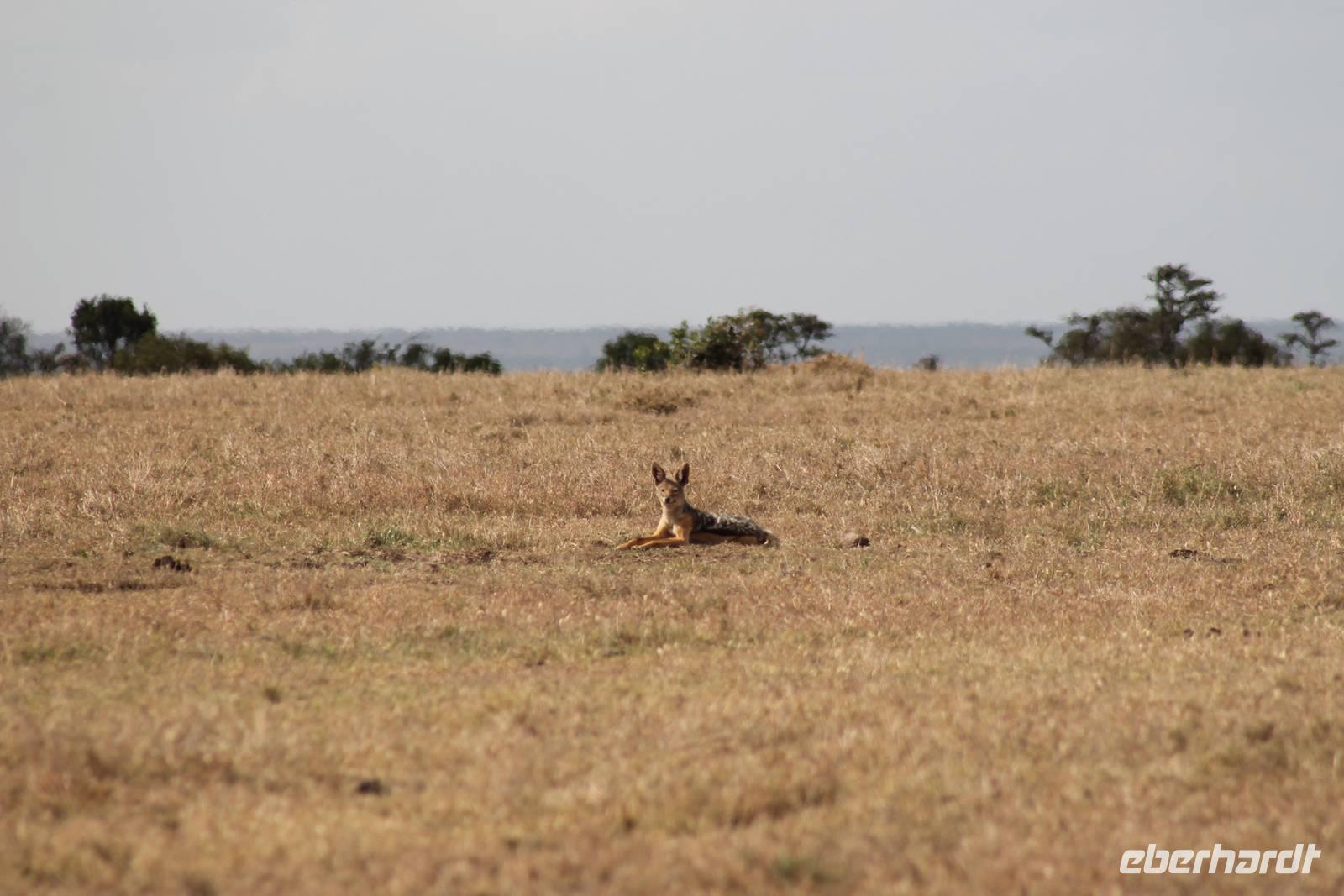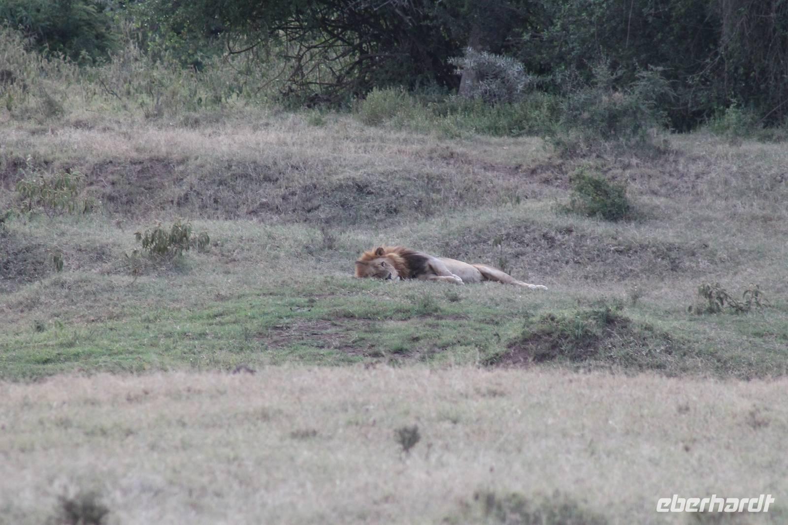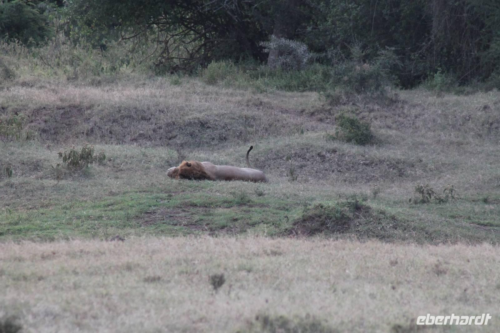 Zurück in unserer Lodge genießen wir ein leckeres Mittagessen vom Buffet und genießen danach noch eine Stunde auf unserer Terrasse oder erkunden das Lodgegelände auf eigene Faust. Am Wasserloch tummeln sich auch einige Paviane und diverse Vögel. Ausgeruht und gestärkt gehen wir am Nachmittag noch einmal auf Pirsch und wir haben Glück, denn die Sonne zeigt sich von Ihrer schönsten Seite. Wenn Engel eben reisen. So lassen wir es uns natürlich nicht nehmen um noch einmal zum See zu fahren und die Flamingos noch einem in ihrer ganzen Schönheit zu bewundern. Es haben sich auch noch viele Pelikane dazu gesellt, die uns eine Formation bieten, als wäre diese bestellt gewesen. Bei unserer weiteren Pirsch sehen wir noch einen schönen Steppenstrauß und später kaum zu erkennen und völlig unerwartet einen Löwen, der sich nach seinem Beutefang ausruht und sich gemütlich den Bauch streichelt. Ein tolles Erlebnis für uns. Hier haben wir noch nicht gewusst, dass wir auf unserer Reise noch einigen Löwen begegnen werden. Auf unserem Rückweg in der Dämmerung sehen wir noch einige Giraffen und drei Schakale, die sich ihren Weg über die Straße vor uns suchen. Mit vielen Eindrücken erreichen wir am Abend unsere Lodge und müssen auch jeden Tag sagen, dass unsere Fahrer und unser Leo schon einiges leisten um uns alles zu zeigen was Kenia zu bieten hat. Am Abend genießen wir noch ein letztes Mal ein tolles Buffet in unserer Lodge und erhalten sogar einen Abschiedsgruss mit einer Torte und einem kenianischen Lied, von den Angestellten vorgetragen. Wirklich eine nette Geste. So gehen wir heute zeitig schlafen und freuen uns auf unsere nächsten Tage in der Masai Mara.
