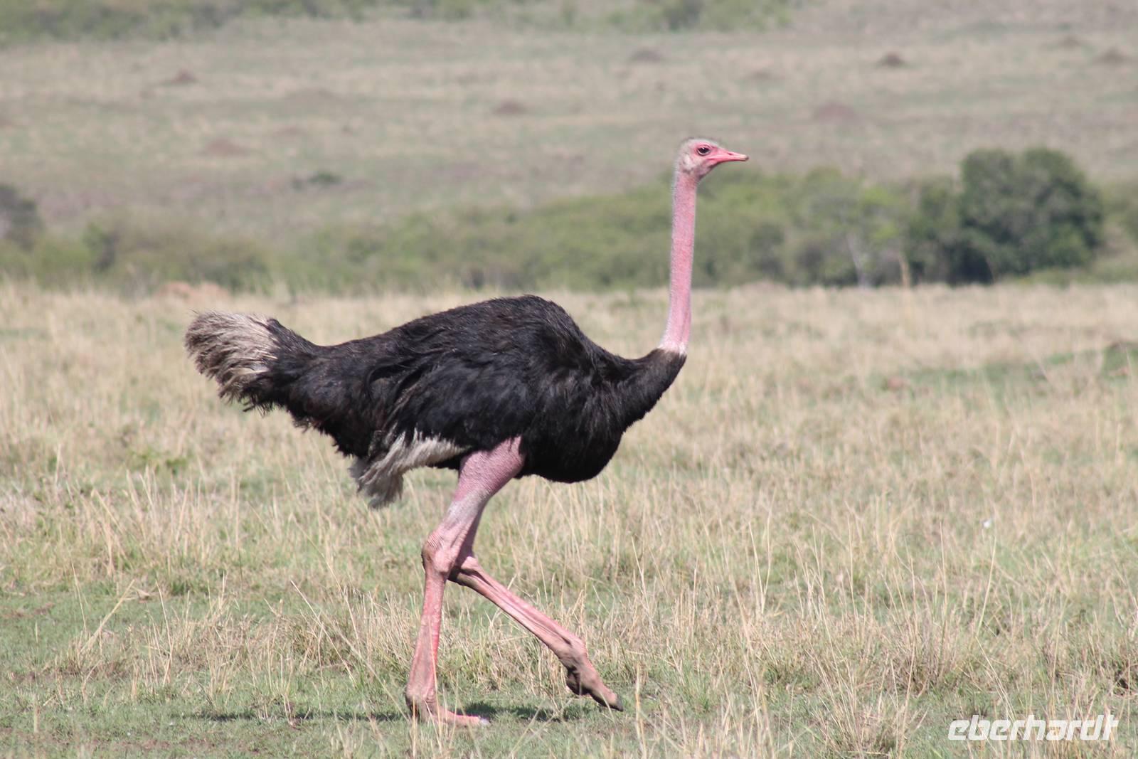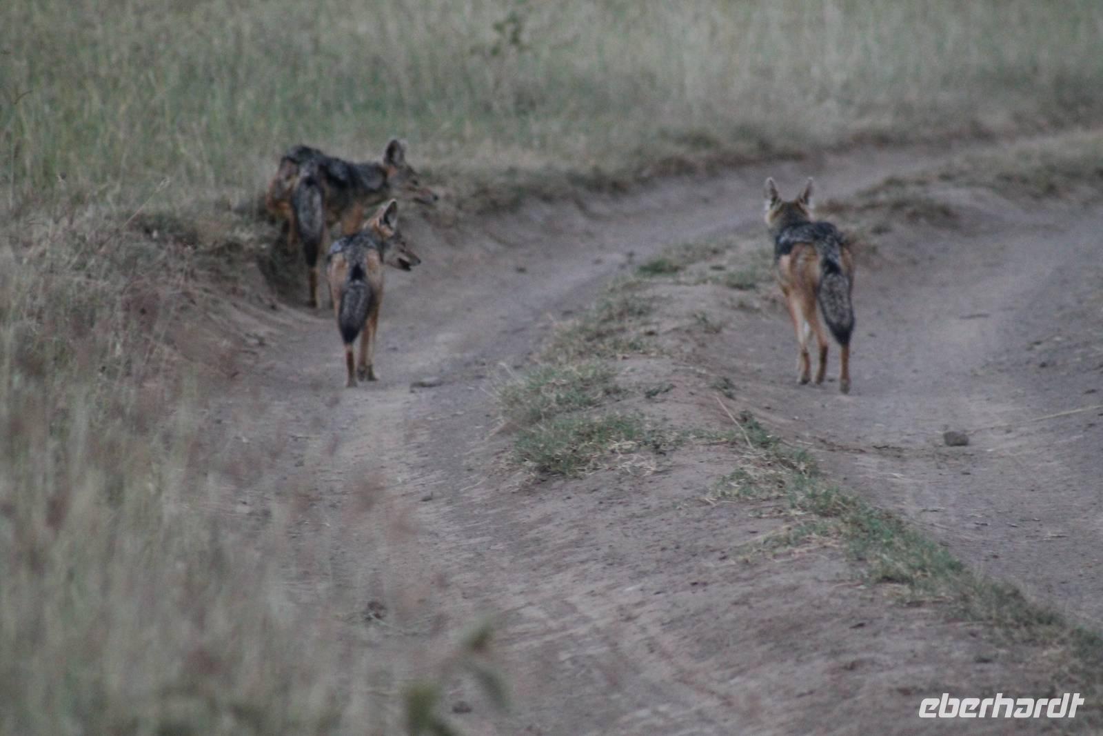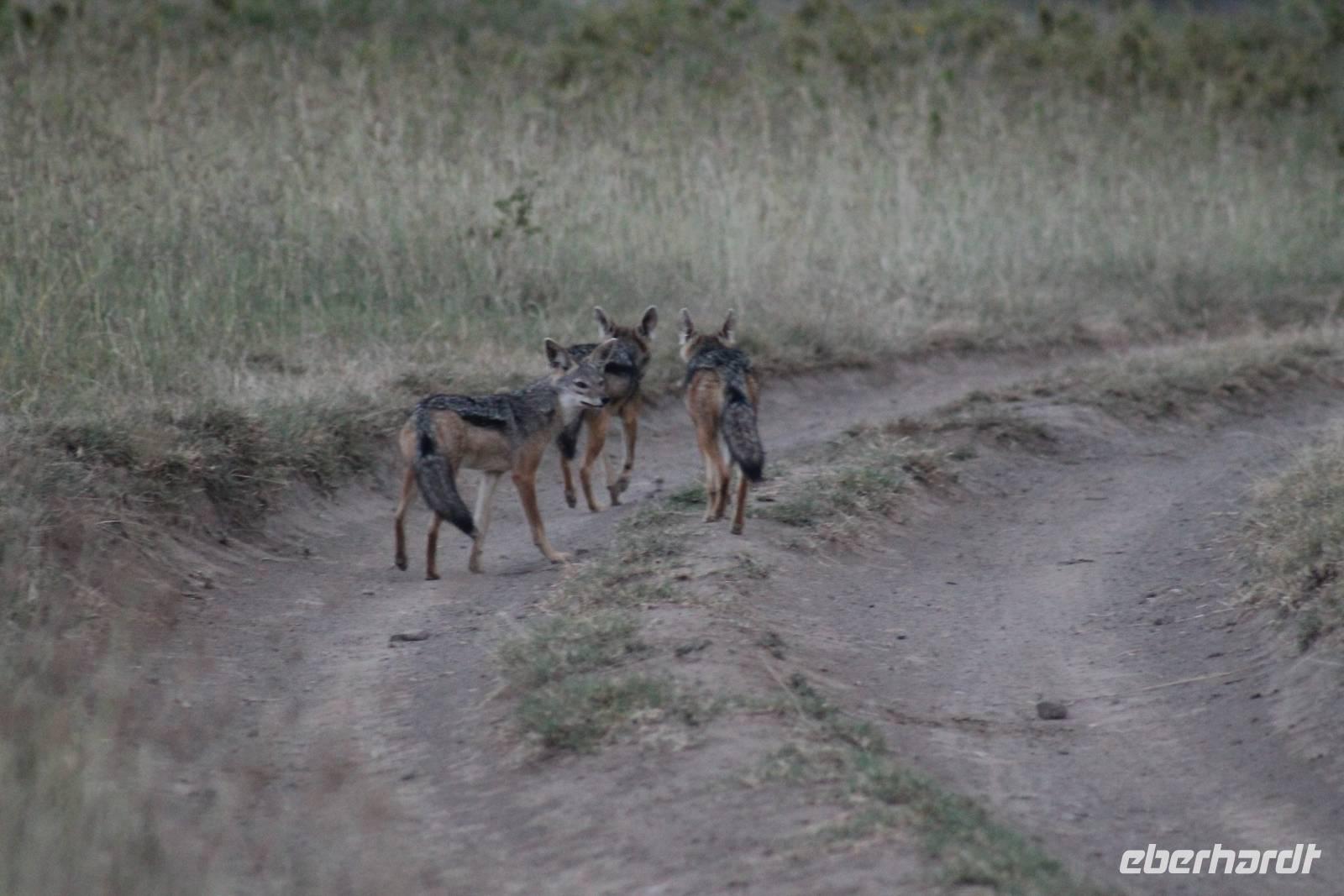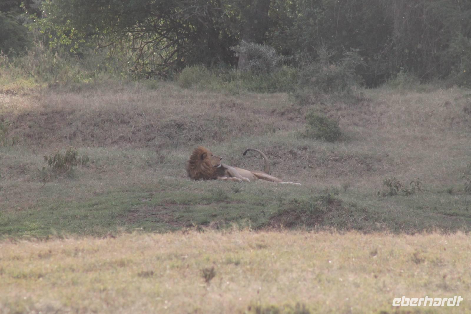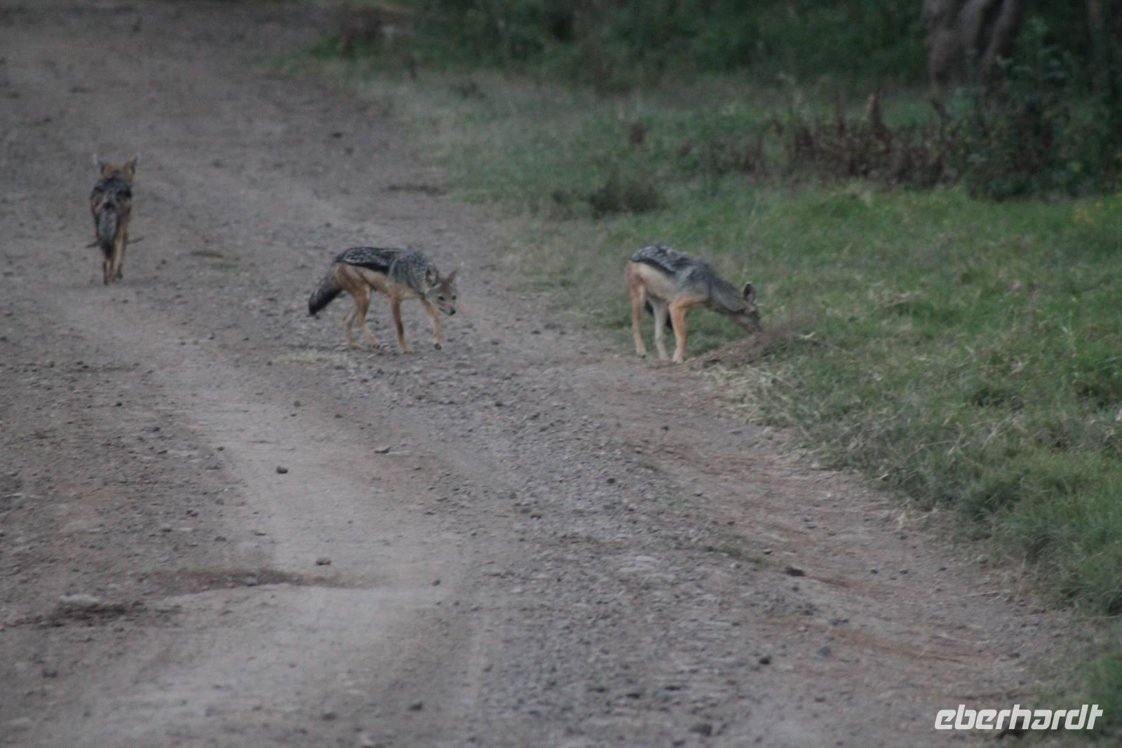 Zurück in unserer Lodge genießen wir ein leckeres Mittagessen vom Buffet und genießen danach noch eine Stunde auf unserer Terrasse oder erkunden das Lodgegelände auf eigene Faust. Am Wasserloch tummeln sich auch einige Paviane und diverse Vögel. Ausgeruht und gestärkt gehen wir am Nachmittag noch einmal auf Pirsch und wir haben Glück, denn die Sonne zeigt sich von Ihrer schönsten Seite. Wenn Engel eben reisen. So lassen wir es uns natürlich nicht nehmen um noch einmal zum See zu fahren und die Flamingos noch einem in ihrer ganzen Schönheit zu bewundern. Es haben sich auch noch viele Pelikane dazu gesellt, die uns eine Formation bieten, als wäre diese bestellt gewesen. Bei unserer weiteren Pirsch sehen wir noch einen schönen Steppenstrauß und später kaum zu erkennen und völlig unerwartet einen Löwen, der sich nach seinem Beutefang ausruht und sich gemütlich den Bauch streichelt. Ein tolles Erlebnis für uns. Hier haben wir noch nicht gewusst, dass wir auf unserer Reise noch einigen Löwen begegnen werden. Auf unserem Rückweg in der Dämmerung sehen wir noch einige Giraffen und drei Schakale, die sich ihren Weg über die Straße vor uns suchen. Mit vielen Eindrücken erreichen wir am Abend unsere Lodge und müssen auch jeden Tag sagen, dass unsere Fahrer und unser Leo schon einiges leisten um uns alles zu zeigen was Kenia zu bieten hat. Am Abend genießen wir noch ein letztes Mal ein tolles Buffet in unserer Lodge und erhalten sogar einen Abschiedsgruss mit einer Torte und einem kenianischen Lied, von den Angestellten vorgetragen. Wirklich eine nette Geste. So gehen wir heute zeitig schlafen und freuen uns auf unsere nächsten Tage in der Masai Mara.