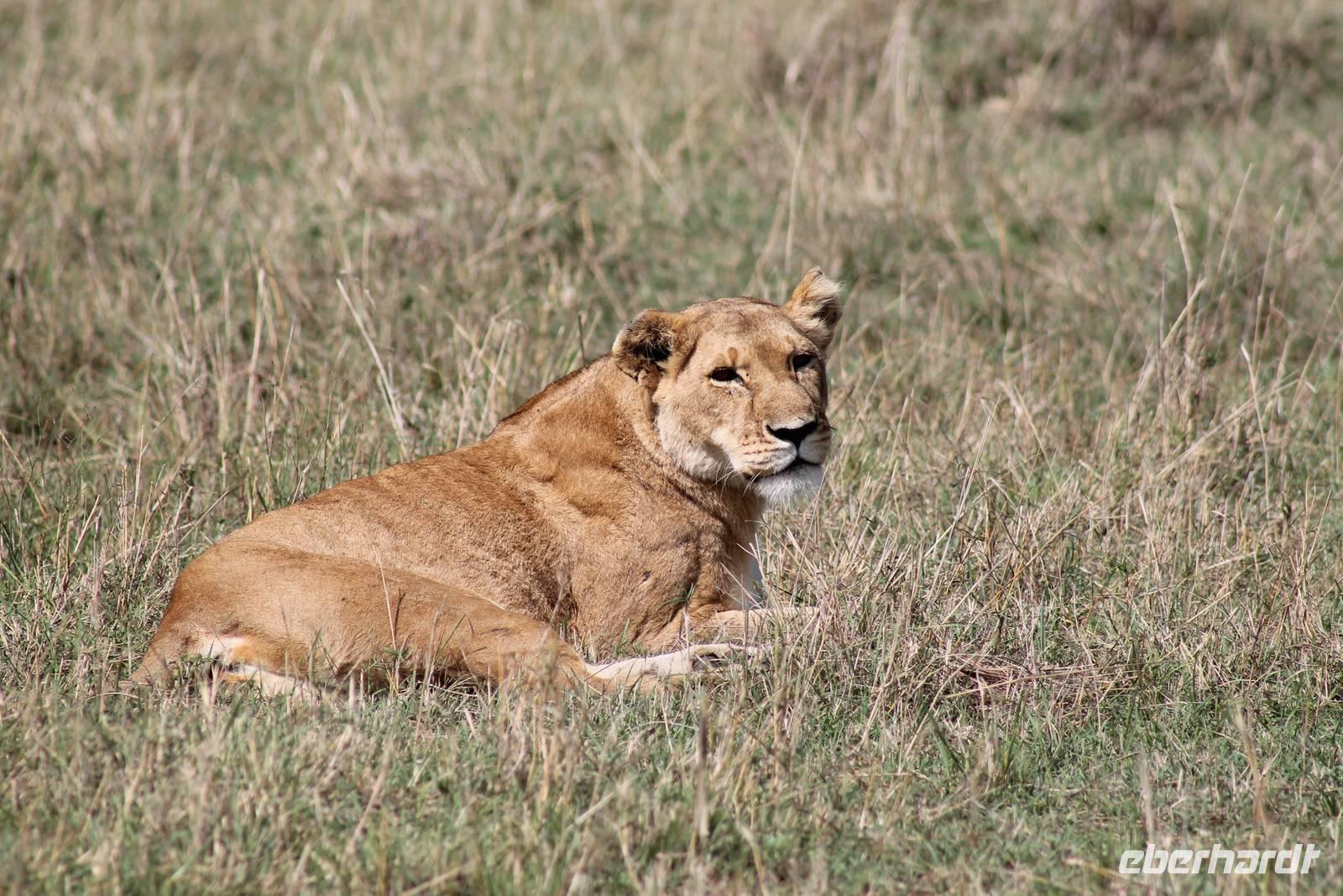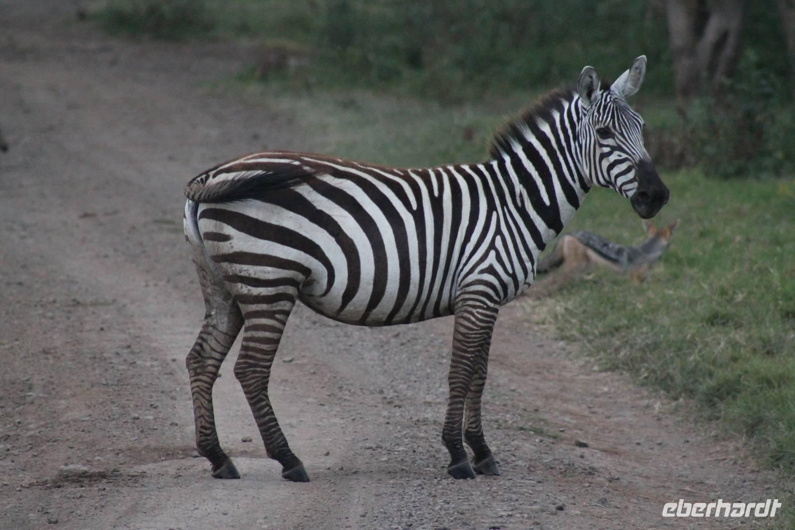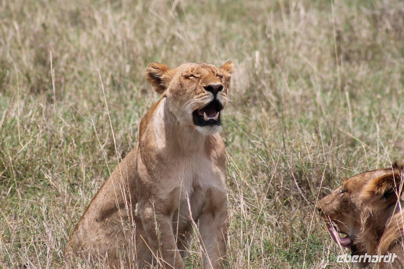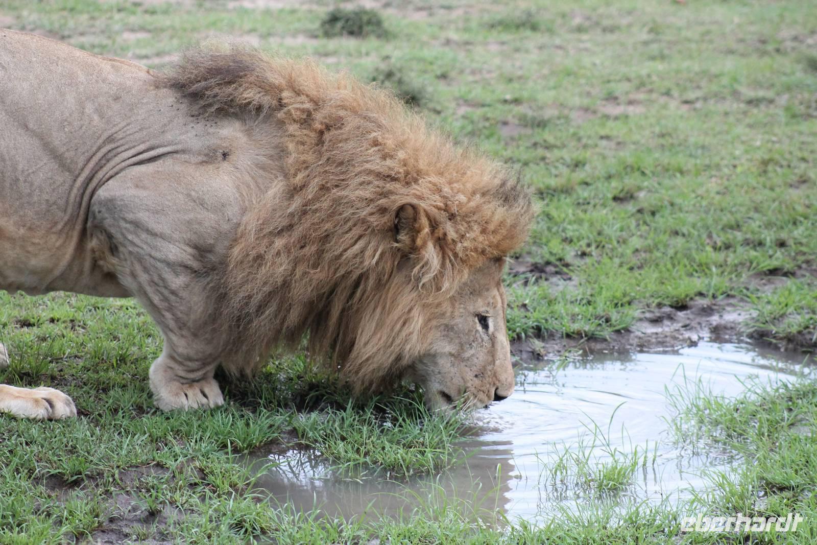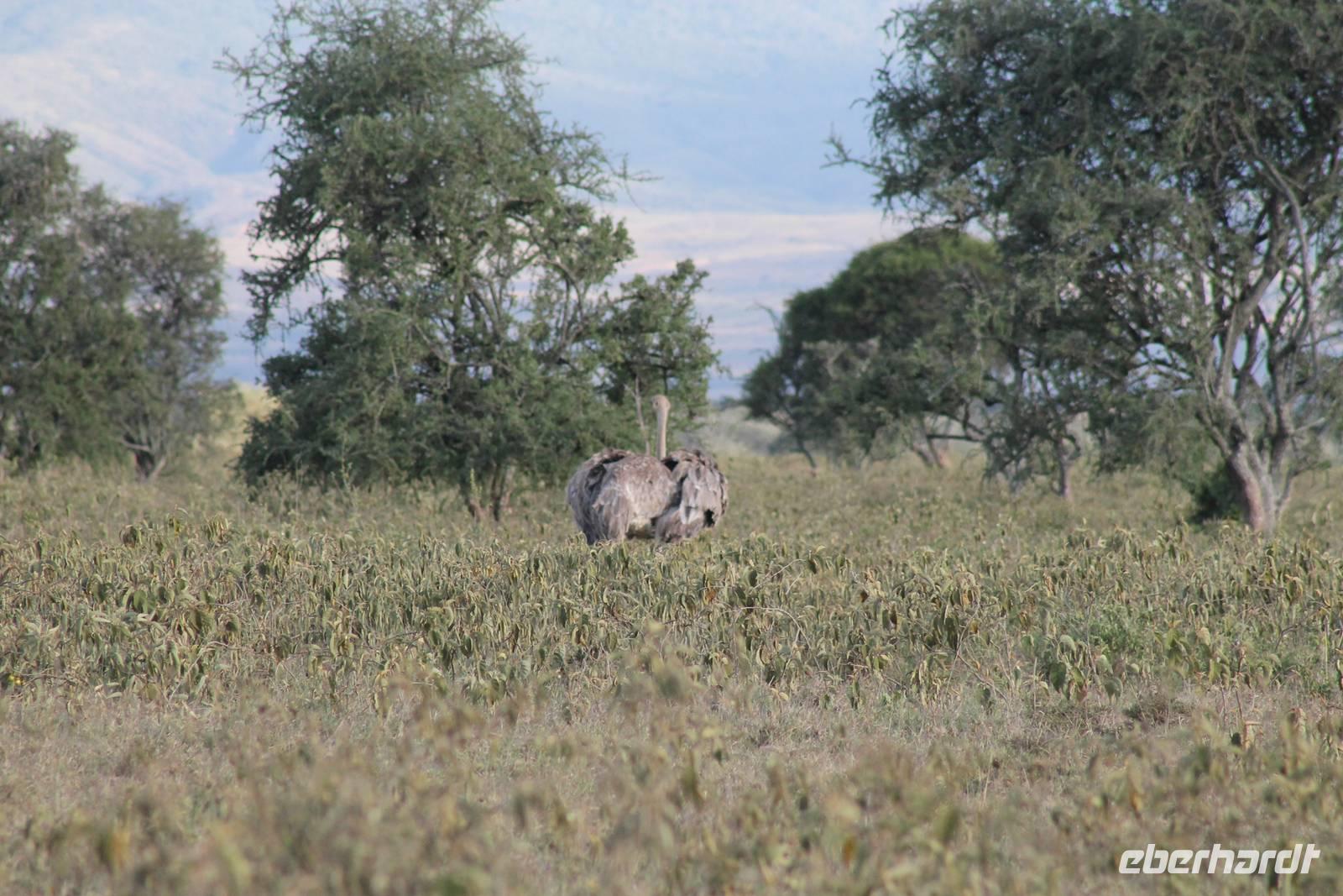 Zurück in unserer Lodge genießen wir ein leckeres Mittagessen vom Buffet und genießen danach noch eine Stunde auf unserer Terrasse oder erkunden das Lodgegelände auf eigene Faust. Am Wasserloch tummeln sich auch einige Paviane und diverse Vögel. Ausgeruht und gestärkt gehen wir am Nachmittag noch einmal auf Pirsch und wir haben Glück, denn die Sonne zeigt sich von Ihrer schönsten Seite. Wenn Engel eben reisen. So lassen wir es uns natürlich nicht nehmen um noch einmal zum See zu fahren und die Flamingos noch einem in ihrer ganzen Schönheit zu bewundern. Es haben sich auch noch viele Pelikane dazu gesellt, die uns eine Formation bieten, als wäre diese bestellt gewesen. Bei unserer weiteren Pirsch sehen wir noch einen schönen Steppenstrauß und später kaum zu erkennen und völlig unerwartet einen Löwen, der sich nach seinem Beutefang ausruht und sich gemütlich den Bauch streichelt. Ein tolles Erlebnis für uns. Hier haben wir noch nicht gewusst, dass wir auf unserer Reise noch einigen Löwen begegnen werden. Auf unserem Rückweg in der Dämmerung sehen wir noch einige Giraffen und drei Schakale, die sich ihren Weg über die Straße vor uns suchen. Mit vielen Eindrücken erreichen wir am Abend unsere Lodge und müssen auch jeden Tag sagen, dass unsere Fahrer und unser Leo schon einiges leisten um uns alles zu zeigen was Kenia zu bieten hat. Am Abend genießen wir noch ein letztes Mal ein tolles Buffet in unserer Lodge und erhalten sogar einen Abschiedsgruss mit einer Torte und einem kenianischen Lied, von den Angestellten vorgetragen. Wirklich eine nette Geste. So gehen wir heute zeitig schlafen und freuen uns auf unsere nächsten Tage in der Masai Mara.