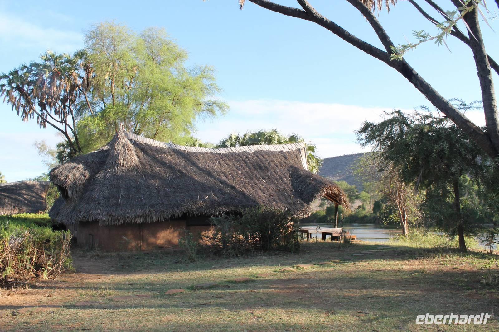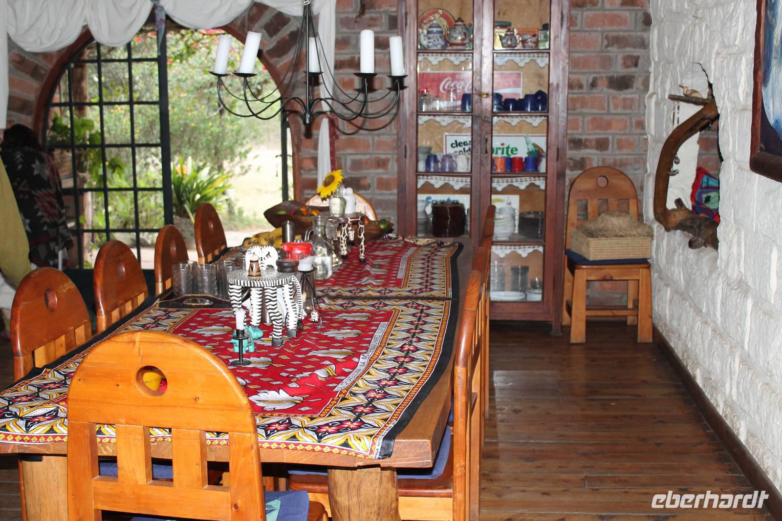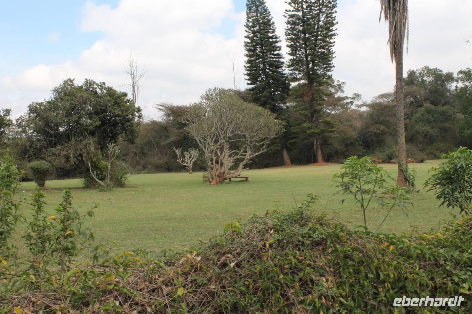 Danach führt uns eine etwas 3 stündige Strecke vorbei an wunderbar grünen Plantagen und Städten wie Sagana, Karatina und Nyeri nach Sandai, wo wir am Nachmittag ankommen. Hier werden wir schon herzlich mit einem wundberbar leckerem Mittagessen begrüßt und sind begeistert von der liebevollen Atmosphäre, die uns hier umgibt. Man fühlt sich gleich wie zu Hause. Später leistet uns auch die Hausherrin Petra Gesellschaft, die schon 27 Jahre hier lebt und alle Bungalows und das gesamte Anwesen mit viel Liebe zum Detail errichtet hat. Eine unglaubliche Leistung, der wir mit viel Resepekt gegenüber treten. So genießen wir bei einem Kaffee die gemütliche Atmosphäre und Ära Afrikas, die uns hier umgibt.
