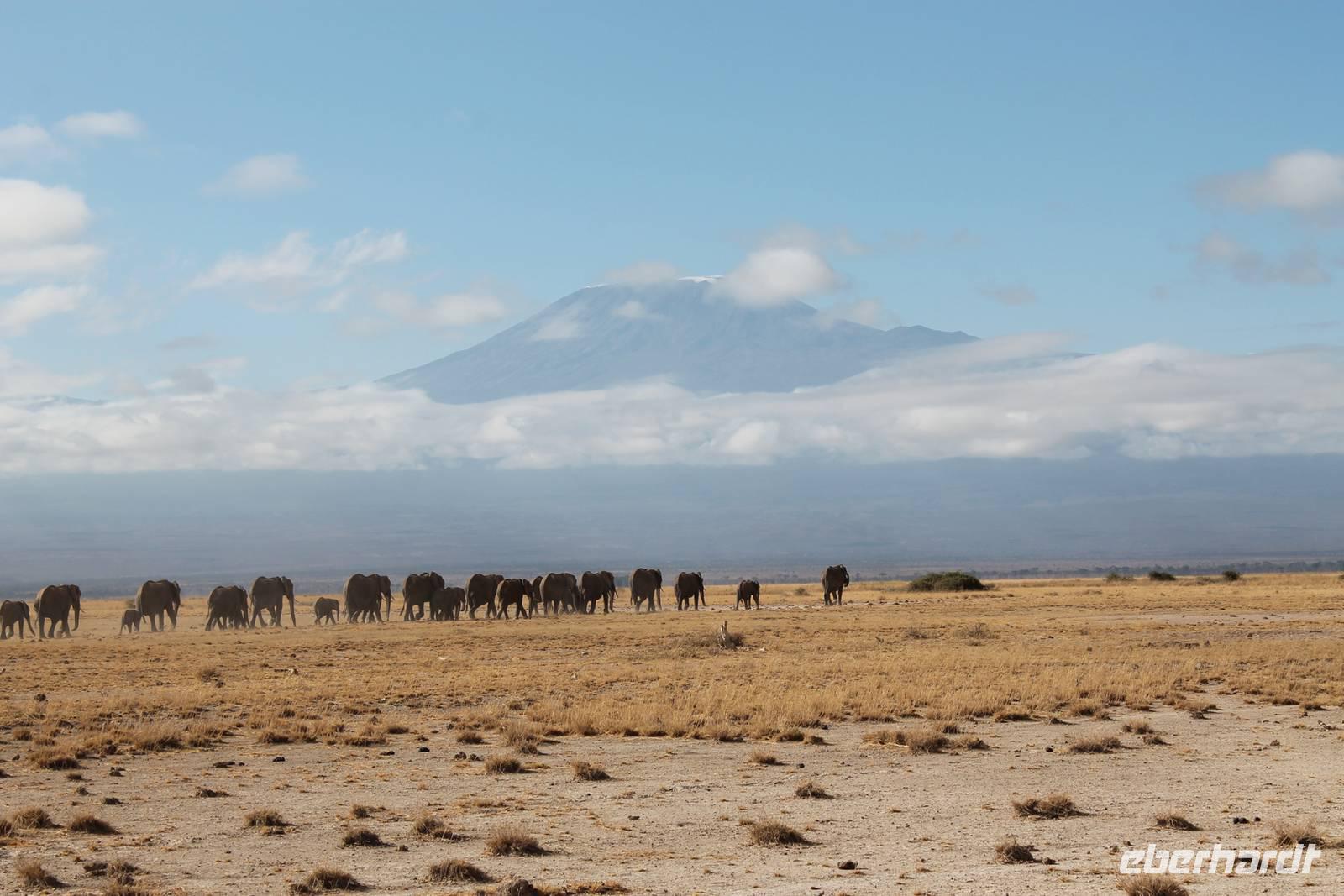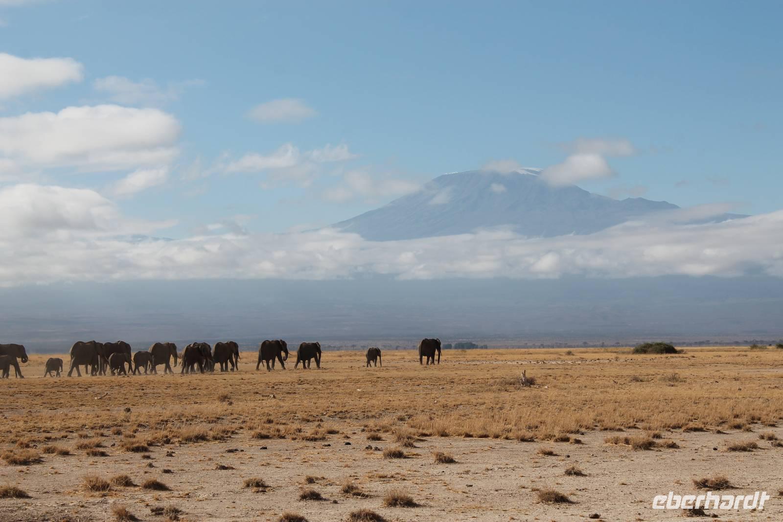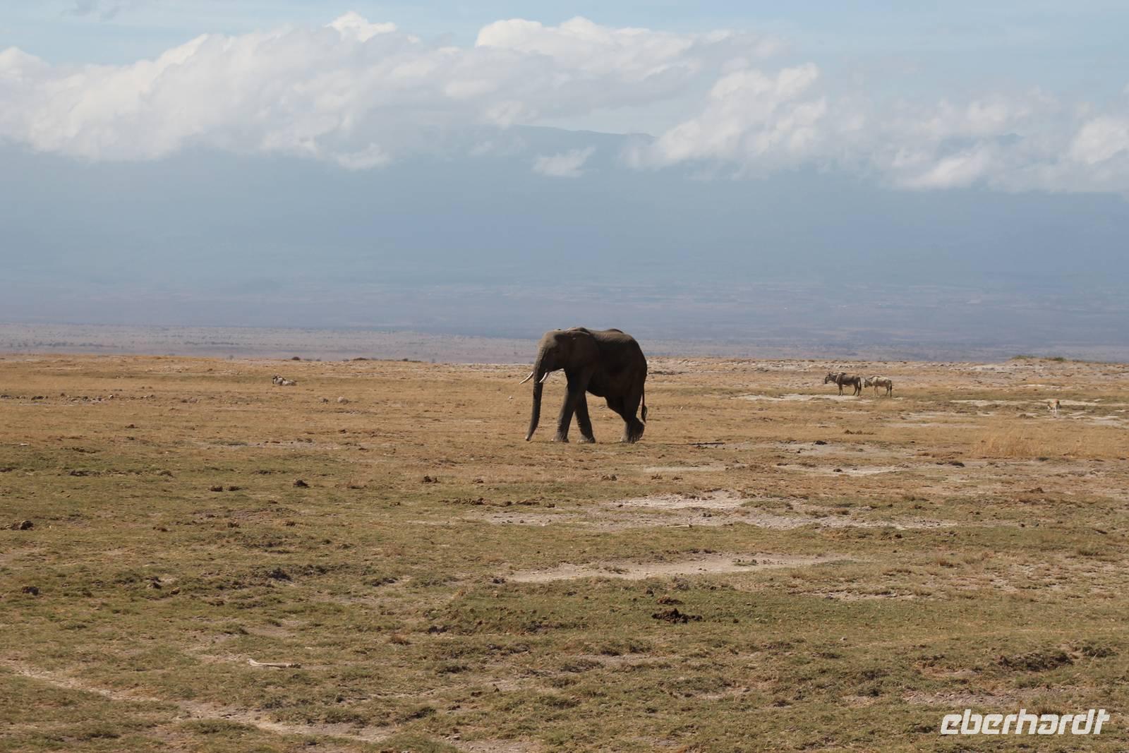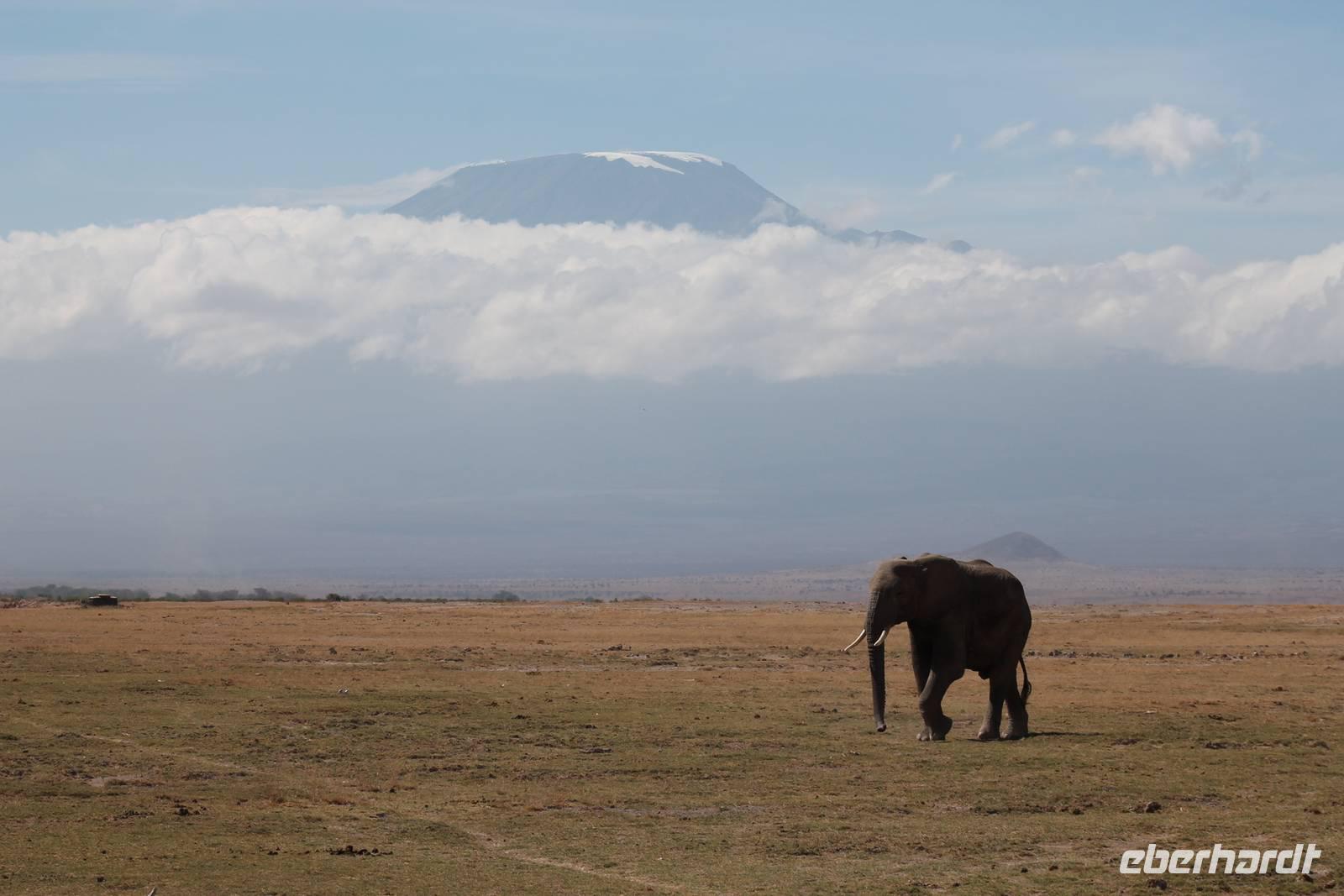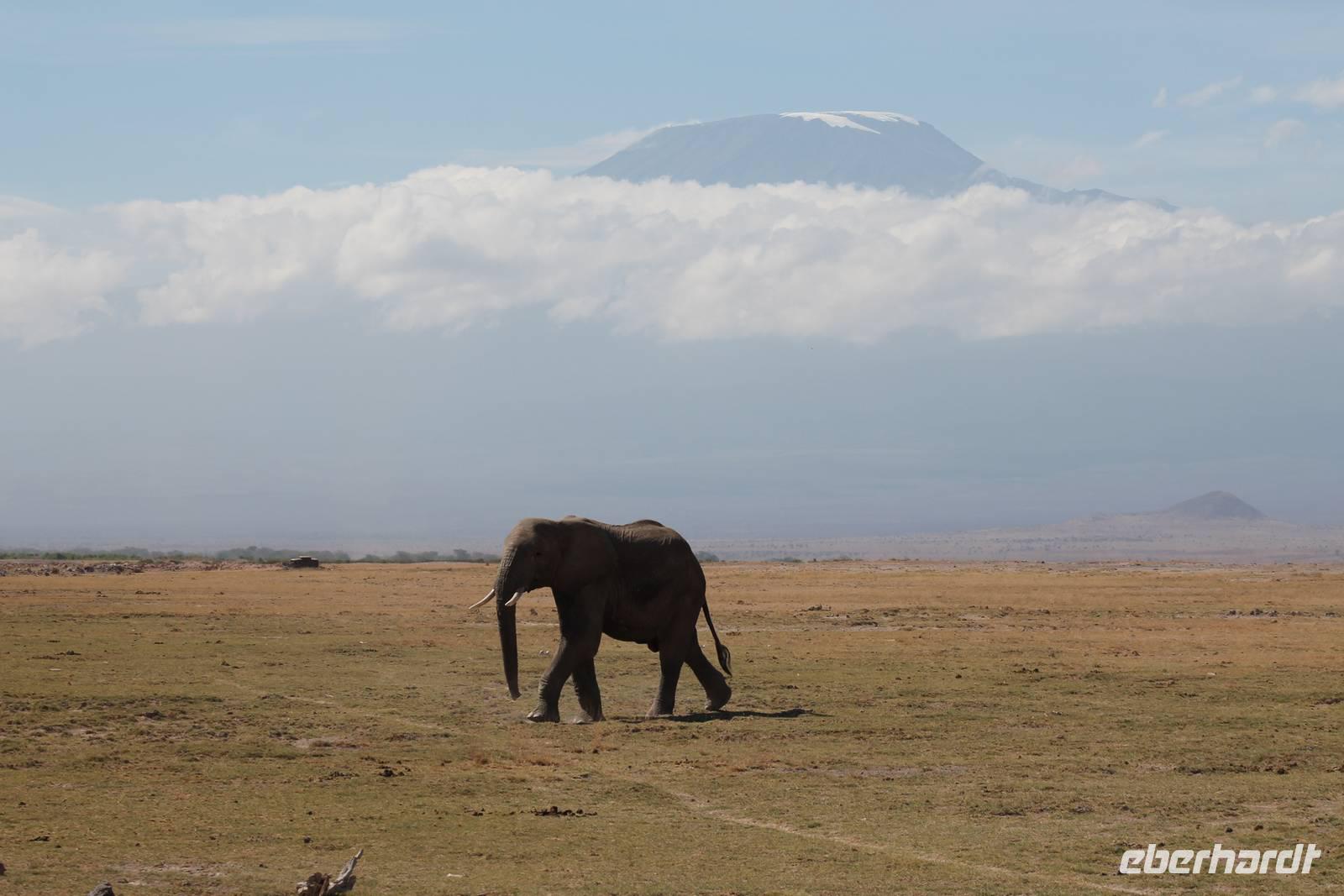 Heute stehen wir wieder zeitig auf, denn wir wollen den Amboseli-Nationalpark in seiner ganzen Schönheit erkunden. Der Amboseli-Nationalpark ist zum einen für seine Großtierwelt berühmt - vor allem für seine großen Elefantenherden - zum anderen für seine abwechslungsreiche Landschaft. In dem 392 km² großen Nationalpark finden sich fünf verschiedene Lebensraumtypen und außerdem ein zumeist ausgetrockneter See, der Lake Amboseli. Zu den verschiedenen Landschaftsformen gehören offene Savannen, lichter Akazienwald, felsiger Dornbusch sowie üppig grünes Sumpfland. Am Westrand des Reservates erhabt sich der Ol Doinyo Orok mit über 2760 Metern Höhe.Über dem ganzen Gebiet thront, jenseits der tansanischen Grenze, der majestätische Kilimanjaro mit seiner schneebedeckten Gipfelkuppe. Auf unserer morgendlichen Pirsch hüllt sich der Kilimanjaro allerdings erstmal in ein Wolkenkleid aber wir sollten später noch belohnt werden. So sehen wir bei unser allmorgendlichen Pirsch zunächst einige Thompson-Gazellen, Gnus und Sekretäre. So langsam wiederholen sich die Tiere natürlich aber trotzdem können wir von Ihnen nie genug bekommen. Später kommen wir an den Amboseli See und am Wasser ist bekanntlich immer etwas los. So sehen wir einige Flamingos, Heilige Ibise und Afrikanische Blatthühnchen. Später auch undendlich viele Elefanten sowie einige Sträuße und wundervolle Kornenkraniche. Am Oservation Hill nutzen wir die Gelegenheit um uns das Treiben von oben anzuschauen. Hier sehen wir auch einige Elefanten aus der Ferne und einige Fledermäuse. Gegen Mittag fahren wir zurück zu unserer Lodge und genießen ein tolles Mittagessen vom Buffet. Nach einer kurzen Ruhepause unternehmen wir am Nachmittag eine weitere Pirsch im Park. Hier konnten wir den Elefanten beim Baden zuschauen und mussten auch erkennen, das Sie nun mal immer nackt sind und man so Ihre Vorzüge natürlich auch entsprechend erkennt :-). Außerdem sahen wir den seltenen Goliath Reiher sowie viele Warzenschweine unbd Zebras. Unsere Augen konnten wir während der Beobachtungen aber kaum von den Dickhäutern lassen. Amboseli und Elefanten gehören eben zusammen wir Bruder und Schwester. Am Abend ließen wir den ererignisreichen Tag bei einem erneut tollen Buffet ausklingen.