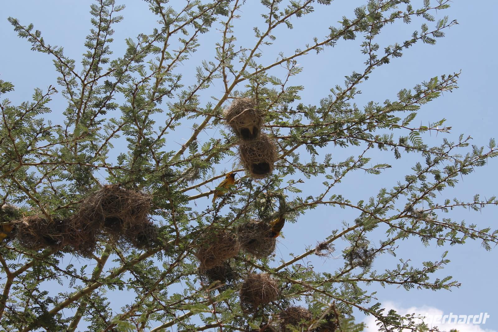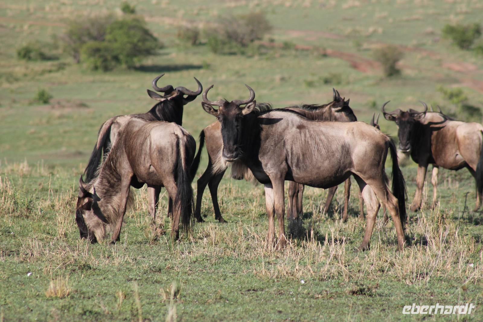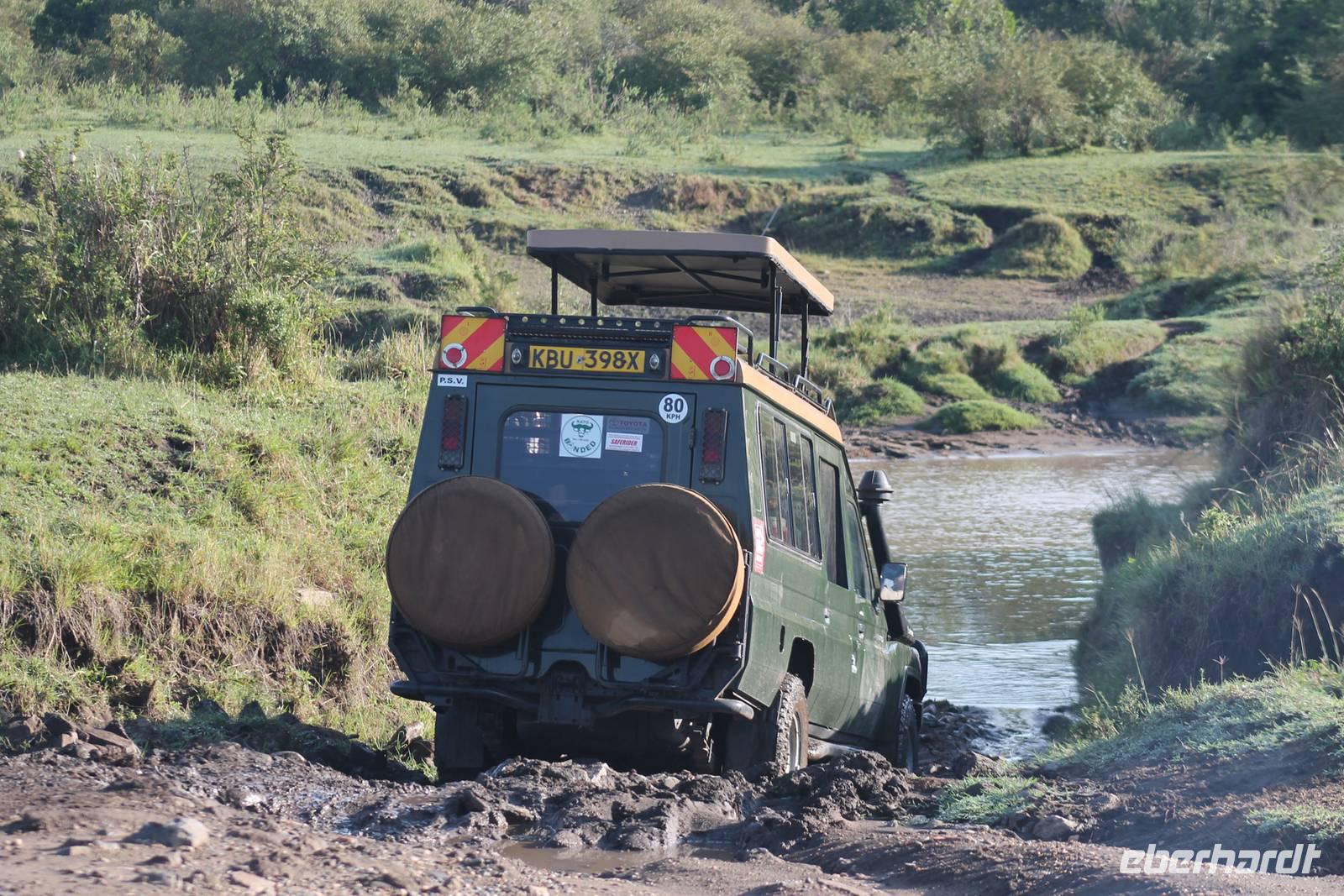 Heute verlassen wir nach einem Frühstück den Lake Nakuru und fahren weiter in Richtung Masai Mara. Eine lange Fahrt von über sechs Stunden erwartet uns, aber wir werden die nächsten Tage dafür belohnt werden. Obgliatorisch beginnen wir den Tag mit dem Lied „The Lion sleeps tonight" und begrüßen so den neuen Tag. Vom Lake Nakuru fahren wir wieder ein Stück zurück bis nach Gilgil und nehmen dann die Straße nach Naivasha, wo wir auf unserer Reise auch noch hinkommen werden. Unterwegs pausieren wir natürlich für eine nicht vermeidbare Toilettenpause. Hier sehen wir auch einen Baum mit einem Duzend von Webervögeln, die hier ihre Nester gebaut haben. Im Jeep müssen wir wieder einige Aufgaben lösen, obwohl heute eigentlich Samstag ist und auch keine Schule, aber Jackson meint, was muss das muss und wir wollen ja auch etwas über Kenia erfahren. So hören wir interessiert zu um an Ende auch unsere Prüfung zu bestehen. Da geht es den anderen schon besser in den anderen Jeeps mit Armstrong oder Calep (Spaß). Bevor wir aber heute unser schönes Buschcamp erreichen, müssen wir noch 100 Kilometer Buckelpiste zurücklegen, die uns alles abfordert. Im Nationalpark angekommen erfahren wir außerdem noch, dass der Fluss leider durch das viele Regenwasser der letzten Tage, für die Jeeps nicht befahrbar ist und wir so einen Umweg nehmen müssen. Dieser kostet uns etwa ½ Stunde aber wir nehmen es gelassen. Auf unserem Weg zum Camp sehen wir schon unheimlich viele Herden von Gnus sowie vielen Thomson-Gazellen und vor allem unheimlich viele Knochenreste, die von Raubkatzen stammen. So ist es nicht verwunderlich, dass es hier eine unheimlich große Population an Löwen und anderen Raubkatzen geben muss, was wir in den nächsten Tagen auch noch sehen werden. Trotzdem fahren wir, umso später es wird, an den Tieren vorbei um schnell zu unserem Mittagessen und zu unserem Camp zu kommen. Die Fahrt hat uns schon ganz schön geschafft aber man muss dazu sagen, dass unsere Fahrer alles getan haben, um diese so angenehm wie möglich zu gestalten.
