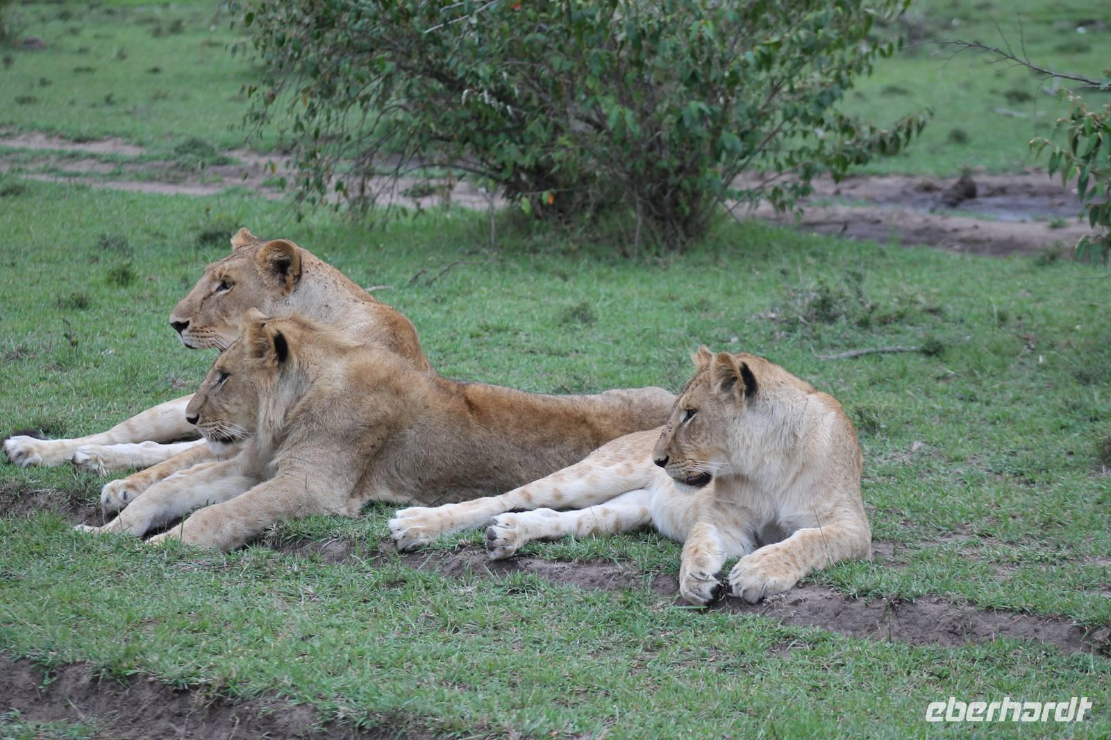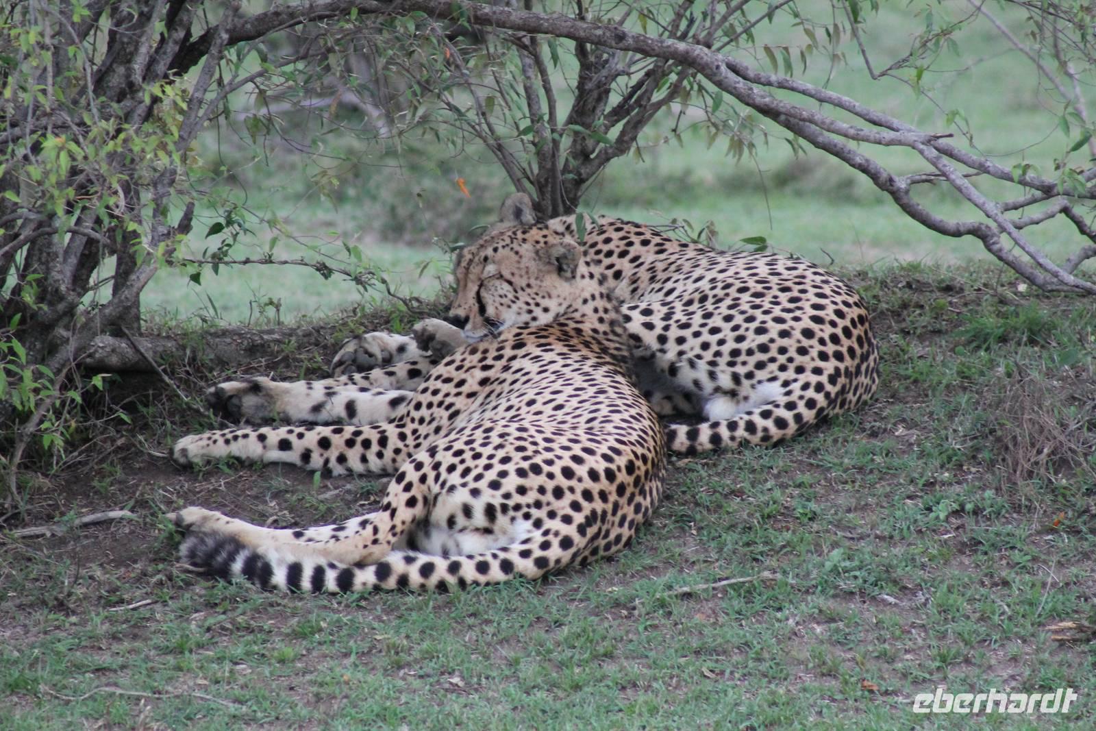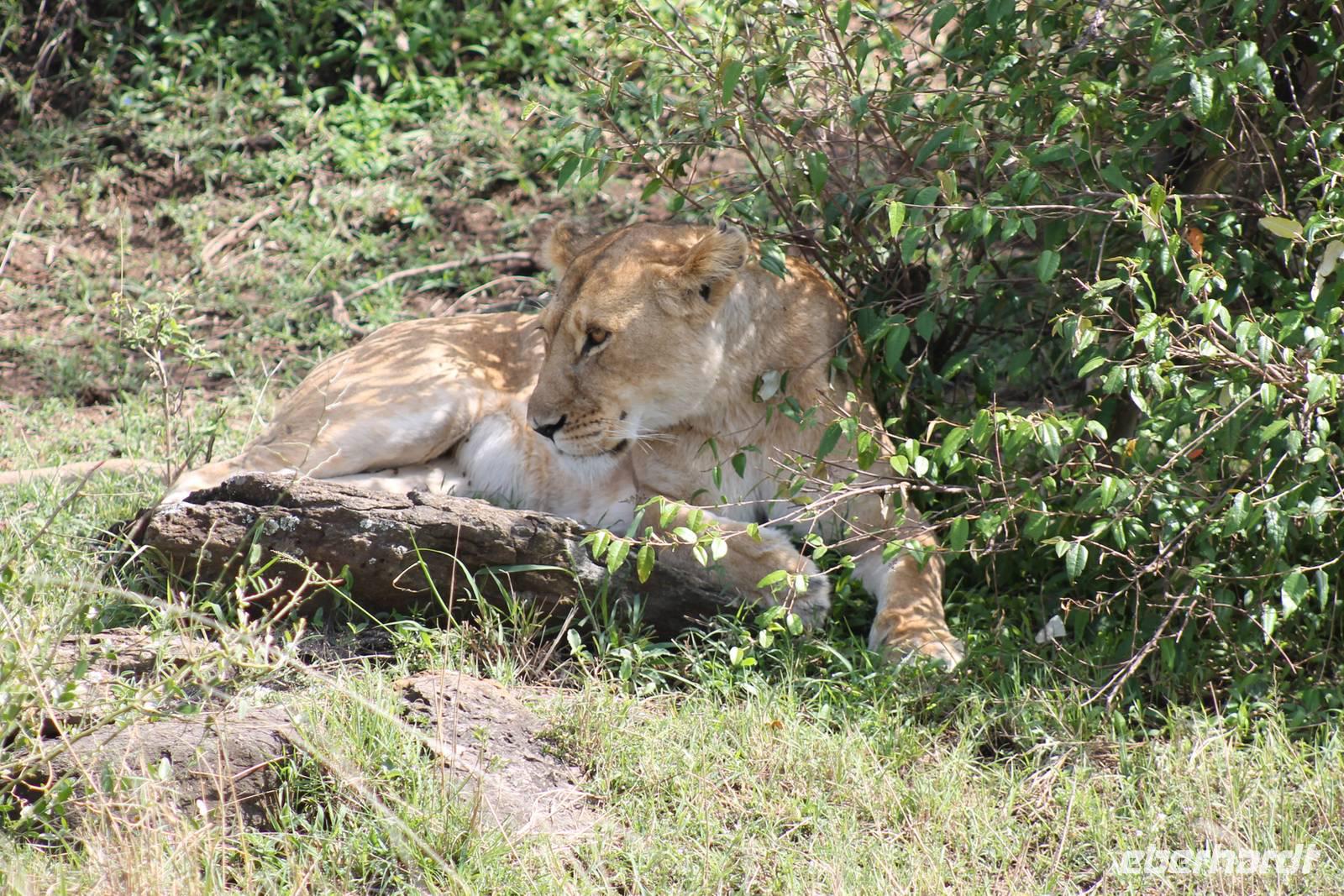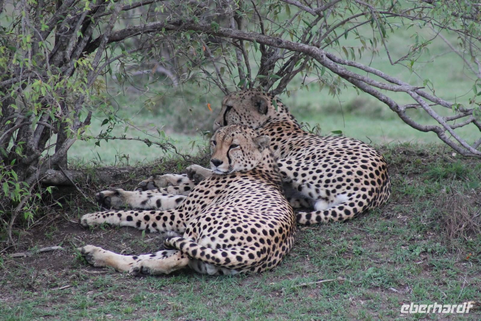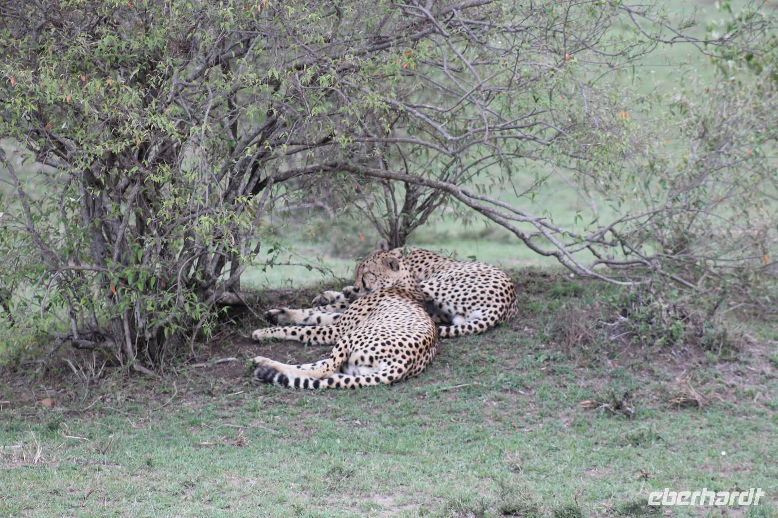 Am Nachmittag erreichen wir endlich unser Camp und werden schon von den netten Angestellten und den Massai, die uns hier bedienen, erwartet. Das Mara Bush Camp ist mitten im Nationalpark gelegen und direkt am Mara-Fluss und ist nicht eingezäunt. Wir übernachten in komfortablen Zelten, die uns aber alles bieten, was wir benötigen. Ein klein bisschen mulmig ist uns aber doch schon, als wir einige Krokodile am Fluss sehen und auch viele Hippospuren direkt vor unseren Zelten. Trotzdem freuen wir uns auf die nächsten Tage, denn Afrika ist ja auch ein Abenteuer. Nach einem späten Mittagessen unternehmen wir unsere erste Pirsch im Nationalpark. Kaum zu glauben was wir hier innerhalb von einer Stunde alles sehen: Ein Hippo direkt am Eingang des Camps, viele Topis, einige Hippos im Fluss, Hyänen, Graureiher und plötzlich zwei wunderschöne Geparden unter einem Busch, die wohl gerade gefressen haben und sich nun zur Ruhe gelegt haben. Unglaublich wunderschöne Tiere. Nur kurze Zeit später erwartet uns eine Löwenfamilie, als hätte sich diese für uns dorthin gelegt. Wir sehen einen Löwenvater sowie eine Löwenmutter mit ihren drei Kindern und kommen diesen nah wie nie. So können wir das Treiben aus nächster Nähe beobachten und es scheint, als würden die Fotos, die wir hier schießen von einer Postkarte stammen. Später kommt noch der Onkel der Bande hinzu und wir können ihn beim Trinken beobachten. Wir können unser Glück kaum fassen und könnten hier noch ewig verweilen. Es bleibt dabei zu bemerken, dass wir nur kurz über eine Stunde im Park unterwegs waren. Am Abend kommen wir wieder zurück und genießen nach einer Dusche unser abendliches Dinner mit allerlei Köstlichkeiten. Verhungern müssen wir hier wirklich nicht. Da wir ja in einem nicht eingezäunten Gebiet mitten im Busch wohnen hat ein jeder seinen eigenen Askari, ein Massai, der uns sicher zu unserem Zelt bringt und auch wieder abholt. So fühlen wir uns schon ein wenig sicherer. Die Geräusche in der Nacht hören wir natürlich trotzdem, aber am nächsten Morgen stellt sich raus, dass auch hier wieder alle TRAVEL Gäste überlebt haben.