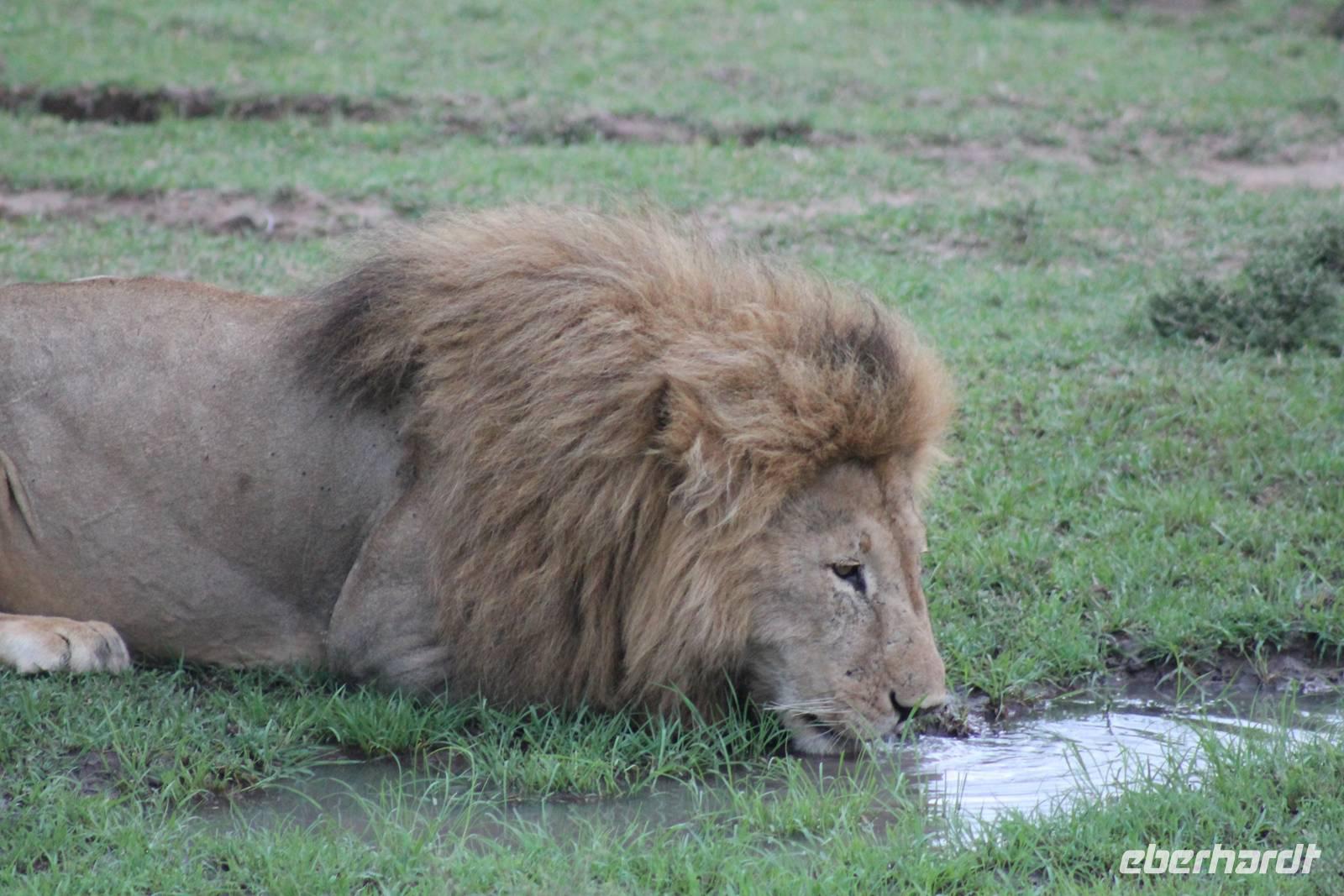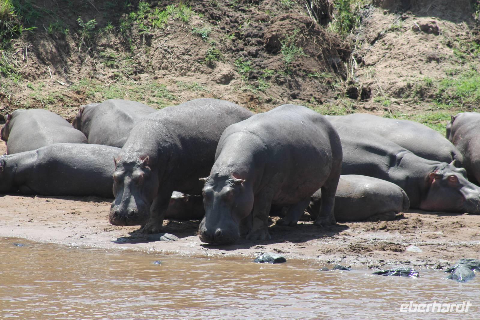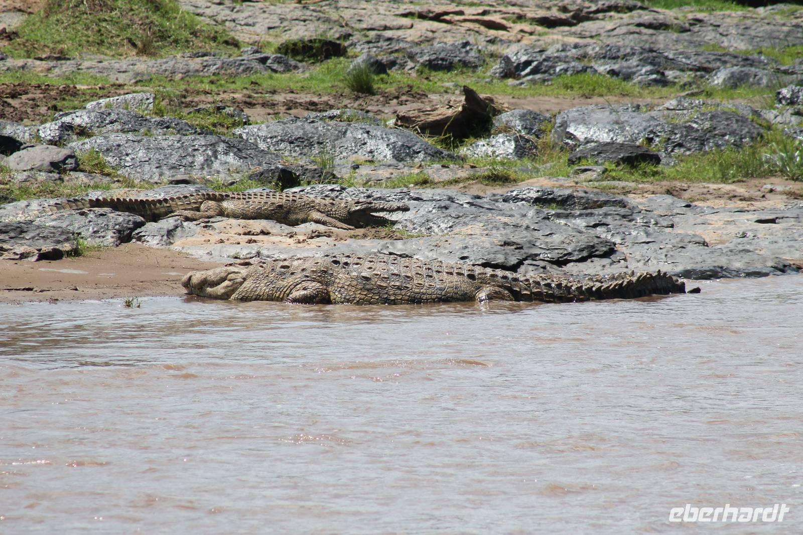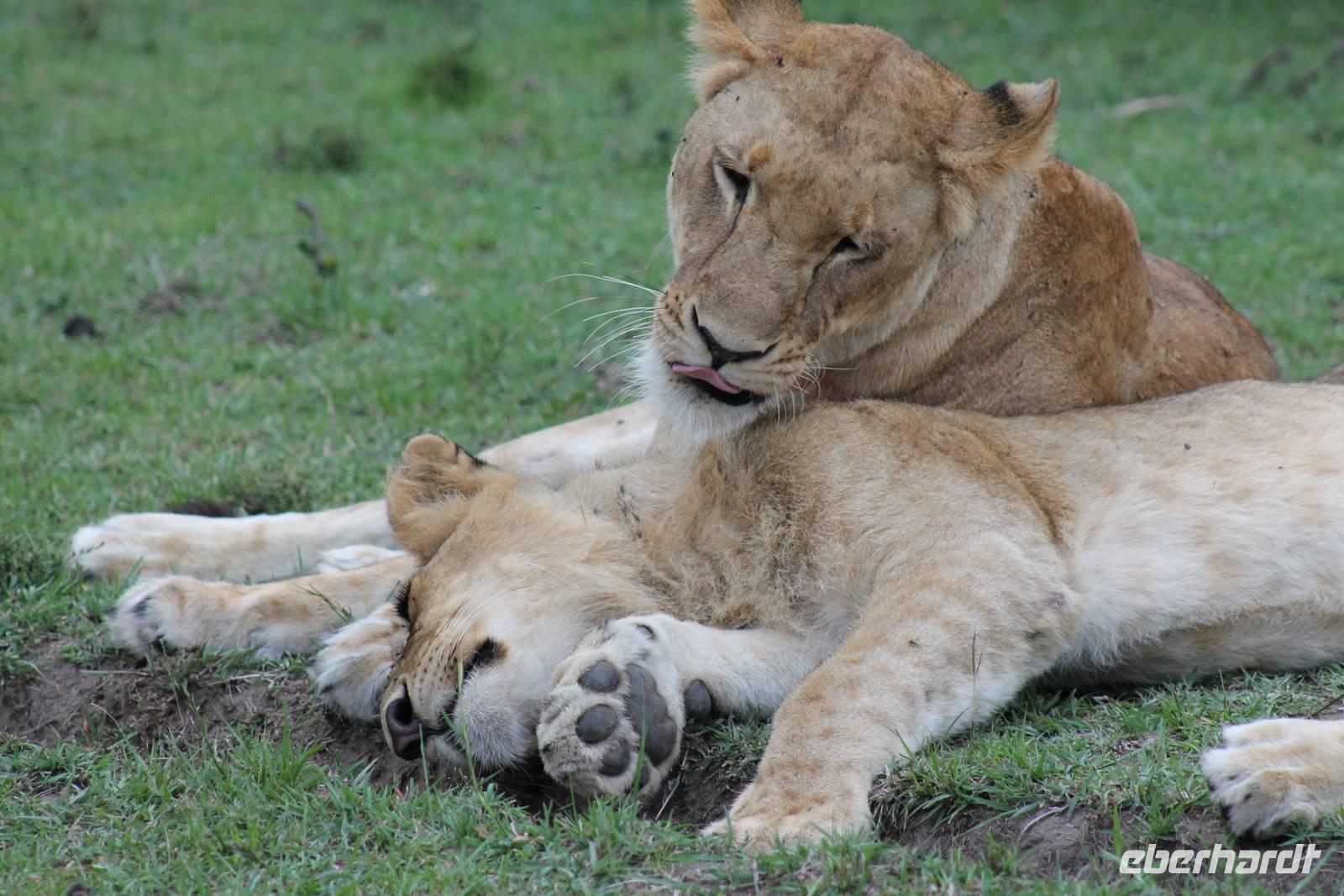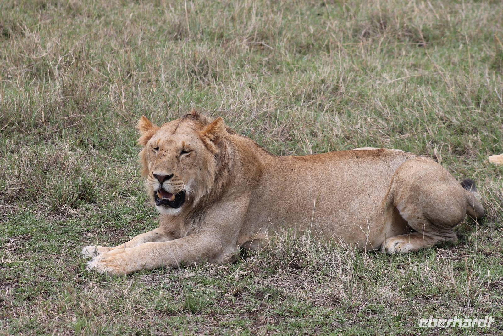 Am Nachmittag erreichen wir endlich unser Camp und werden schon von den netten Angestellten und den Massai, die uns hier bedienen, erwartet. Das Mara Bush Camp ist mitten im Nationalpark gelegen und direkt am Mara-Fluss und ist nicht eingezäunt. Wir übernachten in komfortablen Zelten, die uns aber alles bieten, was wir benötigen. Ein klein bisschen mulmig ist uns aber doch schon, als wir einige Krokodile am Fluss sehen und auch viele Hippospuren direkt vor unseren Zelten. Trotzdem freuen wir uns auf die nächsten Tage, denn Afrika ist ja auch ein Abenteuer. Nach einem späten Mittagessen unternehmen wir unsere erste Pirsch im Nationalpark. Kaum zu glauben was wir hier innerhalb von einer Stunde alles sehen: Ein Hippo direkt am Eingang des Camps, viele Topis, einige Hippos im Fluss, Hyänen, Graureiher und plötzlich zwei wunderschöne Geparden unter einem Busch, die wohl gerade gefressen haben und sich nun zur Ruhe gelegt haben. Unglaublich wunderschöne Tiere. Nur kurze Zeit später erwartet uns eine Löwenfamilie, als hätte sich diese für uns dorthin gelegt. Wir sehen einen Löwenvater sowie eine Löwenmutter mit ihren drei Kindern und kommen diesen nah wie nie. So können wir das Treiben aus nächster Nähe beobachten und es scheint, als würden die Fotos, die wir hier schießen von einer Postkarte stammen. Später kommt noch der Onkel der Bande hinzu und wir können ihn beim Trinken beobachten. Wir können unser Glück kaum fassen und könnten hier noch ewig verweilen. Es bleibt dabei zu bemerken, dass wir nur kurz über eine Stunde im Park unterwegs waren. Am Abend kommen wir wieder zurück und genießen nach einer Dusche unser abendliches Dinner mit allerlei Köstlichkeiten. Verhungern müssen wir hier wirklich nicht. Da wir ja in einem nicht eingezäunten Gebiet mitten im Busch wohnen hat ein jeder seinen eigenen Askari, ein Massai, der uns sicher zu unserem Zelt bringt und auch wieder abholt. So fühlen wir uns schon ein wenig sicherer. Die Geräusche in der Nacht hören wir natürlich trotzdem, aber am nächsten Morgen stellt sich raus, dass auch hier wieder alle TRAVEL Gäste überlebt haben.