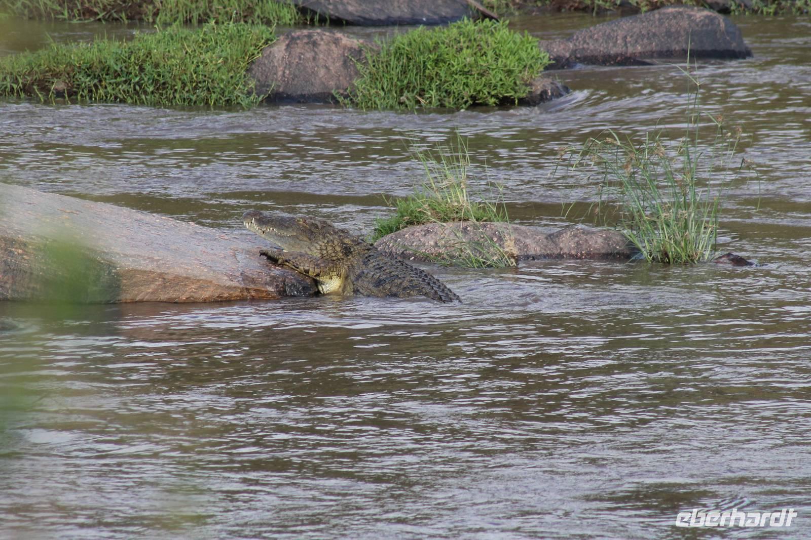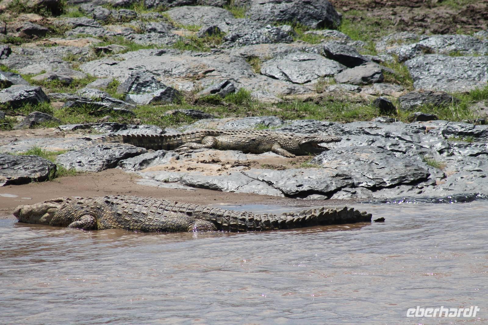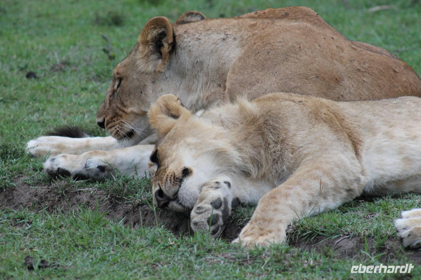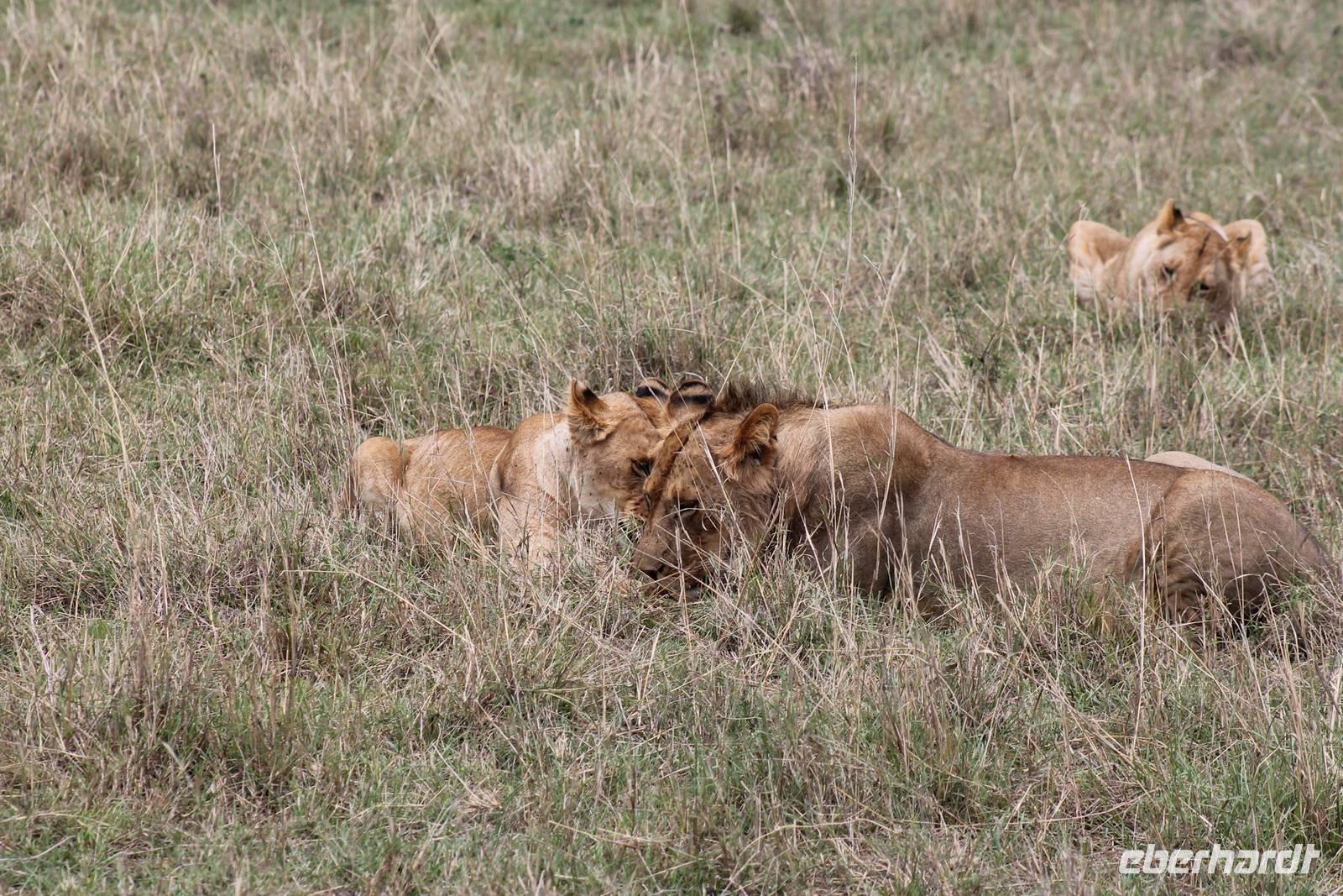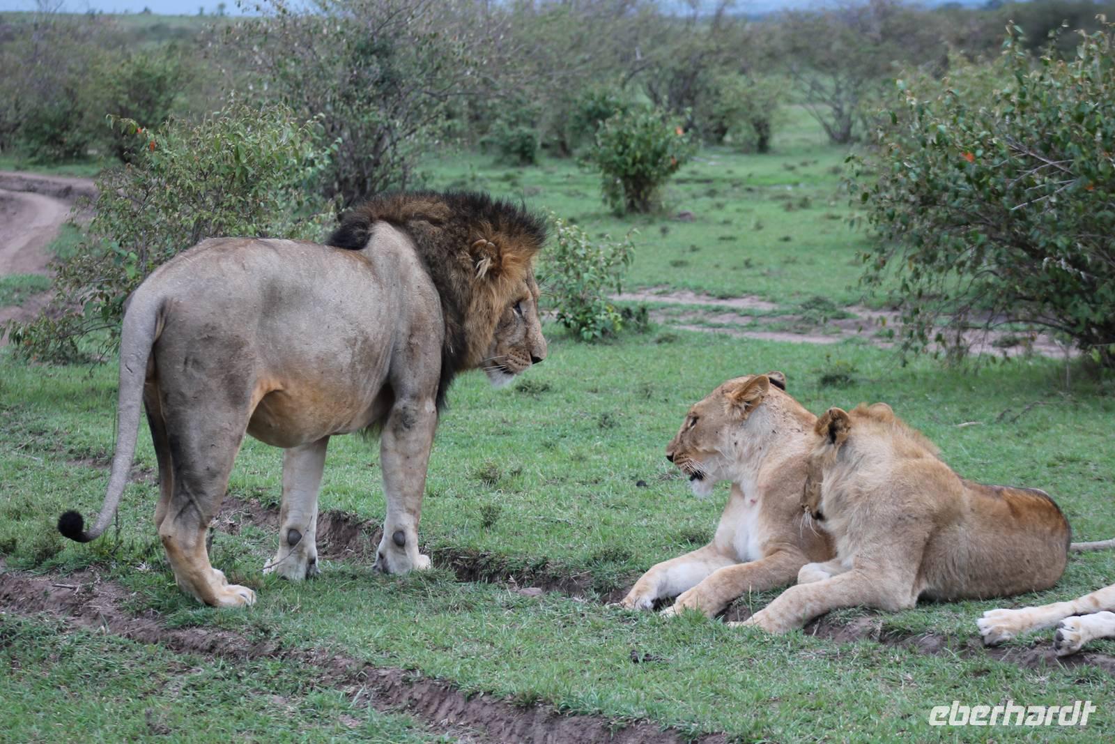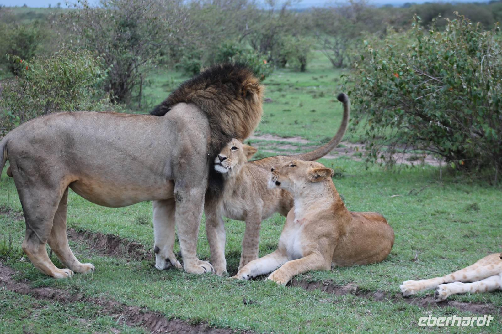 Am Nachmittag erreichen wir endlich unser Camp und werden schon von den netten Angestellten und den Massai, die uns hier bedienen, erwartet. Das Mara Bush Camp ist mitten im Nationalpark gelegen und direkt am Mara-Fluss und ist nicht eingezäunt. Wir übernachten in komfortablen Zelten, die uns aber alles bieten, was wir benötigen. Ein klein bisschen mulmig ist uns aber doch schon, als wir einige Krokodile am Fluss sehen und auch viele Hippospuren direkt vor unseren Zelten. Trotzdem freuen wir uns auf die nächsten Tage, denn Afrika ist ja auch ein Abenteuer. Nach einem späten Mittagessen unternehmen wir unsere erste Pirsch im Nationalpark. Kaum zu glauben was wir hier innerhalb von einer Stunde alles sehen: Ein Hippo direkt am Eingang des Camps, viele Topis, einige Hippos im Fluss, Hyänen, Graureiher und plötzlich zwei wunderschöne Geparden unter einem Busch, die wohl gerade gefressen haben und sich nun zur Ruhe gelegt haben. Unglaublich wunderschöne Tiere. Nur kurze Zeit später erwartet uns eine Löwenfamilie, als hätte sich diese für uns dorthin gelegt. Wir sehen einen Löwenvater sowie eine Löwenmutter mit ihren drei Kindern und kommen diesen nah wie nie. So können wir das Treiben aus nächster Nähe beobachten und es scheint, als würden die Fotos, die wir hier schießen von einer Postkarte stammen. Später kommt noch der Onkel der Bande hinzu und wir können ihn beim Trinken beobachten. Wir können unser Glück kaum fassen und könnten hier noch ewig verweilen. Es bleibt dabei zu bemerken, dass wir nur kurz über eine Stunde im Park unterwegs waren. Am Abend kommen wir wieder zurück und genießen nach einer Dusche unser abendliches Dinner mit allerlei Köstlichkeiten. Verhungern müssen wir hier wirklich nicht. Da wir ja in einem nicht eingezäunten Gebiet mitten im Busch wohnen hat ein jeder seinen eigenen Askari, ein Massai, der uns sicher zu unserem Zelt bringt und auch wieder abholt. So fühlen wir uns schon ein wenig sicherer. Die Geräusche in der Nacht hören wir natürlich trotzdem, aber am nächsten Morgen stellt sich raus, dass auch hier wieder alle TRAVEL Gäste überlebt haben.