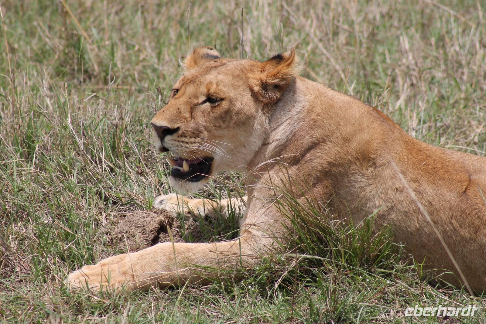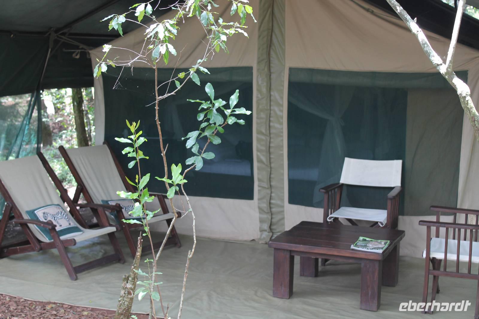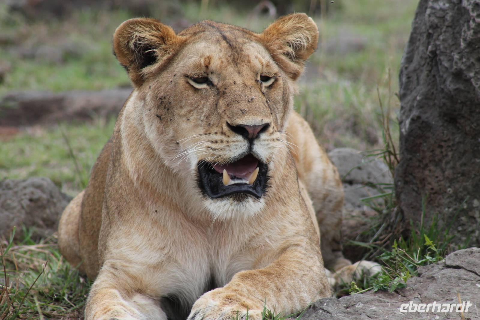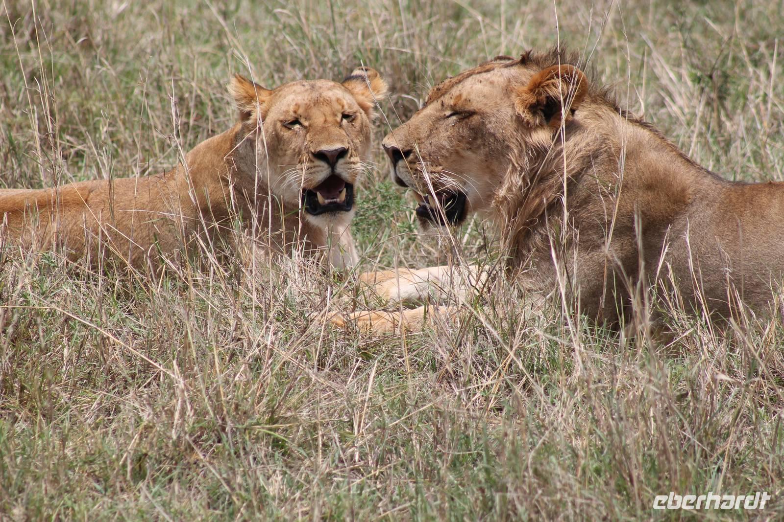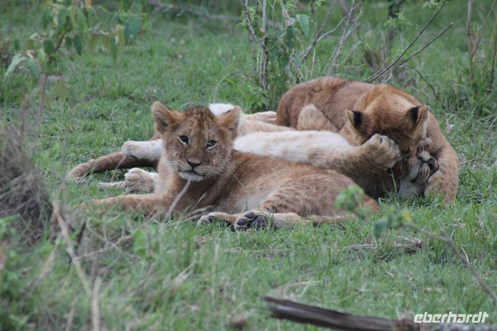Am Nachmittag erreichen wir endlich unser Camp und werden schon von den netten Angestellten und den Massai, die uns hier bedienen, erwartet. Das Mara Bush Camp ist mitten im Nationalpark gelegen und direkt am Mara-Fluss und ist nicht eingezäunt. Wir übernachten in komfortablen Zelten, die uns aber alles bieten, was wir benötigen. Ein klein bisschen mulmig ist uns aber doch schon, als wir einige Krokodile am Fluss sehen und auch viele Hippospuren direkt vor unseren Zelten. Trotzdem freuen wir uns auf die nächsten Tage, denn Afrika ist ja auch ein Abenteuer. Nach einem späten Mittagessen unternehmen wir unsere erste Pirsch im Nationalpark. Kaum zu glauben was wir hier innerhalb von einer Stunde alles sehen: Ein Hippo direkt am Eingang des Camps, viele Topis, einige Hippos im Fluss, Hyänen, Graureiher und plötzlich zwei wunderschöne Geparden unter einem Busch, die wohl gerade gefressen haben und sich nun zur Ruhe gelegt haben. Unglaublich wunderschöne Tiere. Nur kurze Zeit später erwartet uns eine Löwenfamilie, als hätte sich diese für uns dorthin gelegt. Wir sehen einen Löwenvater sowie eine Löwenmutter mit ihren drei Kindern und kommen diesen nah wie nie. So können wir das Treiben aus nächster Nähe beobachten und es scheint, als würden die Fotos, die wir hier schießen von einer Postkarte stammen. Später kommt noch der Onkel der Bande hinzu und wir können ihn beim Trinken beobachten. Wir können unser Glück kaum fassen und könnten hier noch ewig verweilen. Es bleibt dabei zu bemerken, dass wir nur kurz über eine Stunde im Park unterwegs waren. Am Abend kommen wir wieder zurück und genießen nach einer Dusche unser abendliches Dinner mit allerlei Köstlichkeiten. Verhungern müssen wir hier wirklich nicht. Da wir ja in einem nicht eingezäunten Gebiet mitten im Busch wohnen hat ein jeder seinen eigenen Askari, ein Massai, der uns sicher zu unserem Zelt bringt und auch wieder abholt. So fühlen wir uns schon ein wenig sicherer. Die Geräusche in der Nacht hören wir natürlich trotzdem, aber am nächsten Morgen stellt sich raus, dass auch hier wieder alle TRAVEL Gäste überlebt haben.