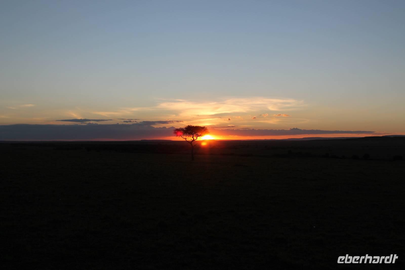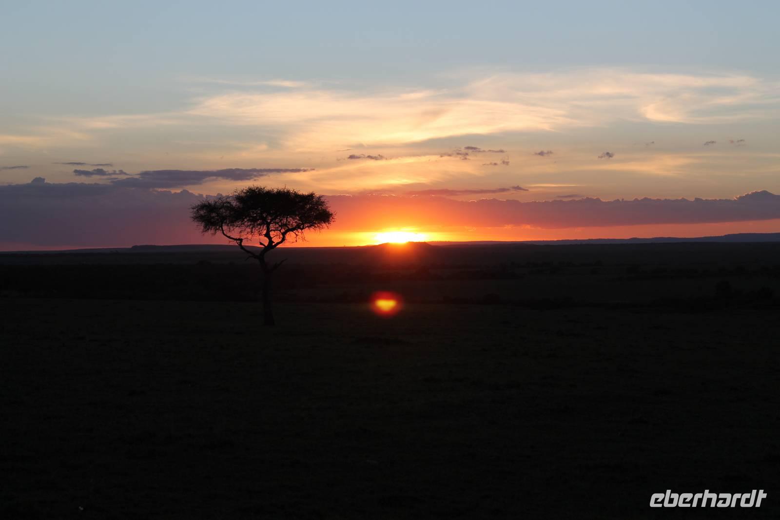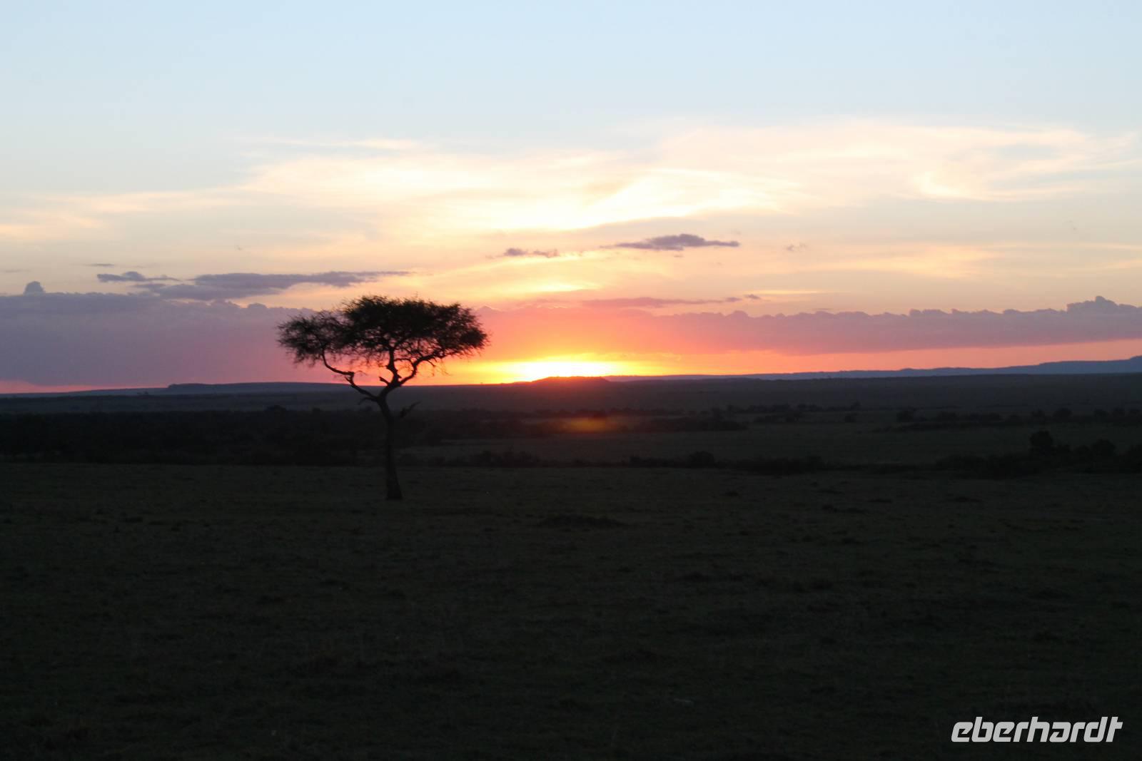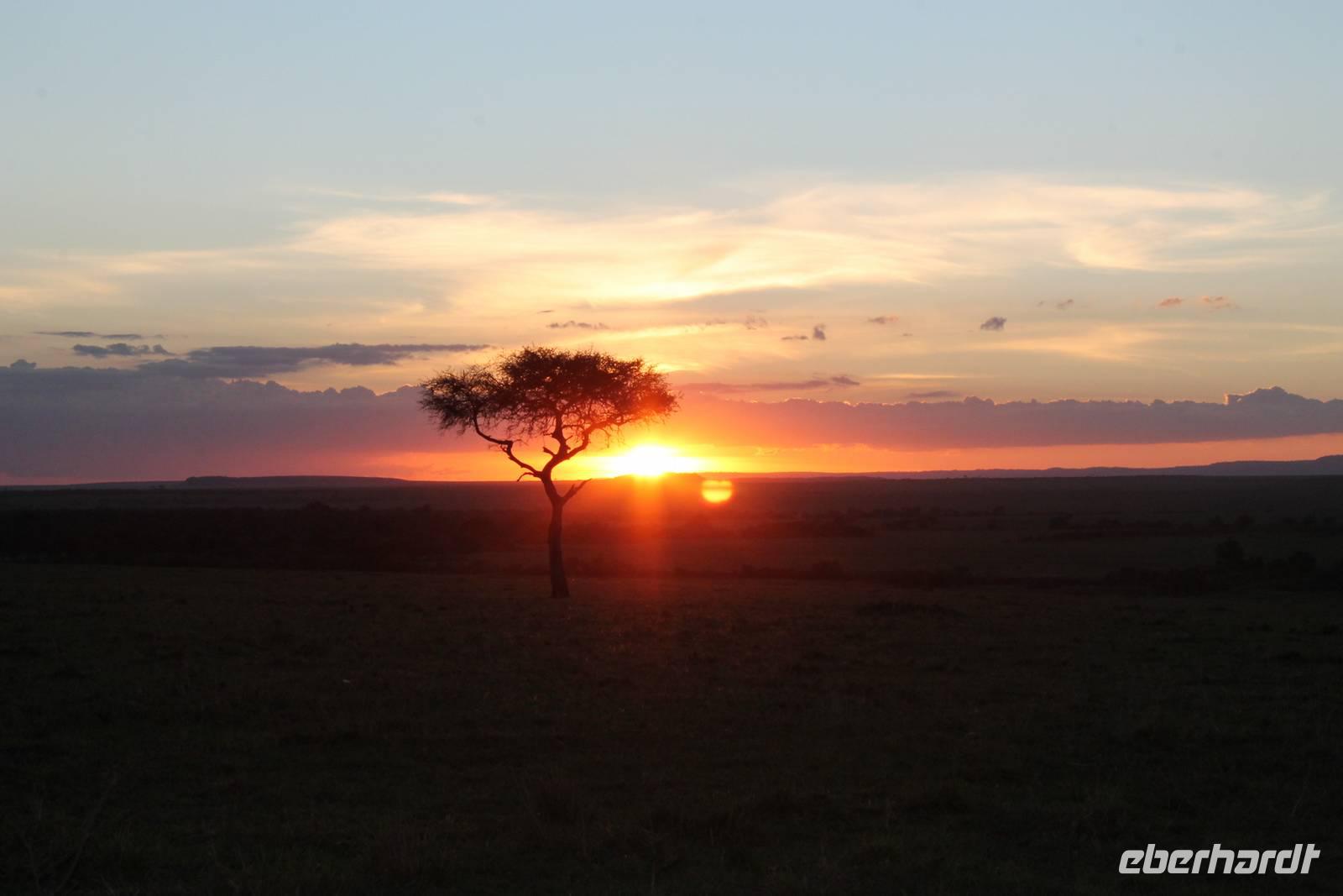 Heute gehen wir auf eine zweite morgendliche Pirschfahrt und sehen einige Büffel, zwei Agamas, die sich in der Sonne rekeln und viele Warzenschweine. Davon hat es uns eines besonders angetan, weil es so gemütlich vor seinem Bau sitz. Ein tolles Fotomotiv. Am Vormittag besuchen wir heute eine Masai-Schule und erfahren wie die Kinder hier unterrichtet werden. Wir dürfen sogar einen Blick in die Klassenräume werden und live beim Unterricht dabei sein. Natürlich fällt uns hier gleich der Unterschied zu Europa auf, der hier schon gravierend ist. Hier fehlt es an allen Ecken und Enden. Wir erfahren auch, dass die Kinder am Tag zwei Kilometer zur Schule laufen müssen und dabei nicht selten auch gefährliche Gebiete mit Raubkatzen durchqueren. So lassen wir es uns natürlich nicht nehmen, über das Mara Bush Camp, welches die Schule unterstützt, entsprechende Spenden dazulassen. Vicky spendet eine Schuluniform für ein Mädchen, dessen Eltern sich diese nicht leisten können. Da die Kinder hier auch dringend auf Schatten angewiesen sind, planzt ein jeder mit uns einen Baum als Zeichen unserer Dankbarkeit. Jeder bekommt einen Schüler als Paten zugteilt und später ein Diplom, welches er zu Hause als Erinnerung aufbewahren kann. In jedem Fall eine tolle Sache. Einige Gästen haben auch Schulsachen und Stifte von zu Hause mitgebracht, die hier dankend angenommen werden. Nach unserem Mittagessen unternehmen wir heute einen kleinen Spaziergang entlang des Mara Bush Camps und kommen zu einem fantastischen Hippo Pool, an dem wir heute eine Weile verweilen. Ein Askari begleitet uns und erklärt uns auch einiges über die Pflanzenwelt hier. Am Nachmittag besuchen wir heute noch ein Masai-Dorf. Die Massai, Maasai, Maassai oder Masai sind eine ostafrikanische Volksgruppe, die in den weiten Ebenen im Süden Kenias sowie im Norden Tansanias beheimatet ist. Trotz ihres vergleichsweise kleinen Bevölkerungsanteils sind die Massai wegen ihrer weitgehend beibehaltenen halbnomadischen Lebensweise, ihrer auffallenden Kleidung und ihres Wohngebietes nahe den Nationalparks die vermutlich bekannteste Volksgruppe Ostafrikas. Schon am Eingang des Dorfes werden wir lautstark empfangen. Im Dorf angekommen, erfahren wir alles Wissenswerte über die Massai und lernen auch deren Behausung und Traditionen kennen. Etwas gewöhnunsbedürftig ist das fremde Leben für uns schon. Die Hütte (Enkaji) der Massai besteht aus getrocknetem Kuhdung, mehrere Hütten einer Familie bilden ein Enkang. Es gibt viele Zeremonien. Sehr bekannt ist das springende Tanzen der Männer. Die jungen Massai, Morani, springen dabei auf der Stelle so hoch wie möglich und beweisen so ihre Stärke. Natürlich dürfen auch wir an diesem Schauspiel teilhaben und auch einige von uns versuchen sich als Massai, können aber bei Weitem nicht so hoch springen :-). In der Dämmerung verabschieden wir heute die wunderschöne Masai Mara mit einem wundervollen Sonnenuntergang und bekommen dabei auch eine schöne Schirmakazie auf unser Foto. Ein tolles Bild, was wir sicher auch noch lange in Erinnerung behalten.