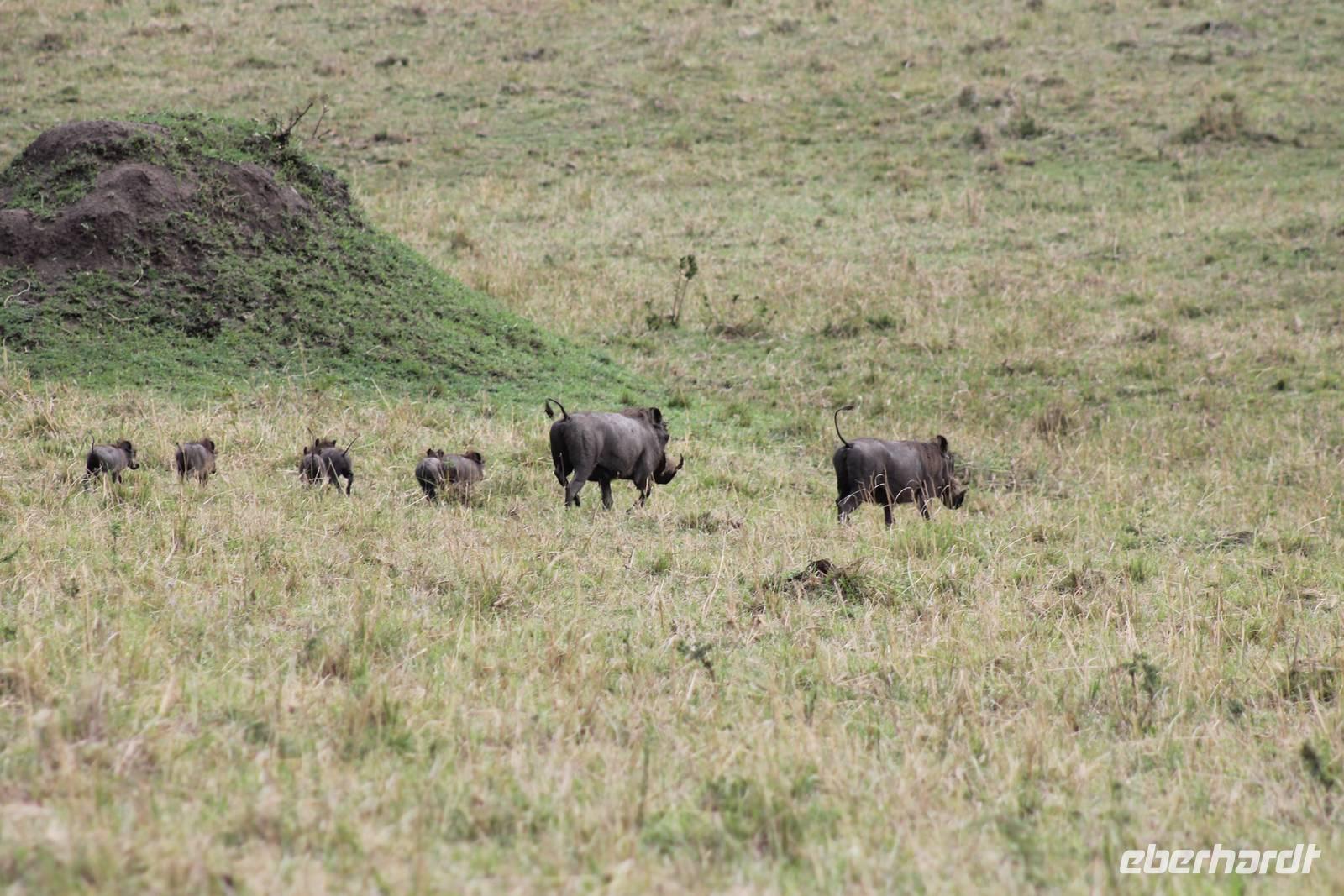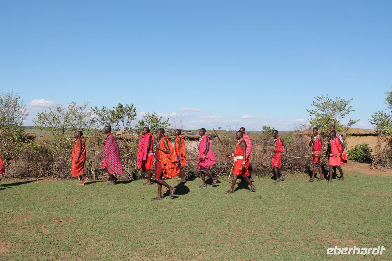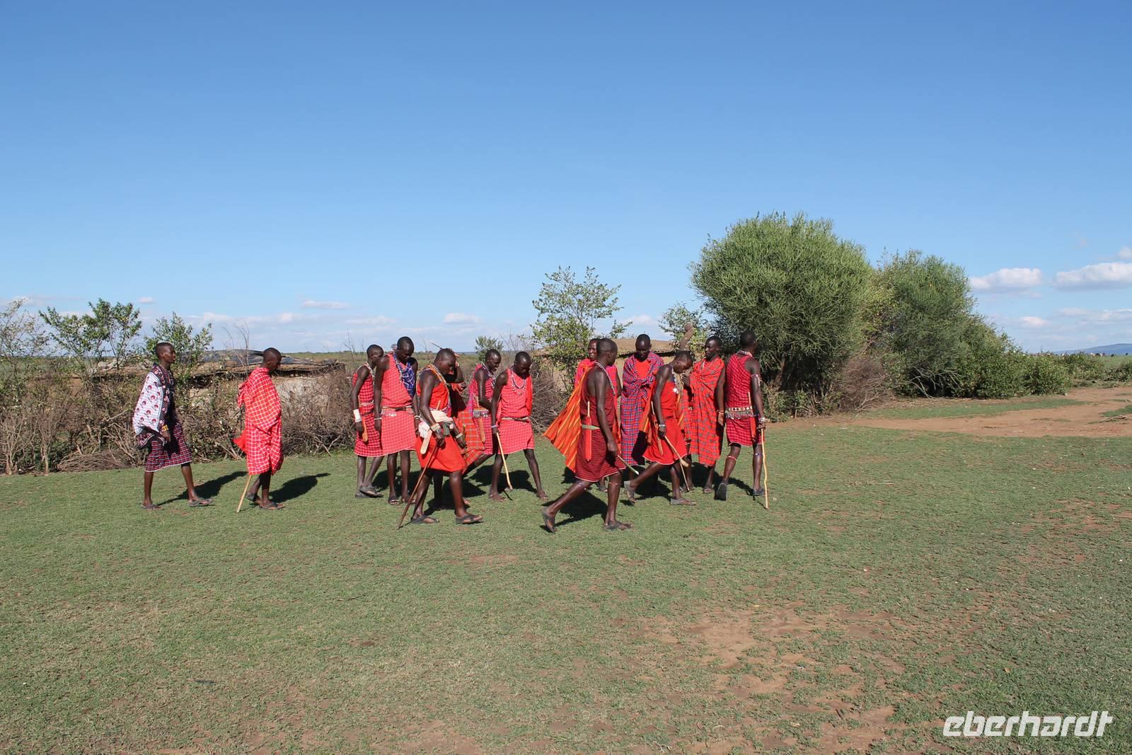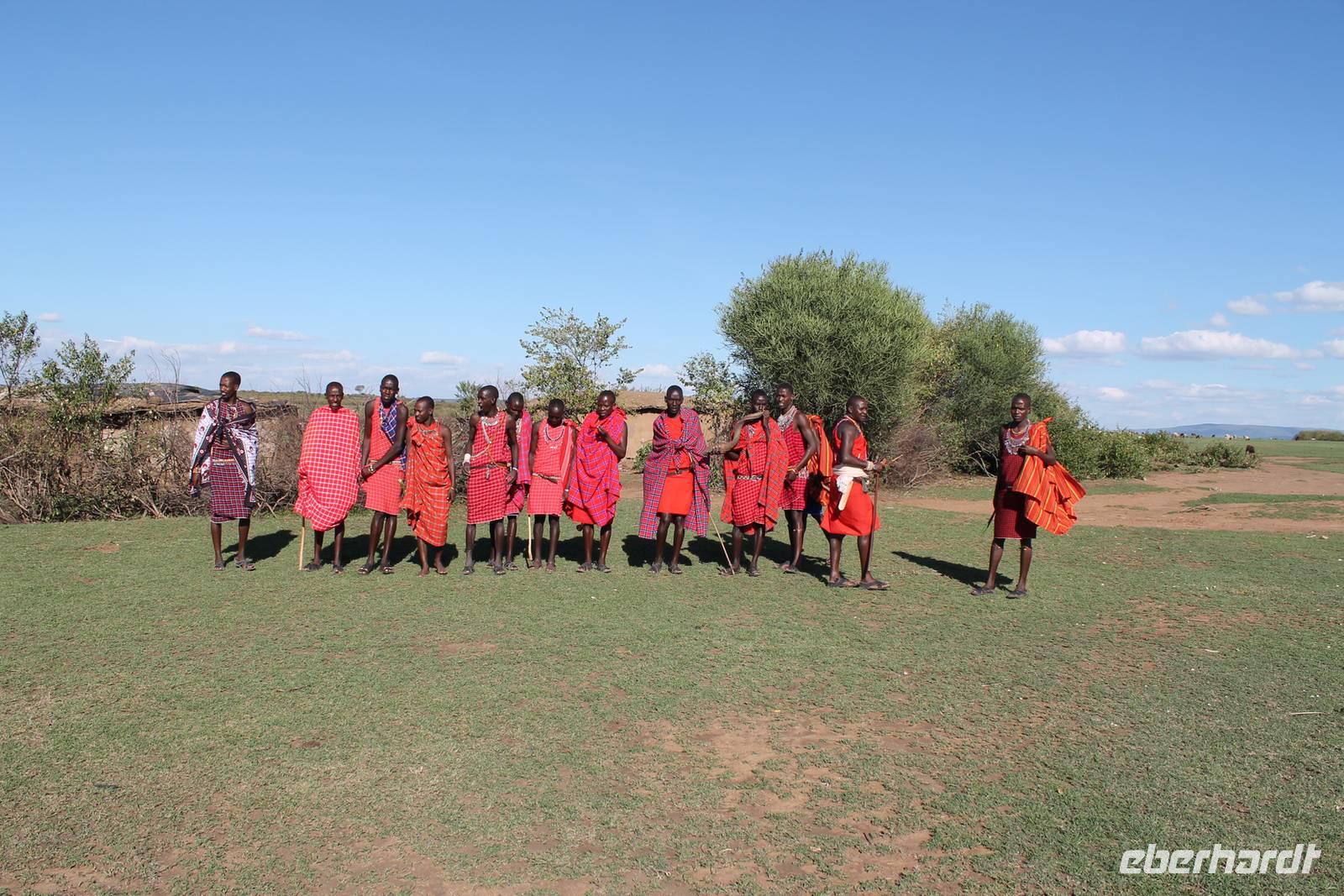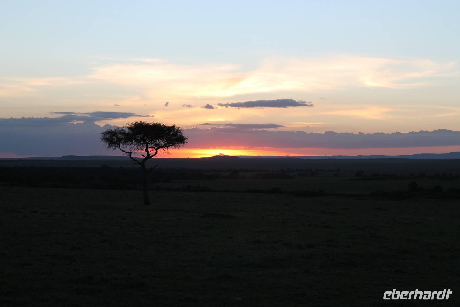 Heute gehen wir auf eine zweite morgendliche Pirschfahrt und sehen einige Büffel, zwei Agamas, die sich in der Sonne rekeln und viele Warzenschweine. Davon hat es uns eines besonders angetan, weil es so gemütlich vor seinem Bau sitz. Ein tolles Fotomotiv. Am Vormittag besuchen wir heute eine Masai-Schule und erfahren wie die Kinder hier unterrichtet werden. Wir dürfen sogar einen Blick in die Klassenräume werden und live beim Unterricht dabei sein. Natürlich fällt uns hier gleich der Unterschied zu Europa auf, der hier schon gravierend ist. Hier fehlt es an allen Ecken und Enden. Wir erfahren auch, dass die Kinder am Tag zwei Kilometer zur Schule laufen müssen und dabei nicht selten auch gefährliche Gebiete mit Raubkatzen durchqueren. So lassen wir es uns natürlich nicht nehmen, über das Mara Bush Camp, welches die Schule unterstützt, entsprechende Spenden dazulassen. Vicky spendet eine Schuluniform für ein Mädchen, dessen Eltern sich diese nicht leisten können. Da die Kinder hier auch dringend auf Schatten angewiesen sind, planzt ein jeder mit uns einen Baum als Zeichen unserer Dankbarkeit. Jeder bekommt einen Schüler als Paten zugteilt und später ein Diplom, welches er zu Hause als Erinnerung aufbewahren kann. In jedem Fall eine tolle Sache. Einige Gästen haben auch Schulsachen und Stifte von zu Hause mitgebracht, die hier dankend angenommen werden. Nach unserem Mittagessen unternehmen wir heute einen kleinen Spaziergang entlang des Mara Bush Camps und kommen zu einem fantastischen Hippo Pool, an dem wir heute eine Weile verweilen. Ein Askari begleitet uns und erklärt uns auch einiges über die Pflanzenwelt hier. Am Nachmittag besuchen wir heute noch ein Masai-Dorf. Die Massai, Maasai, Maassai oder Masai sind eine ostafrikanische Volksgruppe, die in den weiten Ebenen im Süden Kenias sowie im Norden Tansanias beheimatet ist. Trotz ihres vergleichsweise kleinen Bevölkerungsanteils sind die Massai wegen ihrer weitgehend beibehaltenen halbnomadischen Lebensweise, ihrer auffallenden Kleidung und ihres Wohngebietes nahe den Nationalparks die vermutlich bekannteste Volksgruppe Ostafrikas. Schon am Eingang des Dorfes werden wir lautstark empfangen. Im Dorf angekommen, erfahren wir alles Wissenswerte über die Massai und lernen auch deren Behausung und Traditionen kennen. Etwas gewöhnunsbedürftig ist das fremde Leben für uns schon. Die Hütte (Enkaji) der Massai besteht aus getrocknetem Kuhdung, mehrere Hütten einer Familie bilden ein Enkang. Es gibt viele Zeremonien. Sehr bekannt ist das springende Tanzen der Männer. Die jungen Massai, Morani, springen dabei auf der Stelle so hoch wie möglich und beweisen so ihre Stärke. Natürlich dürfen auch wir an diesem Schauspiel teilhaben und auch einige von uns versuchen sich als Massai, können aber bei Weitem nicht so hoch springen :-). In der Dämmerung verabschieden wir heute die wunderschöne Masai Mara mit einem wundervollen Sonnenuntergang und bekommen dabei auch eine schöne Schirmakazie auf unser Foto. Ein tolles Bild, was wir sicher auch noch lange in Erinnerung behalten.