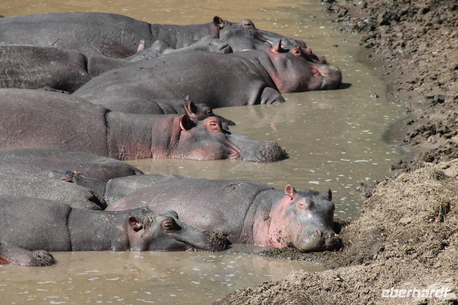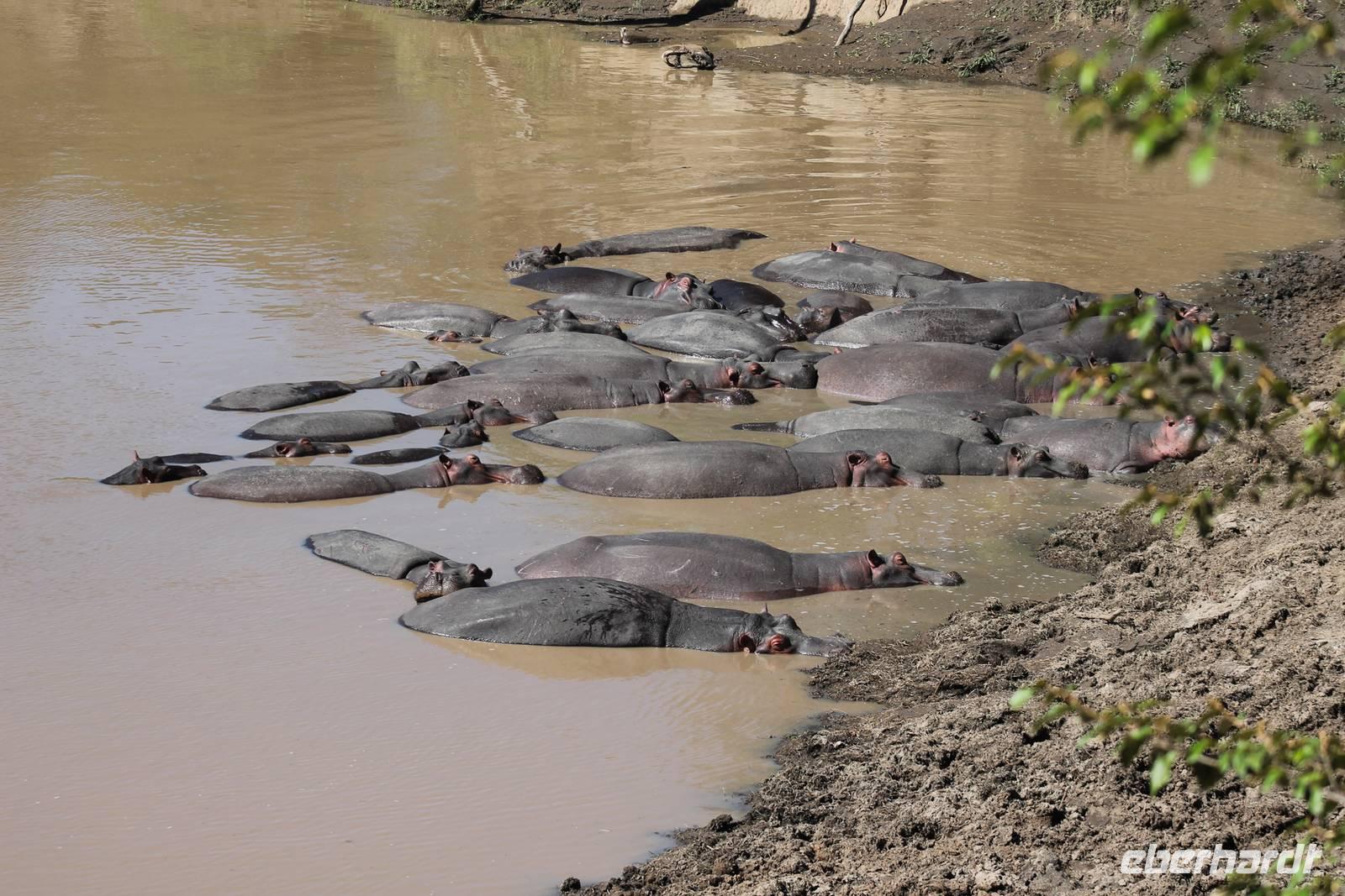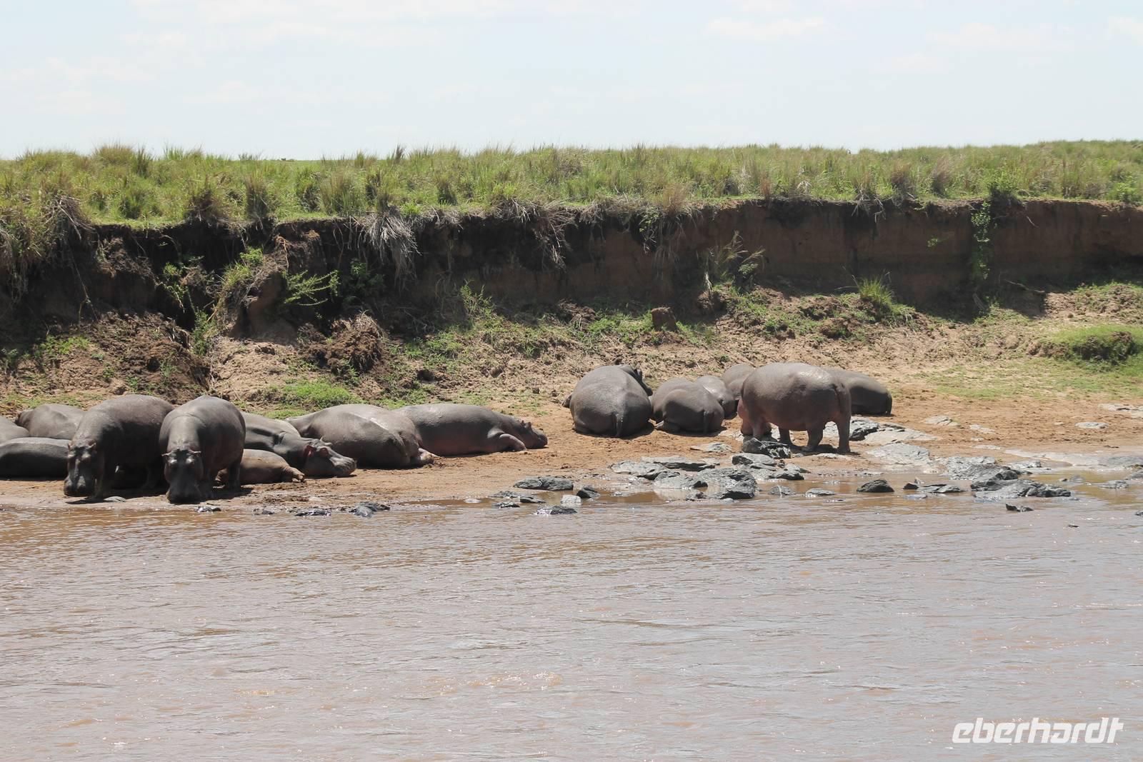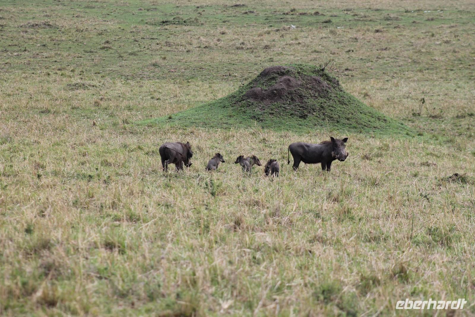 Heute gehen wir auf eine zweite morgendliche Pirschfahrt und sehen einige Büffel, zwei Agamas, die sich in der Sonne rekeln und viele Warzenschweine. Davon hat es uns eines besonders angetan, weil es so gemütlich vor seinem Bau sitz. Ein tolles Fotomotiv. Am Vormittag besuchen wir heute eine Masai-Schule und erfahren wie die Kinder hier unterrichtet werden. Wir dürfen sogar einen Blick in die Klassenräume werden und live beim Unterricht dabei sein. Natürlich fällt uns hier gleich der Unterschied zu Europa auf, der hier schon gravierend ist. Hier fehlt es an allen Ecken und Enden. Wir erfahren auch, dass die Kinder am Tag zwei Kilometer zur Schule laufen müssen und dabei nicht selten auch gefährliche Gebiete mit Raubkatzen durchqueren. So lassen wir es uns natürlich nicht nehmen, über das Mara Bush Camp, welches die Schule unterstützt, entsprechende Spenden dazulassen. Vicky spendet eine Schuluniform für ein Mädchen, dessen Eltern sich diese nicht leisten können. Da die Kinder hier auch dringend auf Schatten angewiesen sind, planzt ein jeder mit uns einen Baum als Zeichen unserer Dankbarkeit. Jeder bekommt einen Schüler als Paten zugteilt und später ein Diplom, welches er zu Hause als Erinnerung aufbewahren kann. In jedem Fall eine tolle Sache. Einige Gästen haben auch Schulsachen und Stifte von zu Hause mitgebracht, die hier dankend angenommen werden. Nach unserem Mittagessen unternehmen wir heute einen kleinen Spaziergang entlang des Mara Bush Camps und kommen zu einem fantastischen Hippo Pool, an dem wir heute eine Weile verweilen. Ein Askari begleitet uns und erklärt uns auch einiges über die Pflanzenwelt hier. Am Nachmittag besuchen wir heute noch ein Masai-Dorf. Die Massai, Maasai, Maassai oder Masai sind eine ostafrikanische Volksgruppe, die in den weiten Ebenen im Süden Kenias sowie im Norden Tansanias beheimatet ist. Trotz ihres vergleichsweise kleinen Bevölkerungsanteils sind die Massai wegen ihrer weitgehend beibehaltenen halbnomadischen Lebensweise, ihrer auffallenden Kleidung und ihres Wohngebietes nahe den Nationalparks die vermutlich bekannteste Volksgruppe Ostafrikas. Schon am Eingang des Dorfes werden wir lautstark empfangen. Im Dorf angekommen, erfahren wir alles Wissenswerte über die Massai und lernen auch deren Behausung und Traditionen kennen. Etwas gewöhnunsbedürftig ist das fremde Leben für uns schon. Die Hütte (Enkaji) der Massai besteht aus getrocknetem Kuhdung, mehrere Hütten einer Familie bilden ein Enkang. Es gibt viele Zeremonien. Sehr bekannt ist das springende Tanzen der Männer. Die jungen Massai, Morani, springen dabei auf der Stelle so hoch wie möglich und beweisen so ihre Stärke. Natürlich dürfen auch wir an diesem Schauspiel teilhaben und auch einige von uns versuchen sich als Massai, können aber bei Weitem nicht so hoch springen :-). In der Dämmerung verabschieden wir heute die wunderschöne Masai Mara mit einem wundervollen Sonnenuntergang und bekommen dabei auch eine schöne Schirmakazie auf unser Foto. Ein tolles Bild, was wir sicher auch noch lange in Erinnerung behalten.