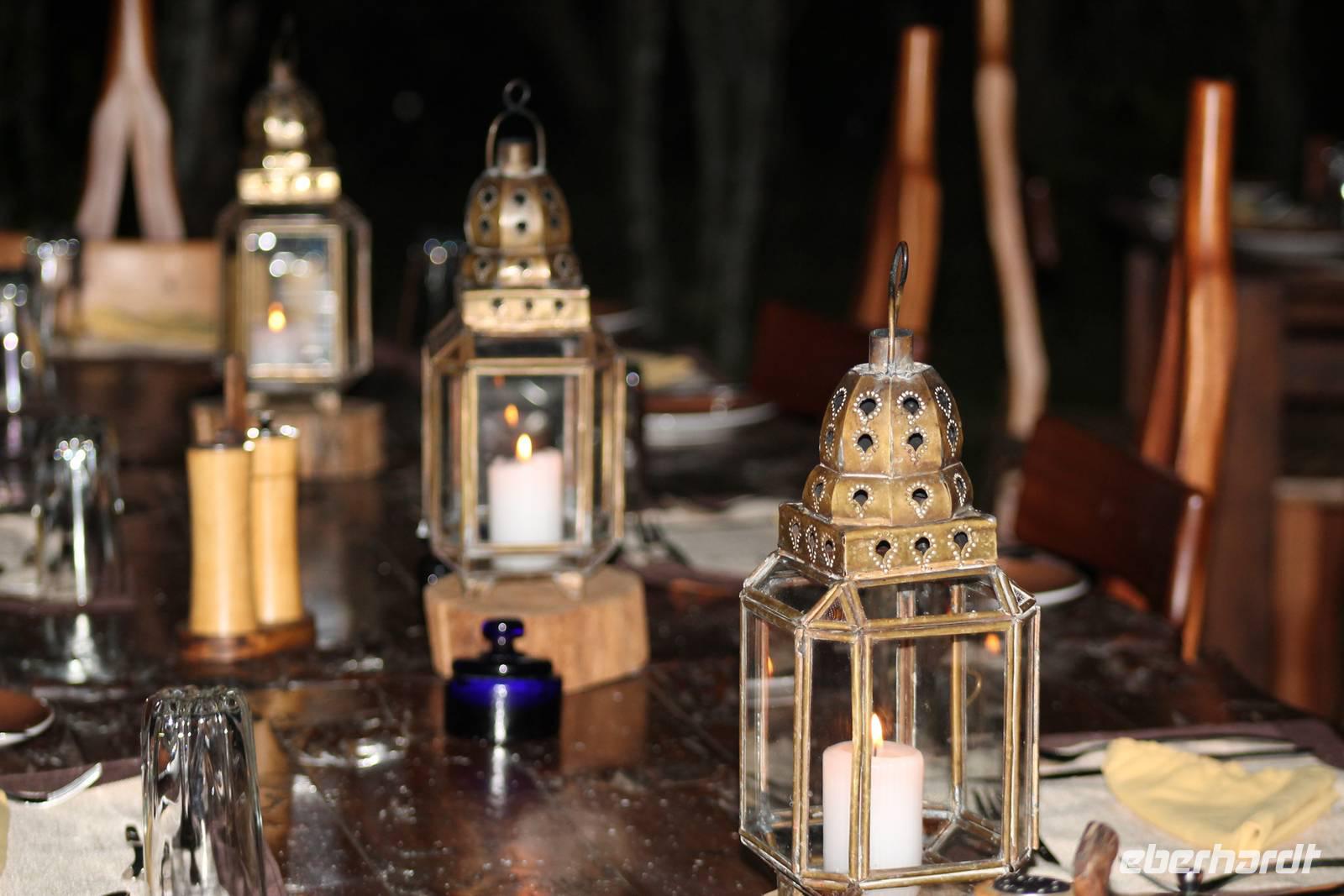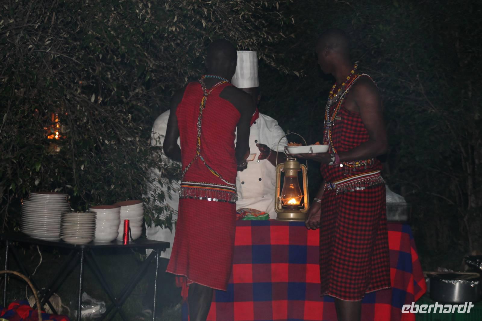 Am Abend erwartet uns noch eine Überraschung, denn wir speisen heute nicht wie gewöhnlich in unserem Camp, sondern das Team des Mara Bush Camps hat ein zauberhaftes Buschdinner unter Sternenhimmel für uns gezaubert. So genießen wir ein köstliches Barbecue mit allerlei Spezialitäten und das ein oder andere Glas Wein oder Bier unter dem kenianischem Sternenhimmel. Natürlich hören wir auch das ein oder andere Geräusch im Busch, was Vicky etwas beunruhigt aber wir haben ja unsere Askari, die auf uns aufpassen. So sitzen wir noch gemütlich zusammen und lassen den ereignisreichen Tag Revue passieren.