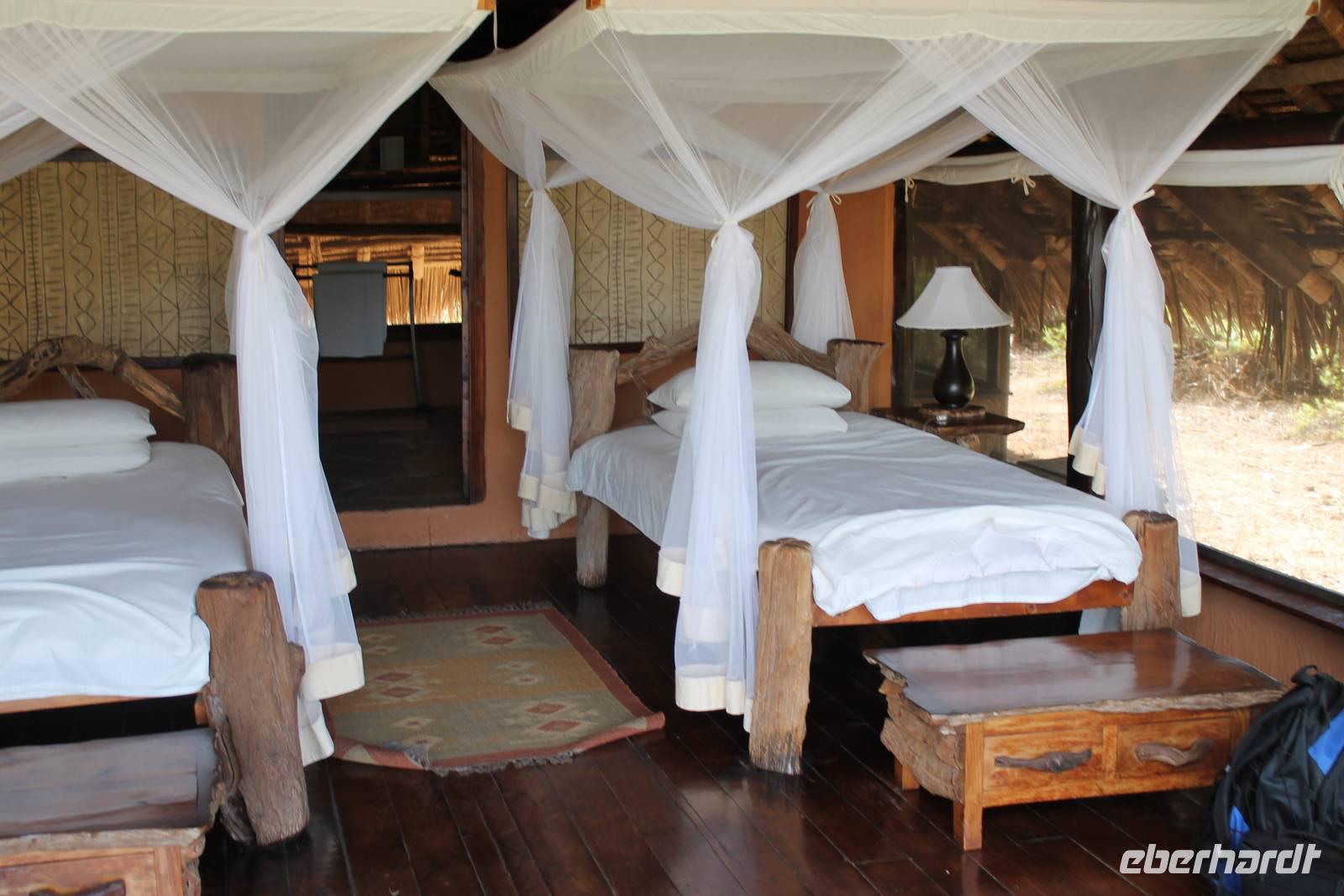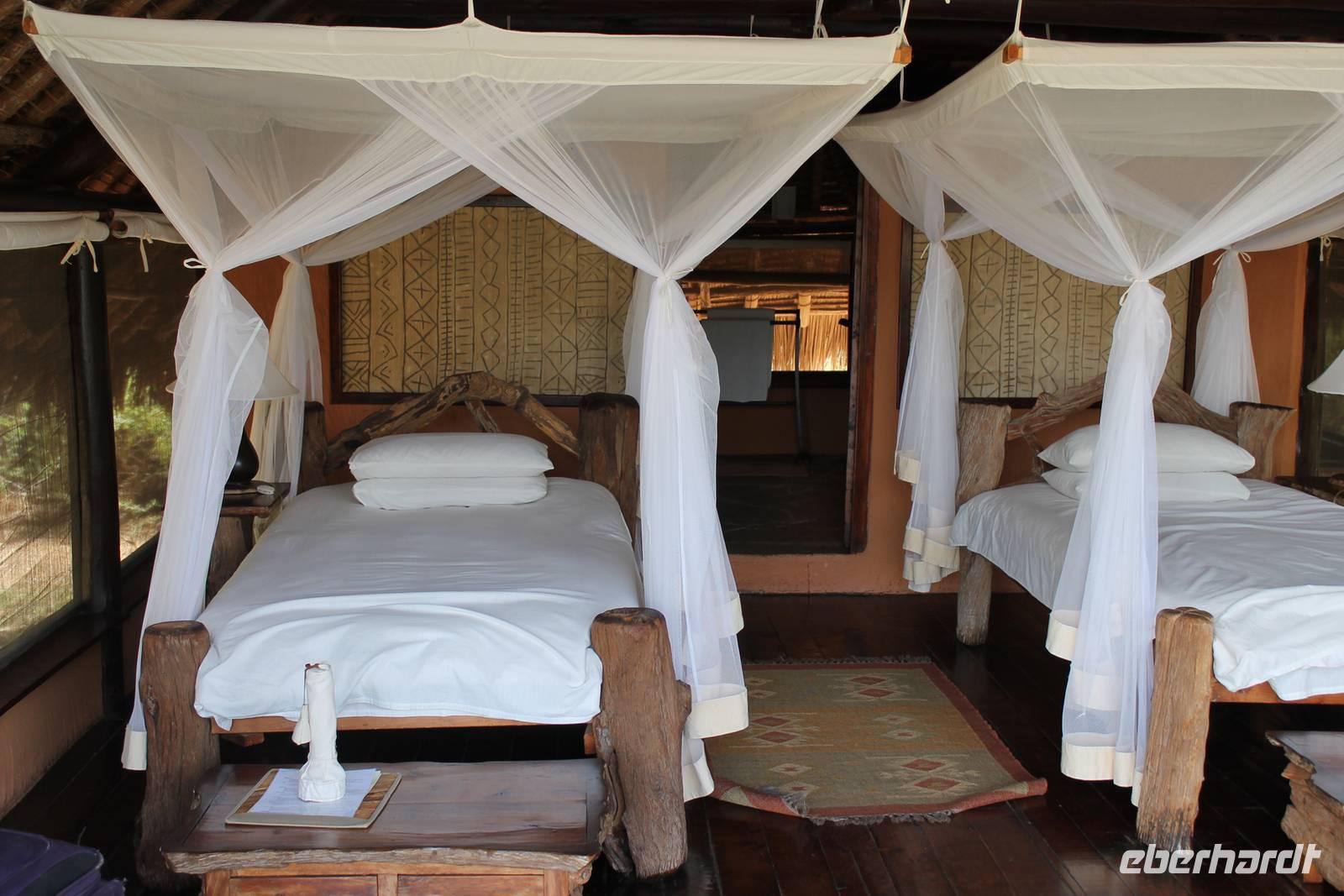 Ein toller Abschluss für einen tollen Safaritag. Am Abend kehren wir wieder zur unserer Lodge zurück und genießen nach einer heißen Dusche ein tolles Abendessen vom Buffet mit allerlei Köstlichkeiten. Mittlerweile ist es dunkel geworden und so sind wir nachts schon beruhigt, dass sich am Abend Nachtwächter um unsere Bungalows tummeln, die uns bewachen.