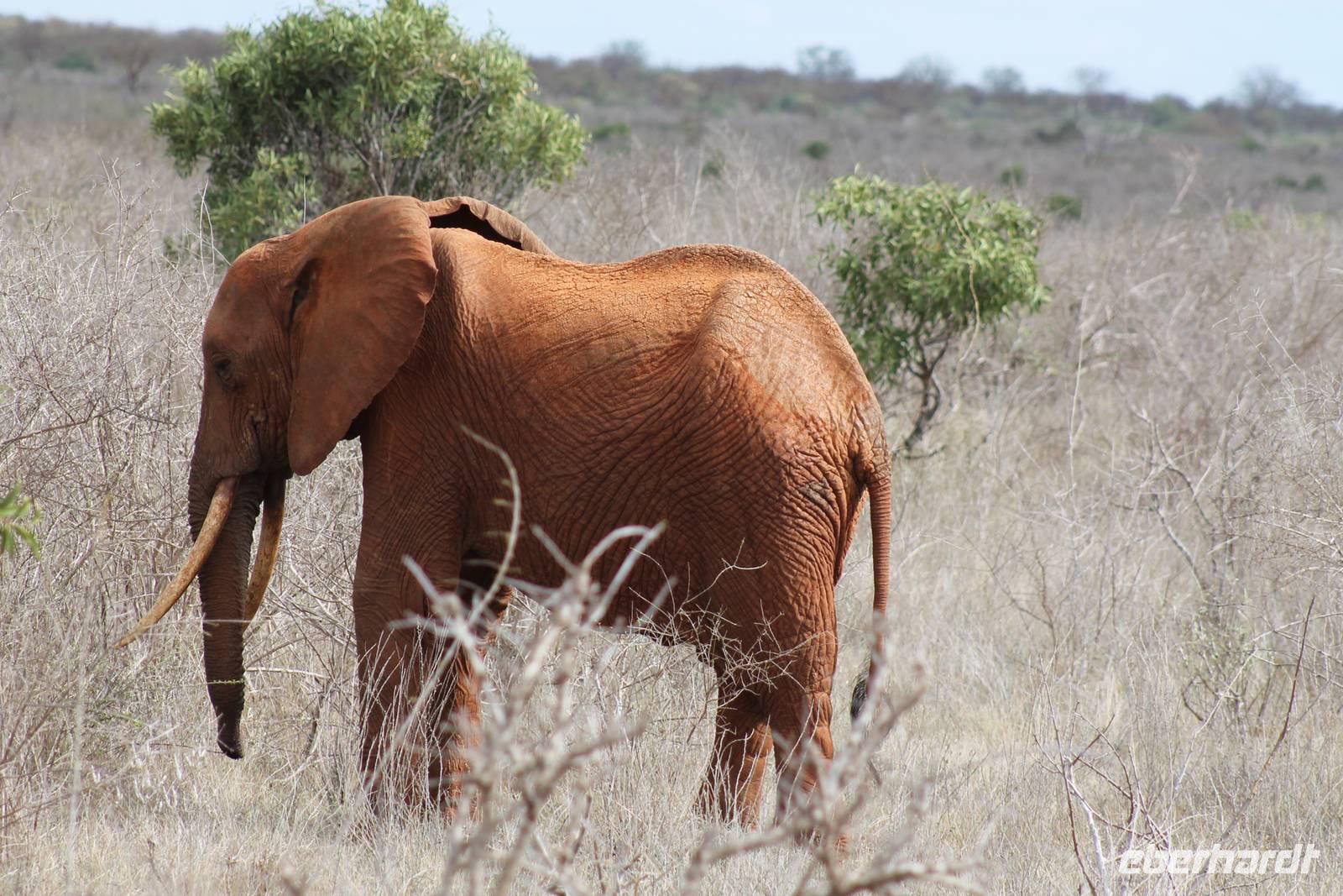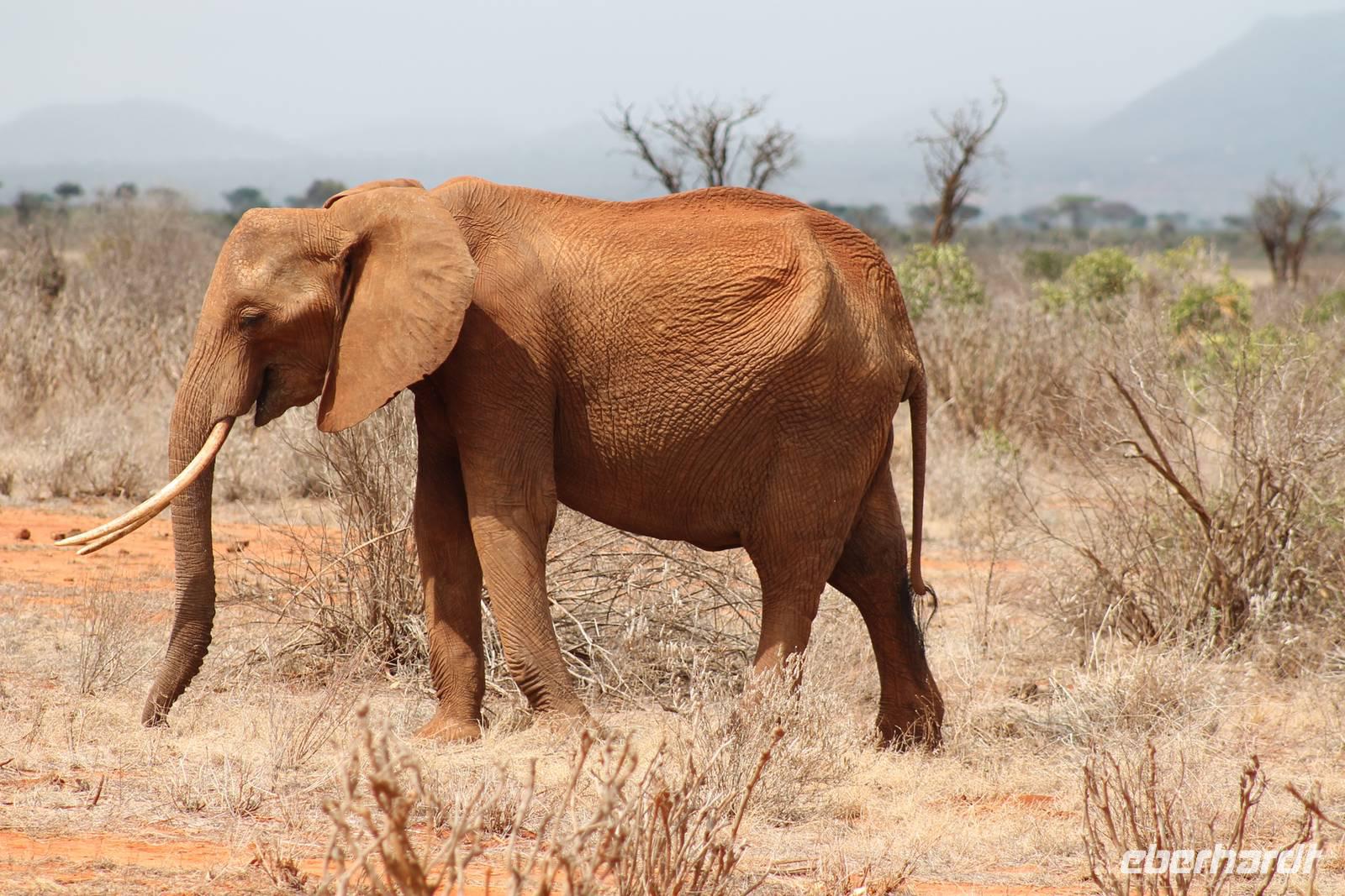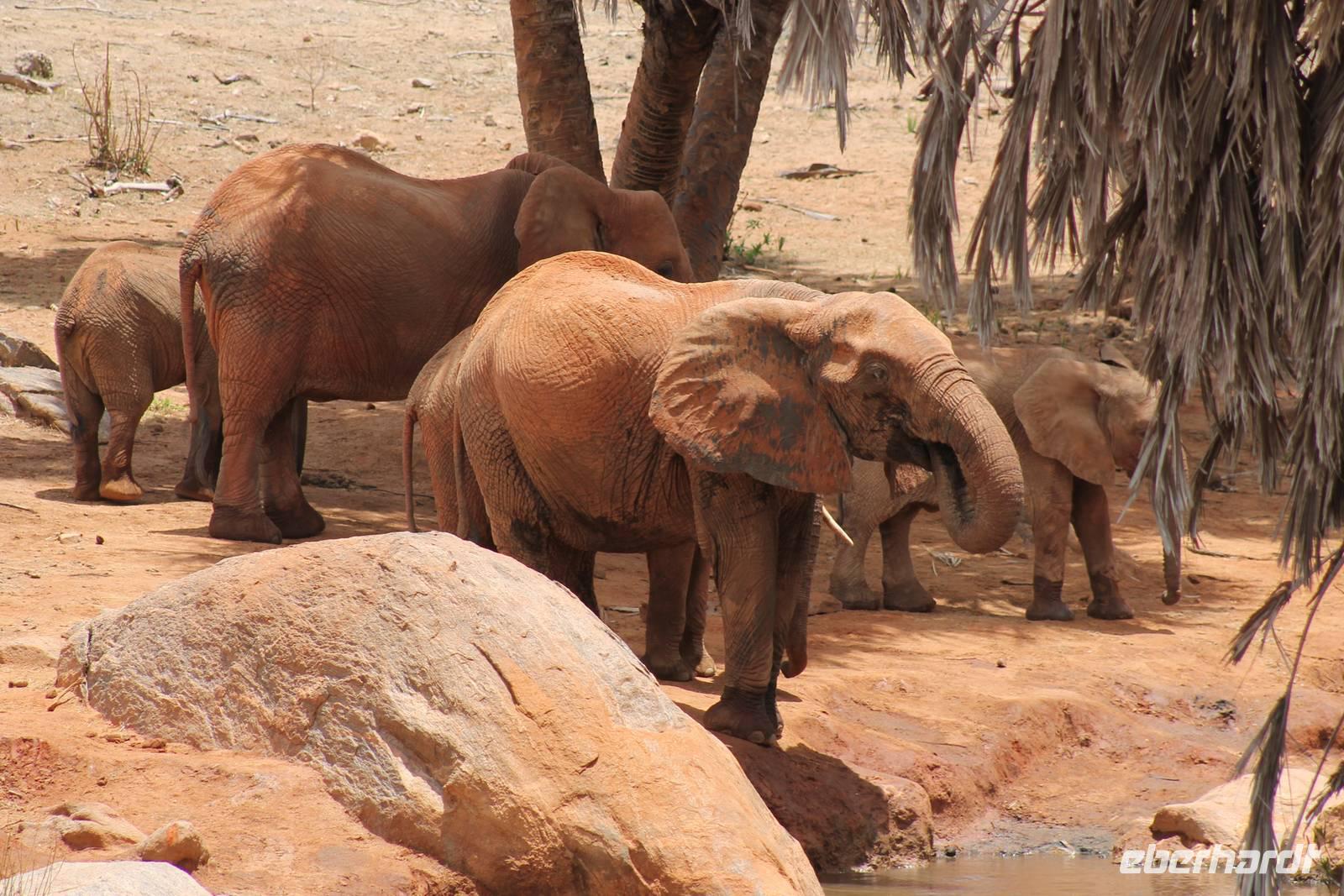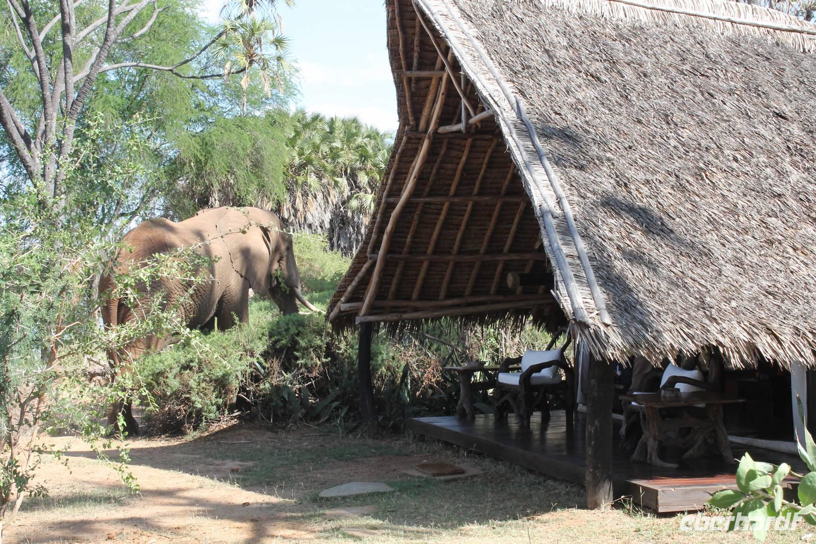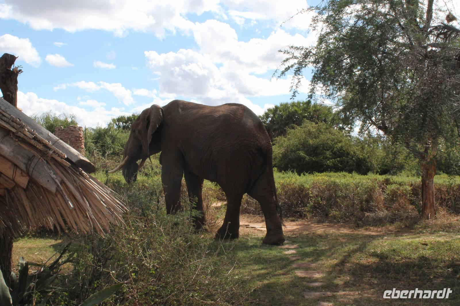 Natürlich werden wir den Amboseli Nationalpark heute nicht verlassen ohne die schneebedeckte Spitze des Kilimanjaros zu sehen. So haben wir heute doch noch einmal Glück und können einen unbedeckten Blick auf ihn erhaschen. Diesen nutzen wir natürlich gleich für ein Gruppenbild. Später bekommen wir auch noch das berühmte Bild mit der Elefantenherde vor dem Kilimanjaro auf die Linse und freuen uns darüber sehr. So fahren wir mit unseren sieben Sachen weiter zum Tsavo-Ost Nationalpark. Der Park zeichnet sich durch seine besondere Artenvielfalt an großen Tieren aus. Bekannt ist Tsavo vor allem für die große Elefantenpopulation (die größte in Kenia) und seine Löwen. Die „roten Elefanten vom Tsavo" verdanken ihrer Farbe der roten Erde im Nationalpark. Mit dieser pudern sie sich bei Staubbädern oder Schlammbädern ein. Gegen Mittag erreichen wir endlich unsere Luxuslodge "Galdessa", die sich wirklich als solche bezeichen kann. Sie ist direkt am Galana-Fluss gelegen. Vom Restaurant aus bietet sich Ihnen ein hervorragender Blick auf die umgebende Landschaft. Durch die 11 Bungalow-Zelte sind wir als Gruppe alleine in der Lodge und genießen dies in vollen Zügen. Zu unseren Zelten dürfen wir allerdings nur mit Begleitung gelangen, weil sich mehrere Elefanten auf dem Lodgegelände tummeln. Nach unserem Mittagessen bekommen wir dies auch selbst zu spüren, denn ein Elefant bahnt sich seinen Weg zwischen den Zelten und lässt sich beim Fressen nicht stören. Bei einer kleinen Siesta können wir auch das unglaubliche Treiben am Fluss beobachten. Mehrere Elefanten suchen sich Ihren Weg an das andere Ufer des Flusses. Ein tolles Schauspiel und so etwas will glaube ich jeder auch zu Hause haben. Dazu muss man nicht mehr ins Kino gehen. Nach so vielen Eindrücken treffen wir uns am Nachmittag wieder und unternehmen eine erste Pirsch im Nationalpark. Dabei sehen wir nicht nur die berühmten roten Elefanten sondern auch andere Tiere, die wir noch nicht so oft gesehen haben wie ein Dik Dik, eine wunderschöne Gabelrake, Rotschnabeltokos und Zwerfalken mit Beute. Wieder ein toller Tag für die Ornitologen aber auch für alle anderen. Am Abend genießen wir ein tolles Abendessen mit einem unvergleichen Blick auf der Terrasse der Lodge. In jedem Fall ein Höhepunkt der Reise und auch ein gebührender Abschluss.