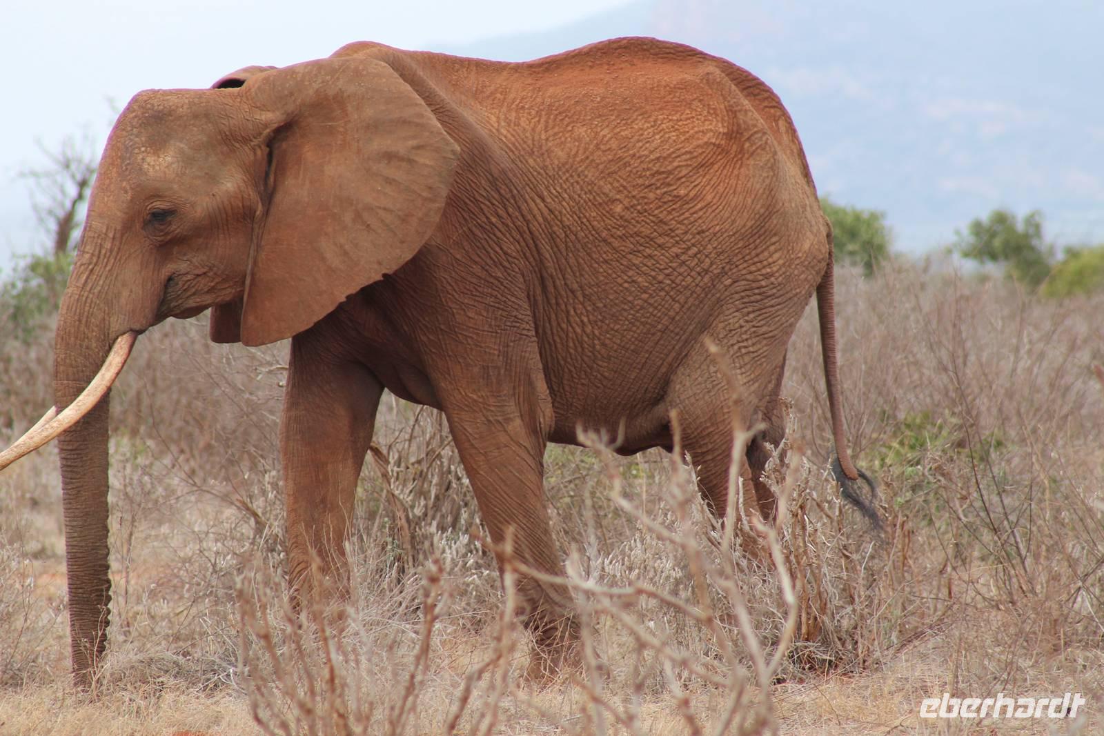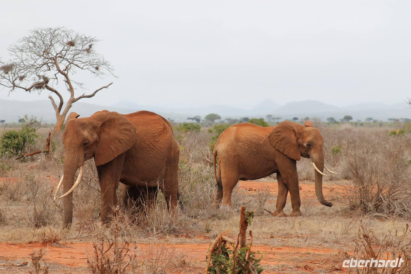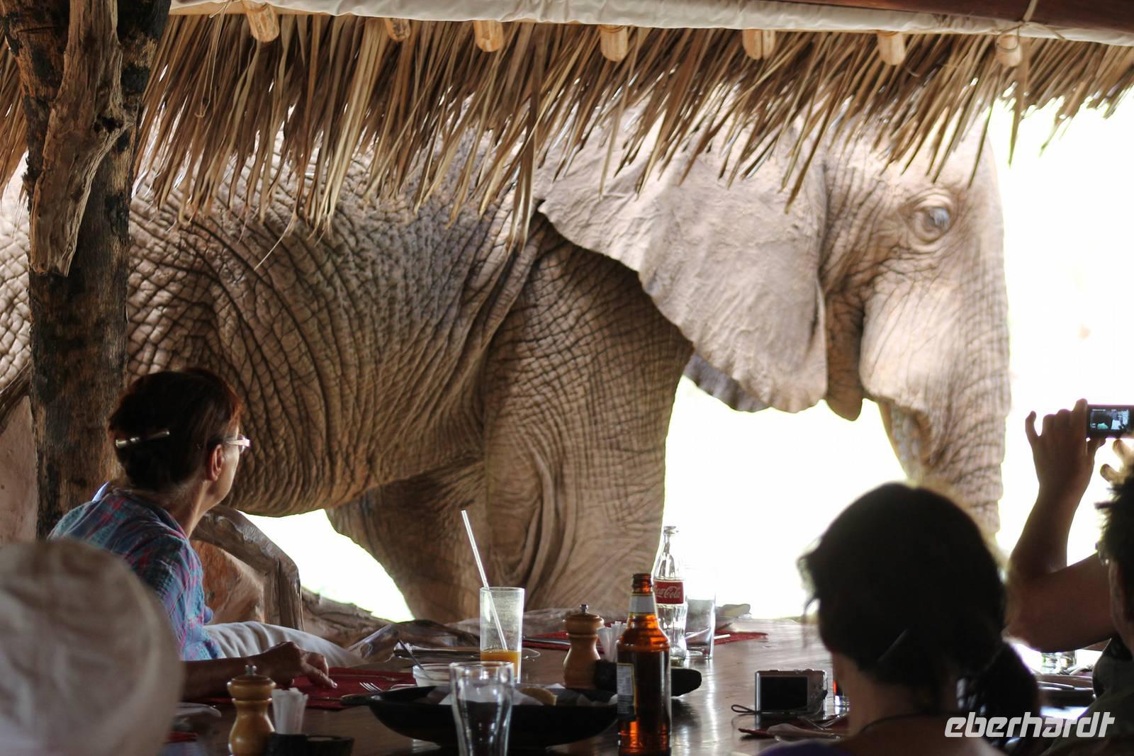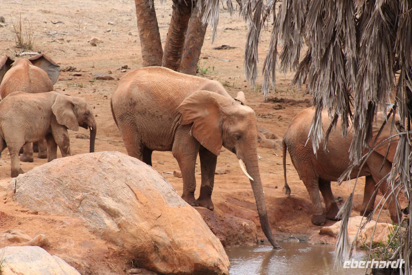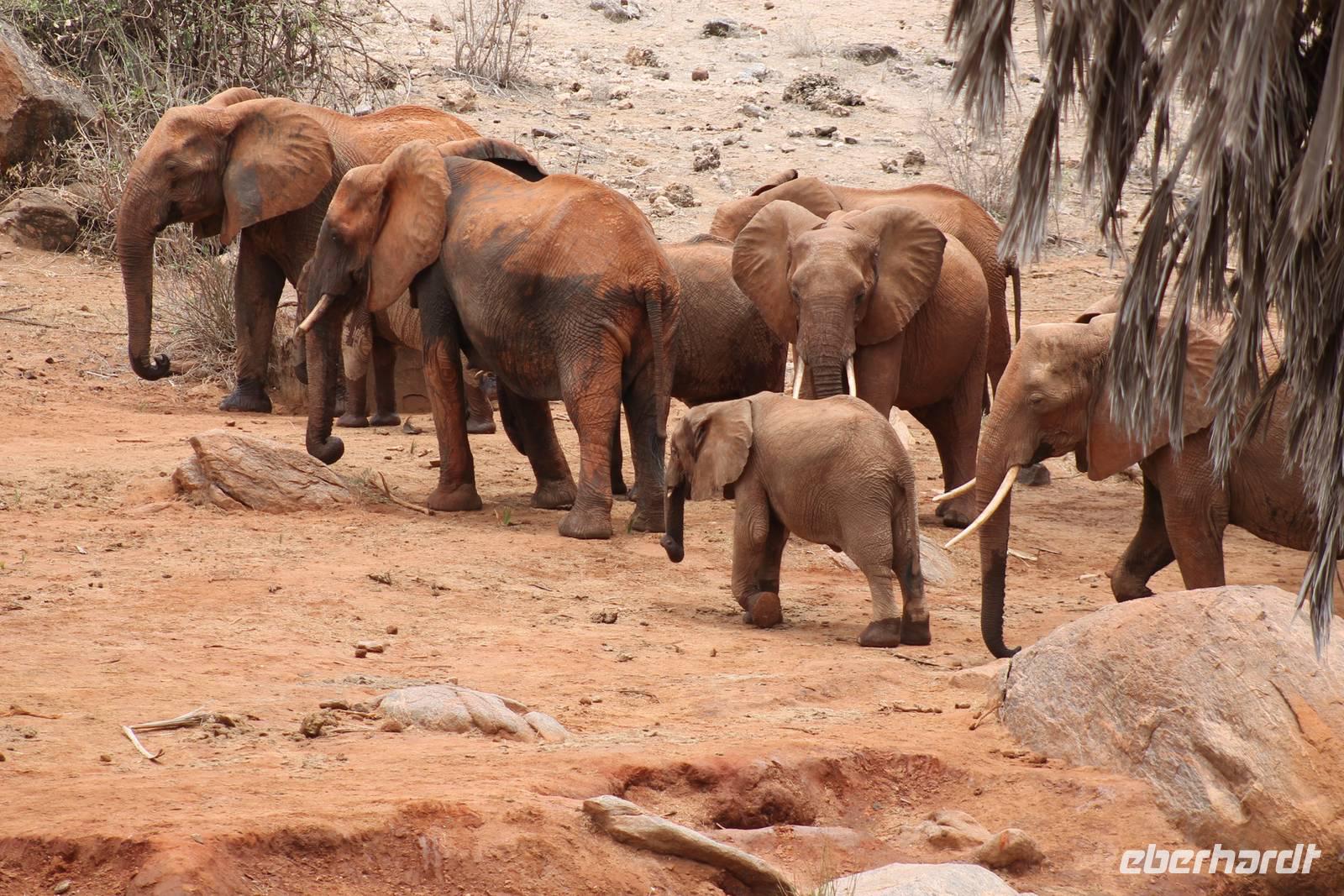 Natürlich werden wir den Amboseli Nationalpark heute nicht verlassen ohne die schneebedeckte Spitze des Kilimanjaros zu sehen. So haben wir heute doch noch einmal Glück und können einen unbedeckten Blick auf ihn erhaschen. Diesen nutzen wir natürlich gleich für ein Gruppenbild. Später bekommen wir auch noch das berühmte Bild mit der Elefantenherde vor dem Kilimanjaro auf die Linse und freuen uns darüber sehr. So fahren wir mit unseren sieben Sachen weiter zum Tsavo-Ost Nationalpark. Der Park zeichnet sich durch seine besondere Artenvielfalt an großen Tieren aus. Bekannt ist Tsavo vor allem für die große Elefantenpopulation (die größte in Kenia) und seine Löwen. Die „roten Elefanten vom Tsavo" verdanken ihrer Farbe der roten Erde im Nationalpark. Mit dieser pudern sie sich bei Staubbädern oder Schlammbädern ein. Gegen Mittag erreichen wir endlich unsere Luxuslodge "Galdessa", die sich wirklich als solche bezeichen kann. Sie ist direkt am Galana-Fluss gelegen. Vom Restaurant aus bietet sich Ihnen ein hervorragender Blick auf die umgebende Landschaft. Durch die 11 Bungalow-Zelte sind wir als Gruppe alleine in der Lodge und genießen dies in vollen Zügen. Zu unseren Zelten dürfen wir allerdings nur mit Begleitung gelangen, weil sich mehrere Elefanten auf dem Lodgegelände tummeln. Nach unserem Mittagessen bekommen wir dies auch selbst zu spüren, denn ein Elefant bahnt sich seinen Weg zwischen den Zelten und lässt sich beim Fressen nicht stören. Bei einer kleinen Siesta können wir auch das unglaubliche Treiben am Fluss beobachten. Mehrere Elefanten suchen sich Ihren Weg an das andere Ufer des Flusses. Ein tolles Schauspiel und so etwas will glaube ich jeder auch zu Hause haben. Dazu muss man nicht mehr ins Kino gehen. Nach so vielen Eindrücken treffen wir uns am Nachmittag wieder und unternehmen eine erste Pirsch im Nationalpark. Dabei sehen wir nicht nur die berühmten roten Elefanten sondern auch andere Tiere, die wir noch nicht so oft gesehen haben wie ein Dik Dik, eine wunderschöne Gabelrake, Rotschnabeltokos und Zwerfalken mit Beute. Wieder ein toller Tag für die Ornitologen aber auch für alle anderen. Am Abend genießen wir ein tolles Abendessen mit einem unvergleichen Blick auf der Terrasse der Lodge. In jedem Fall ein Höhepunkt der Reise und auch ein gebührender Abschluss.