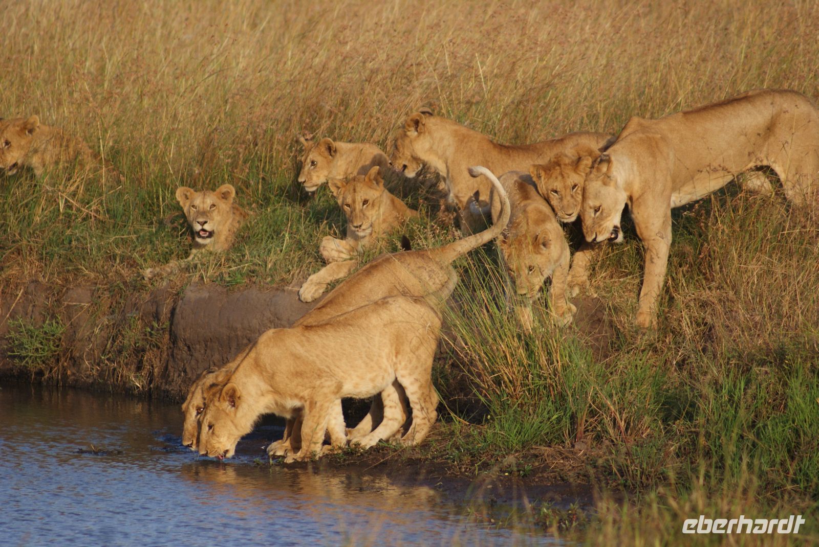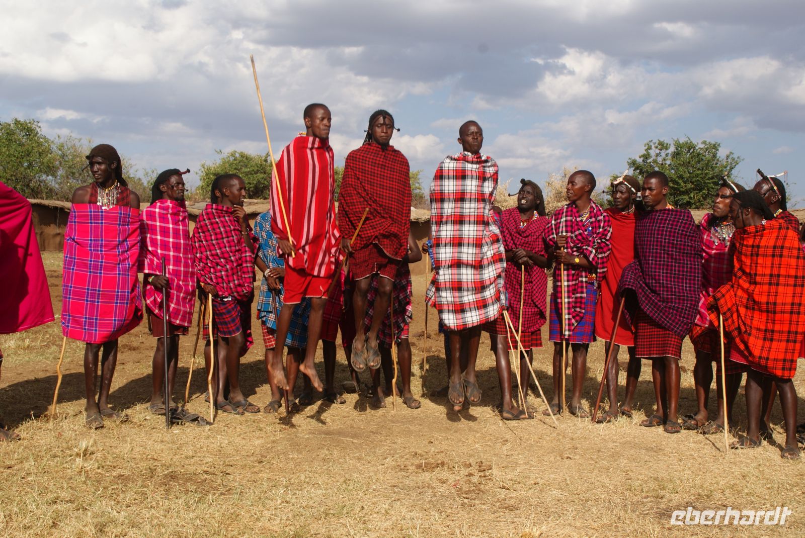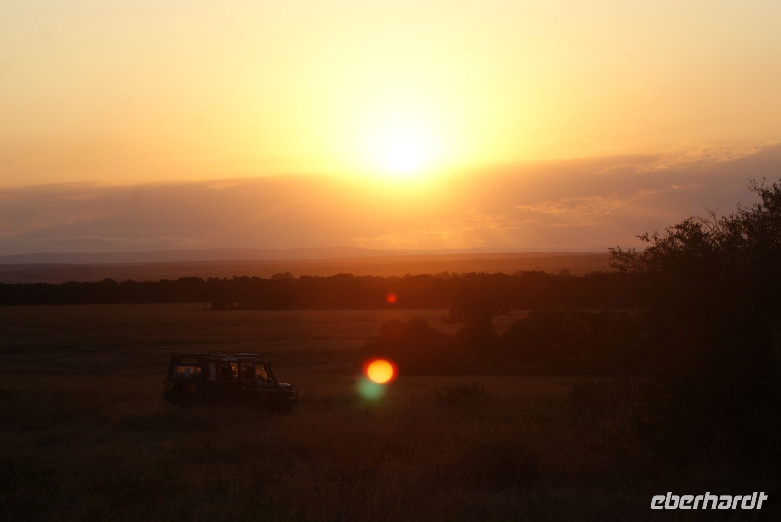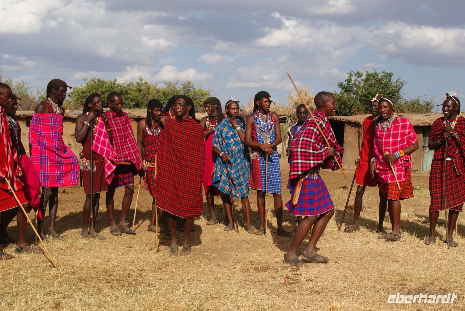 Mit so manchen Tiergeräuschen haben wir die Nacht gut verbracht und brechen schon am frühen Morgen in die Masai Mara auf. Sofort werden wir belohnt und treffen auf ein Löwenrudel, sehen Mütter mit drei Jungtieren, die uns verzücken. Kurz darauf ebenfalls ein Männchen mit prächtiger Mähne, dazu der Sonnenaufgang im Hintergrund, schöner können wir es uns nicht vorstellen. Nochmals suchen wir uns ein schönes Plätzchen unter einer Schirmakazie und frühstücken nochmals unter freiem Himmel mit Blick in die uns umrundende Natur. So verbringen wir einen wunderbaren Vormittag mit weiteren Tiersichtungen zu denen Geier und Marabus an einem Kadaverrest gehören, sowie Giraffen, Elefanten, Fischadler und tausende Gnus und Zebras auf der nicht enden wollenden Savanne Afrikas. Ein Traum für jeden Tierfreund, der dies einmal hautnah erleben möchte. Mittags kehren wir zurück ins Camp, wo exklusiv für uns ein Buffet mit Showkoch bereitgestellt ist. Einfach köstlich und ein super toller Service, da alles für uns frisch und nach unseren Wünschen zubereitet wird. Am Nachmittag treffen wir uns erneut, um ein in der Nähe gelegenes Masai Dorf zu besuchen. Wir fahren zunächst in das benachbarte Dorf außerhalb des Reservats und kaufen in einem Dorfladen Stifte und Schulhefte für die Masai Kinder, da uns Guide Caleb von Süßigkeiten, etc. abgeraten hat. Da diese schlecht für Zähne sind und nur Müll produzieren, entscheiden wir uns für ein nützliches Mitbringsel. Nach Ankunft im Masai Dorf werden wir von Guide Dickson in Empfang genommen sowie 40 weiteren Dorfmitgliedern begrüßt und mit zwei Liedern der Masaifrauen willkommen heißen. Danach tanzen die Masai Krieger für uns und zeigen ihre enorme Sprungkraft. Anschließend demonstriert man uns, wie ohne moderne Hilfsmittel mit Reibung und verschiedenen Hölzern, dazu Elefantendung, Feuer gemacht wird. Wer möchte, darf einen Blick in eine Masai Hütte werfen. Diese wird von den Frauen mit Kuhdung und Erde gefertigt. Innen angekommen, besteht diese aus drei Räumen. Elternschlafzimmer, Kinder-und Gästezimmer. In der Mitte der Kochbereich und ein kleines Fenster, dass dem Tageslicht und Rauchabzug dient. Wir staunen über die Kühle innerhalb, während es draußen recht heiß ist. Wir hören, dass das Dorf 250 Personen fasst, es 46 Häuser gibt, in denen 46 Frauen, deren Kinder und teilweise auch deren Ehemänner anwesend sind. Ein Masai Mann kann bis zu 11 Frauen heiraten, wenn er für jede Frau 10 Kühe aufbringt… Das Leben findet tagsüber eher außerhalb der Hütten statt und abends wird zur Sicherheit das Vieh in den Kral, also in das Innere der Community getrieben. Abschließend verteilen wir unsere Gaben an die sich brav aufreihenden Kinder, für die wir sicherlich mit unseren Geschenken ebenfalls eine Attraktion sind. Wir verlassen die Masai und kehren zurück in die Masai Mara. Hier erleben wir abschließend noch ein unvergessliches Erlebnis: Ein großes Rudel Löwen mit mehr als dreißzig Tieren findet sich auf einem Hügel ein und wir befinden uns mittendrin. Ein herrlicher Anblick, den Jungtieren beim Herumtollen zuzuschauen und die große Freude zu sehen, als Frau Mama hinzustieß. Einfach unglaublich, diese Vielzahl an Löwen auf einer Stelle zu finden. Am Abend erleben wir ein Bushdinner und werden zu einem Platz außerhalb des Camps gebracht. Es erfolgt ein Abendessen unterm Himmelszelt mit Lagerfeuer, Musikant und nächtlicher Atmosphäre. Über uns die Milchstraße und hunderte von Sterne. Geht es noch idyllischer? Schwer vorstellbar.