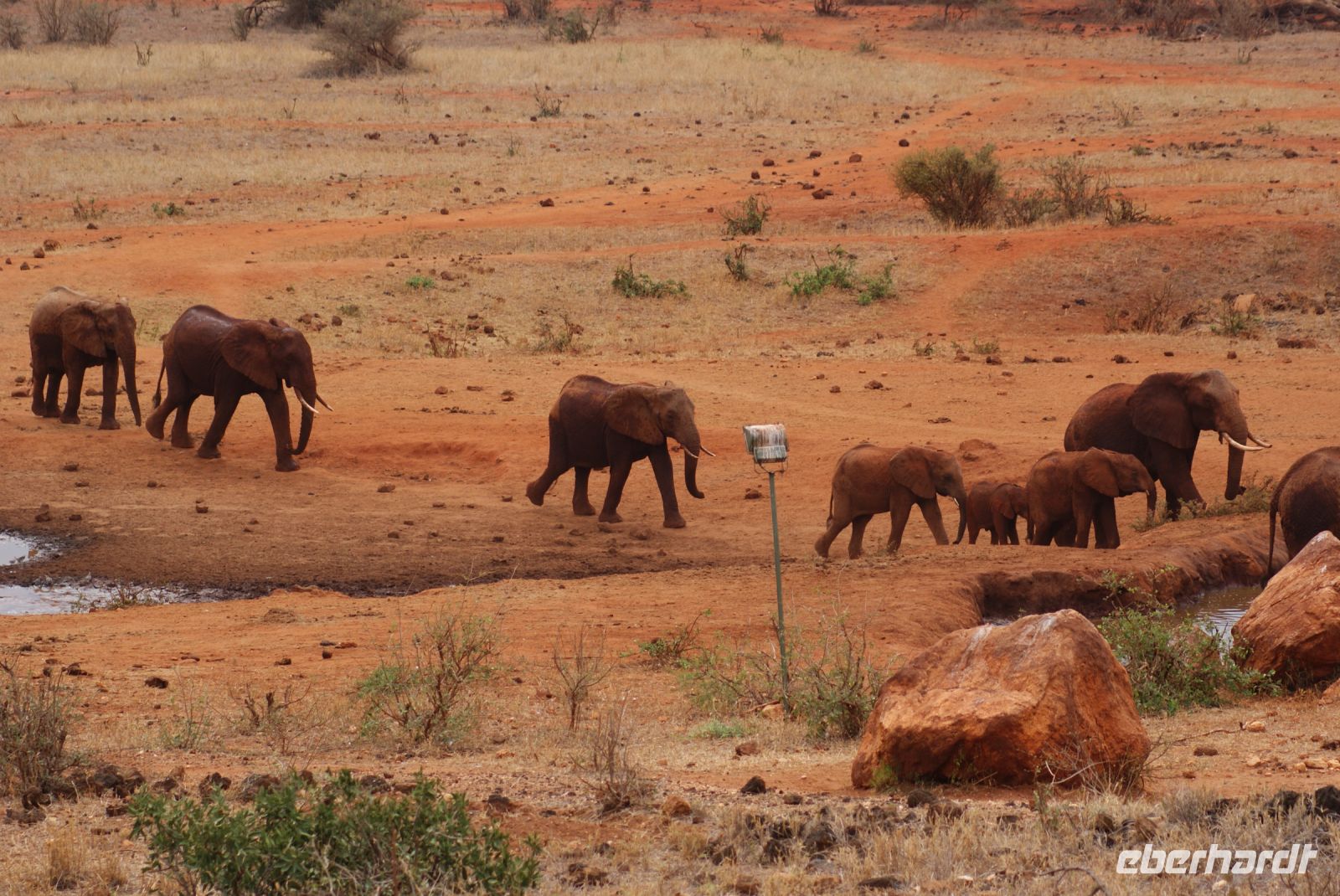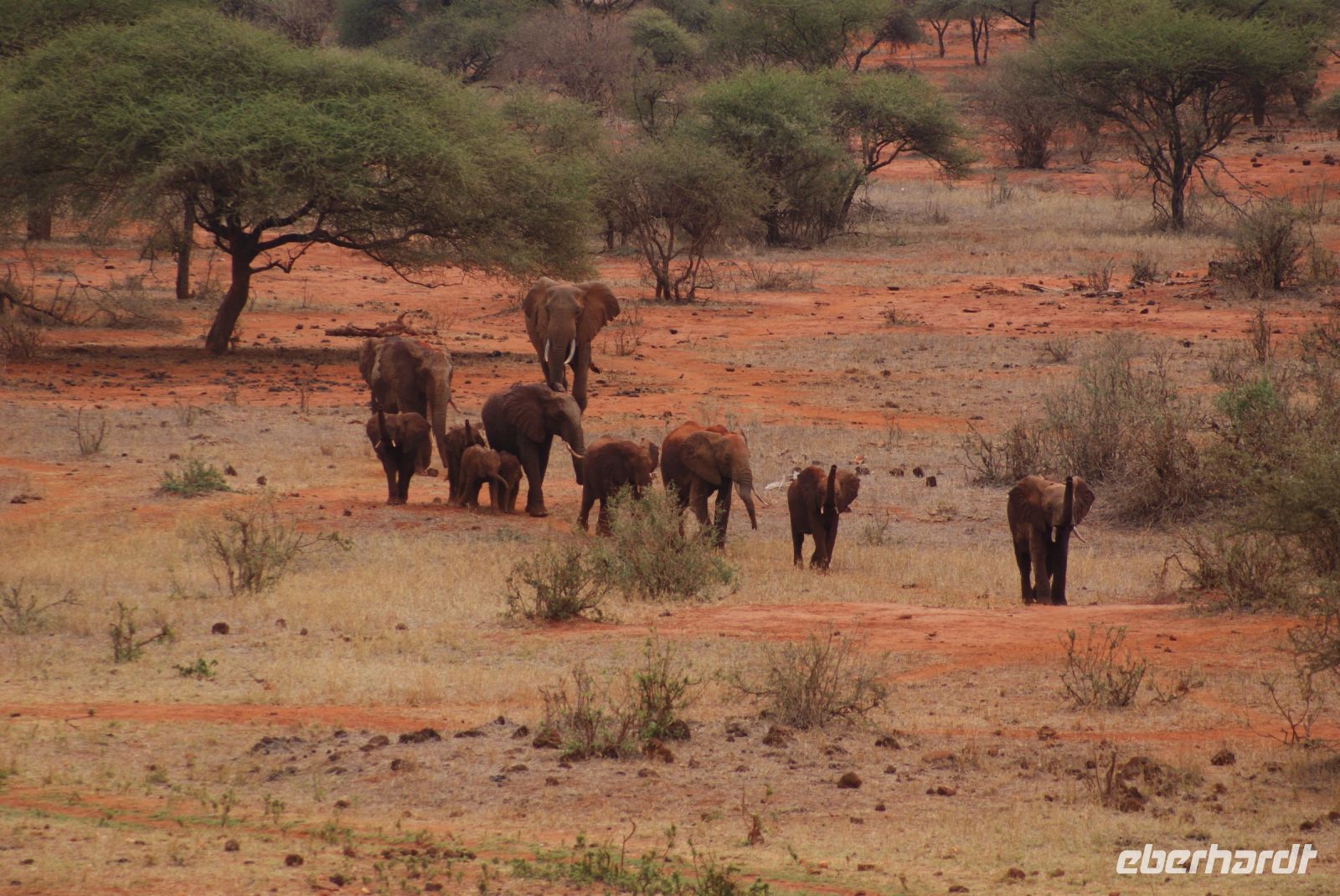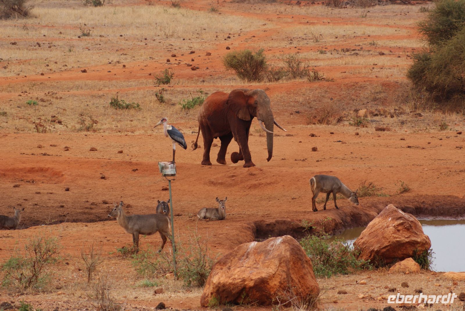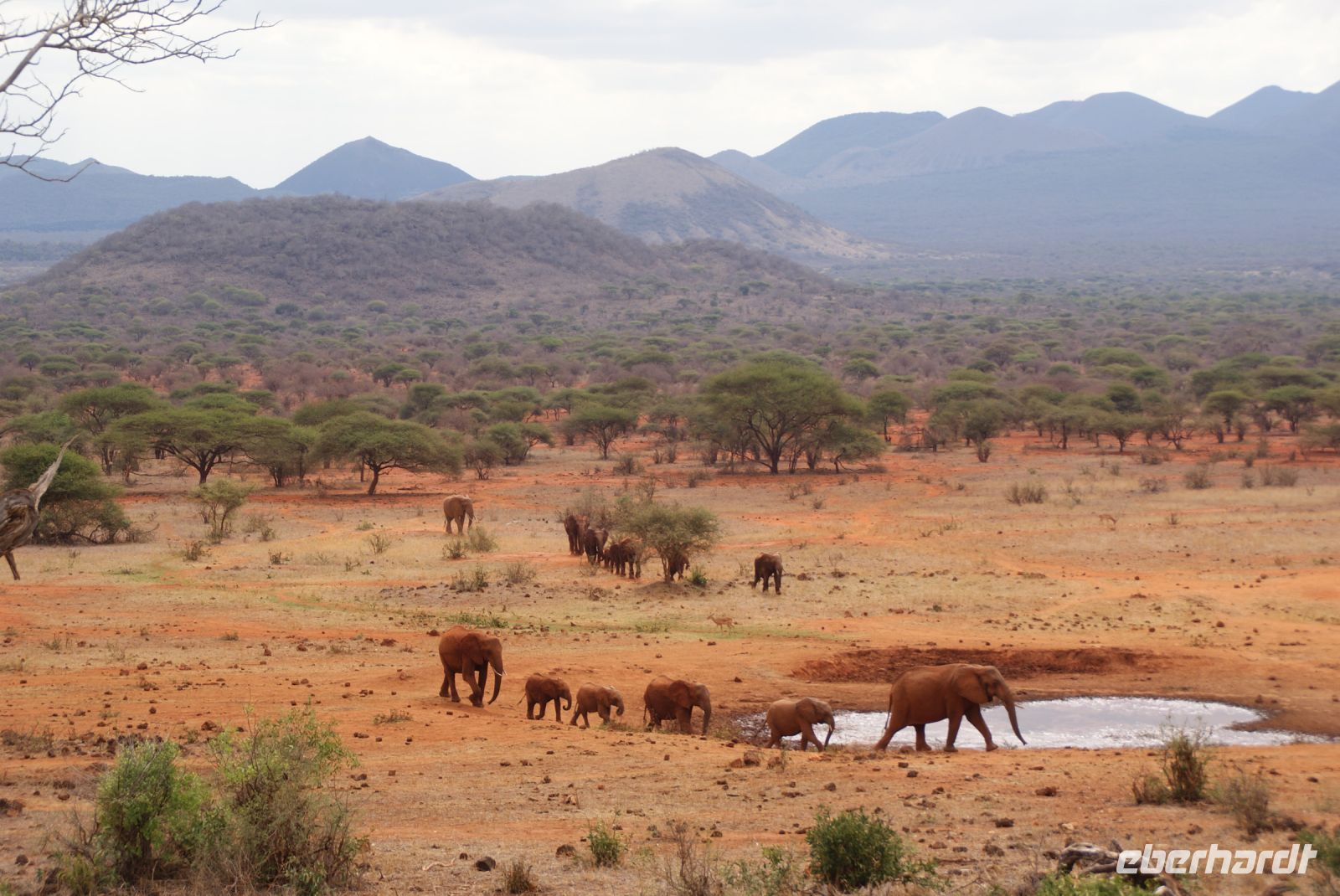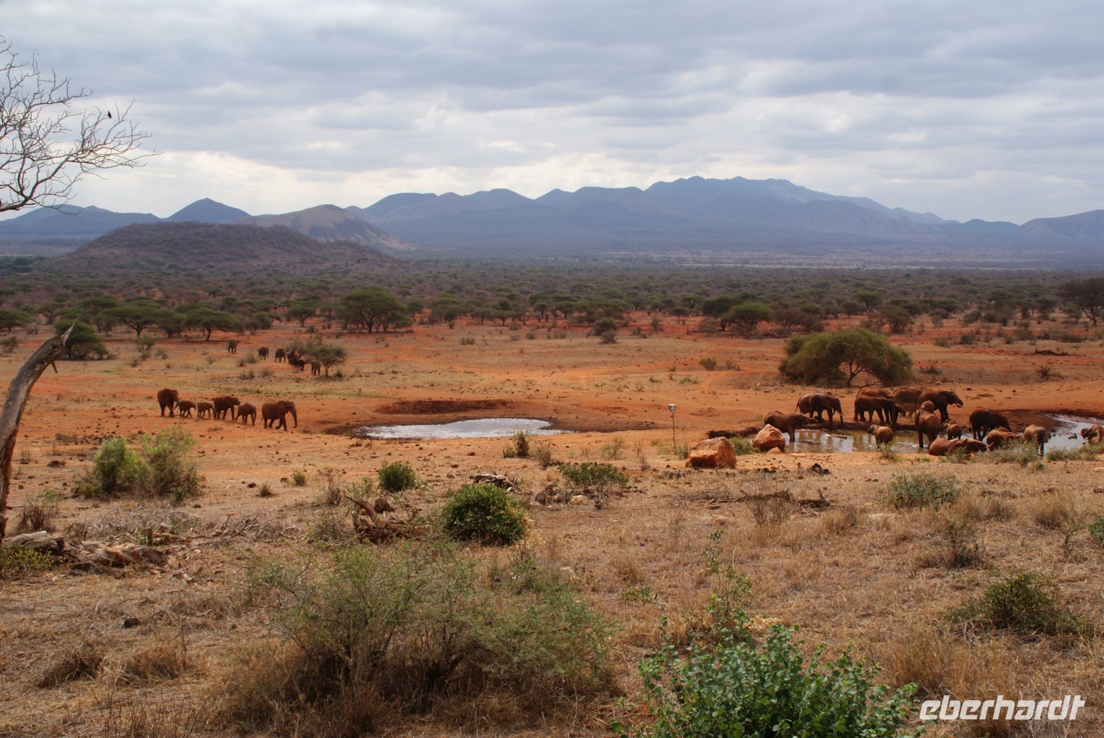 Nach einer unerwartet ruhigen Nacht (kaum Tiere am Wasserloch) und einem guten Frühstück, verlassen wir nur sehr ungern dieses afrikanische Paradies. Ein letztes Mal lassen wir den Blick auf dieses unglaubliche Panorama schweifen. Am Wasserloch finden sich nun nach den Marabus die ersten Zebras und Perlhühner ein. Bevor die Elefantenherden eintreffen, ziehen wir lieber schnell weiter, da wir diesen Platz hier sonst nicht mehr verlassen möchten. Die heutige Tour führt uns zum 12.000 Km² großen Tsavo Ost Nationalpark, der gemeinsam mit Tsavo West den größten Nationalpark Kenias bildet. West und Ost trennt nur eine Transitstraße, die größtenteils ohne Zaun verläuft. Daher sehen wir am Straßenrand so manches Elefanten-Warnschild, was auf die frei laufenden Kolosse hinweist. Tsavo wurde 1948 gegründet und ein Jahr später in West und Ost geteilt. Wir finden nun ein wiederum anderes Landschaftsbild vor. Die Hügellandschaft von West weicht inzwischen wieder einer weiten Savanne mit herrlichen Schirmakazien und teils ebenfalls roter Erde. Nachdem wir die quirlige Stadt Voi mit gleichnamigem Gate passiert haben, hat uns die Natur wieder und schon kurz darauf, werden wir von der ersten Elefantenherde mit Jungtieren begrüßt und eindringlich begutachtet. Masaigiraffen am Wegesrand, dazu Impalas und Thompson Gazellen säumen unseren Weg, bis wir mittags in der Ashnil Aruba Lodge einchecken. Der Tsavo Ost Nationalpark ist im Winter recht windig und so empfängt uns auch hier in frisches Lüftchen. Nach dem Mittagessen und ein bisschen Ausruhen von der heutigen Anreise starten wir zur Nachmittagssafari. Erneut sehen wir unzählige Elefanten nah und fern, dazu die seltenen Gerenuks (Giraffenhalsantilopen), Kudus, Hornraben, Geierperlhühner, etc. Als abschließendes Highlight führt uns Guide Caleb, einem Geheimtipp folgend, zu einem Rudel Löwinnen, die genüsslich im Dickicht Siesta halten. Welch ein toller Augenblick, fünf Löwinnen und wir ganz alleine in der Savanne… Abends kehren wir zurück und so mancher Elefant findet noch den Weg zu unserem Wasserloch an der Ashnil Aruba Lodge.