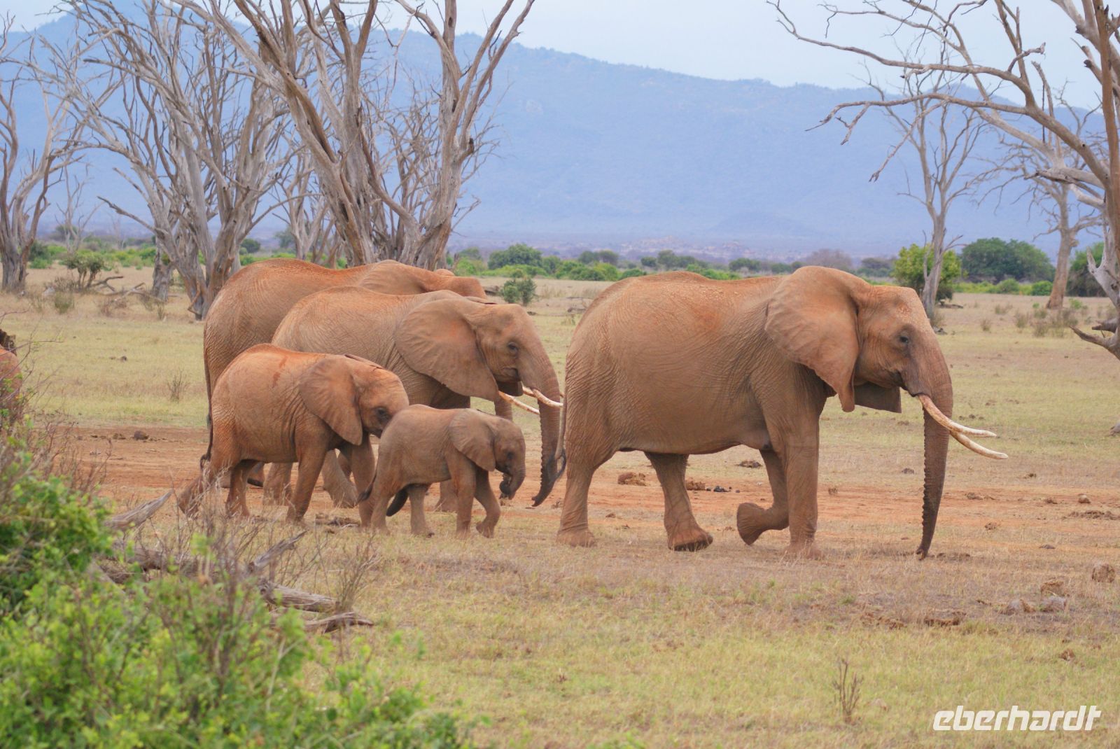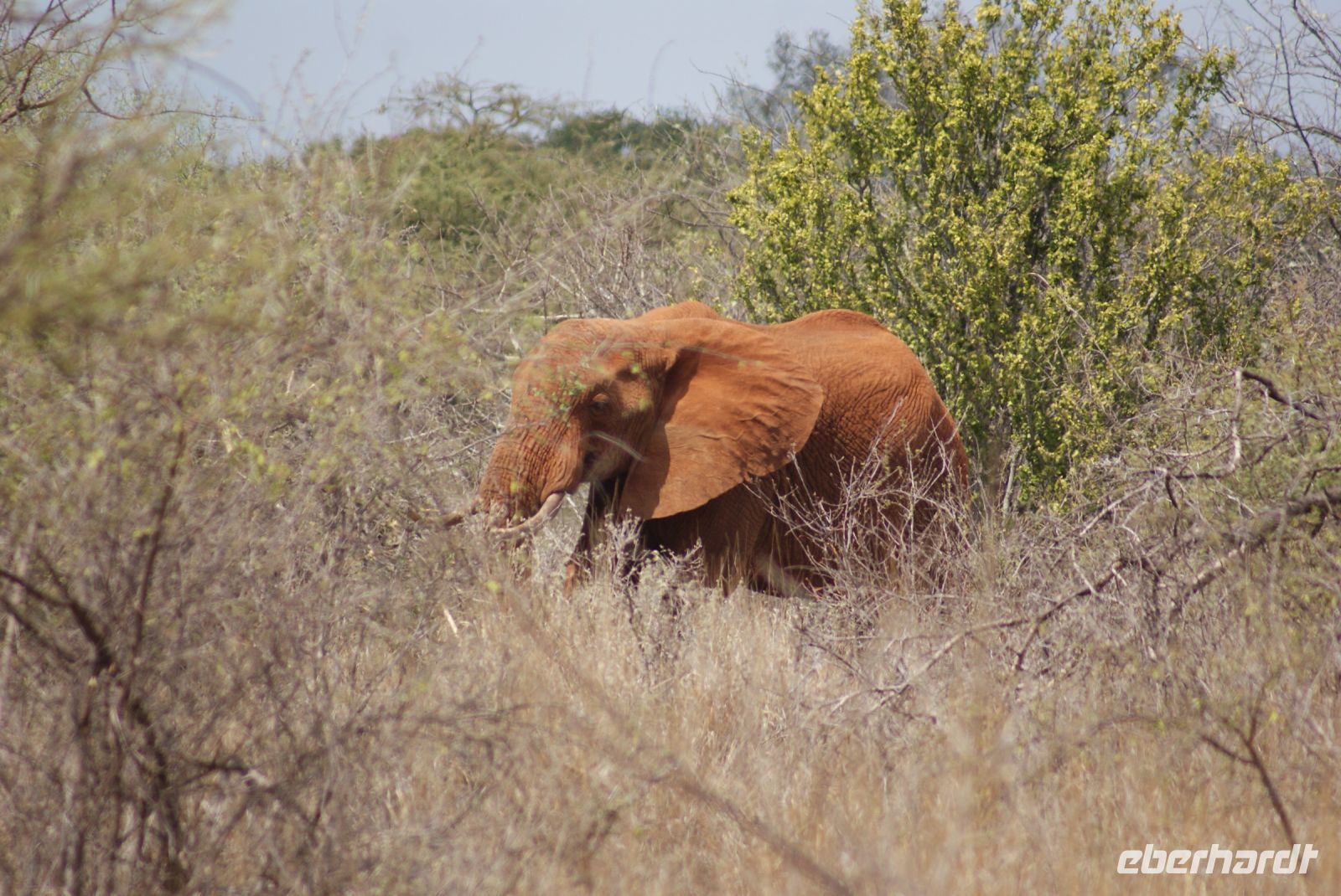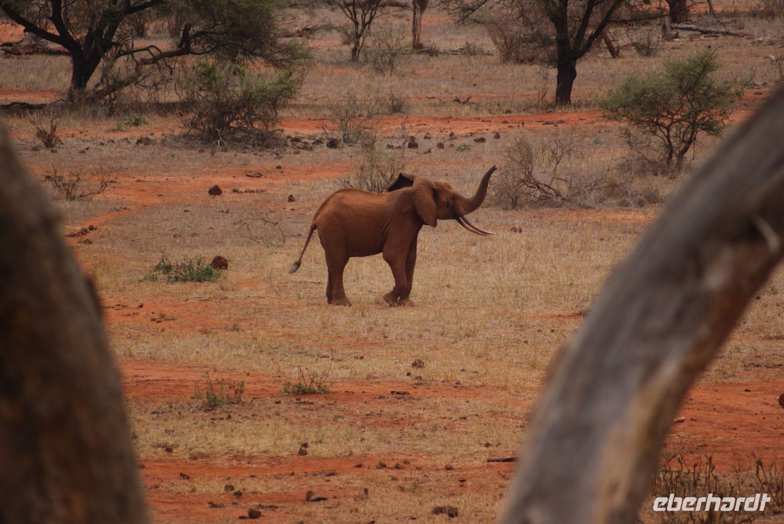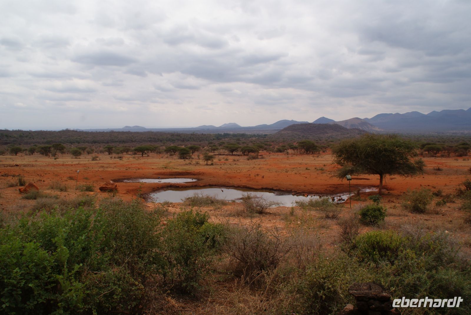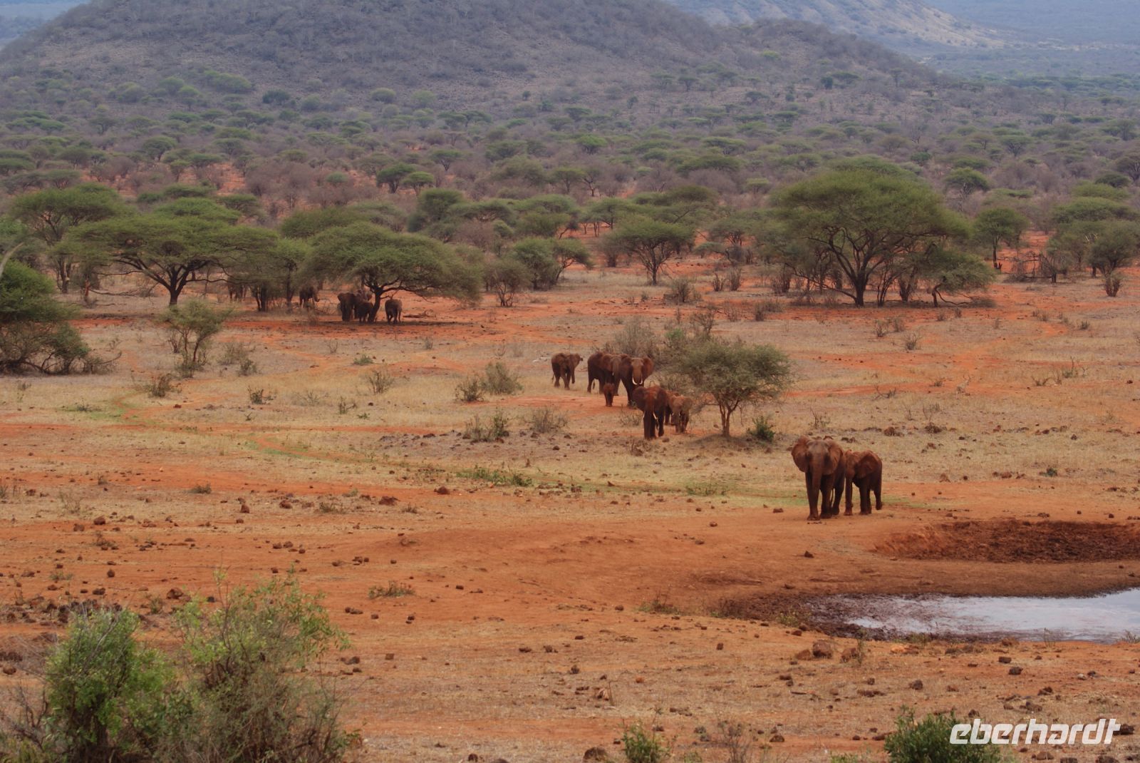 Nach einer unerwartet ruhigen Nacht (kaum Tiere am Wasserloch) und einem guten Frühstück, verlassen wir nur sehr ungern dieses afrikanische Paradies. Ein letztes Mal lassen wir den Blick auf dieses unglaubliche Panorama schweifen. Am Wasserloch finden sich nun nach den Marabus die ersten Zebras und Perlhühner ein. Bevor die Elefantenherden eintreffen, ziehen wir lieber schnell weiter, da wir diesen Platz hier sonst nicht mehr verlassen möchten. Die heutige Tour führt uns zum 12.000 Km² großen Tsavo Ost Nationalpark, der gemeinsam mit Tsavo West den größten Nationalpark Kenias bildet. West und Ost trennt nur eine Transitstraße, die größtenteils ohne Zaun verläuft. Daher sehen wir am Straßenrand so manches Elefanten-Warnschild, was auf die frei laufenden Kolosse hinweist. Tsavo wurde 1948 gegründet und ein Jahr später in West und Ost geteilt. Wir finden nun ein wiederum anderes Landschaftsbild vor. Die Hügellandschaft von West weicht inzwischen wieder einer weiten Savanne mit herrlichen Schirmakazien und teils ebenfalls roter Erde. Nachdem wir die quirlige Stadt Voi mit gleichnamigem Gate passiert haben, hat uns die Natur wieder und schon kurz darauf, werden wir von der ersten Elefantenherde mit Jungtieren begrüßt und eindringlich begutachtet. Masaigiraffen am Wegesrand, dazu Impalas und Thompson Gazellen säumen unseren Weg, bis wir mittags in der Ashnil Aruba Lodge einchecken. Der Tsavo Ost Nationalpark ist im Winter recht windig und so empfängt uns auch hier in frisches Lüftchen. Nach dem Mittagessen und ein bisschen Ausruhen von der heutigen Anreise starten wir zur Nachmittagssafari. Erneut sehen wir unzählige Elefanten nah und fern, dazu die seltenen Gerenuks (Giraffenhalsantilopen), Kudus, Hornraben, Geierperlhühner, etc. Als abschließendes Highlight führt uns Guide Caleb, einem Geheimtipp folgend, zu einem Rudel Löwinnen, die genüsslich im Dickicht Siesta halten. Welch ein toller Augenblick, fünf Löwinnen und wir ganz alleine in der Savanne… Abends kehren wir zurück und so mancher Elefant findet noch den Weg zu unserem Wasserloch an der Ashnil Aruba Lodge.