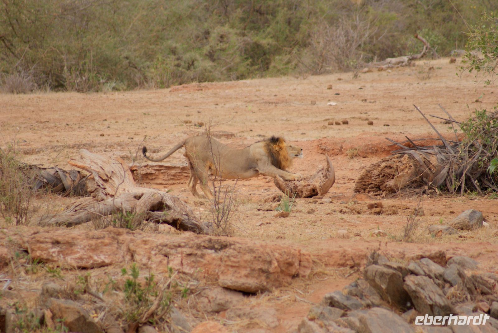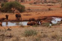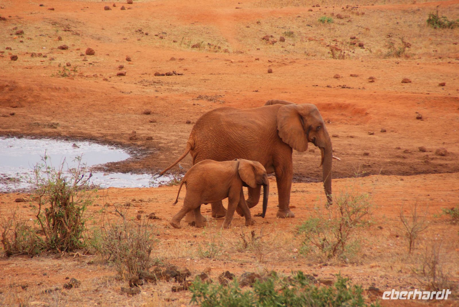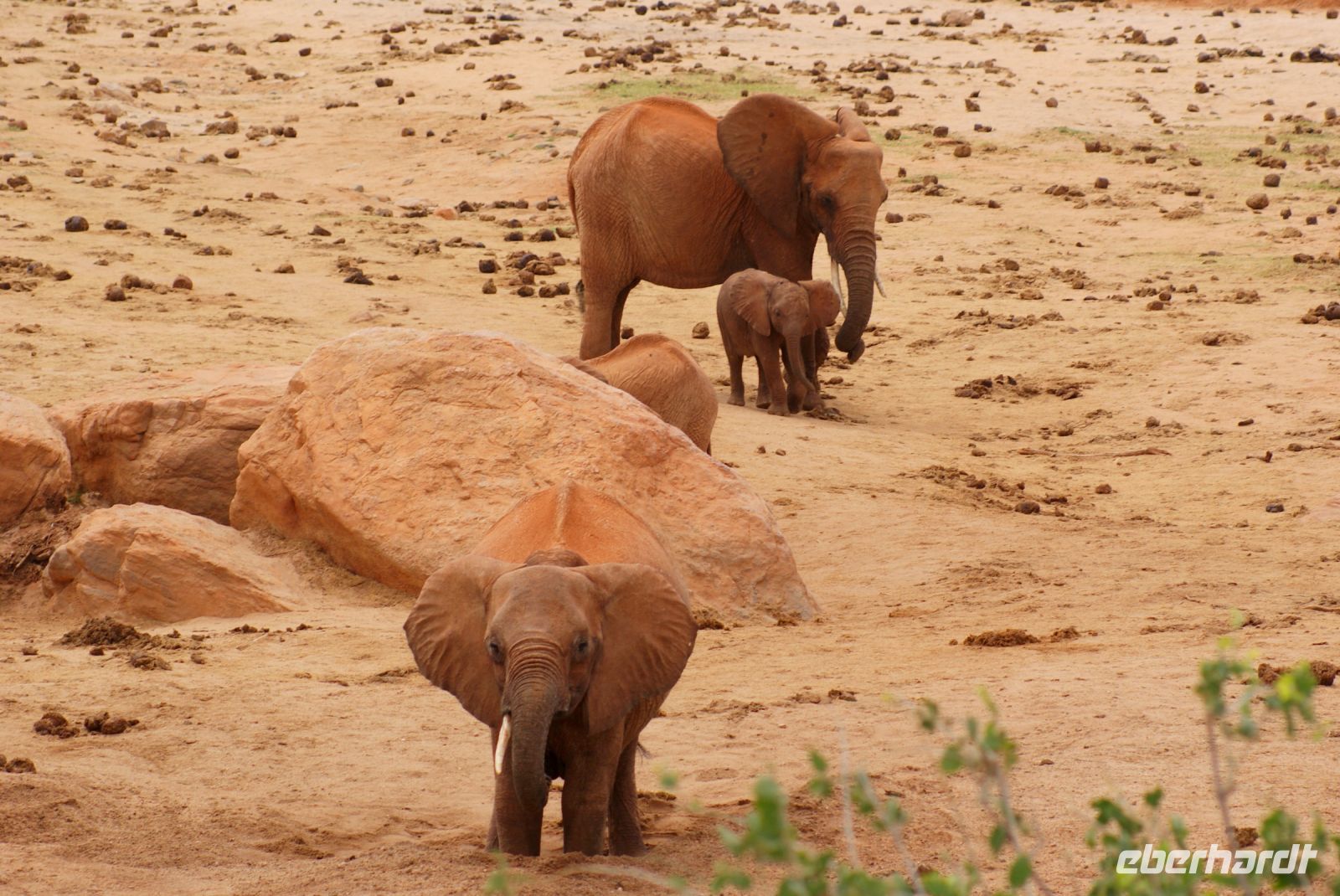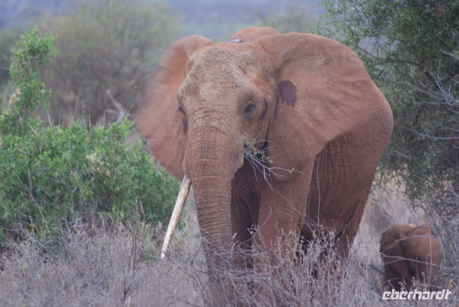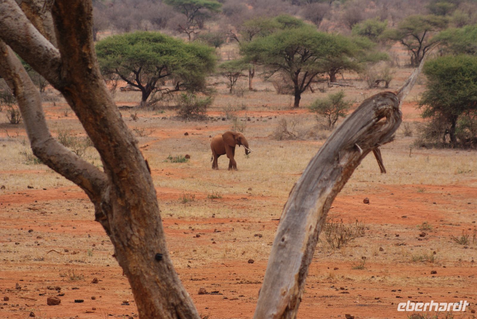 Nach einer unerwartet ruhigen Nacht (kaum Tiere am Wasserloch) und einem guten Frühstück, verlassen wir nur sehr ungern dieses afrikanische Paradies. Ein letztes Mal lassen wir den Blick auf dieses unglaubliche Panorama schweifen. Am Wasserloch finden sich nun nach den Marabus die ersten Zebras und Perlhühner ein. Bevor die Elefantenherden eintreffen, ziehen wir lieber schnell weiter, da wir diesen Platz hier sonst nicht mehr verlassen möchten. Die heutige Tour führt uns zum 12.000 Km² großen Tsavo Ost Nationalpark, der gemeinsam mit Tsavo West den größten Nationalpark Kenias bildet. West und Ost trennt nur eine Transitstraße, die größtenteils ohne Zaun verläuft. Daher sehen wir am Straßenrand so manches Elefanten-Warnschild, was auf die frei laufenden Kolosse hinweist. Tsavo wurde 1948 gegründet und ein Jahr später in West und Ost geteilt. Wir finden nun ein wiederum anderes Landschaftsbild vor. Die Hügellandschaft von West weicht inzwischen wieder einer weiten Savanne mit herrlichen Schirmakazien und teils ebenfalls roter Erde. Nachdem wir die quirlige Stadt Voi mit gleichnamigem Gate passiert haben, hat uns die Natur wieder und schon kurz darauf, werden wir von der ersten Elefantenherde mit Jungtieren begrüßt und eindringlich begutachtet. Masaigiraffen am Wegesrand, dazu Impalas und Thompson Gazellen säumen unseren Weg, bis wir mittags in der Ashnil Aruba Lodge einchecken. Der Tsavo Ost Nationalpark ist im Winter recht windig und so empfängt uns auch hier in frisches Lüftchen. Nach dem Mittagessen und ein bisschen Ausruhen von der heutigen Anreise starten wir zur Nachmittagssafari. Erneut sehen wir unzählige Elefanten nah und fern, dazu die seltenen Gerenuks (Giraffenhalsantilopen), Kudus, Hornraben, Geierperlhühner, etc. Als abschließendes Highlight führt uns Guide Caleb, einem Geheimtipp folgend, zu einem Rudel Löwinnen, die genüsslich im Dickicht Siesta halten. Welch ein toller Augenblick, fünf Löwinnen und wir ganz alleine in der Savanne… Abends kehren wir zurück und so mancher Elefant findet noch den Weg zu unserem Wasserloch an der Ashnil Aruba Lodge.
