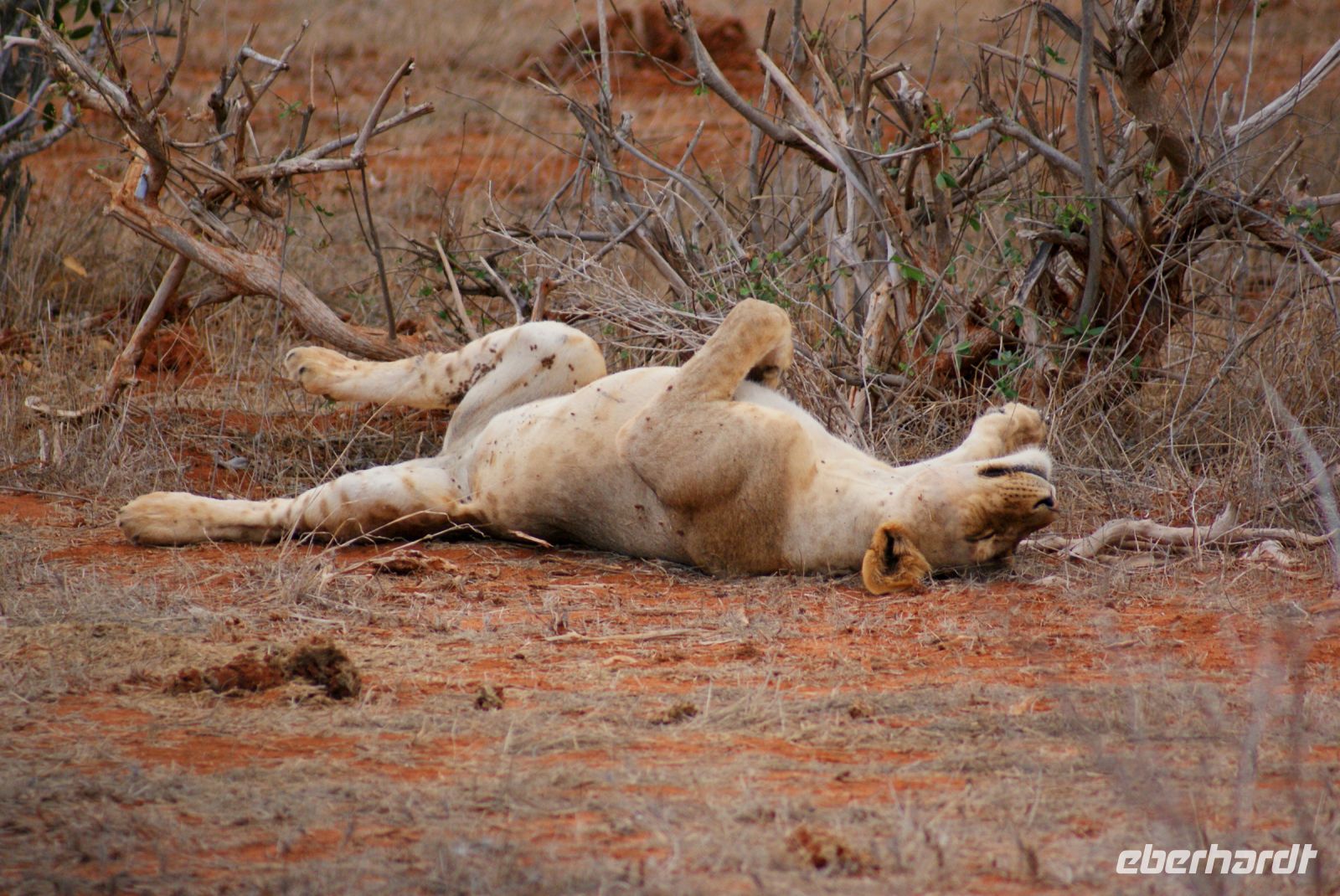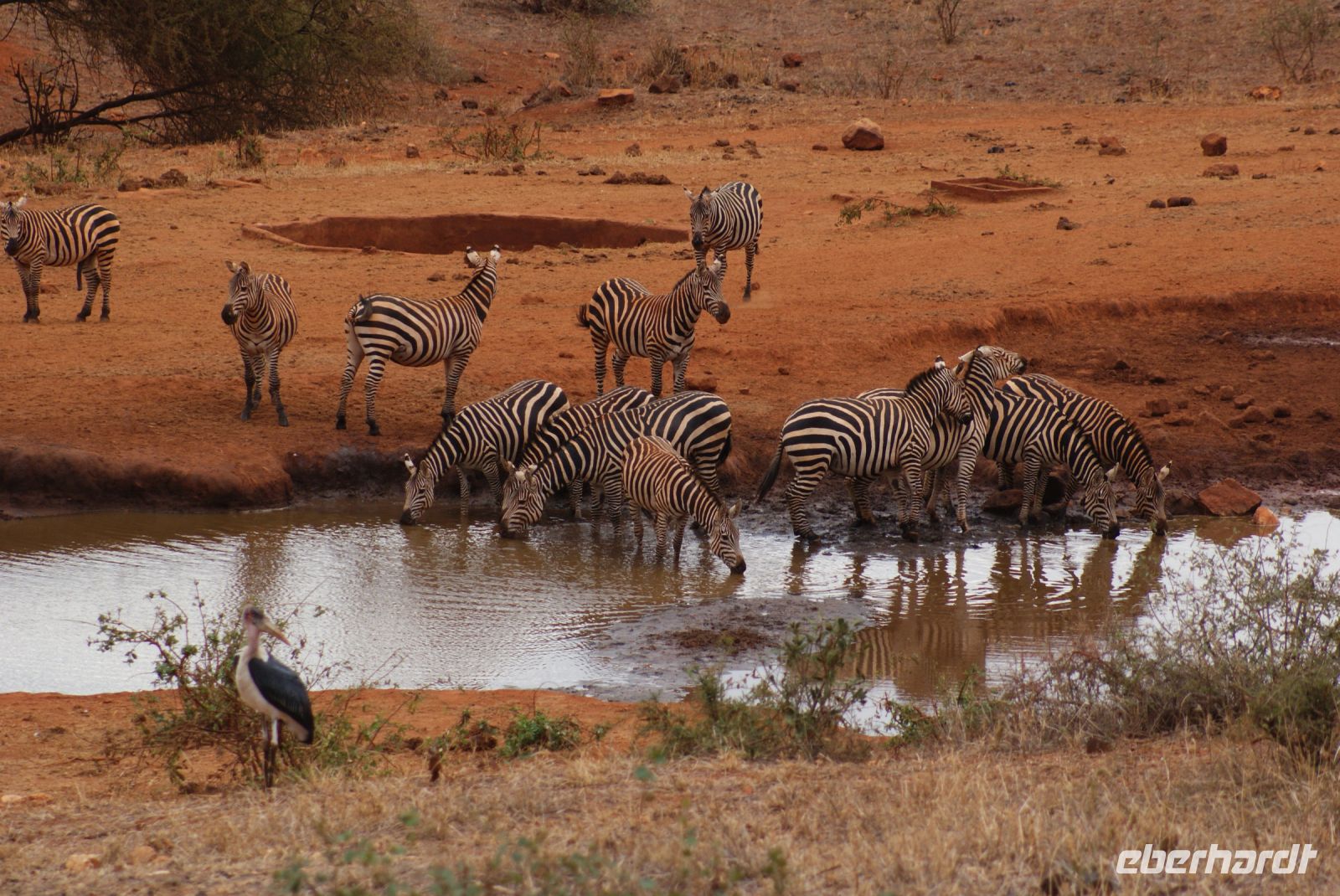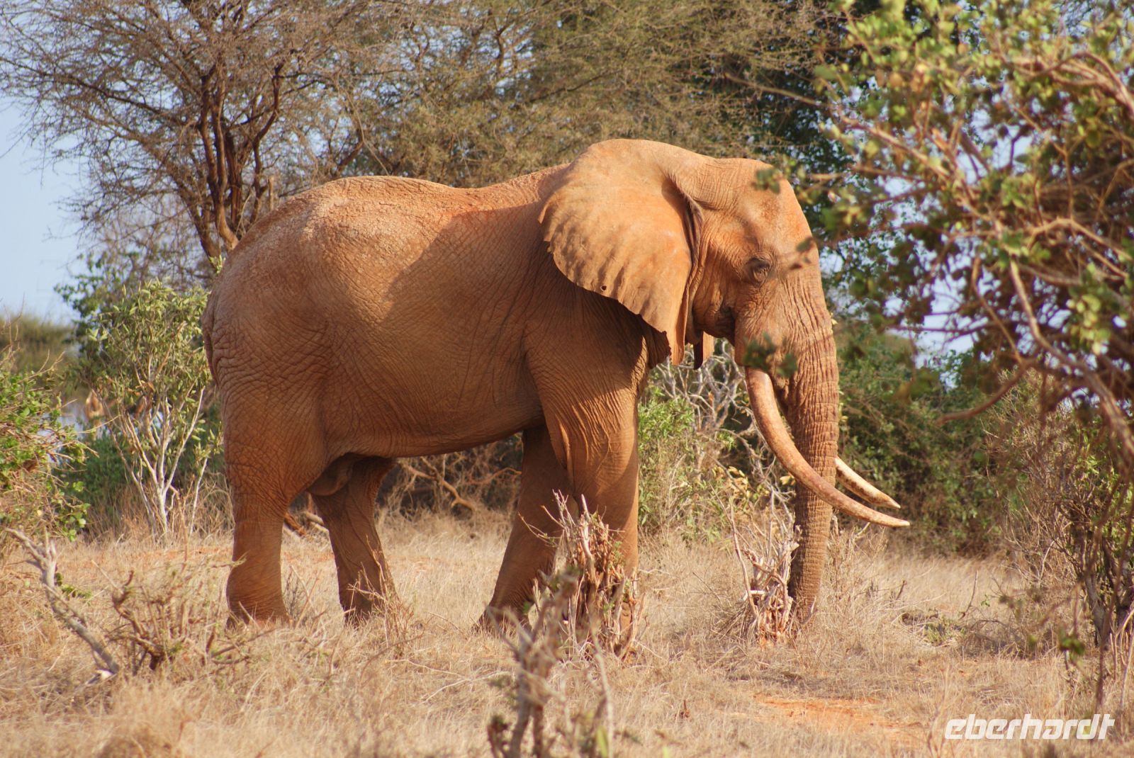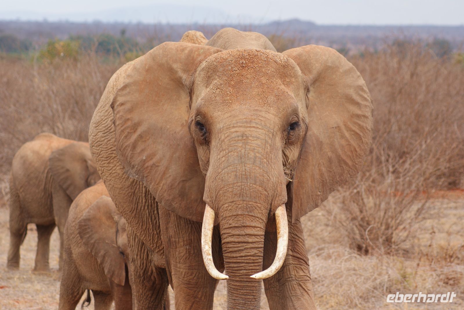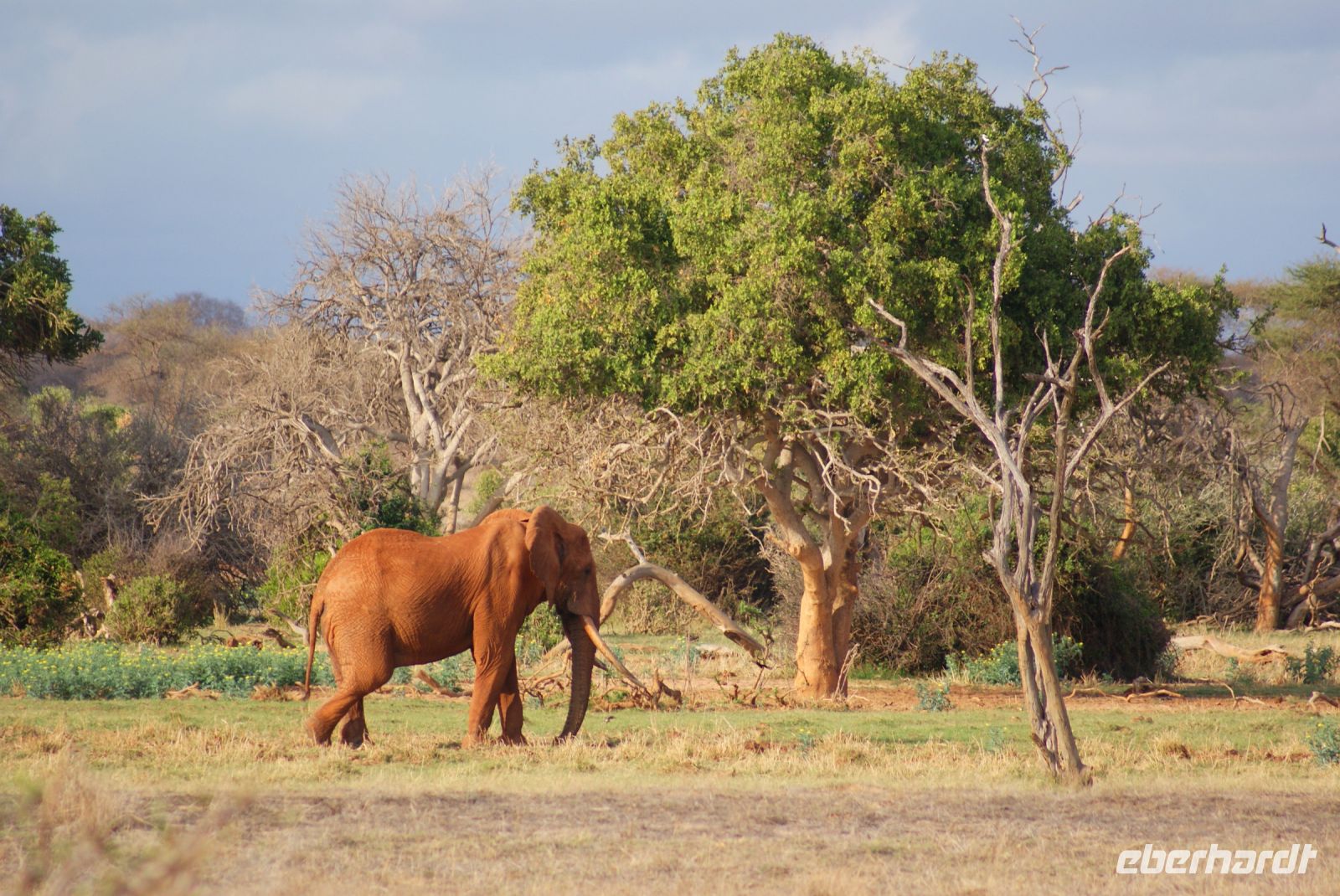 Nach einer unerwartet ruhigen Nacht (kaum Tiere am Wasserloch) und einem guten Frühstück, verlassen wir nur sehr ungern dieses afrikanische Paradies. Ein letztes Mal lassen wir den Blick auf dieses unglaubliche Panorama schweifen. Am Wasserloch finden sich nun nach den Marabus die ersten Zebras und Perlhühner ein. Bevor die Elefantenherden eintreffen, ziehen wir lieber schnell weiter, da wir diesen Platz hier sonst nicht mehr verlassen möchten. Die heutige Tour führt uns zum 12.000 Km² großen Tsavo Ost Nationalpark, der gemeinsam mit Tsavo West den größten Nationalpark Kenias bildet. West und Ost trennt nur eine Transitstraße, die größtenteils ohne Zaun verläuft. Daher sehen wir am Straßenrand so manches Elefanten-Warnschild, was auf die frei laufenden Kolosse hinweist. Tsavo wurde 1948 gegründet und ein Jahr später in West und Ost geteilt. Wir finden nun ein wiederum anderes Landschaftsbild vor. Die Hügellandschaft von West weicht inzwischen wieder einer weiten Savanne mit herrlichen Schirmakazien und teils ebenfalls roter Erde. Nachdem wir die quirlige Stadt Voi mit gleichnamigem Gate passiert haben, hat uns die Natur wieder und schon kurz darauf, werden wir von der ersten Elefantenherde mit Jungtieren begrüßt und eindringlich begutachtet. Masaigiraffen am Wegesrand, dazu Impalas und Thompson Gazellen säumen unseren Weg, bis wir mittags in der Ashnil Aruba Lodge einchecken. Der Tsavo Ost Nationalpark ist im Winter recht windig und so empfängt uns auch hier in frisches Lüftchen. Nach dem Mittagessen und ein bisschen Ausruhen von der heutigen Anreise starten wir zur Nachmittagssafari. Erneut sehen wir unzählige Elefanten nah und fern, dazu die seltenen Gerenuks (Giraffenhalsantilopen), Kudus, Hornraben, Geierperlhühner, etc. Als abschließendes Highlight führt uns Guide Caleb, einem Geheimtipp folgend, zu einem Rudel Löwinnen, die genüsslich im Dickicht Siesta halten. Welch ein toller Augenblick, fünf Löwinnen und wir ganz alleine in der Savanne… Abends kehren wir zurück und so mancher Elefant findet noch den Weg zu unserem Wasserloch an der Ashnil Aruba Lodge.