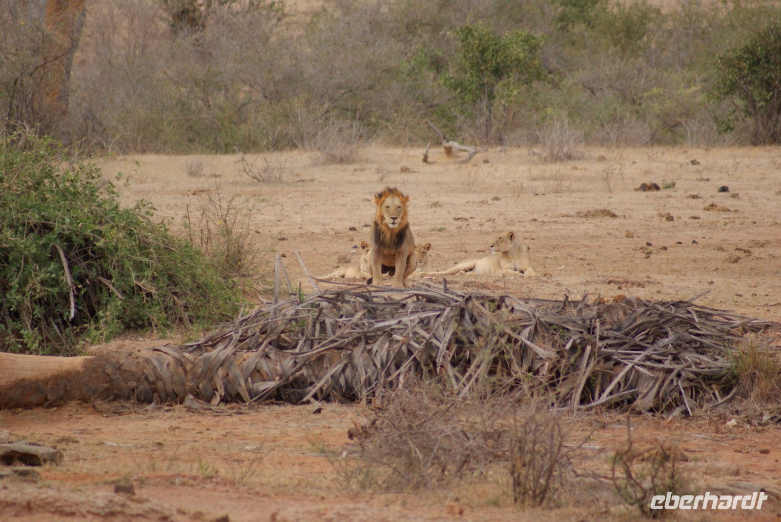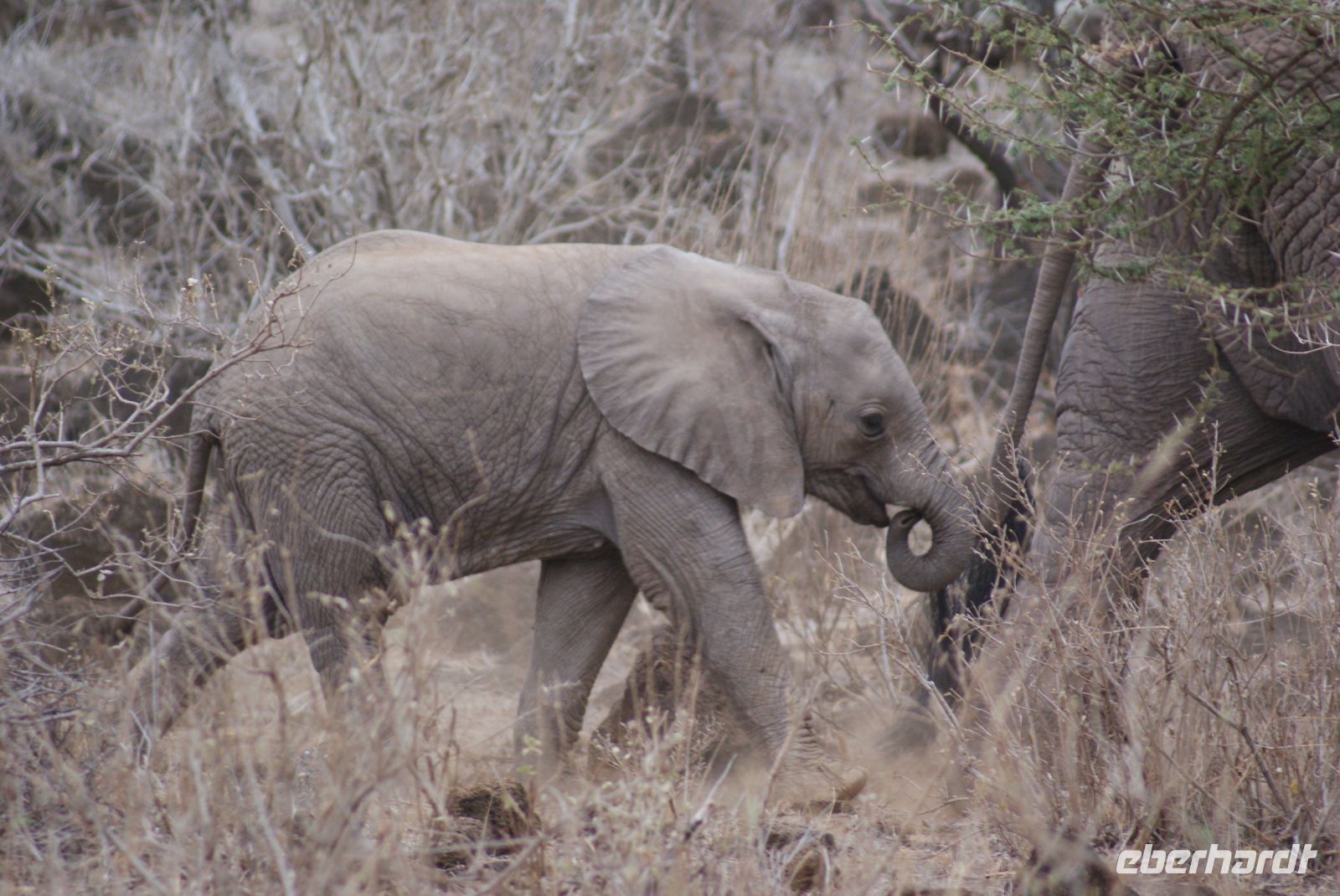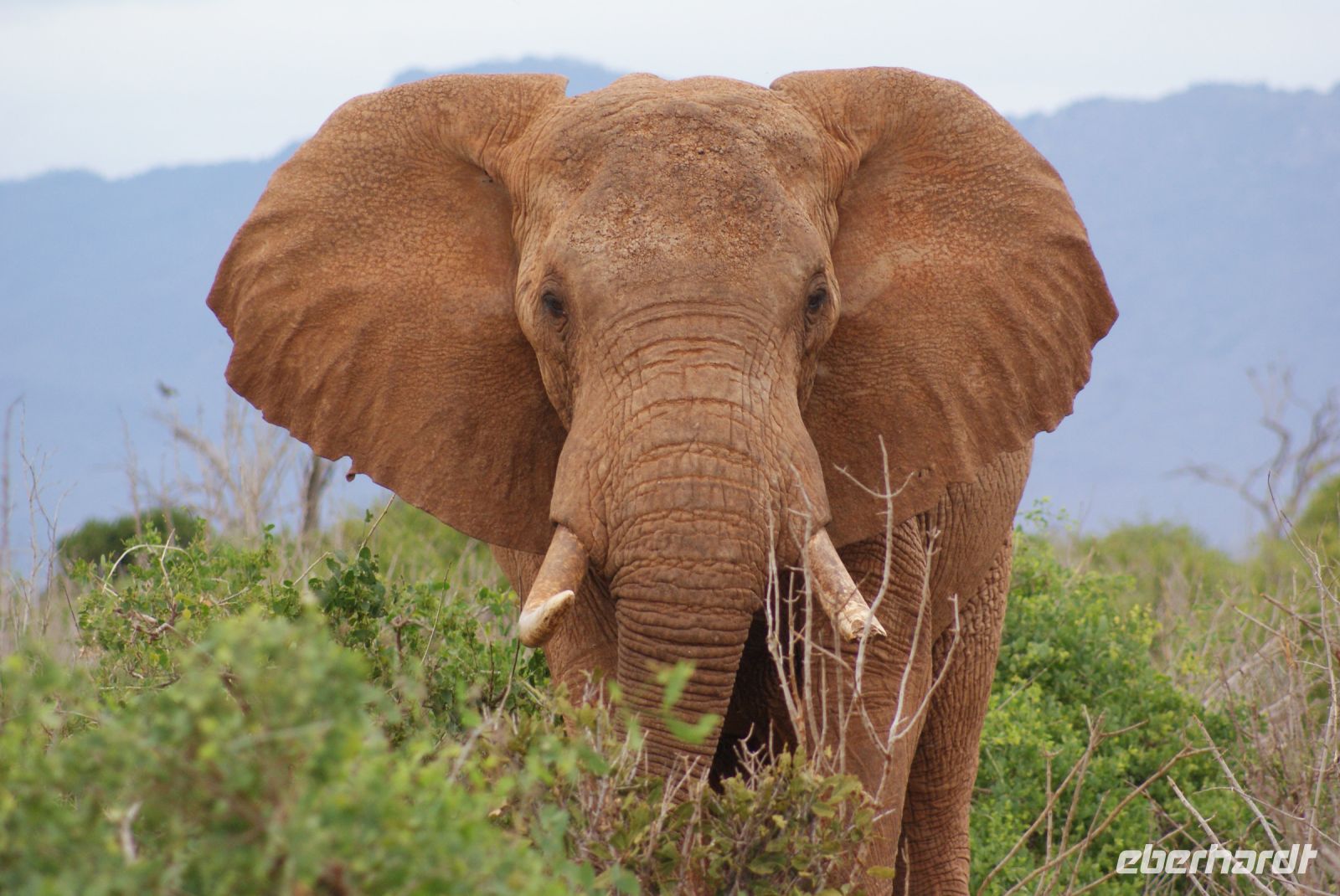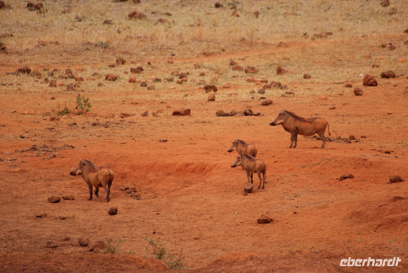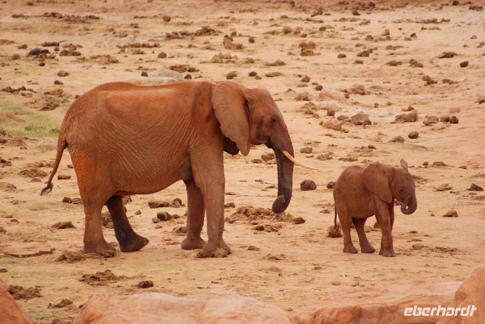 Nach einer unerwartet ruhigen Nacht (kaum Tiere am Wasserloch) und einem guten Frühstück, verlassen wir nur sehr ungern dieses afrikanische Paradies. Ein letztes Mal lassen wir den Blick auf dieses unglaubliche Panorama schweifen. Am Wasserloch finden sich nun nach den Marabus die ersten Zebras und Perlhühner ein. Bevor die Elefantenherden eintreffen, ziehen wir lieber schnell weiter, da wir diesen Platz hier sonst nicht mehr verlassen möchten. Die heutige Tour führt uns zum 12.000 Km² großen Tsavo Ost Nationalpark, der gemeinsam mit Tsavo West den größten Nationalpark Kenias bildet. West und Ost trennt nur eine Transitstraße, die größtenteils ohne Zaun verläuft. Daher sehen wir am Straßenrand so manches Elefanten-Warnschild, was auf die frei laufenden Kolosse hinweist. Tsavo wurde 1948 gegründet und ein Jahr später in West und Ost geteilt. Wir finden nun ein wiederum anderes Landschaftsbild vor. Die Hügellandschaft von West weicht inzwischen wieder einer weiten Savanne mit herrlichen Schirmakazien und teils ebenfalls roter Erde. Nachdem wir die quirlige Stadt Voi mit gleichnamigem Gate passiert haben, hat uns die Natur wieder und schon kurz darauf, werden wir von der ersten Elefantenherde mit Jungtieren begrüßt und eindringlich begutachtet. Masaigiraffen am Wegesrand, dazu Impalas und Thompson Gazellen säumen unseren Weg, bis wir mittags in der Ashnil Aruba Lodge einchecken. Der Tsavo Ost Nationalpark ist im Winter recht windig und so empfängt uns auch hier in frisches Lüftchen. Nach dem Mittagessen und ein bisschen Ausruhen von der heutigen Anreise starten wir zur Nachmittagssafari. Erneut sehen wir unzählige Elefanten nah und fern, dazu die seltenen Gerenuks (Giraffenhalsantilopen), Kudus, Hornraben, Geierperlhühner, etc. Als abschließendes Highlight führt uns Guide Caleb, einem Geheimtipp folgend, zu einem Rudel Löwinnen, die genüsslich im Dickicht Siesta halten. Welch ein toller Augenblick, fünf Löwinnen und wir ganz alleine in der Savanne… Abends kehren wir zurück und so mancher Elefant findet noch den Weg zu unserem Wasserloch an der Ashnil Aruba Lodge.