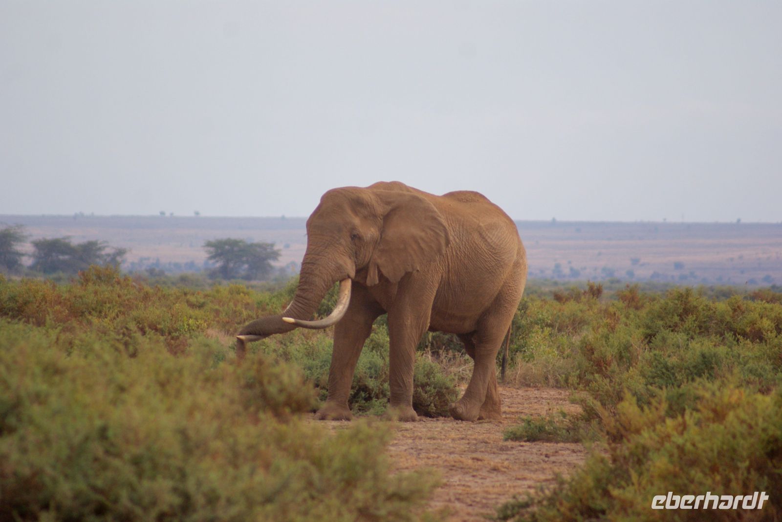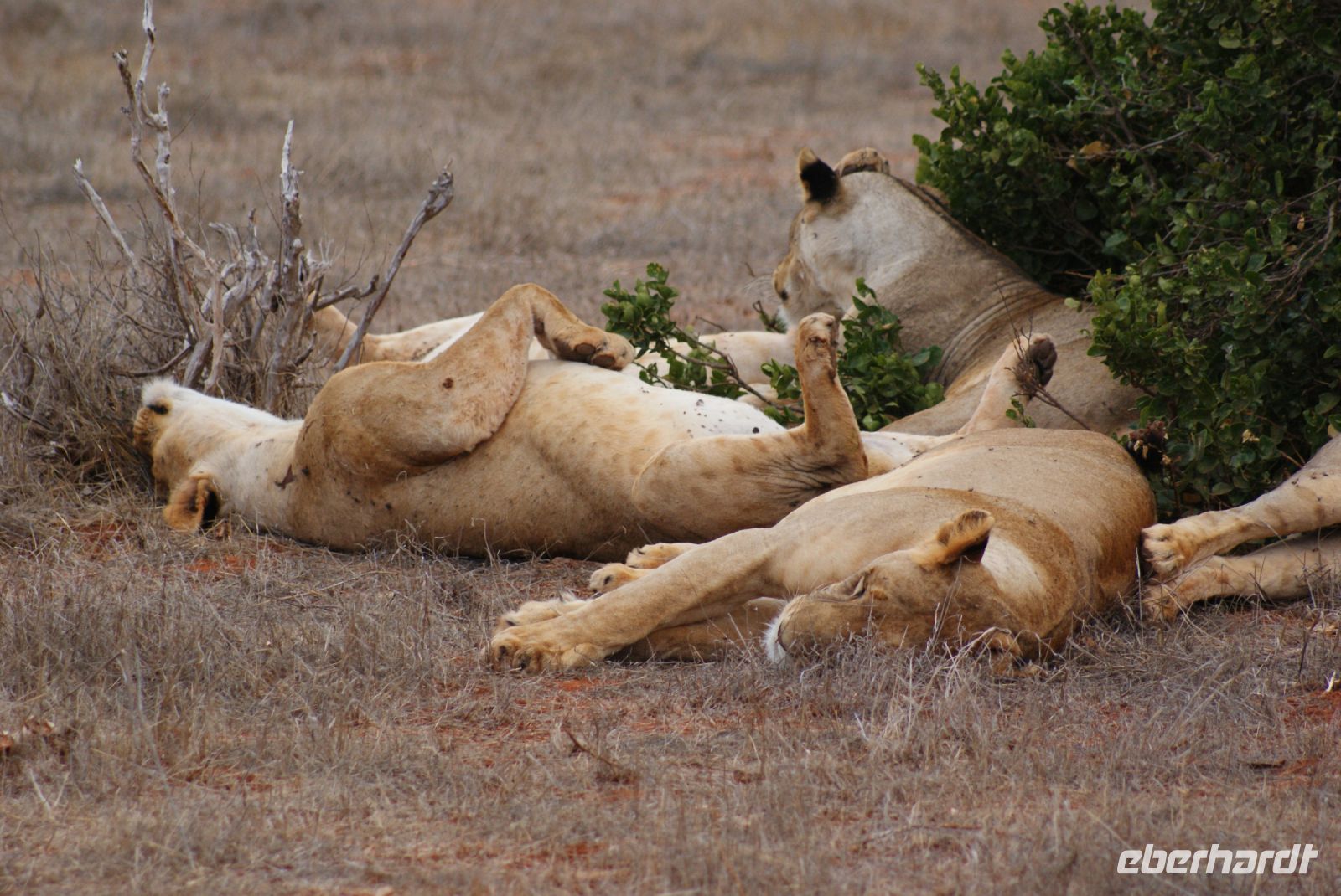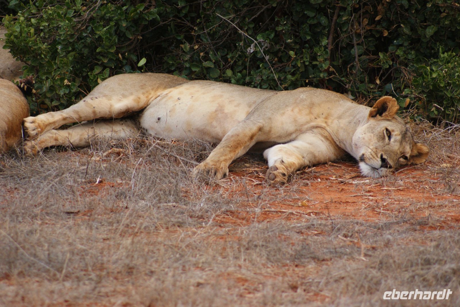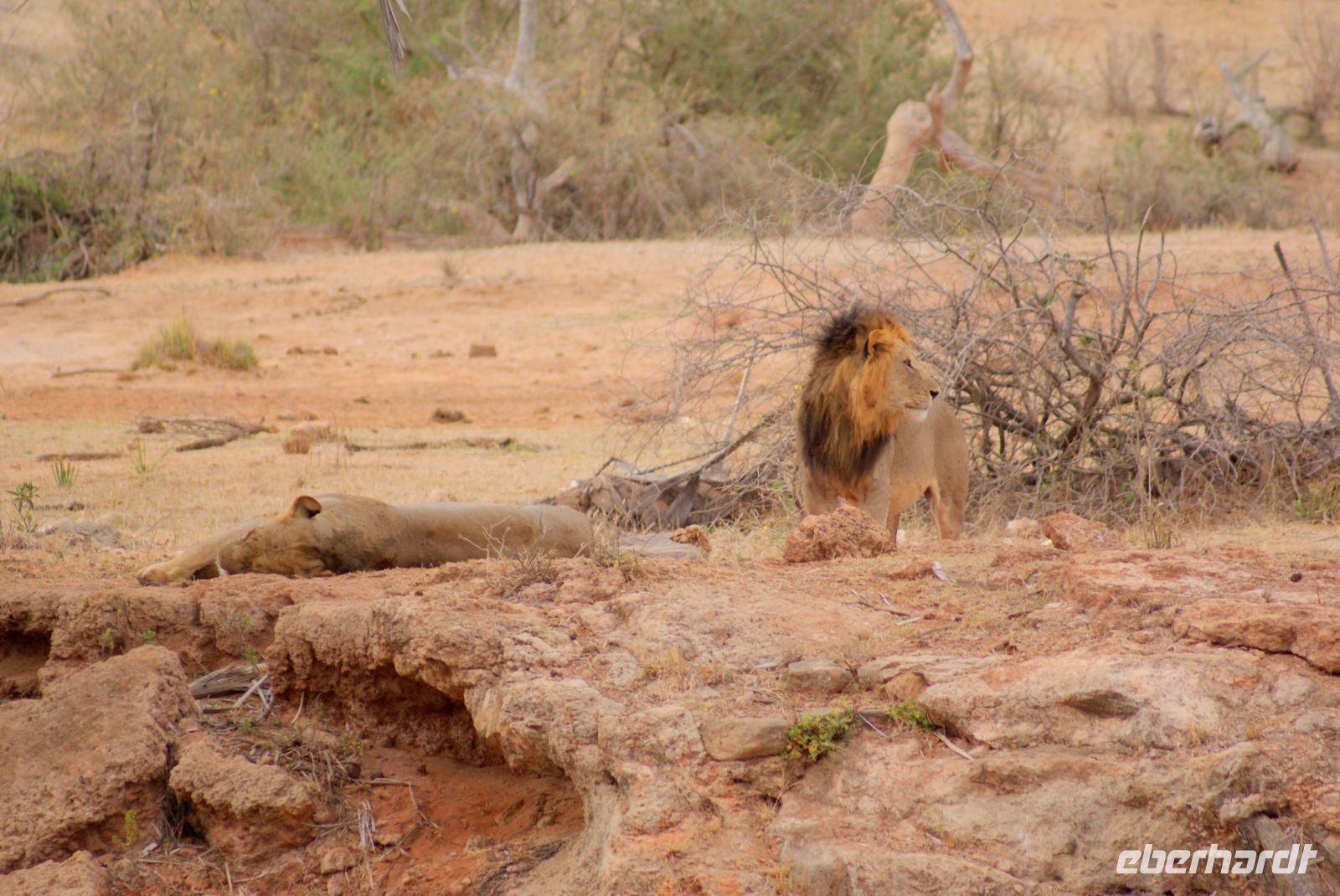Nach einer unerwartet ruhigen Nacht (kaum Tiere am Wasserloch) und einem guten Frühstück, verlassen wir nur sehr ungern dieses afrikanische Paradies. Ein letztes Mal lassen wir den Blick auf dieses unglaubliche Panorama schweifen. Am Wasserloch finden sich nun nach den Marabus die ersten Zebras und Perlhühner ein. Bevor die Elefantenherden eintreffen, ziehen wir lieber schnell weiter, da wir diesen Platz hier sonst nicht mehr verlassen möchten. Die heutige Tour führt uns zum 12.000 Km² großen Tsavo Ost Nationalpark, der gemeinsam mit Tsavo West den größten Nationalpark Kenias bildet. West und Ost trennt nur eine Transitstraße, die größtenteils ohne Zaun verläuft. Daher sehen wir am Straßenrand so manches Elefanten-Warnschild, was auf die frei laufenden Kolosse hinweist. Tsavo wurde 1948 gegründet und ein Jahr später in West und Ost geteilt. Wir finden nun ein wiederum anderes Landschaftsbild vor. Die Hügellandschaft von West weicht inzwischen wieder einer weiten Savanne mit herrlichen Schirmakazien und teils ebenfalls roter Erde. Nachdem wir die quirlige Stadt Voi mit gleichnamigem Gate passiert haben, hat uns die Natur wieder und schon kurz darauf, werden wir von der ersten Elefantenherde mit Jungtieren begrüßt und eindringlich begutachtet. Masaigiraffen am Wegesrand, dazu Impalas und Thompson Gazellen säumen unseren Weg, bis wir mittags in der Ashnil Aruba Lodge einchecken. Der Tsavo Ost Nationalpark ist im Winter recht windig und so empfängt uns auch hier in frisches Lüftchen. Nach dem Mittagessen und ein bisschen Ausruhen von der heutigen Anreise starten wir zur Nachmittagssafari. Erneut sehen wir unzählige Elefanten nah und fern, dazu die seltenen Gerenuks (Giraffenhalsantilopen), Kudus, Hornraben, Geierperlhühner, etc. Als abschließendes Highlight führt uns Guide Caleb, einem Geheimtipp folgend, zu einem Rudel Löwinnen, die genüsslich im Dickicht Siesta halten. Welch ein toller Augenblick, fünf Löwinnen und wir ganz alleine in der Savanne… Abends kehren wir zurück und so mancher Elefant findet noch den Weg zu unserem Wasserloch an der Ashnil Aruba Lodge.