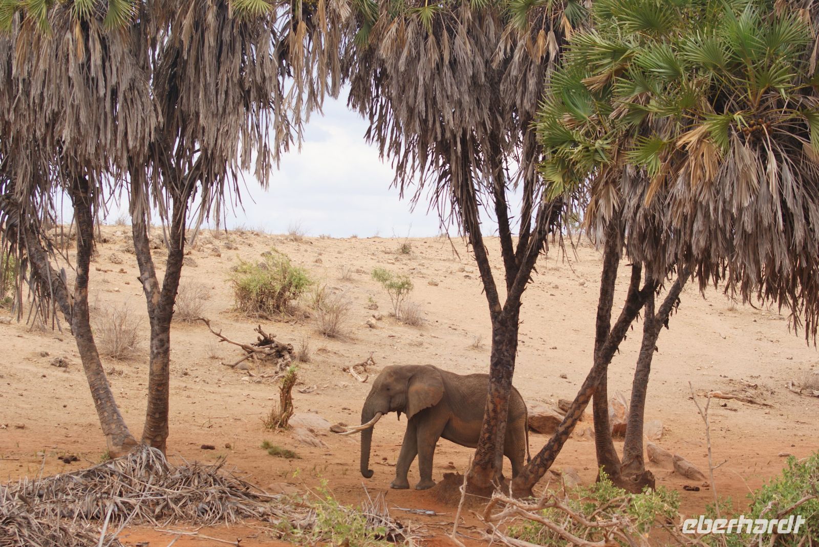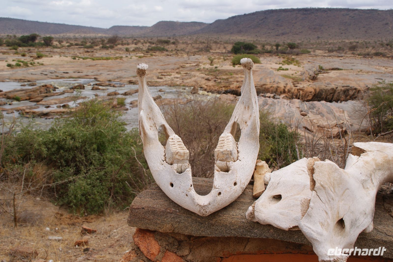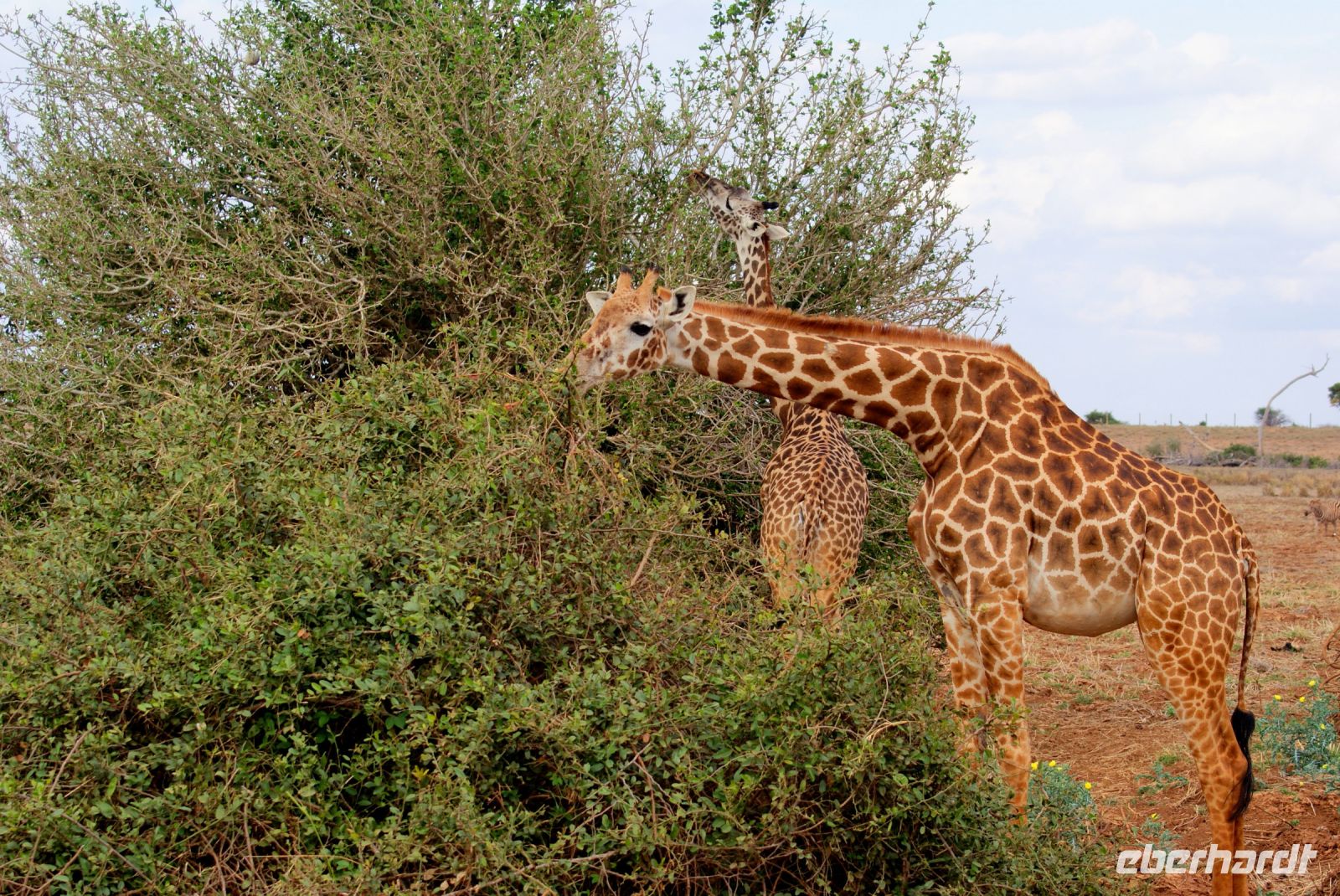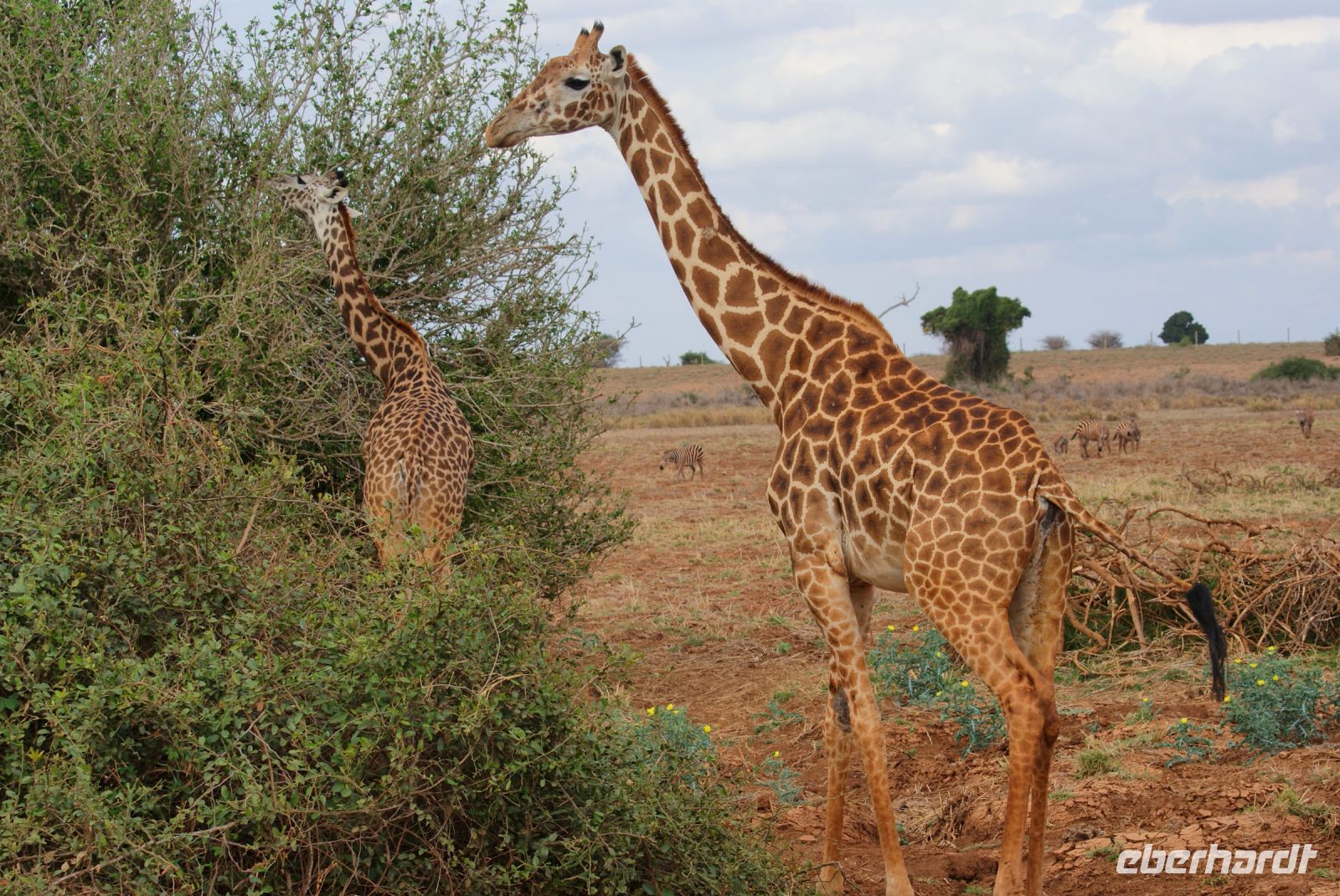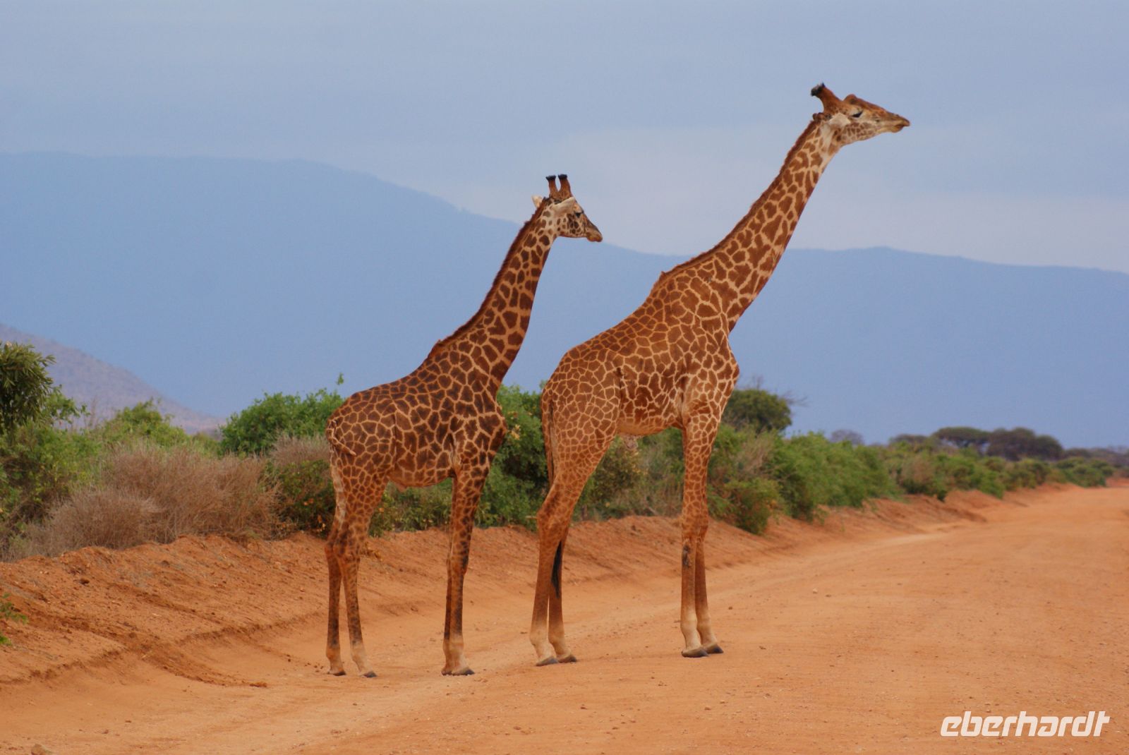 Nach einer unerwartet ruhigen Nacht (kaum Tiere am Wasserloch) und einem guten Frühstück, verlassen wir nur sehr ungern dieses afrikanische Paradies. Ein letztes Mal lassen wir den Blick auf dieses unglaubliche Panorama schweifen. Am Wasserloch finden sich nun nach den Marabus die ersten Zebras und Perlhühner ein. Bevor die Elefantenherden eintreffen, ziehen wir lieber schnell weiter, da wir diesen Platz hier sonst nicht mehr verlassen möchten. Die heutige Tour führt uns zum 12.000 Km² großen Tsavo Ost Nationalpark, der gemeinsam mit Tsavo West den größten Nationalpark Kenias bildet. West und Ost trennt nur eine Transitstraße, die größtenteils ohne Zaun verläuft. Daher sehen wir am Straßenrand so manches Elefanten-Warnschild, was auf die frei laufenden Kolosse hinweist. Tsavo wurde 1948 gegründet und ein Jahr später in West und Ost geteilt. Wir finden nun ein wiederum anderes Landschaftsbild vor. Die Hügellandschaft von West weicht inzwischen wieder einer weiten Savanne mit herrlichen Schirmakazien und teils ebenfalls roter Erde. Nachdem wir die quirlige Stadt Voi mit gleichnamigem Gate passiert haben, hat uns die Natur wieder und schon kurz darauf, werden wir von der ersten Elefantenherde mit Jungtieren begrüßt und eindringlich begutachtet. Masaigiraffen am Wegesrand, dazu Impalas und Thompson Gazellen säumen unseren Weg, bis wir mittags in der Ashnil Aruba Lodge einchecken. Der Tsavo Ost Nationalpark ist im Winter recht windig und so empfängt uns auch hier in frisches Lüftchen. Nach dem Mittagessen und ein bisschen Ausruhen von der heutigen Anreise starten wir zur Nachmittagssafari. Erneut sehen wir unzählige Elefanten nah und fern, dazu die seltenen Gerenuks (Giraffenhalsantilopen), Kudus, Hornraben, Geierperlhühner, etc. Als abschließendes Highlight führt uns Guide Caleb, einem Geheimtipp folgend, zu einem Rudel Löwinnen, die genüsslich im Dickicht Siesta halten. Welch ein toller Augenblick, fünf Löwinnen und wir ganz alleine in der Savanne… Abends kehren wir zurück und so mancher Elefant findet noch den Weg zu unserem Wasserloch an der Ashnil Aruba Lodge.