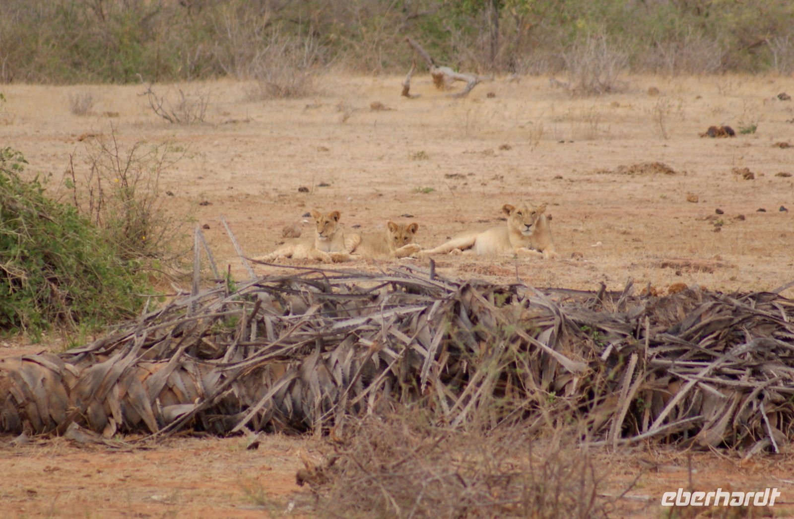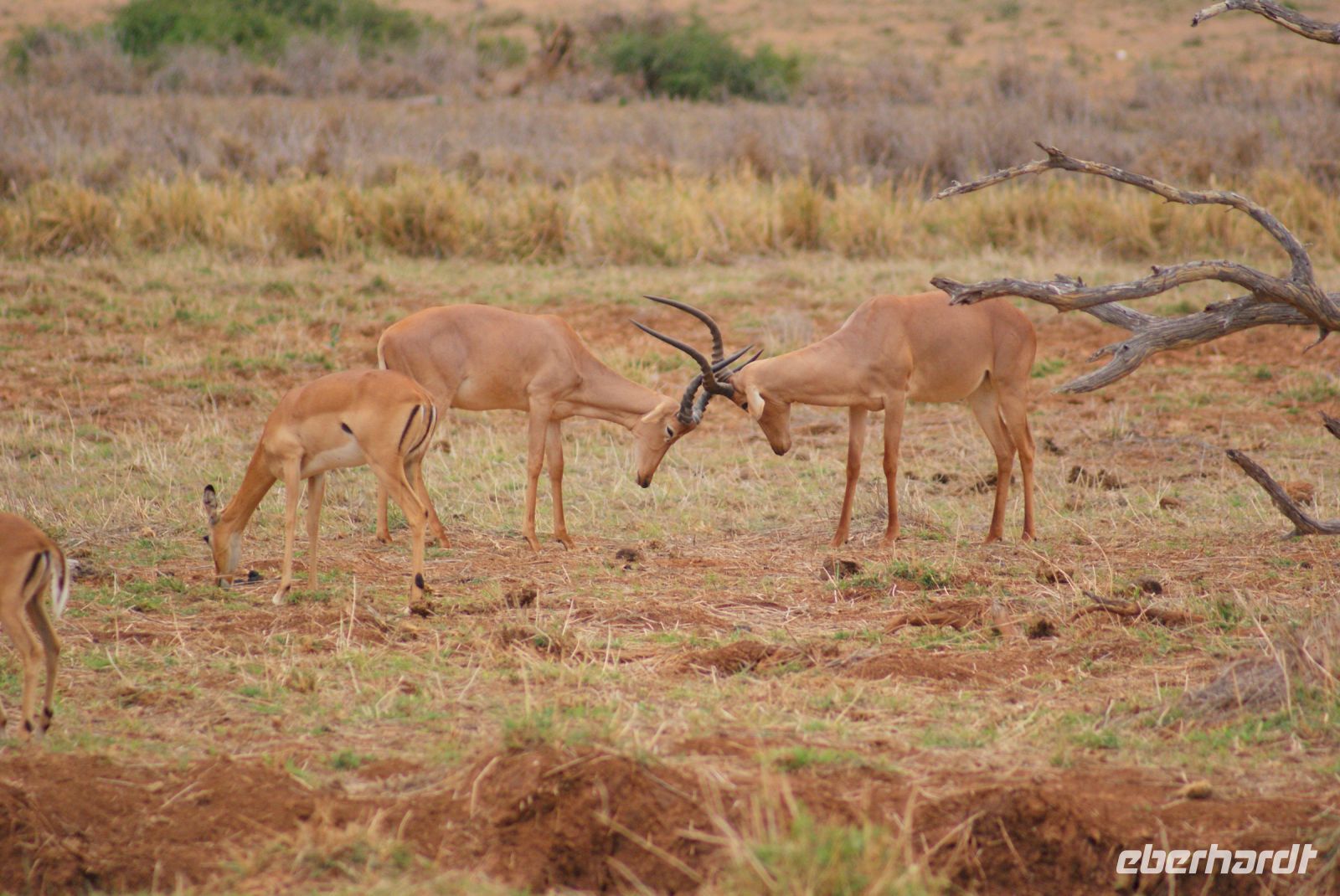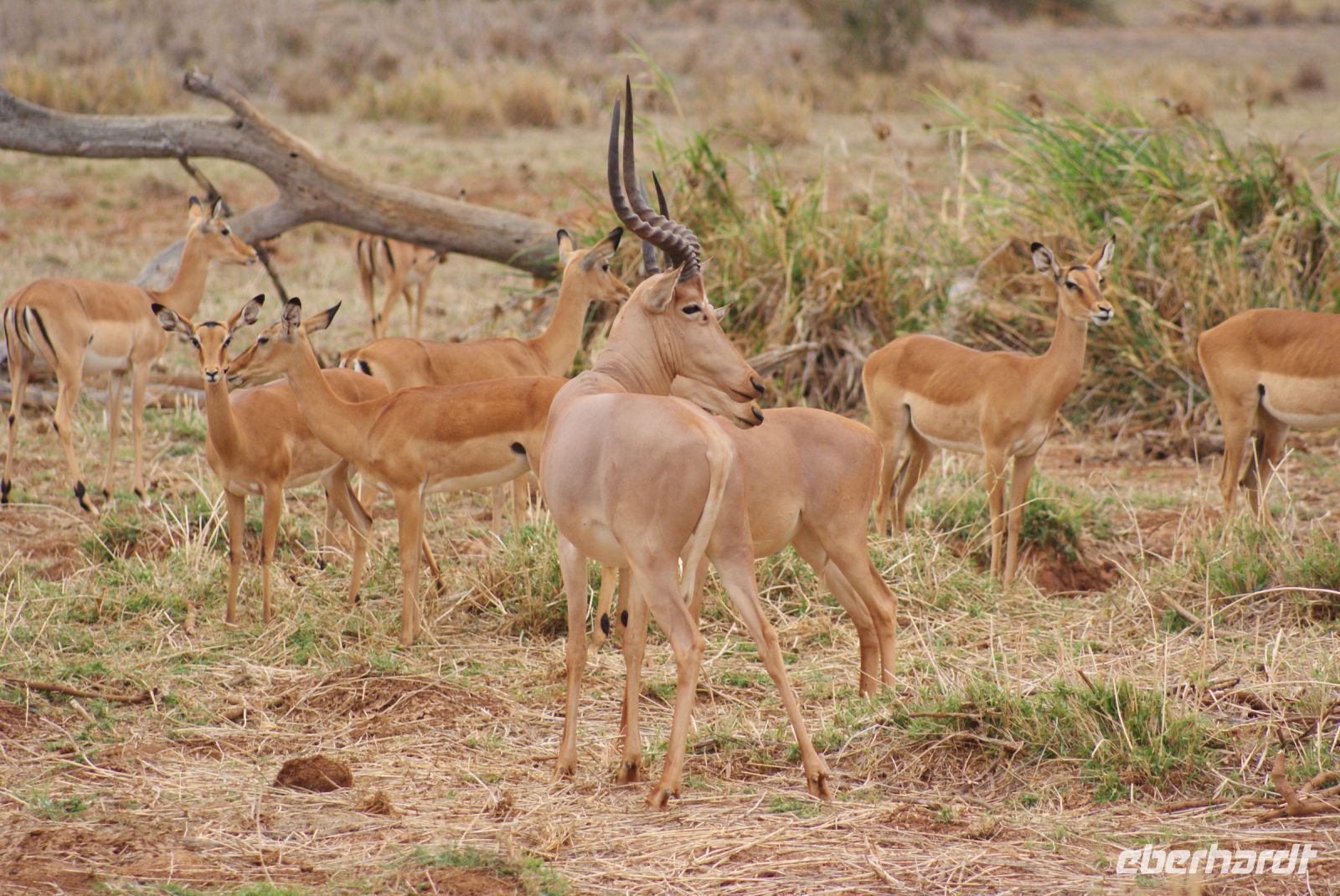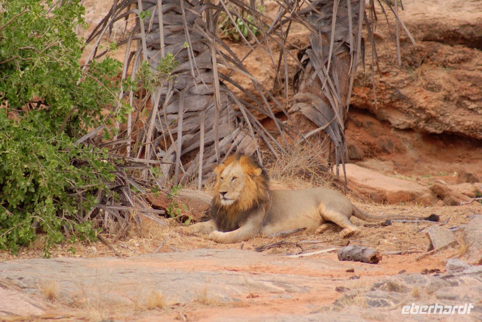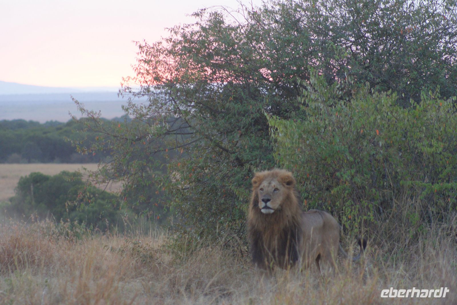 Nach einer unerwartet ruhigen Nacht (kaum Tiere am Wasserloch) und einem guten Frühstück, verlassen wir nur sehr ungern dieses afrikanische Paradies. Ein letztes Mal lassen wir den Blick auf dieses unglaubliche Panorama schweifen. Am Wasserloch finden sich nun nach den Marabus die ersten Zebras und Perlhühner ein. Bevor die Elefantenherden eintreffen, ziehen wir lieber schnell weiter, da wir diesen Platz hier sonst nicht mehr verlassen möchten. Die heutige Tour führt uns zum 12.000 Km² großen Tsavo Ost Nationalpark, der gemeinsam mit Tsavo West den größten Nationalpark Kenias bildet. West und Ost trennt nur eine Transitstraße, die größtenteils ohne Zaun verläuft. Daher sehen wir am Straßenrand so manches Elefanten-Warnschild, was auf die frei laufenden Kolosse hinweist. Tsavo wurde 1948 gegründet und ein Jahr später in West und Ost geteilt. Wir finden nun ein wiederum anderes Landschaftsbild vor. Die Hügellandschaft von West weicht inzwischen wieder einer weiten Savanne mit herrlichen Schirmakazien und teils ebenfalls roter Erde. Nachdem wir die quirlige Stadt Voi mit gleichnamigem Gate passiert haben, hat uns die Natur wieder und schon kurz darauf, werden wir von der ersten Elefantenherde mit Jungtieren begrüßt und eindringlich begutachtet. Masaigiraffen am Wegesrand, dazu Impalas und Thompson Gazellen säumen unseren Weg, bis wir mittags in der Ashnil Aruba Lodge einchecken. Der Tsavo Ost Nationalpark ist im Winter recht windig und so empfängt uns auch hier in frisches Lüftchen. Nach dem Mittagessen und ein bisschen Ausruhen von der heutigen Anreise starten wir zur Nachmittagssafari. Erneut sehen wir unzählige Elefanten nah und fern, dazu die seltenen Gerenuks (Giraffenhalsantilopen), Kudus, Hornraben, Geierperlhühner, etc. Als abschließendes Highlight führt uns Guide Caleb, einem Geheimtipp folgend, zu einem Rudel Löwinnen, die genüsslich im Dickicht Siesta halten. Welch ein toller Augenblick, fünf Löwinnen und wir ganz alleine in der Savanne… Abends kehren wir zurück und so mancher Elefant findet noch den Weg zu unserem Wasserloch an der Ashnil Aruba Lodge.