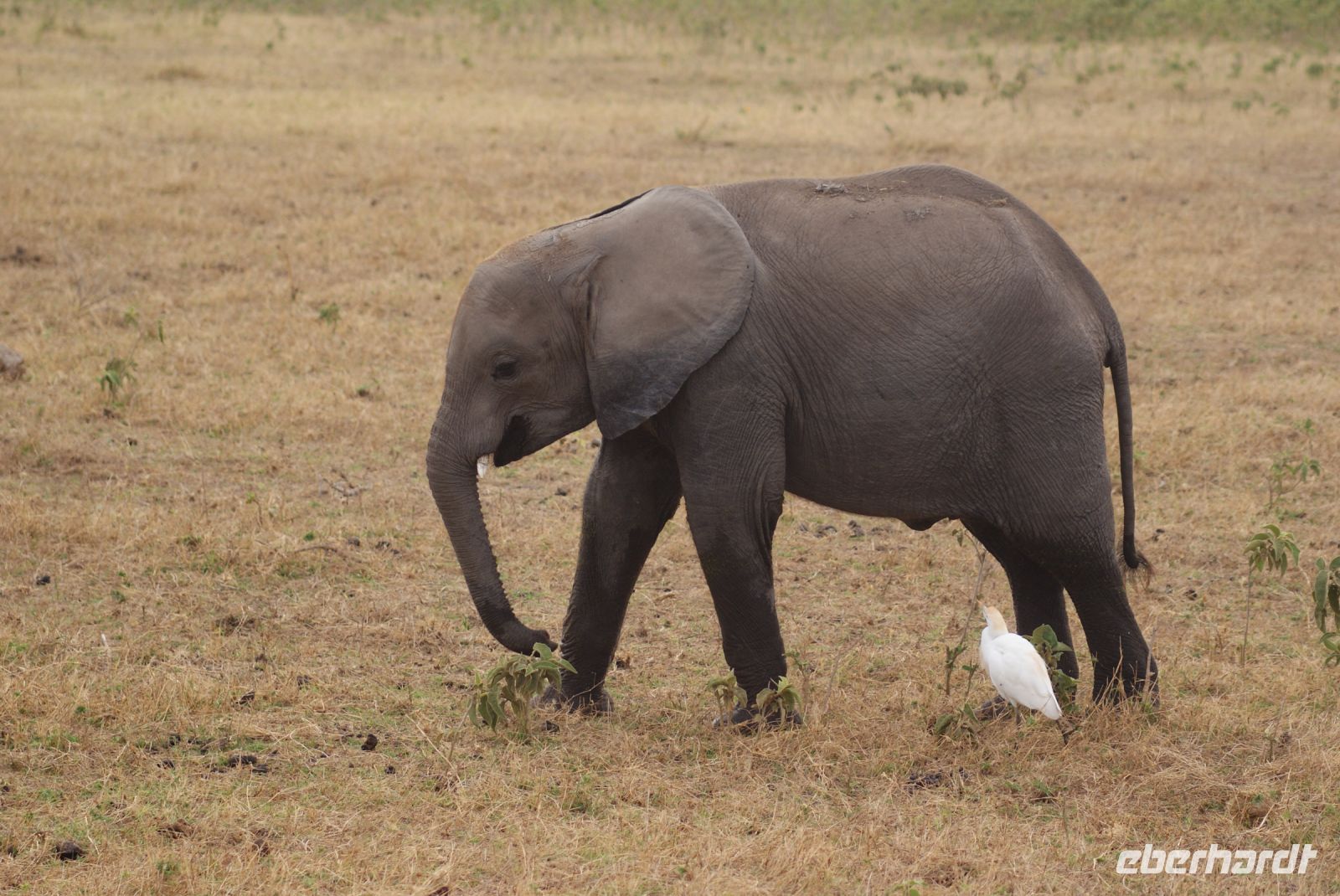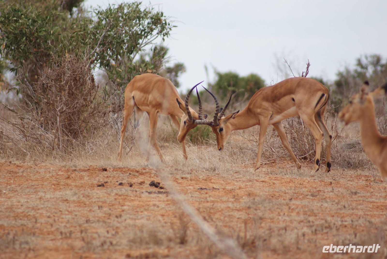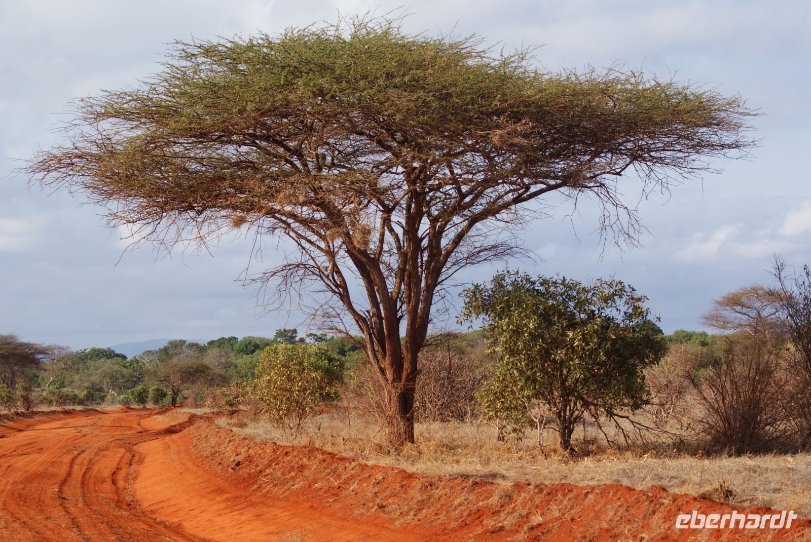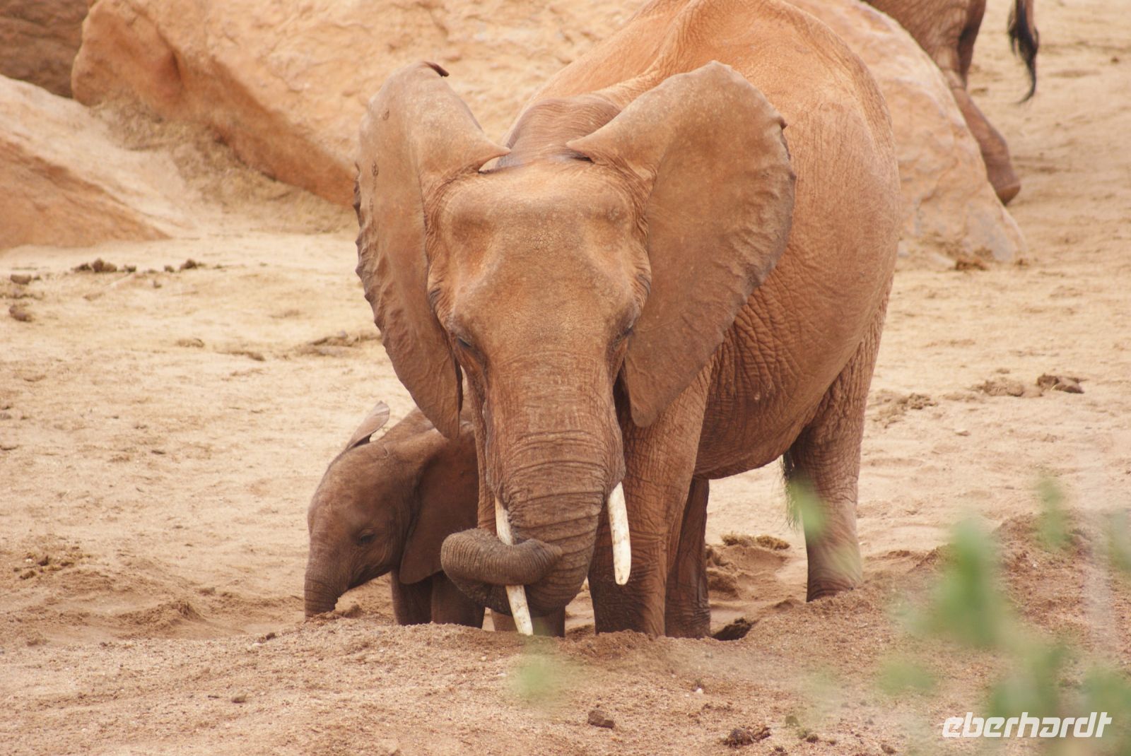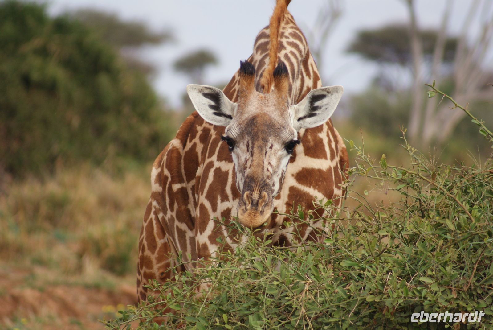 Nach einer unerwartet ruhigen Nacht (kaum Tiere am Wasserloch) und einem guten Frühstück, verlassen wir nur sehr ungern dieses afrikanische Paradies. Ein letztes Mal lassen wir den Blick auf dieses unglaubliche Panorama schweifen. Am Wasserloch finden sich nun nach den Marabus die ersten Zebras und Perlhühner ein. Bevor die Elefantenherden eintreffen, ziehen wir lieber schnell weiter, da wir diesen Platz hier sonst nicht mehr verlassen möchten. Die heutige Tour führt uns zum 12.000 Km² großen Tsavo Ost Nationalpark, der gemeinsam mit Tsavo West den größten Nationalpark Kenias bildet. West und Ost trennt nur eine Transitstraße, die größtenteils ohne Zaun verläuft. Daher sehen wir am Straßenrand so manches Elefanten-Warnschild, was auf die frei laufenden Kolosse hinweist. Tsavo wurde 1948 gegründet und ein Jahr später in West und Ost geteilt. Wir finden nun ein wiederum anderes Landschaftsbild vor. Die Hügellandschaft von West weicht inzwischen wieder einer weiten Savanne mit herrlichen Schirmakazien und teils ebenfalls roter Erde. Nachdem wir die quirlige Stadt Voi mit gleichnamigem Gate passiert haben, hat uns die Natur wieder und schon kurz darauf, werden wir von der ersten Elefantenherde mit Jungtieren begrüßt und eindringlich begutachtet. Masaigiraffen am Wegesrand, dazu Impalas und Thompson Gazellen säumen unseren Weg, bis wir mittags in der Ashnil Aruba Lodge einchecken. Der Tsavo Ost Nationalpark ist im Winter recht windig und so empfängt uns auch hier in frisches Lüftchen. Nach dem Mittagessen und ein bisschen Ausruhen von der heutigen Anreise starten wir zur Nachmittagssafari. Erneut sehen wir unzählige Elefanten nah und fern, dazu die seltenen Gerenuks (Giraffenhalsantilopen), Kudus, Hornraben, Geierperlhühner, etc. Als abschließendes Highlight führt uns Guide Caleb, einem Geheimtipp folgend, zu einem Rudel Löwinnen, die genüsslich im Dickicht Siesta halten. Welch ein toller Augenblick, fünf Löwinnen und wir ganz alleine in der Savanne… Abends kehren wir zurück und so mancher Elefant findet noch den Weg zu unserem Wasserloch an der Ashnil Aruba Lodge.